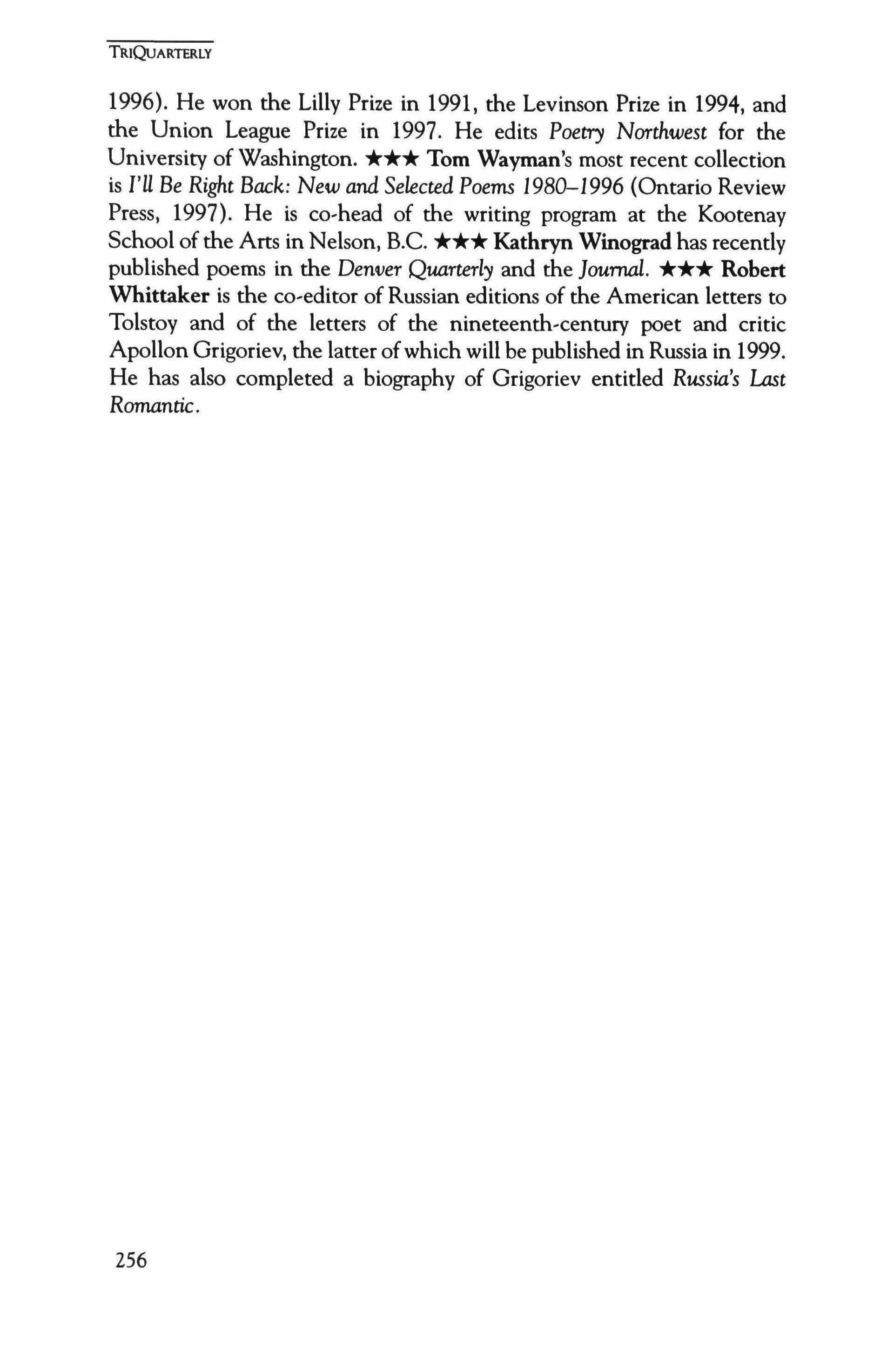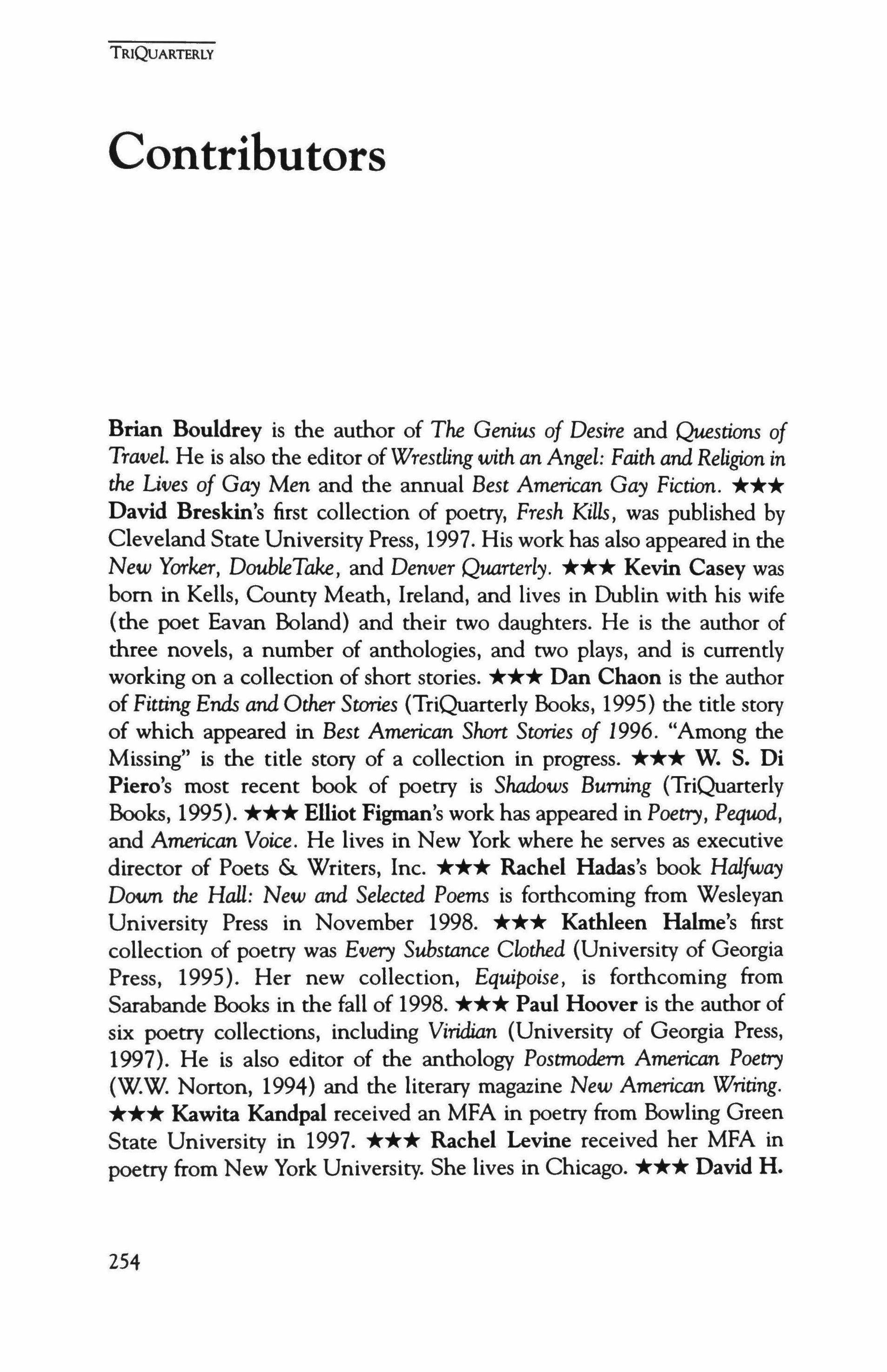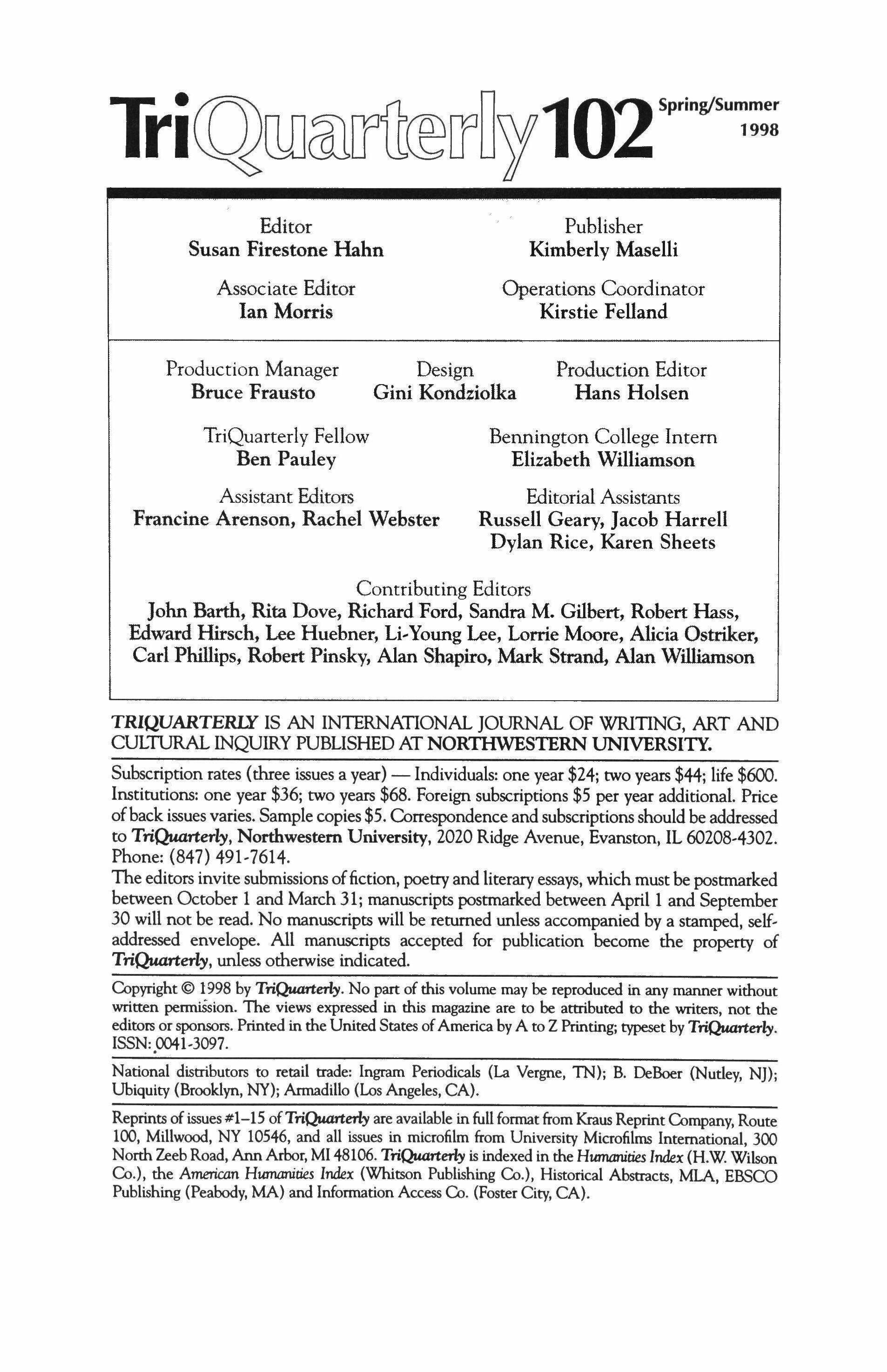Copyright © 1998 by TriQuarterly. No part of this volume may be reproduced in any manner without written permission, The views expressed in this magazine are to be attributed to the writers, not the editors or sponsors. Printed in the United States ofAmerica by A to Z Printing; typeset by TriQuarterly. ISSN:.0041-3097.