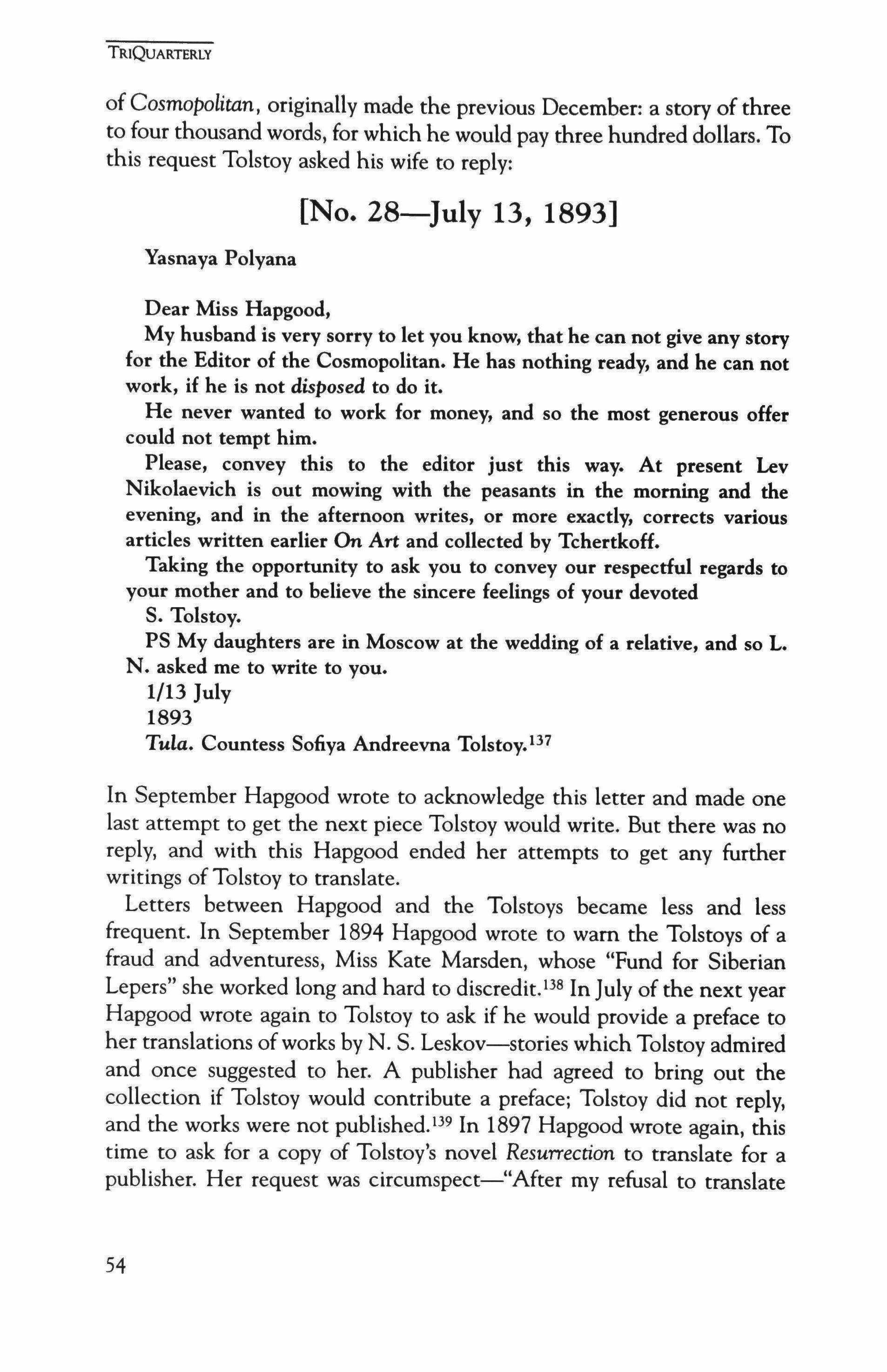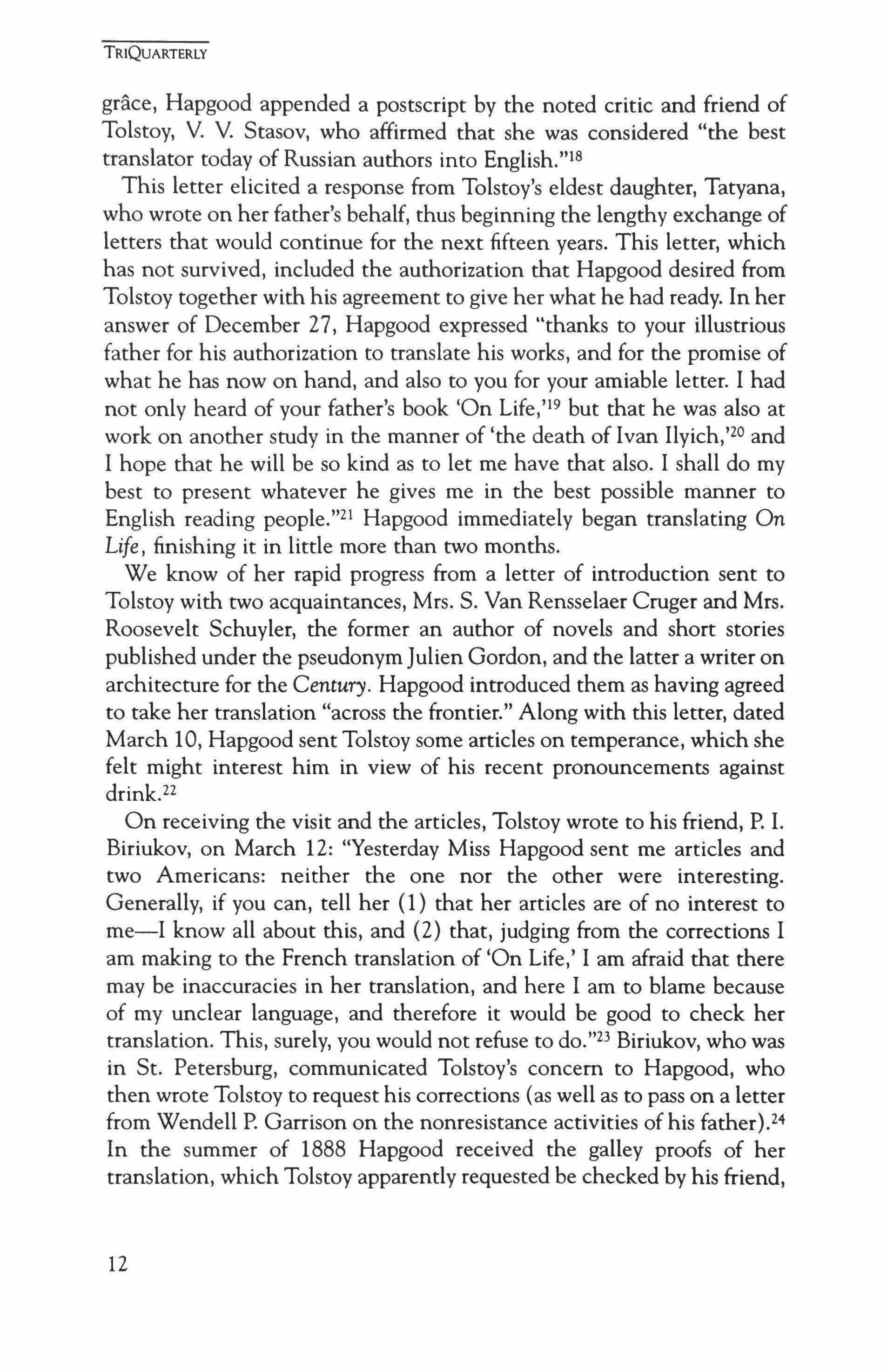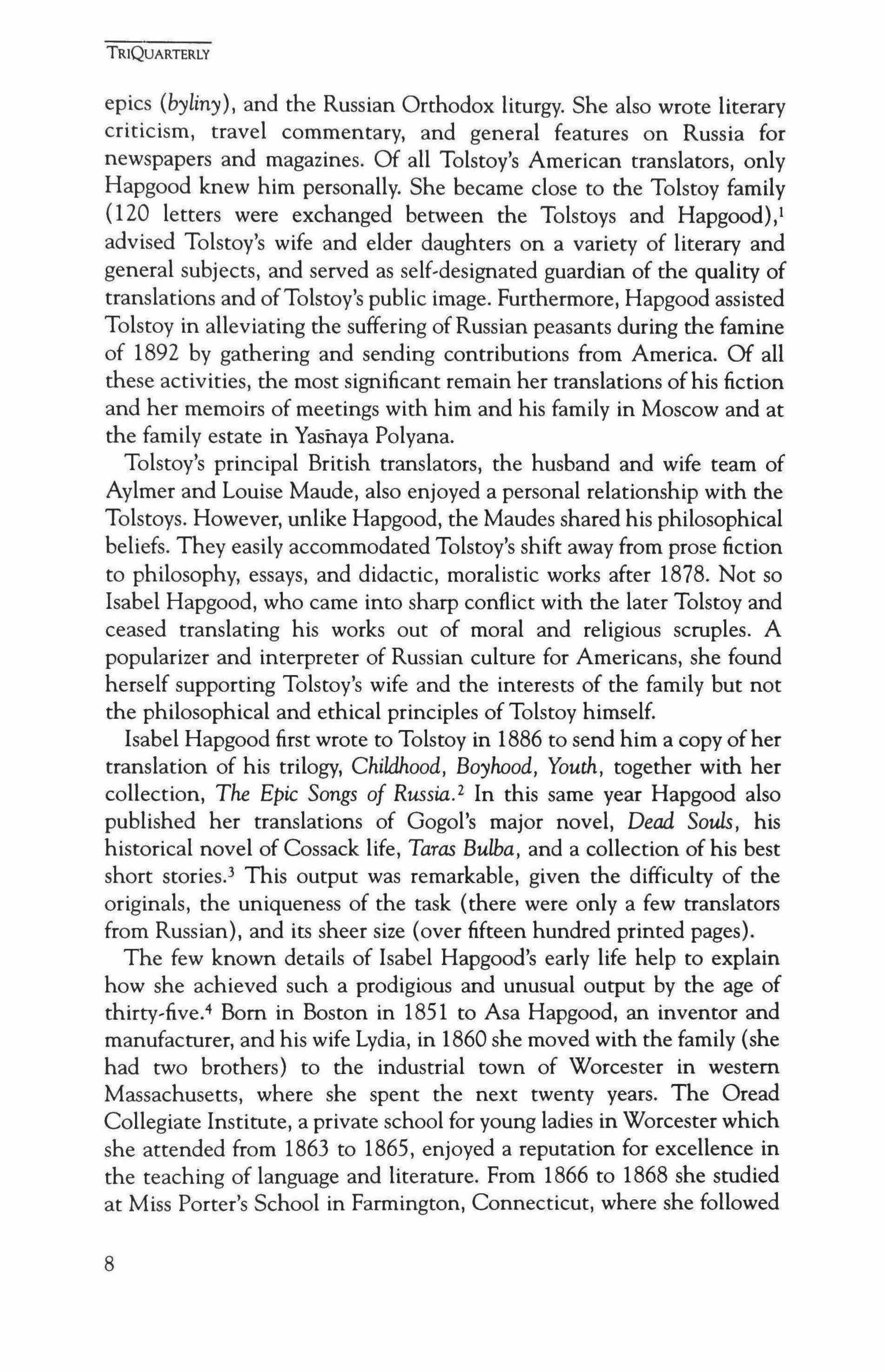 Isabel Hapgood (1851-1928) was more than just Tolstoy's translator. First of all, she translated more than just his works, and, second, she did more than just translate for him. None of Tolstoy's other translators had her scope: she translated the full range of Russian literature-Gogol, Leskov, Turgenev, Bunin, Gorky, the poets Tiutchev and Nikitin-as well as from the French (Victor Hugo, Ernest Renan) and Italian (DeAmicis). She translated not only Russian fiction and poetry, but memoirs (Veretschagin, Kovalevskaya), biographies (Sergeyenko), folk