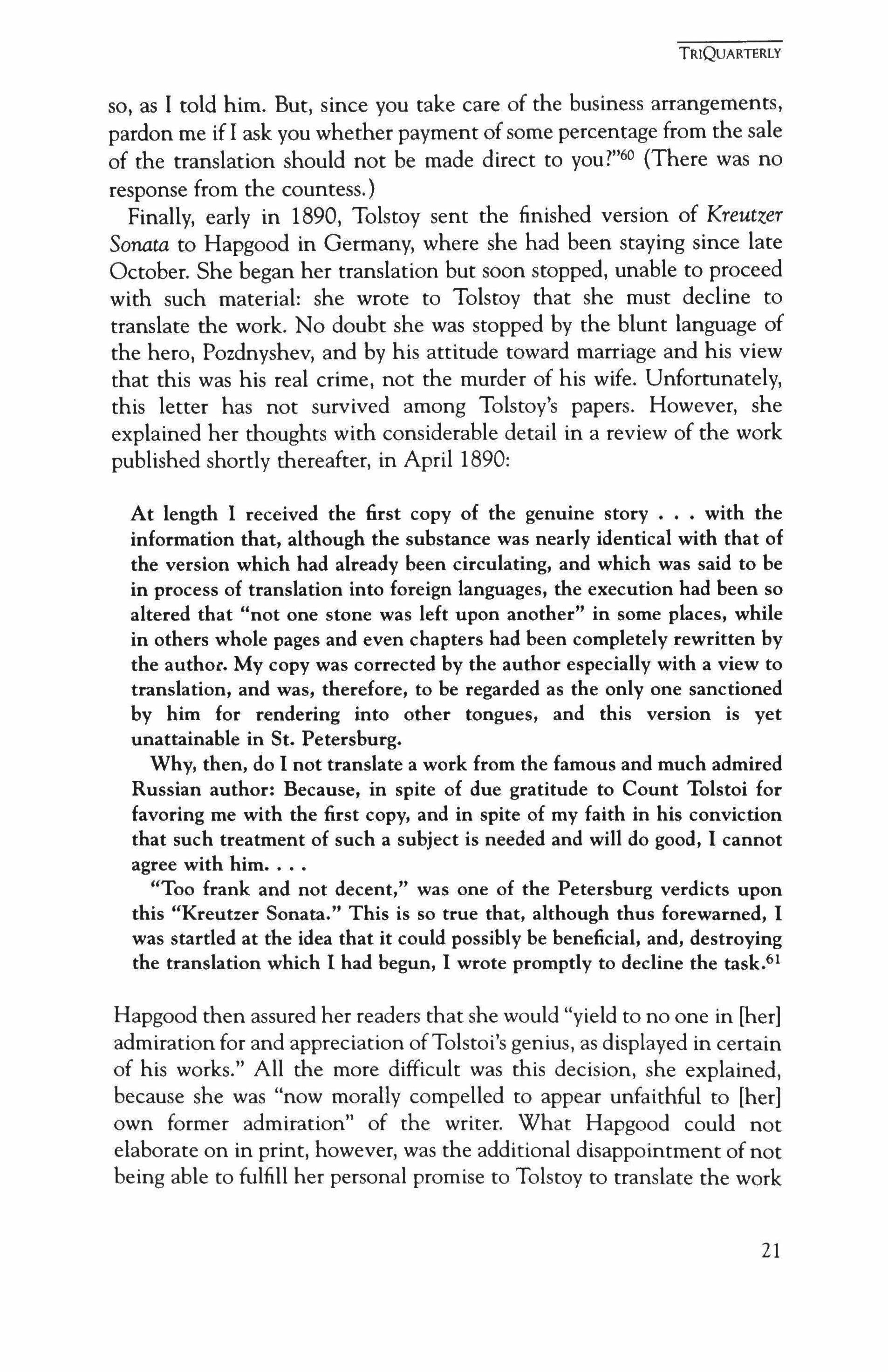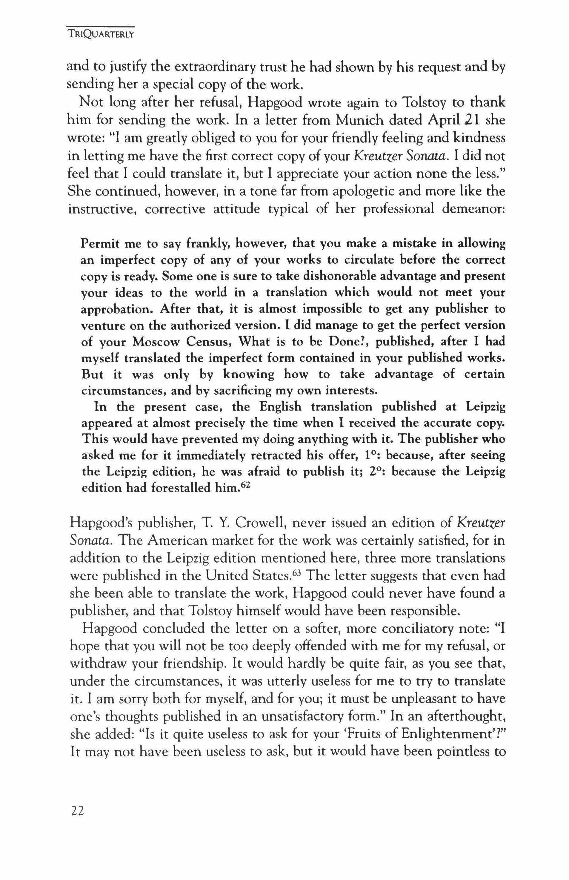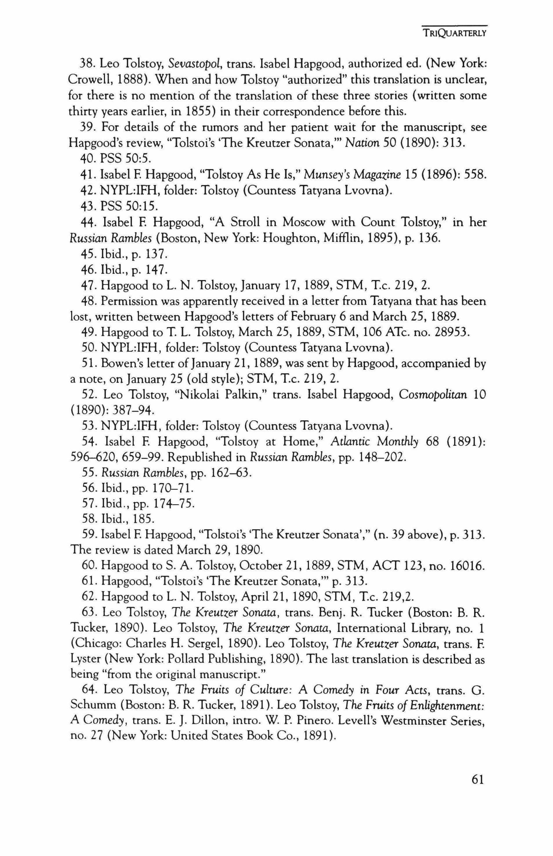 Isabel Hapgood (1851-1928) was more than just Tolstoy's translator. First of all, she translated more than just his works, and, second, she did more than just translate for him. None of Tolstoy's other translators had her scope: she translated the full range of Russian literature-Gogol, Leskov, Turgenev, Bunin, Gorky, the poets Tiutchev and Nikitin-as well as from the French (Victor Hugo, Ernest Renan) and Italian (DeAmicis). She translated not only Russian fiction and poetry, but memoirs (Veretschagin, Kovalevskaya), biographies (Sergeyenko), folk