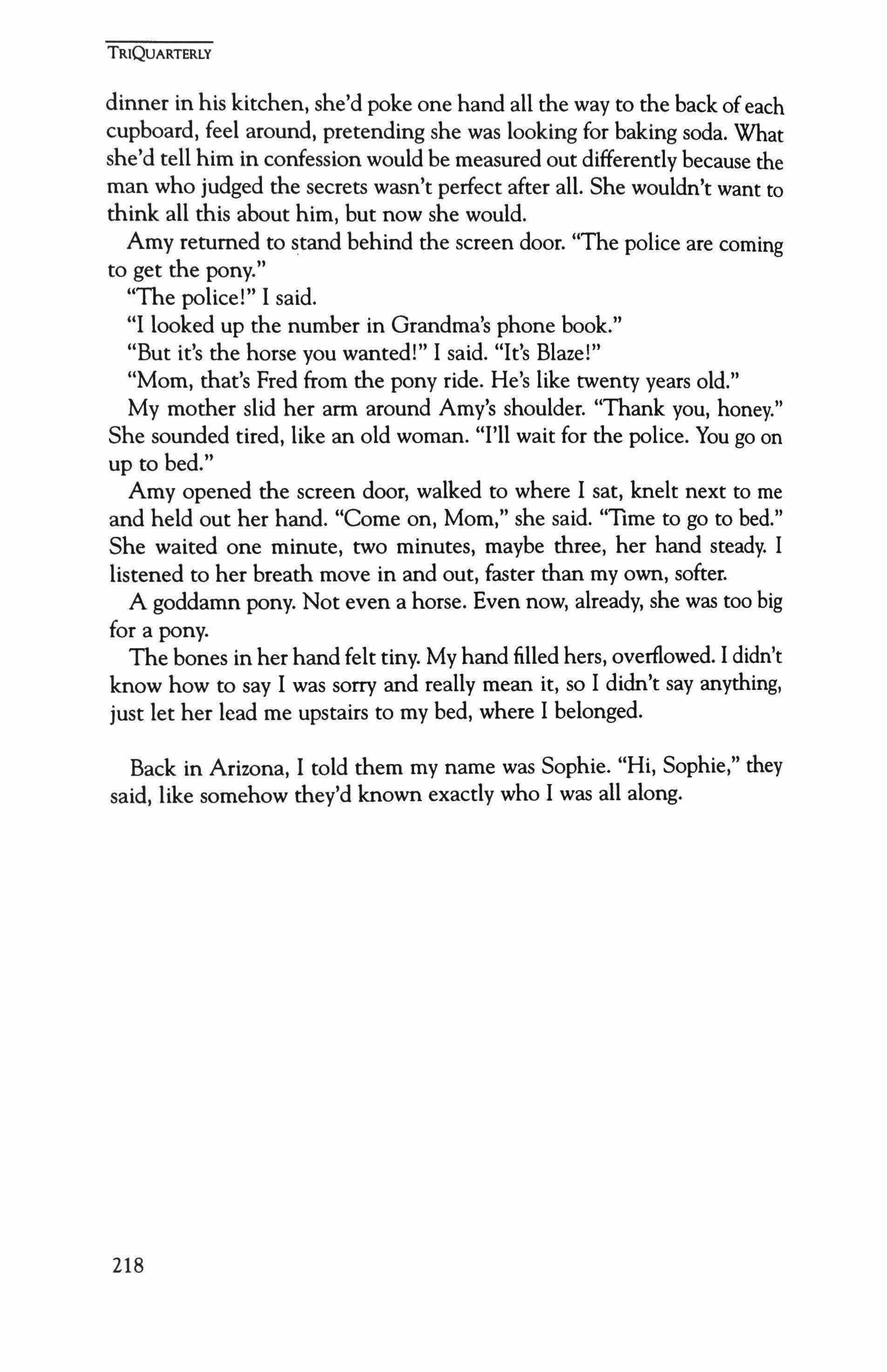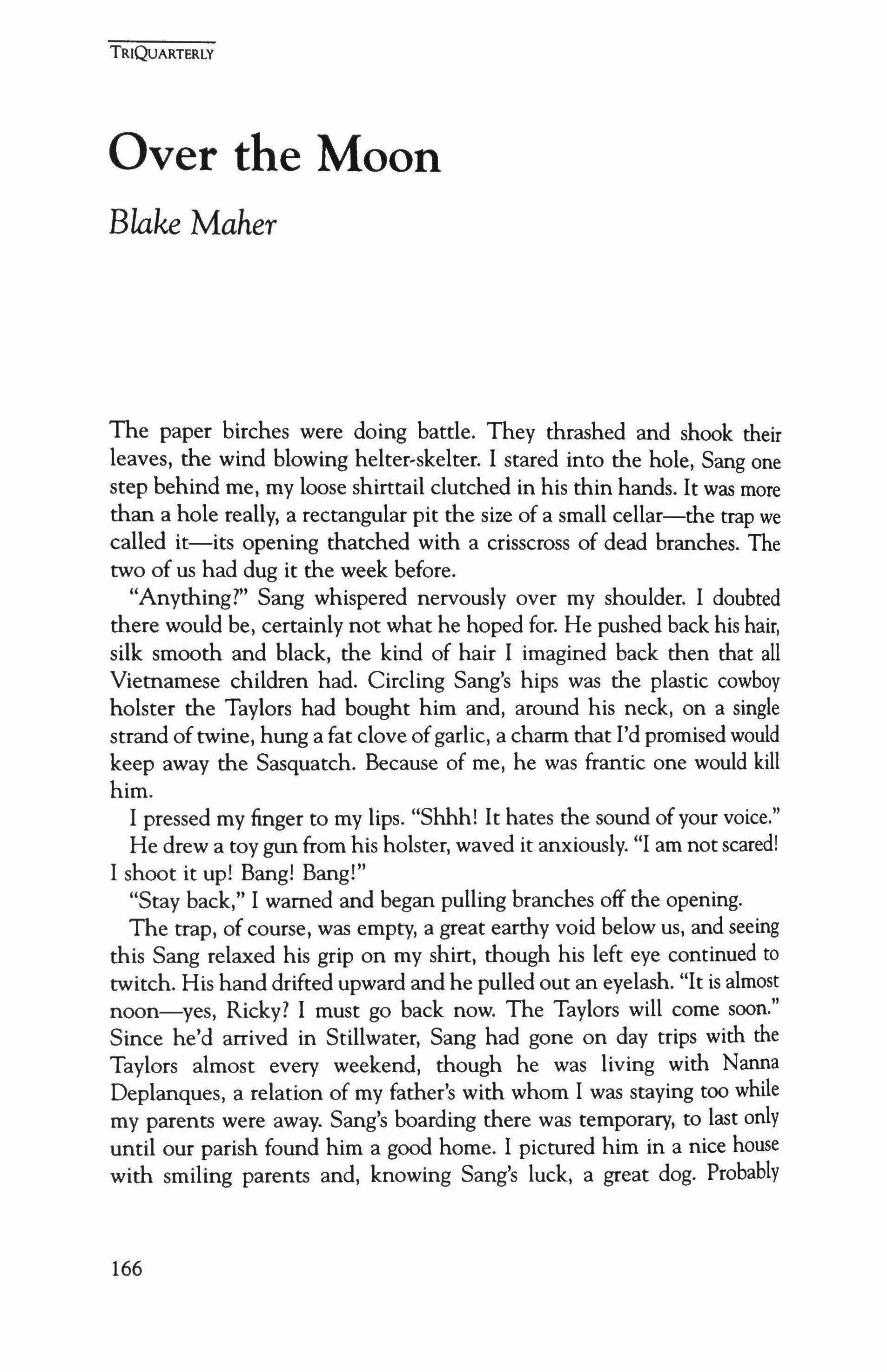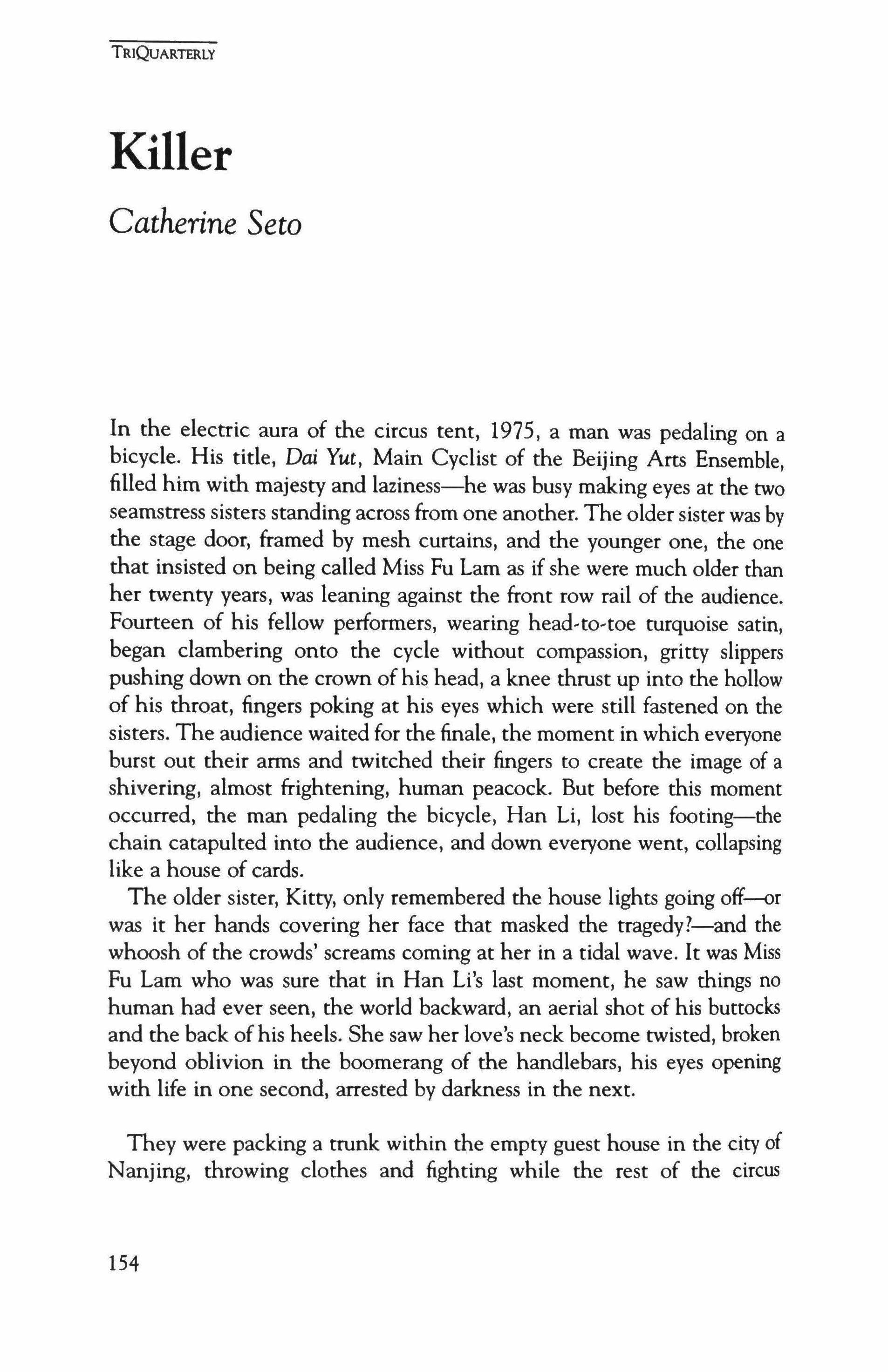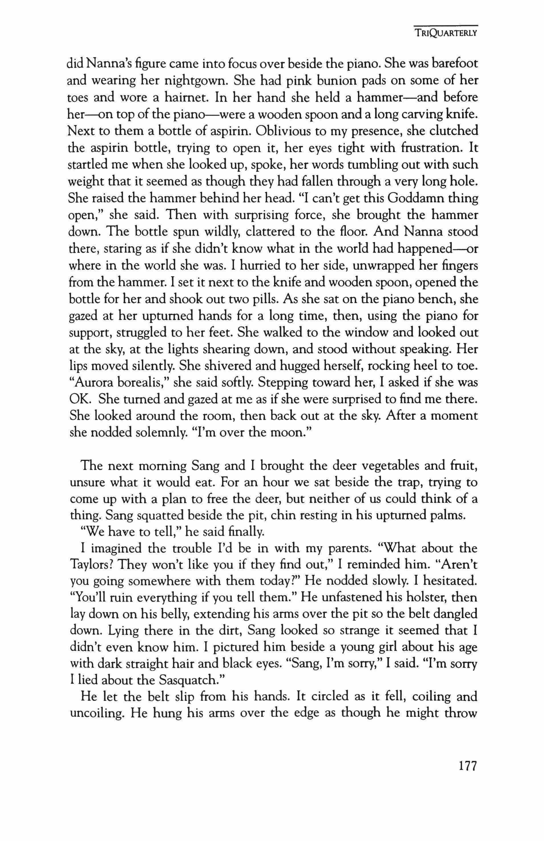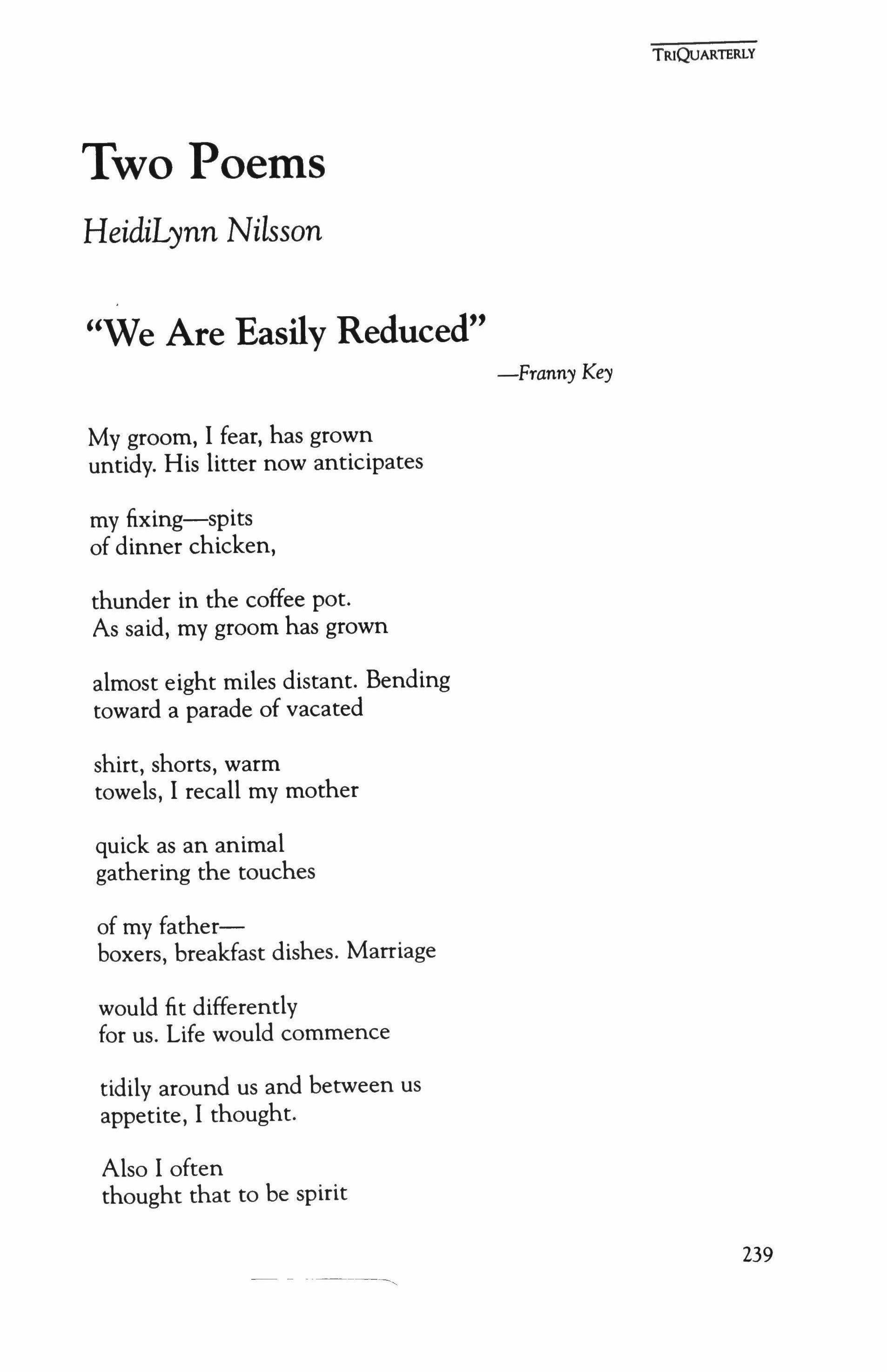 Finch Nested poem 147 Kathryn Winograd Grounded poem 150 Kawita Kandpal The Competition poem 152 Rachel Levine Killer stary 154 Catherine Seto Over the Moon stary 166 Blake Maher Decadence stary 183 Brian Boularey No Last Names novel excerpt 198 Leslie Pietrzyk Among the Missing stary 219 Dan Chaon Avulsion poem 236 Kathleen Halme By Fire; By Earth poems 237 Sharon Olas ��We Are Easily Reduced"; Talking Processes poems 239 HeidiLynn Nilsson