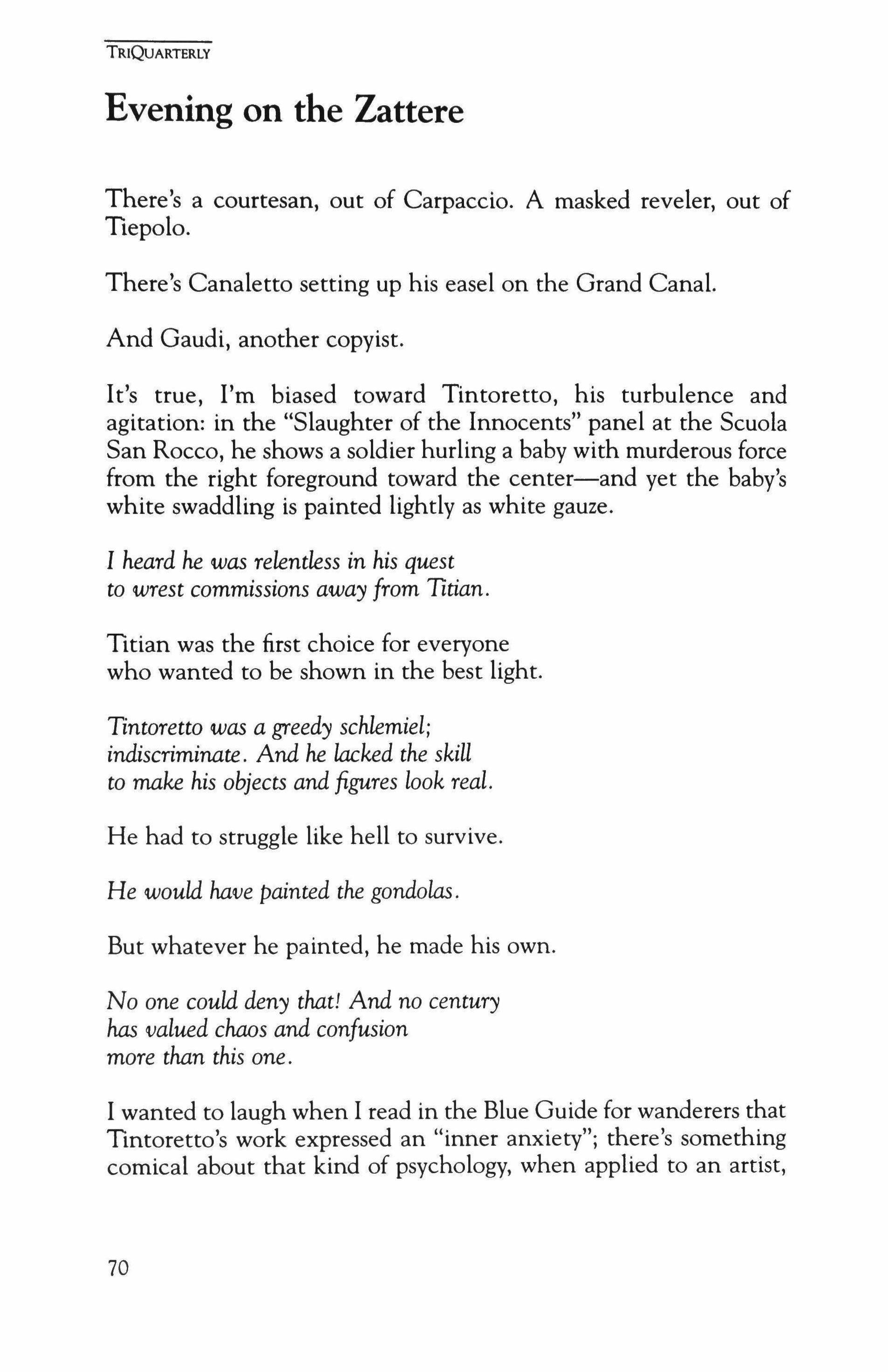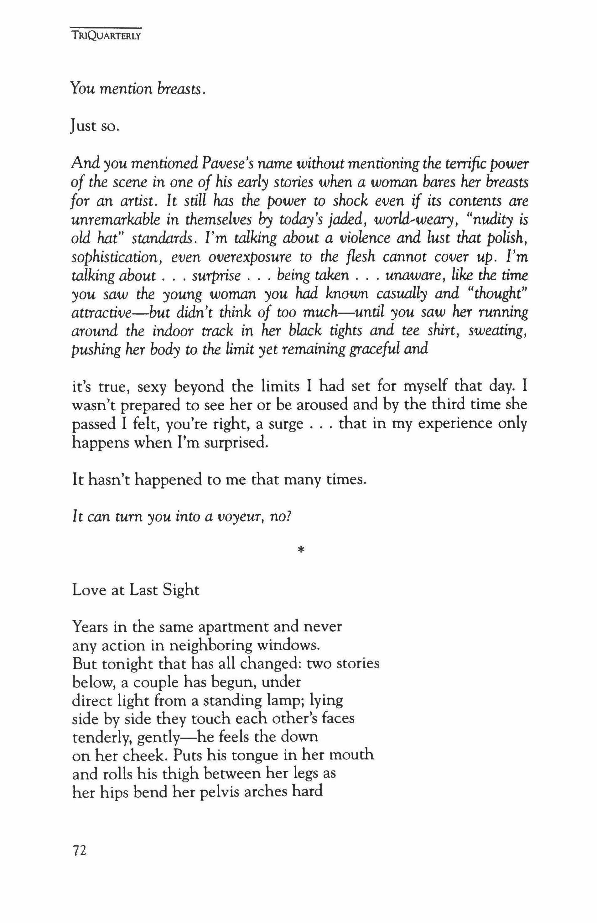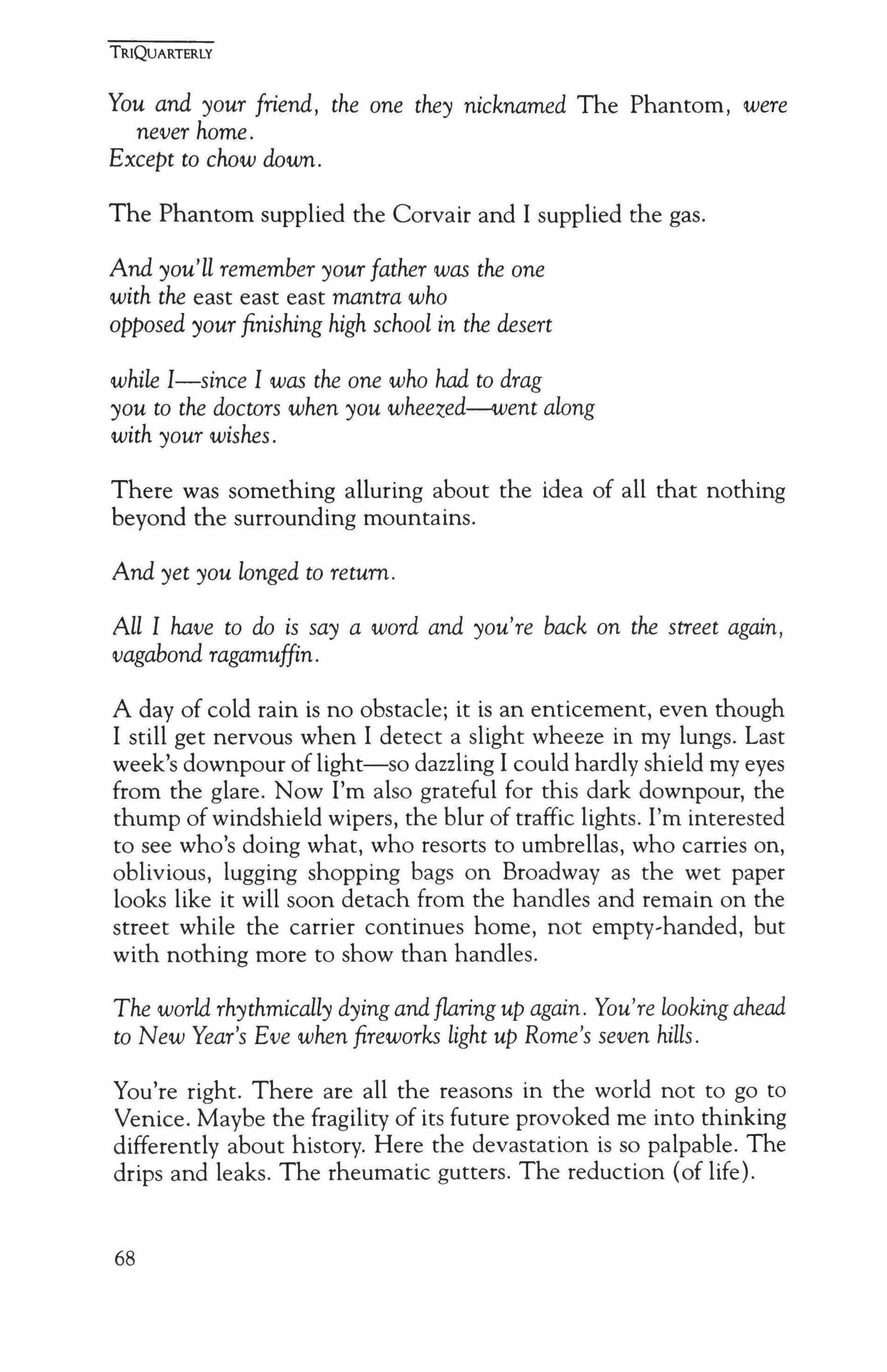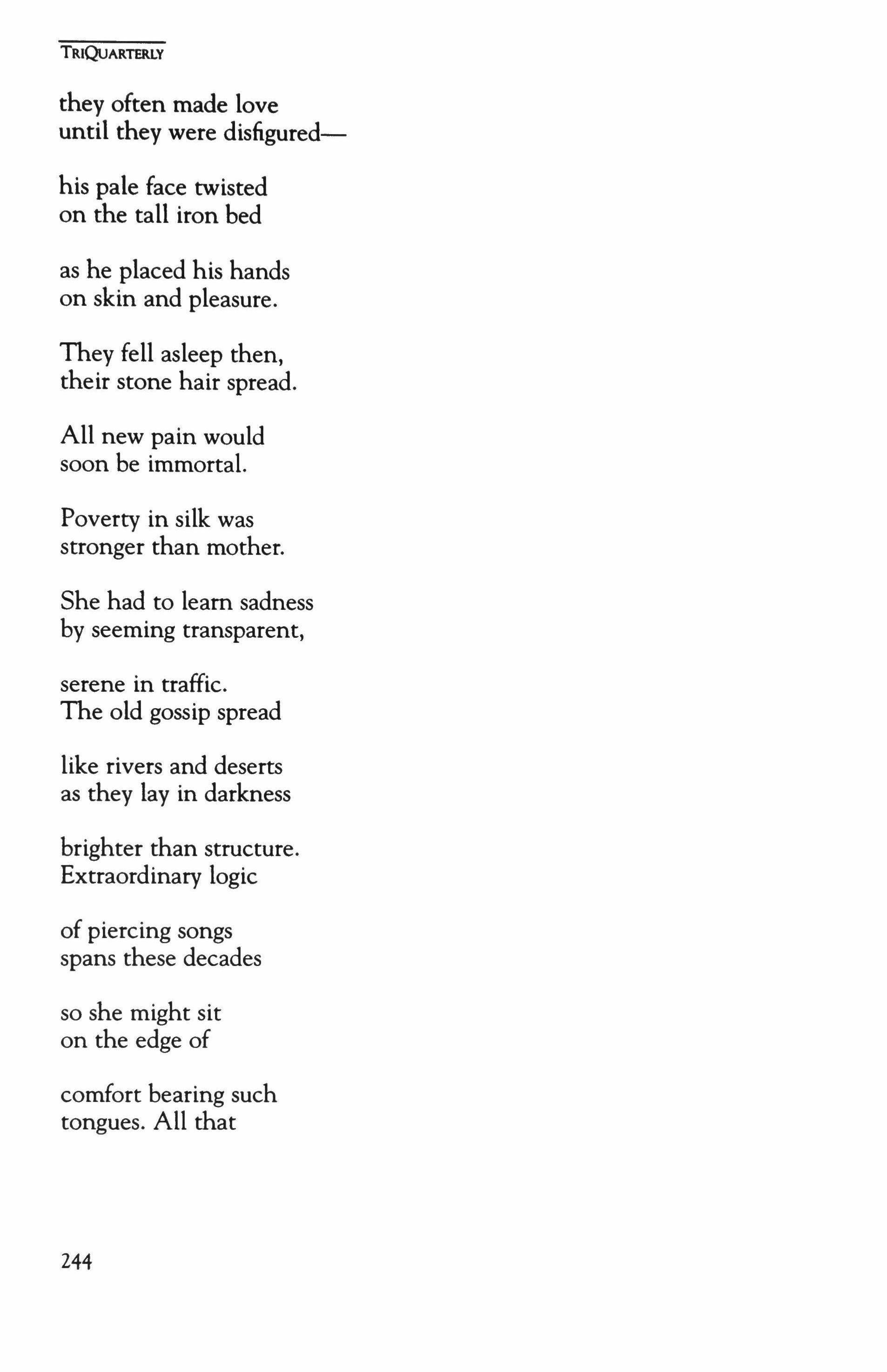 Publication of TriQuarterly is made possible in part by the donors of gifts and grants to the magazine. For their recent and continuing support, we are pleased to thank the Illinois Arts Council, the Lannan Foundation, the John D. and Catherine T. MacArthur Foundation, the National Endowment for the Arts, the Chicago Community Trust, and individual donors.
