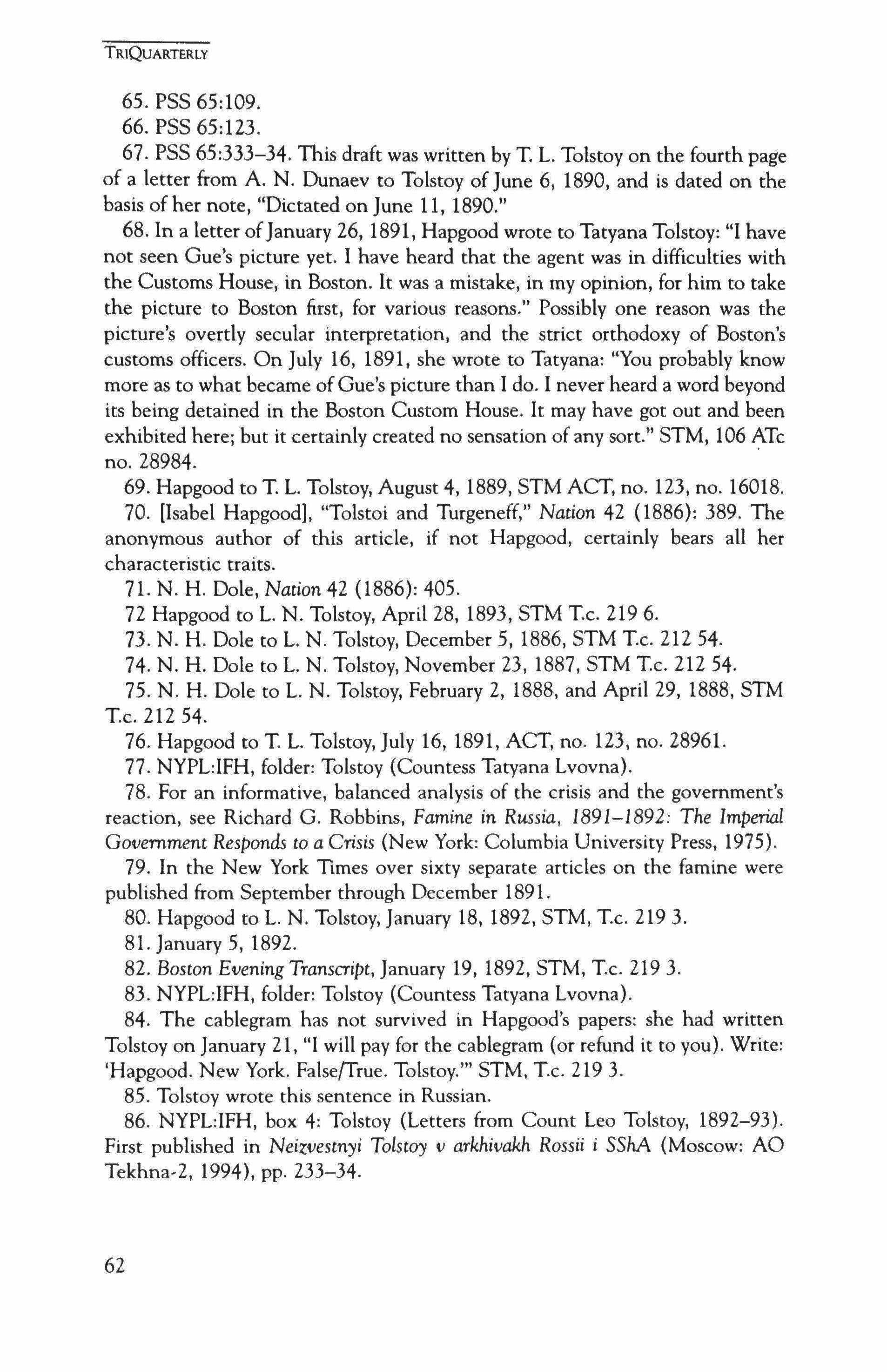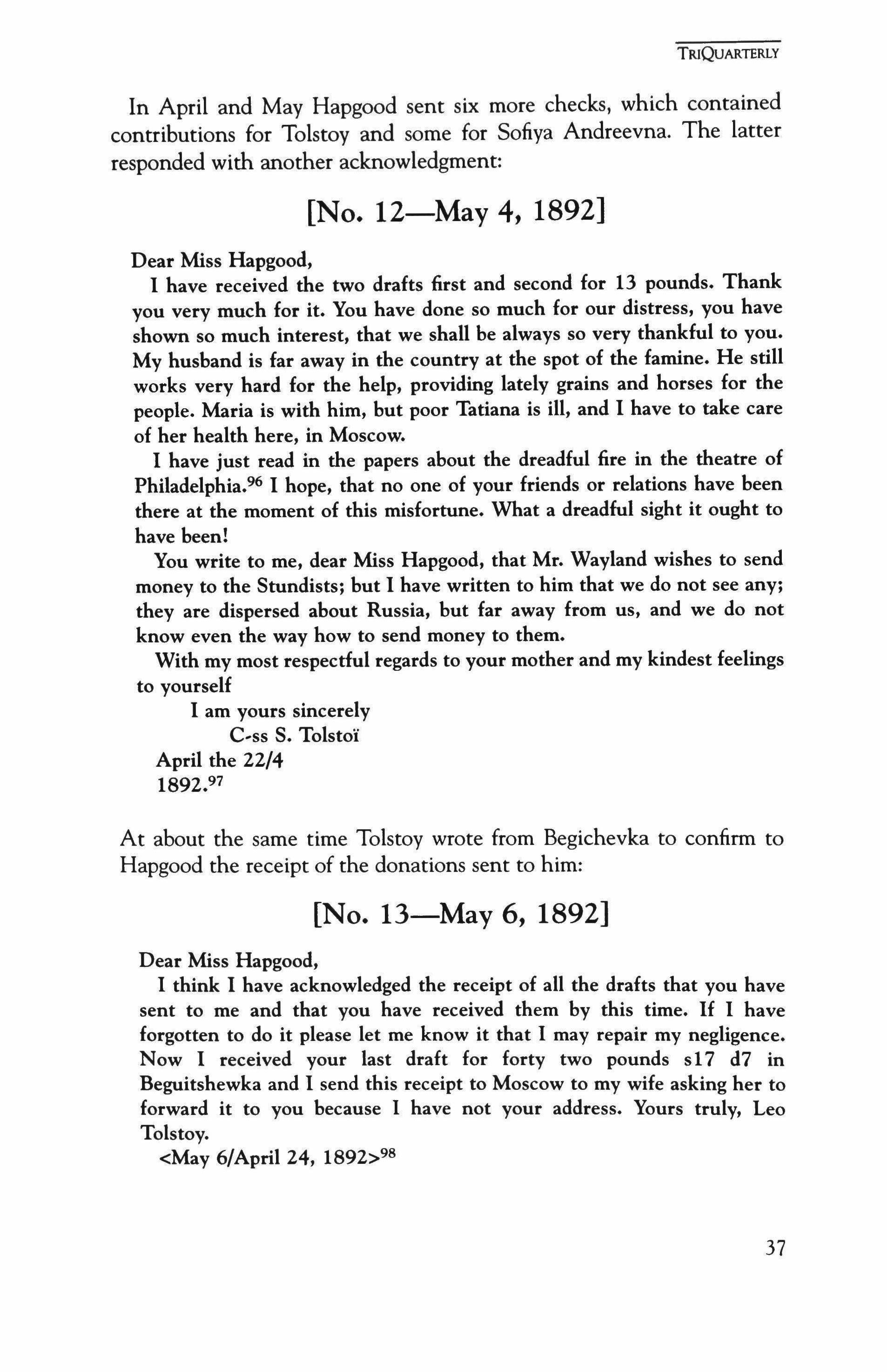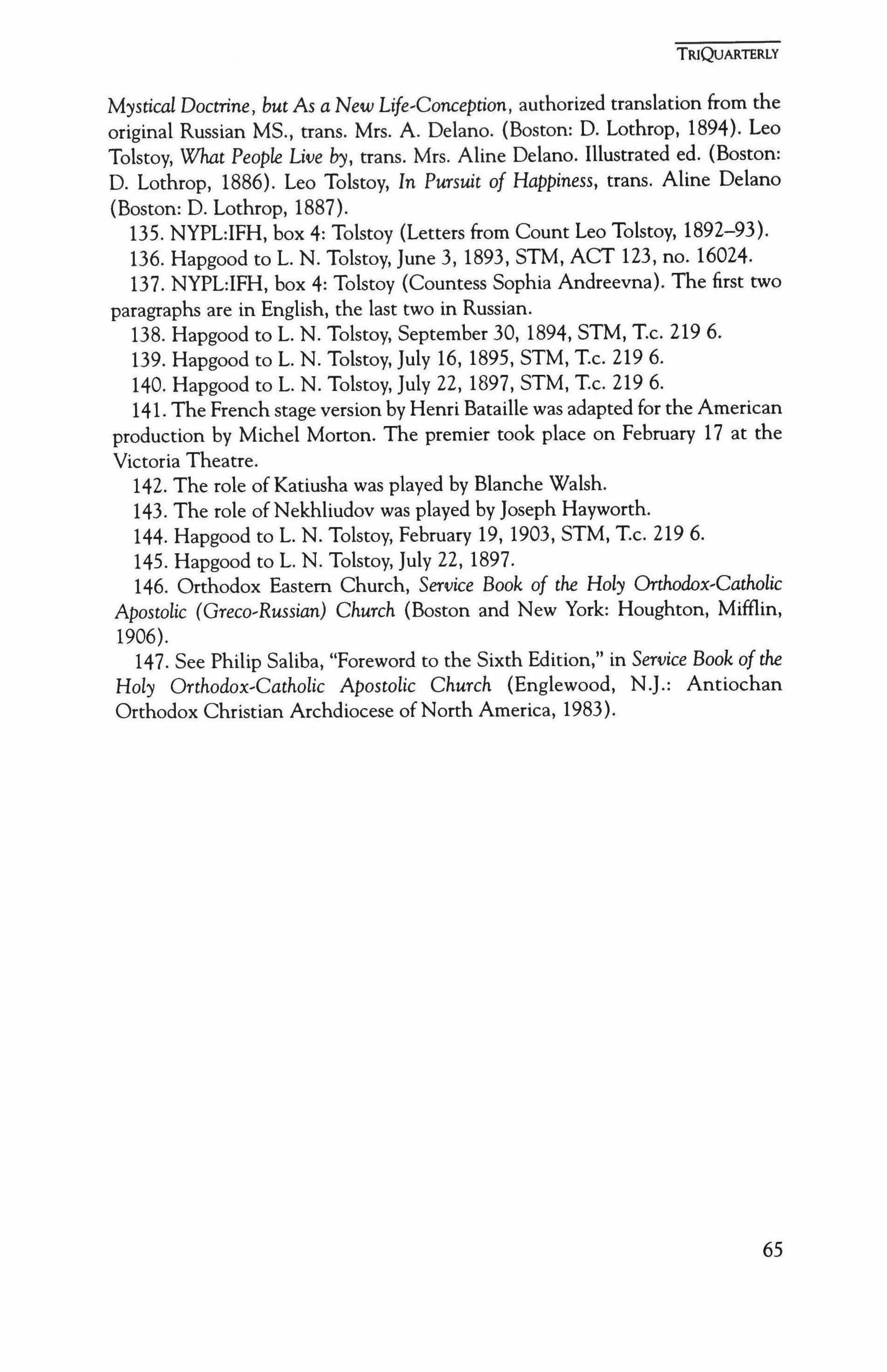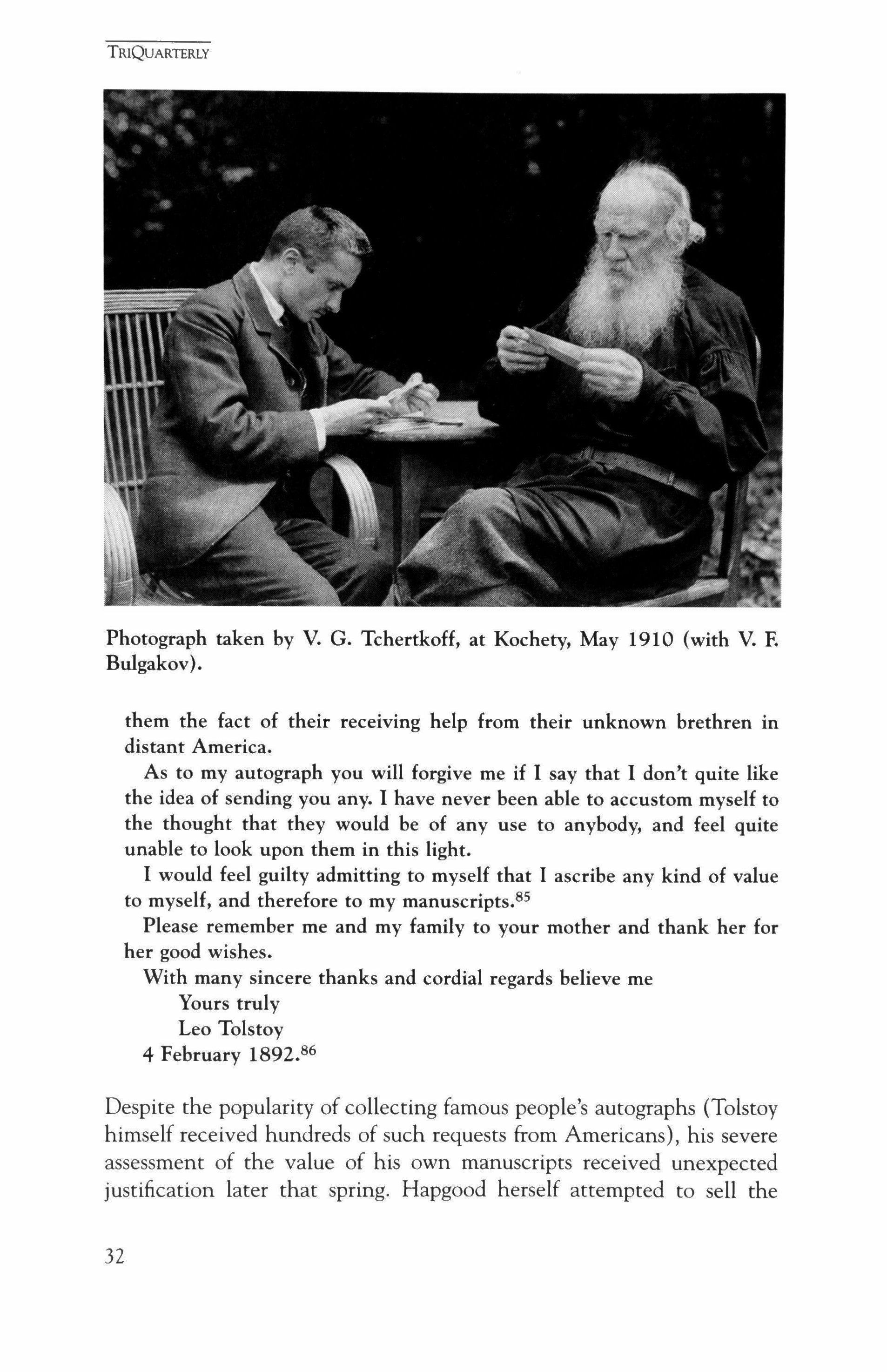 This is the third in a series of articles presenting Tolstoy's correspondence with Americans, based on material from the joint U.S.-Russian project "Tolstoy and His U.S. Correspondents" ("Tolstoy's American Mailbag: Selected Exchanges with His Occasional Correspondents" and "Tolstoy's American Disciple: Letters to Ernest Howard Crosby, 1894-1906" appeared in TriQuarterly 95 and TriQuarterly 98). Begun in 1986 under the auspices of the International Research and Exchanges Board, the Association of Learned Societies, and the Academy of Sciences of the USSR, since 1991 this project has been sponsored by the Gorky Institute of World Literature of the Russian Academy of Sciences in Moscow. The project has received major and essential institutional support from the Tolstoy State Museum in Moscow, especially the staff of its Manuscript Division. Activities of the project in the United States have greatly benefited from the support of the staff of the Slavonic and Baltic Division of the Research Libraries of the New York Public Library. The director of the project for the Russian side is Dr. L. D. Gromova, the chief editor is N. P. Velikanova; the activities of the American side are coordinated by the author of this publication, who expresses his gratitude to the staffof the Tolstoy State Museum and its Manuscript Division and to the Gorky Institute for assistance in this research.