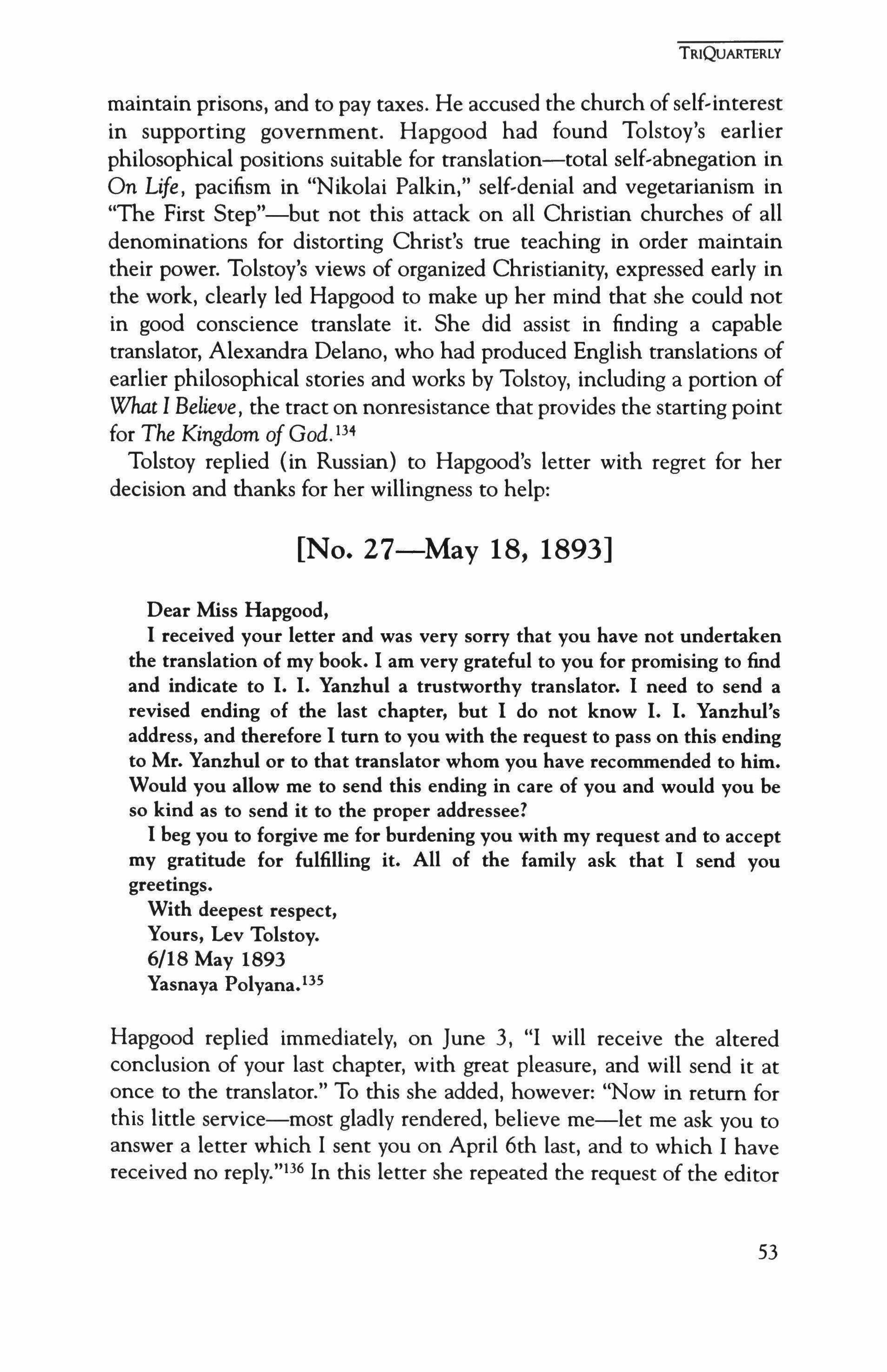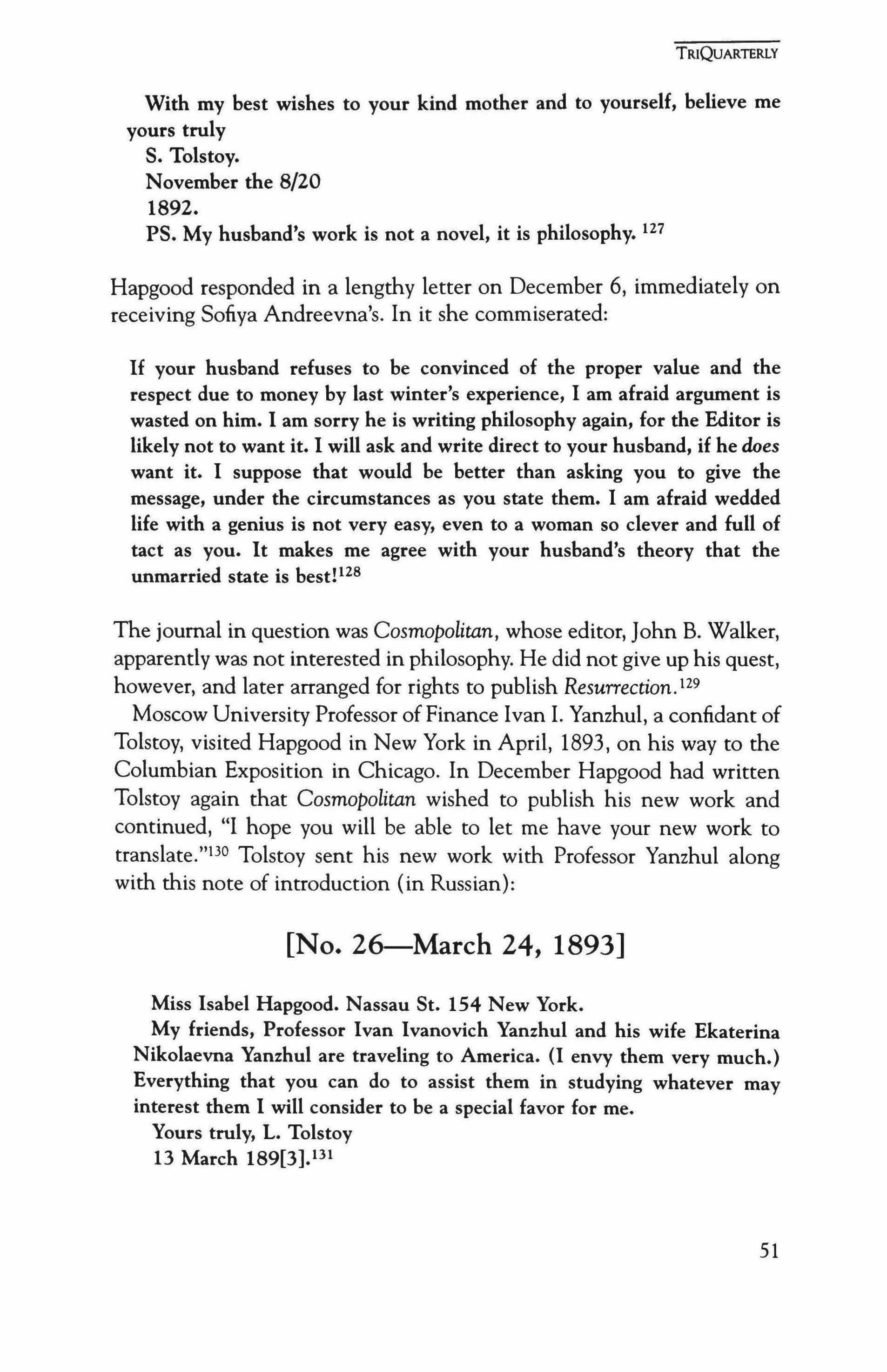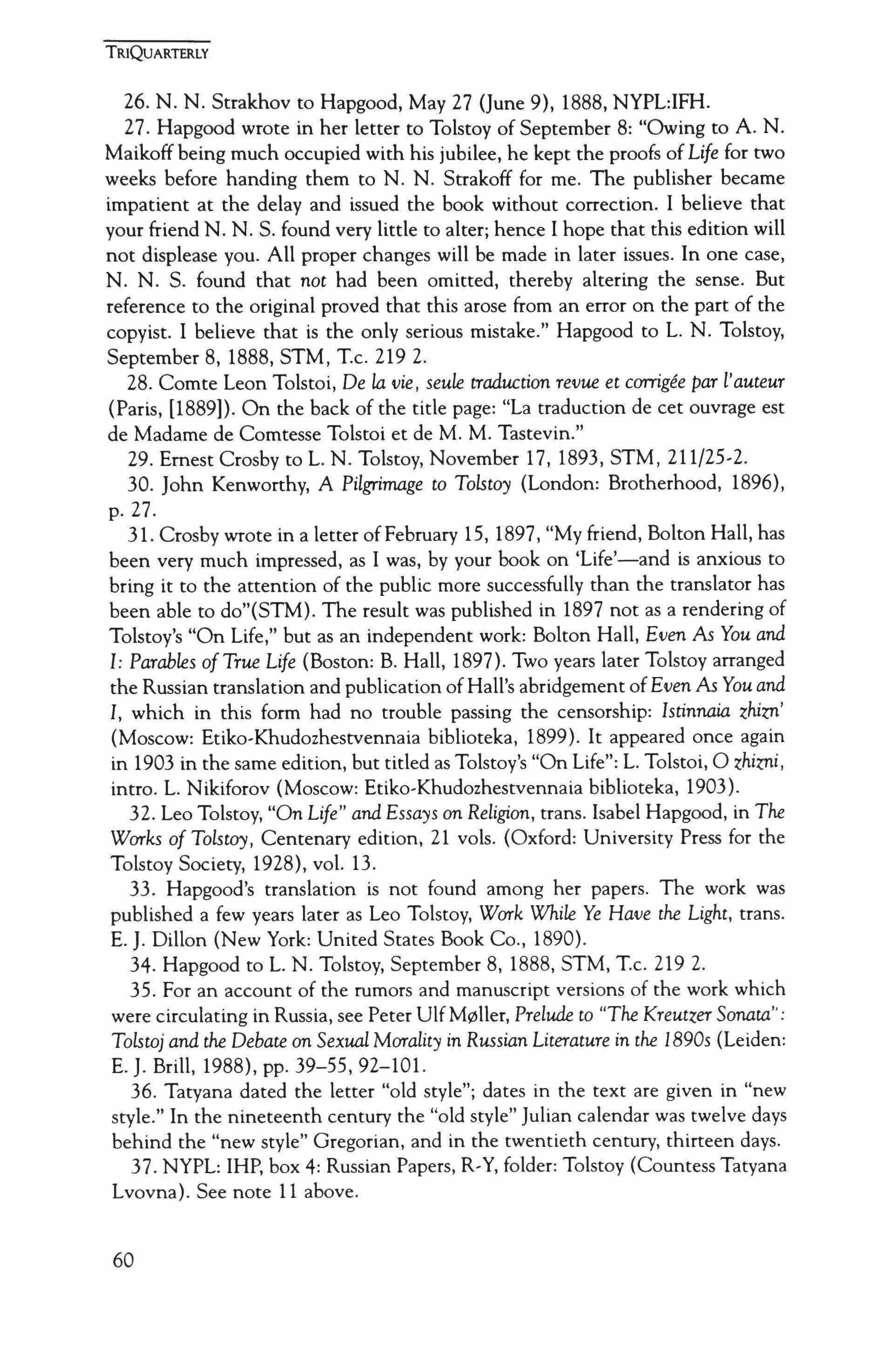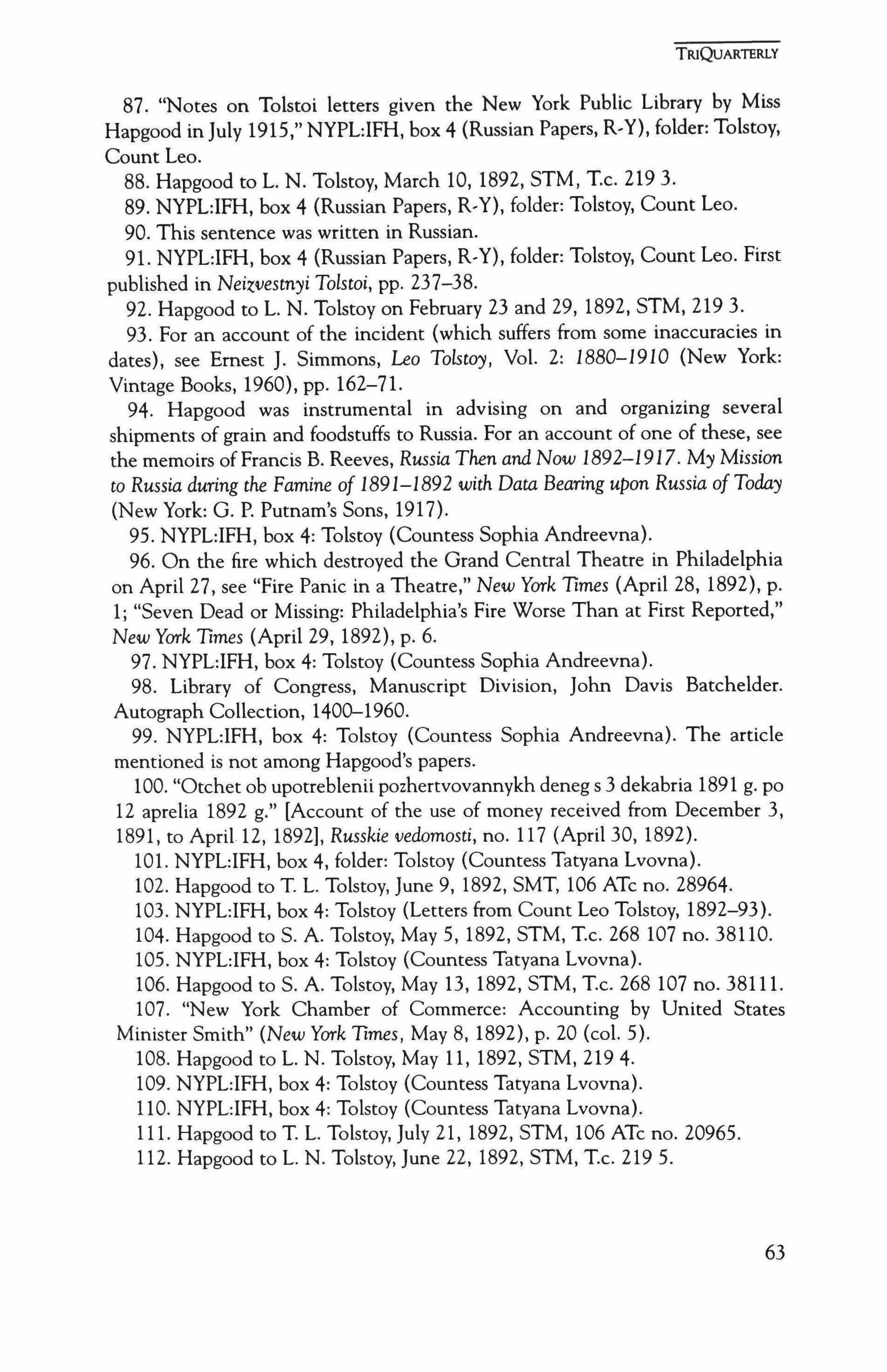 This is the third in a series of articles presenting Tolstoy's correspondence with Americans, based on material from the joint U.S.-Russian project "Tolstoy and His U.S. Correspondents" ("Tolstoy's American Mailbag: Selected Exchanges with His Occasional Correspondents" and "Tolstoy's American Disciple: Letters to Ernest Howard Crosby, 1894-1906" appeared in TriQuarterly 95 and TriQuarterly 98). Begun in 1986 under the auspices of the International Research and Exchanges Board, the Association of Learned Societies, and the Academy of Sciences of the USSR, since 1991 this project has been sponsored by the Gorky Institute of World Literature of the Russian Academy of Sciences in Moscow. The project has received major and essential institutional support from the Tolstoy State Museum in Moscow, especially the staff of its Manuscript Division. Activities of the project in the United States have greatly benefited from the support of the staff of the Slavonic and Baltic Division of the Research Libraries of the New York Public Library. The director of the project for the Russian side is Dr. L. D. Gromova, the chief editor is N. P. Velikanova; the activities of the American side are coordinated by the author of this publication, who expresses his gratitude to the staffof the Tolstoy State Museum and its Manuscript Division and to the Gorky Institute for assistance in this research.