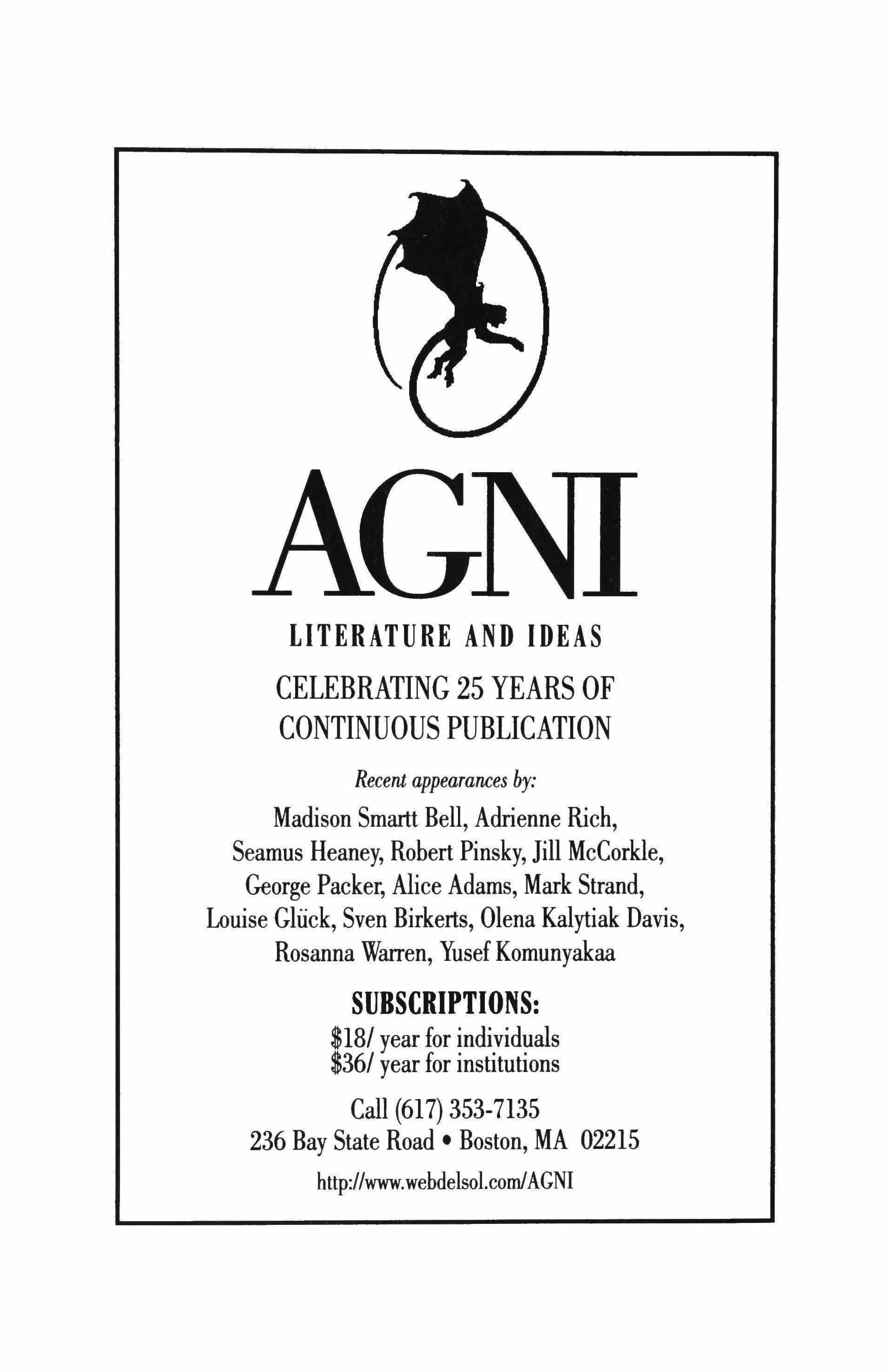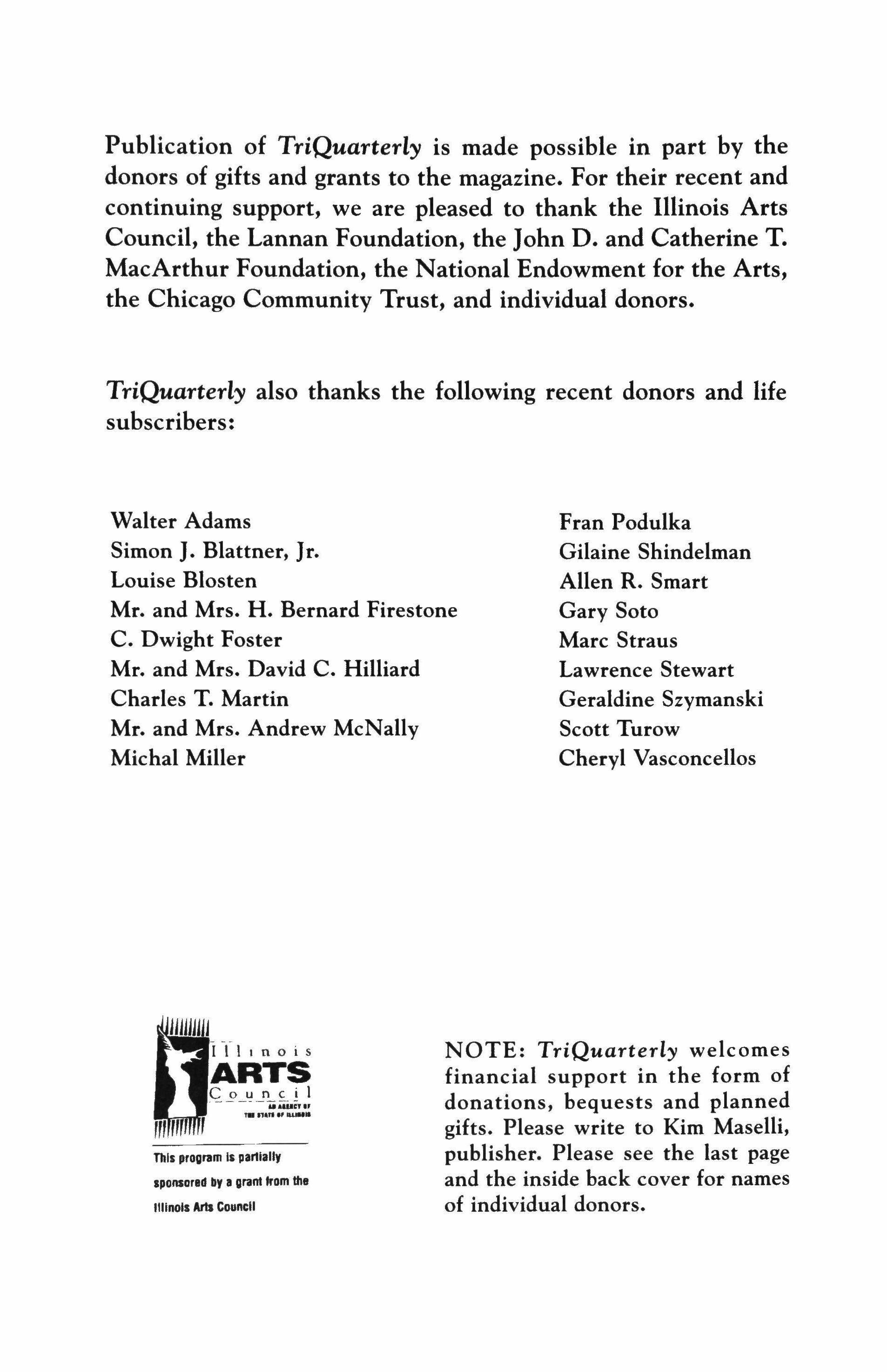 NOTE: TriQuarterly welcomes financial support in the form of donations, bequests and planned gifts. Please write to Kim Maselli, publisher. Please see the last page and the inside back cover for names of individual donors.