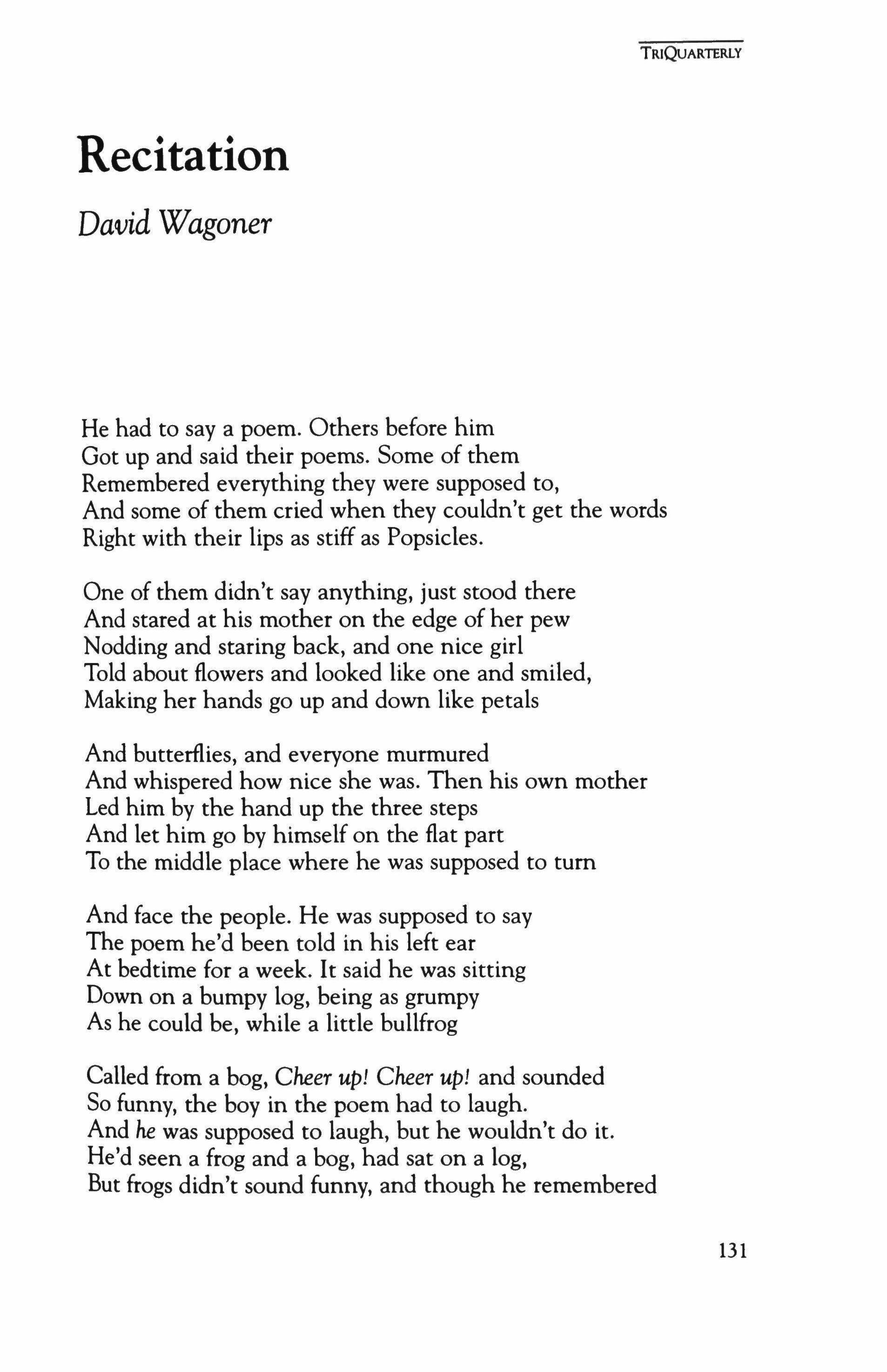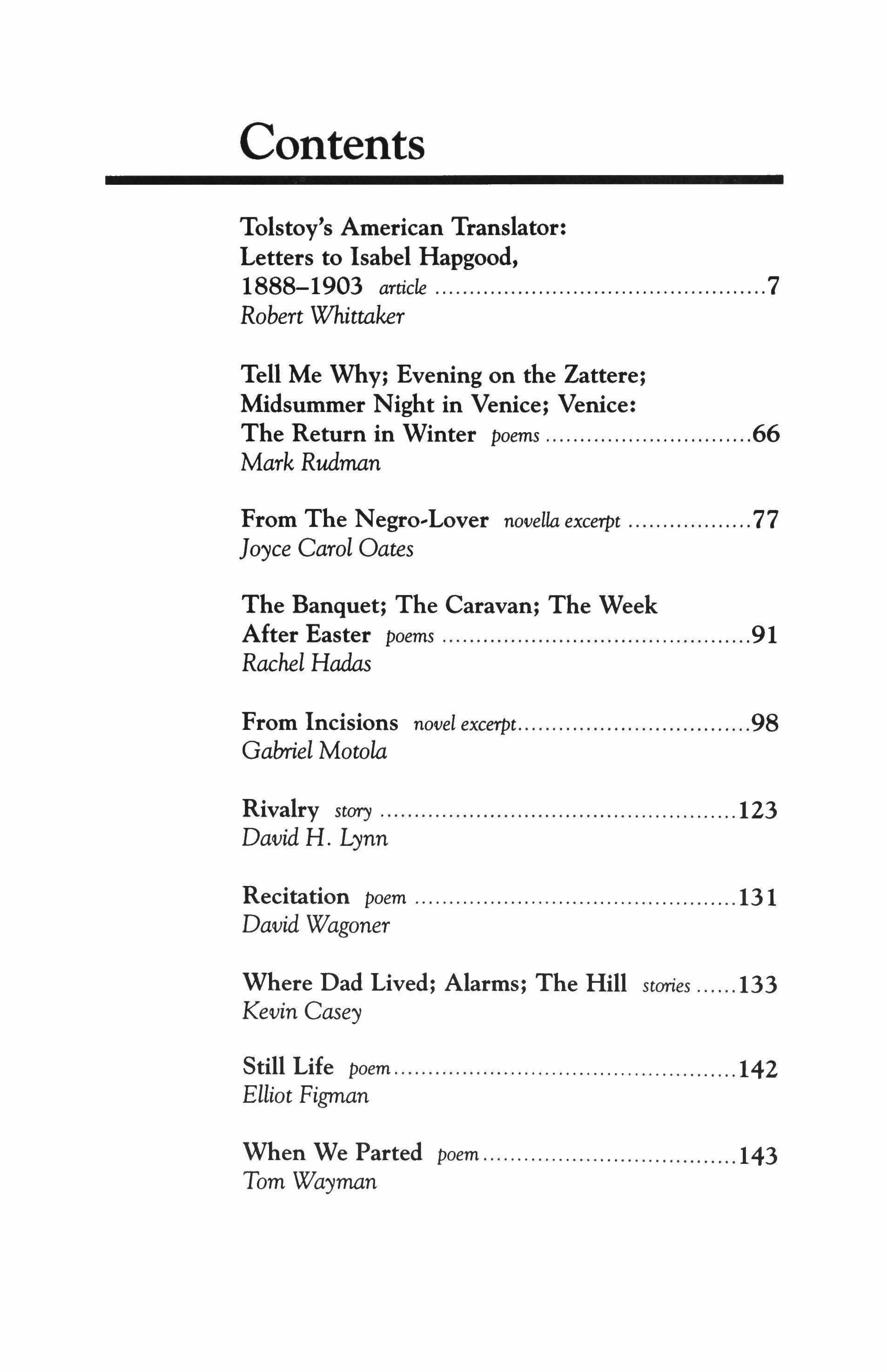 Carol Oates The Banquet; The Caravan; The Week After Easter poems 91 Rachel Hadas From Incisions novel excerpt. 98 Gabriel Motola Rivalry story 123 David H. Lynn Recitation poem 131 David Wagoner Where Dad Lived; Alarms; The Hill stories 133 Kevin Casey Still Life poem 142 Elliot Figman When We Parted poem 143 Tom Wayman