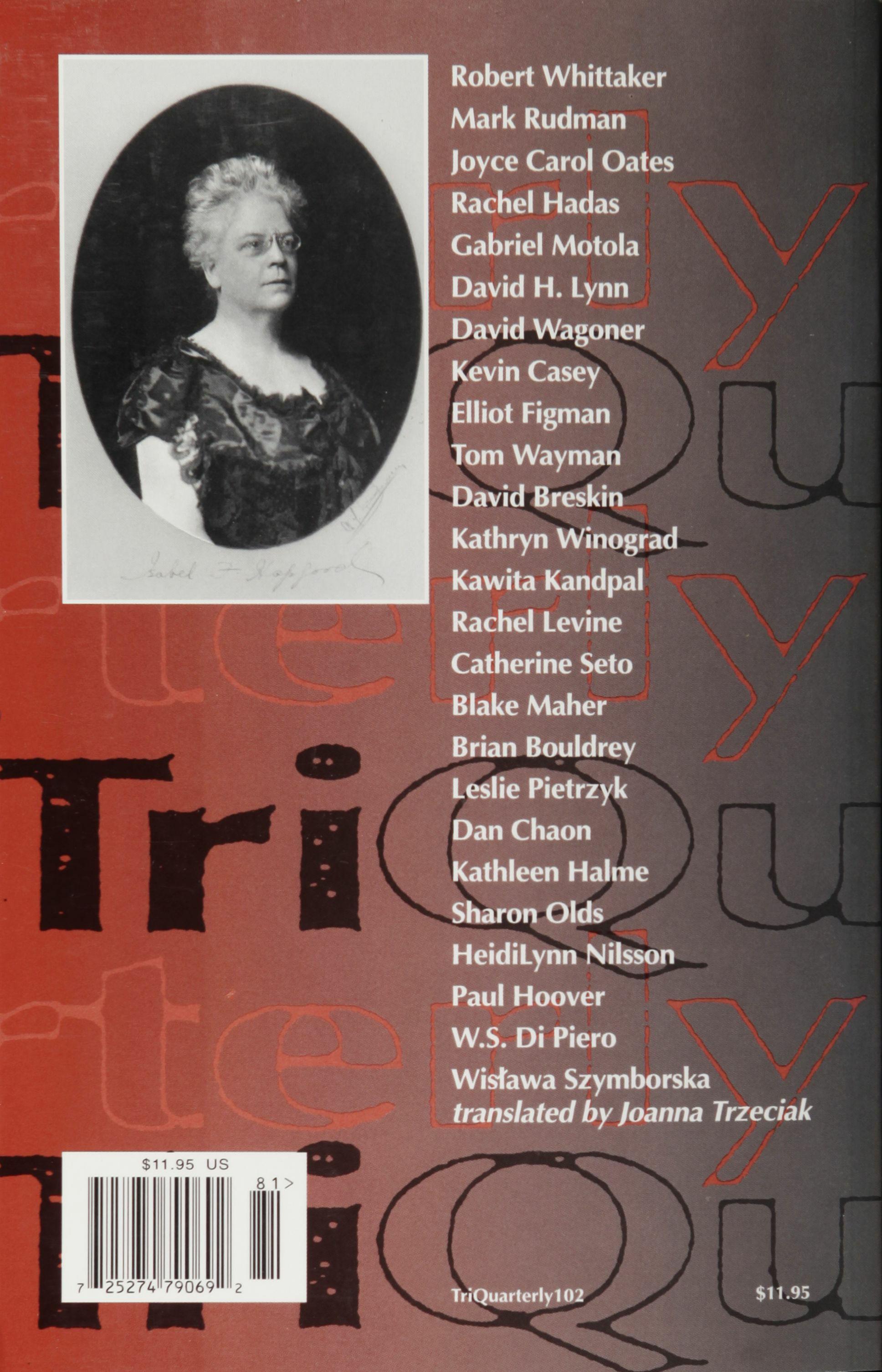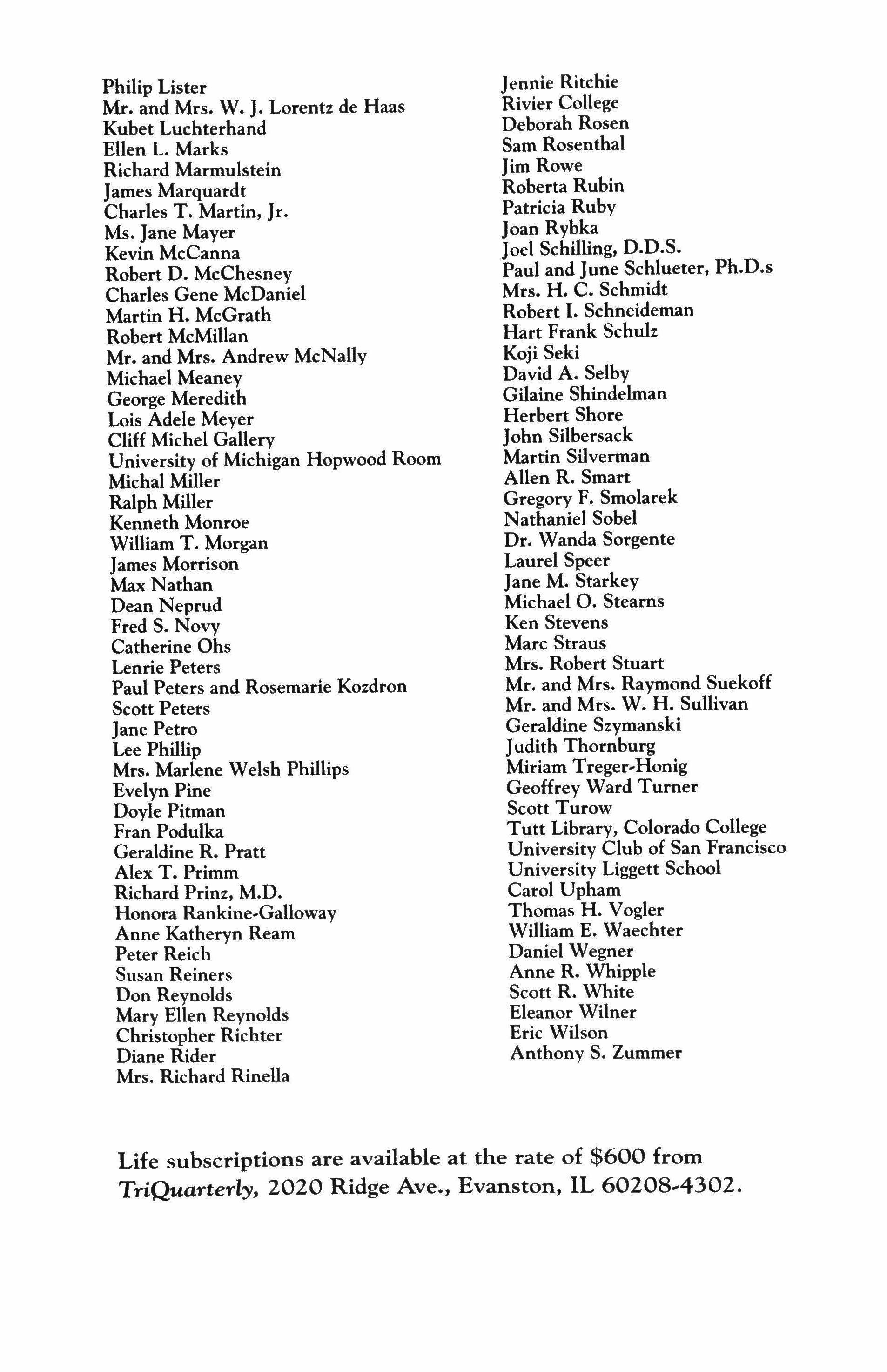 Life subscriptions are available at the rate of $600 from TriQuarterly, 2020 Ridge Ave., Evanston, IL 60208�4302.
