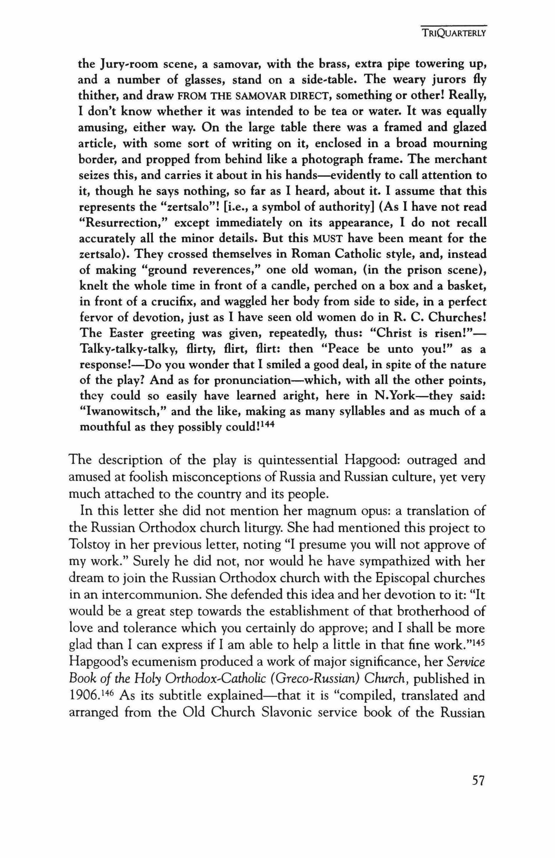 published her translation of the Meditations of the French priest Joseph Roux," and the next year, in addition to a large French classic (Les Miserables, in five volumes), she published a translation from the Italian of Edmondo De Amicis, Cuore.? However, no other European language and culture affected Hapgood as deeply as Russian, to which she was profoundly committed by the time she moved to Boston with her mother in 1881. It should be noted that Hapgood also brought with her from Worcester a dedication to the Episcopal Church, to parish outreach into the community through charitable work, and to church unity, specifically its link to the Russian Orthodox Church.'?