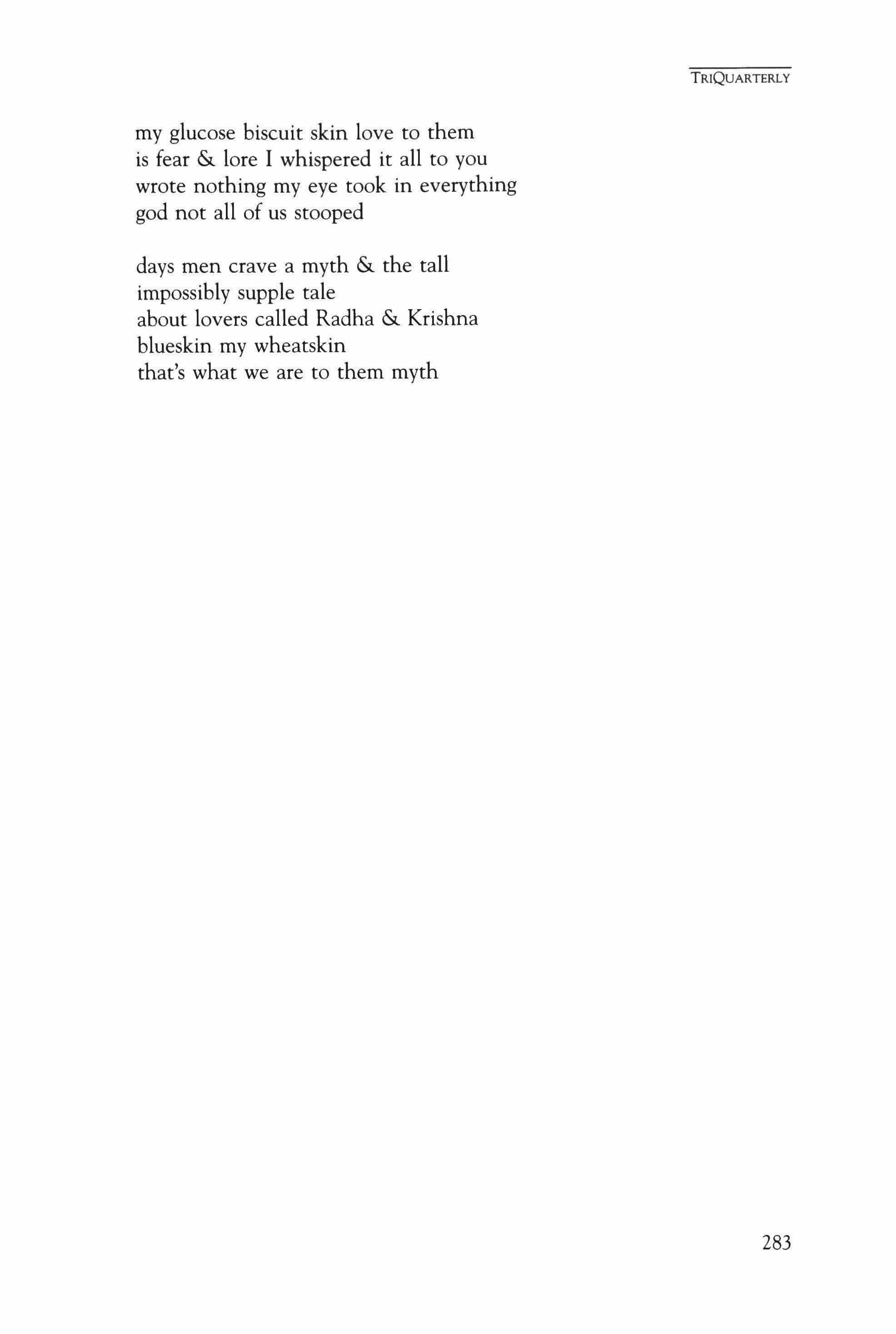 days men crave a myth & the tall impossibly supple tale about lovers called Radha & Krishna blueskin my wheatskin that's what we are to them myth