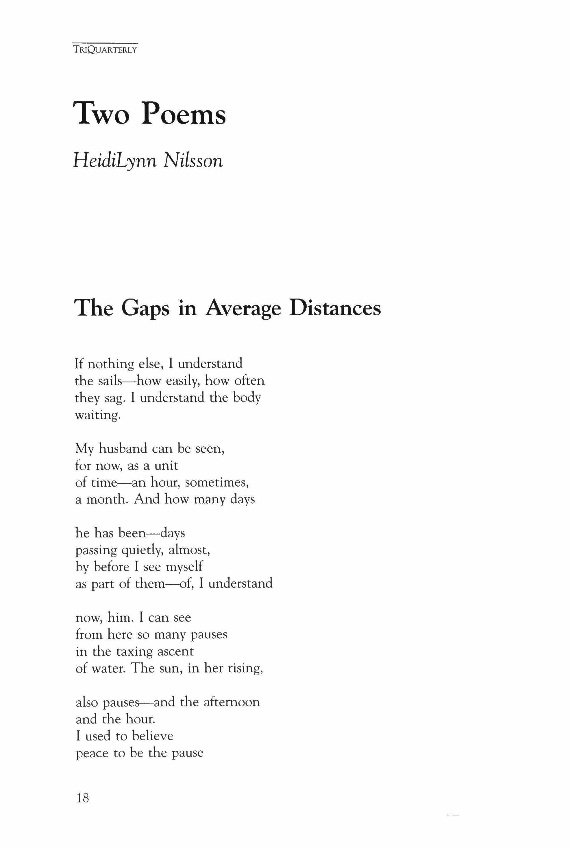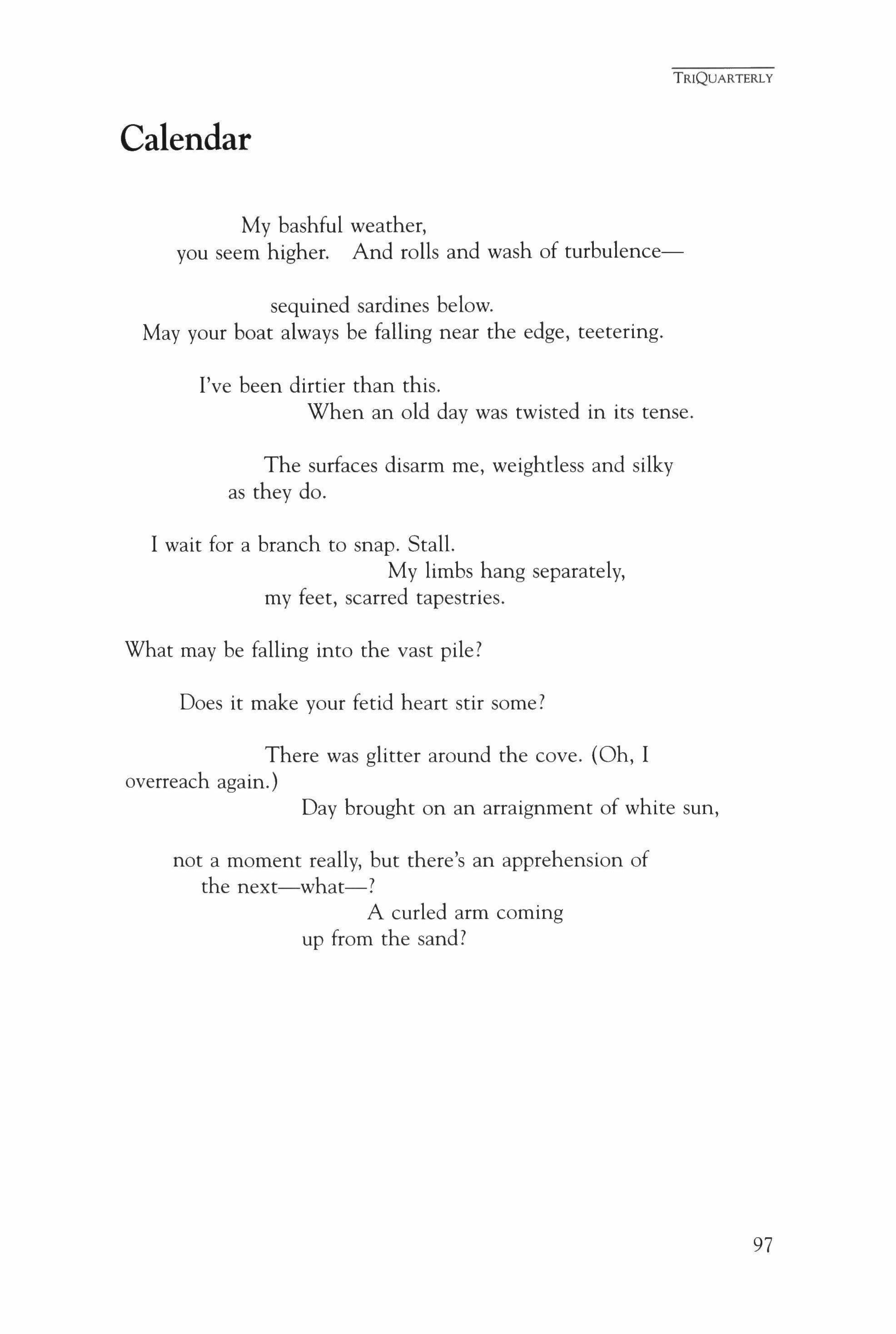 between work-weeks-s-a walk along either shore; the thin, complacent reach of the waves. Piers stacked in sections on the leaf-strewn beacheshalf-bridges drawn in before each lake closes its eye.
