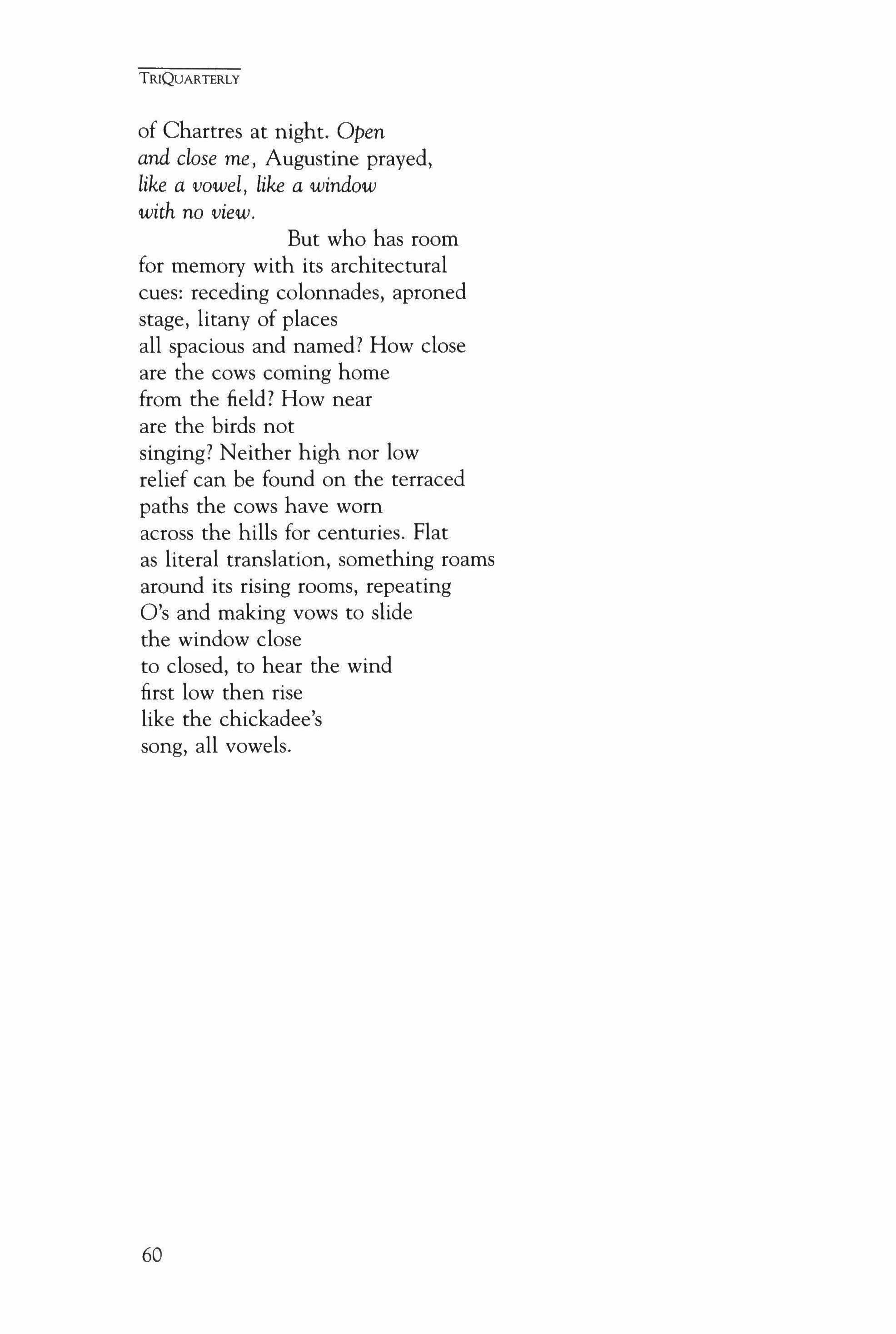 My husband can be seen, for now, as a unit of time-an hour, sometimes, a month. And how many days he has been--days passing quietly, almost, by before I see myself as part of them-of, I understand now, him. I can see from here so many pauses in the taxing ascent of water. The sun, in her rising, also pauses-and the afternoon and the hour.
