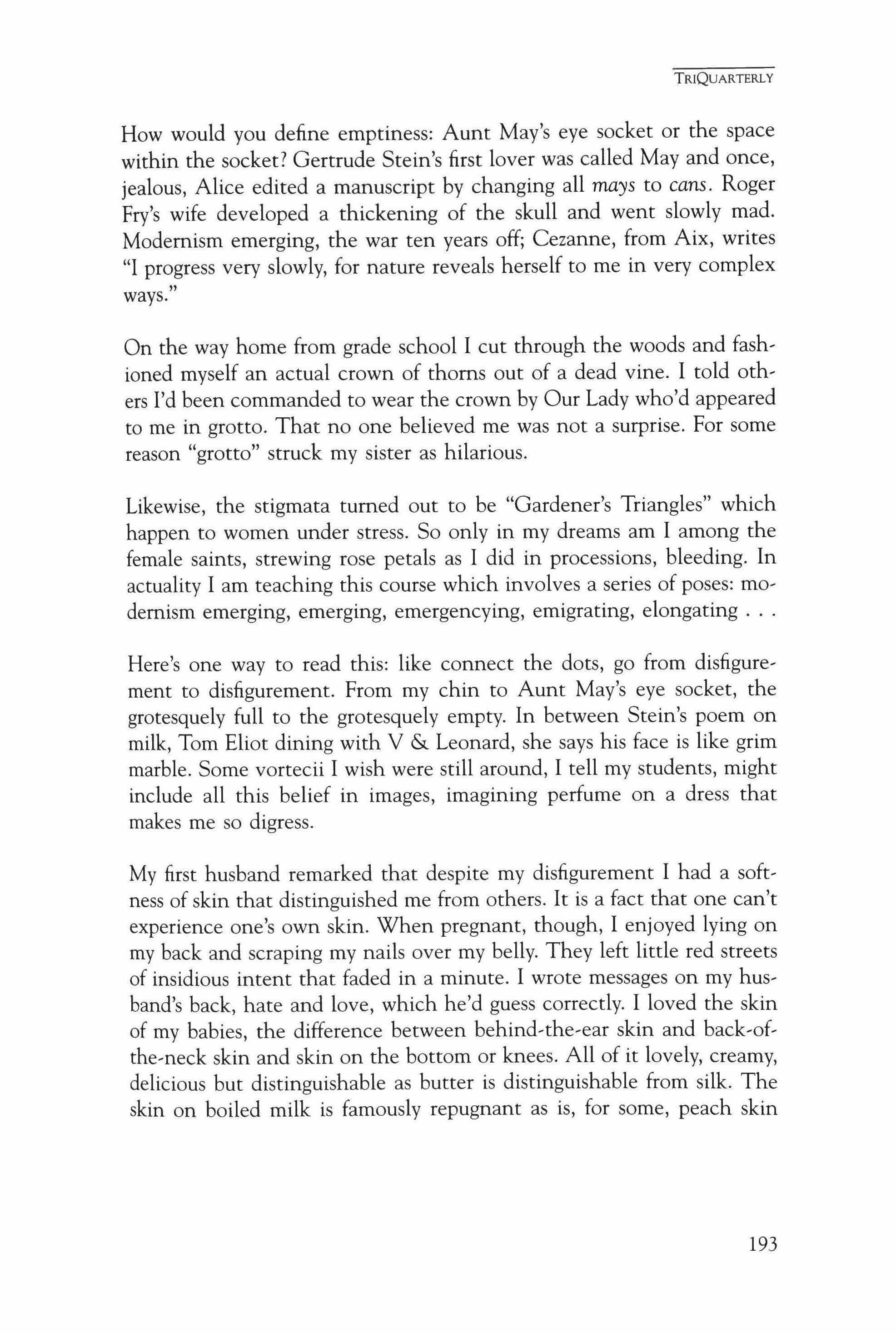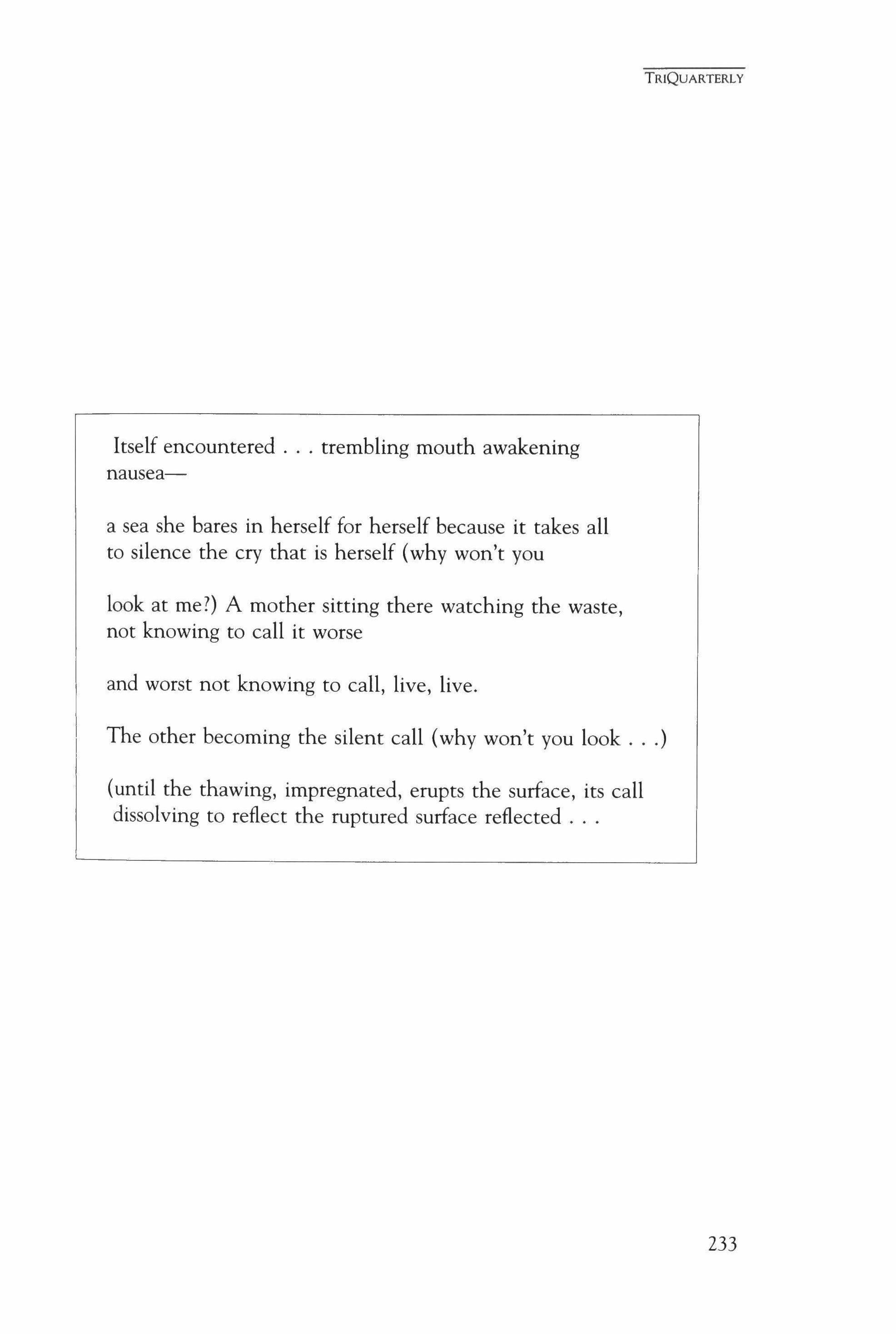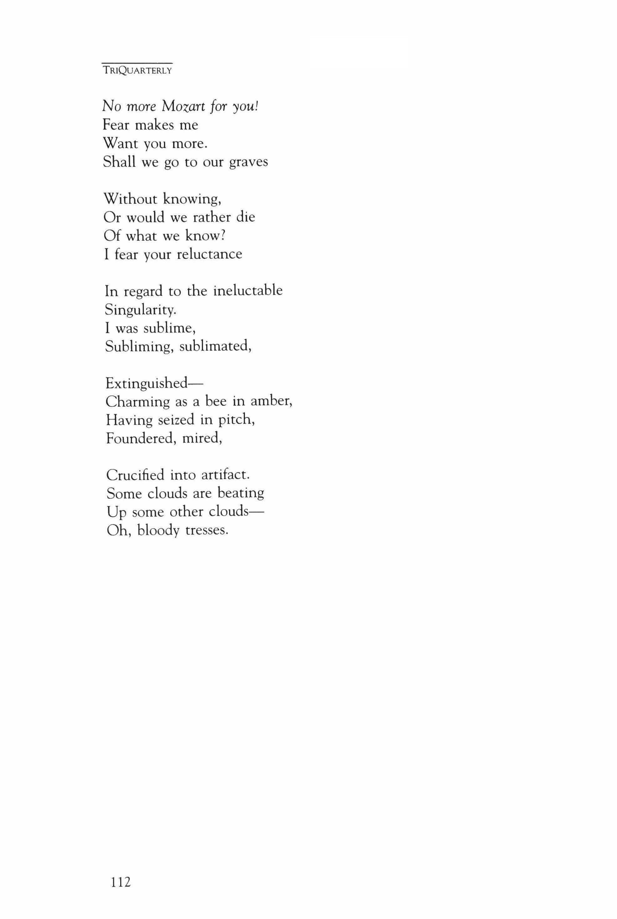 Copyright © 2000 by TriQuarterly. No part of this volume may be reproduced in any manner without written permission. The views expressed in this magazine are to be attributed to the writers, not the editors or sponsors. Printed in the United States of America by Edwards Brothers Printing. Typeset by TriQuarterly. ISSN: 0041-3097.