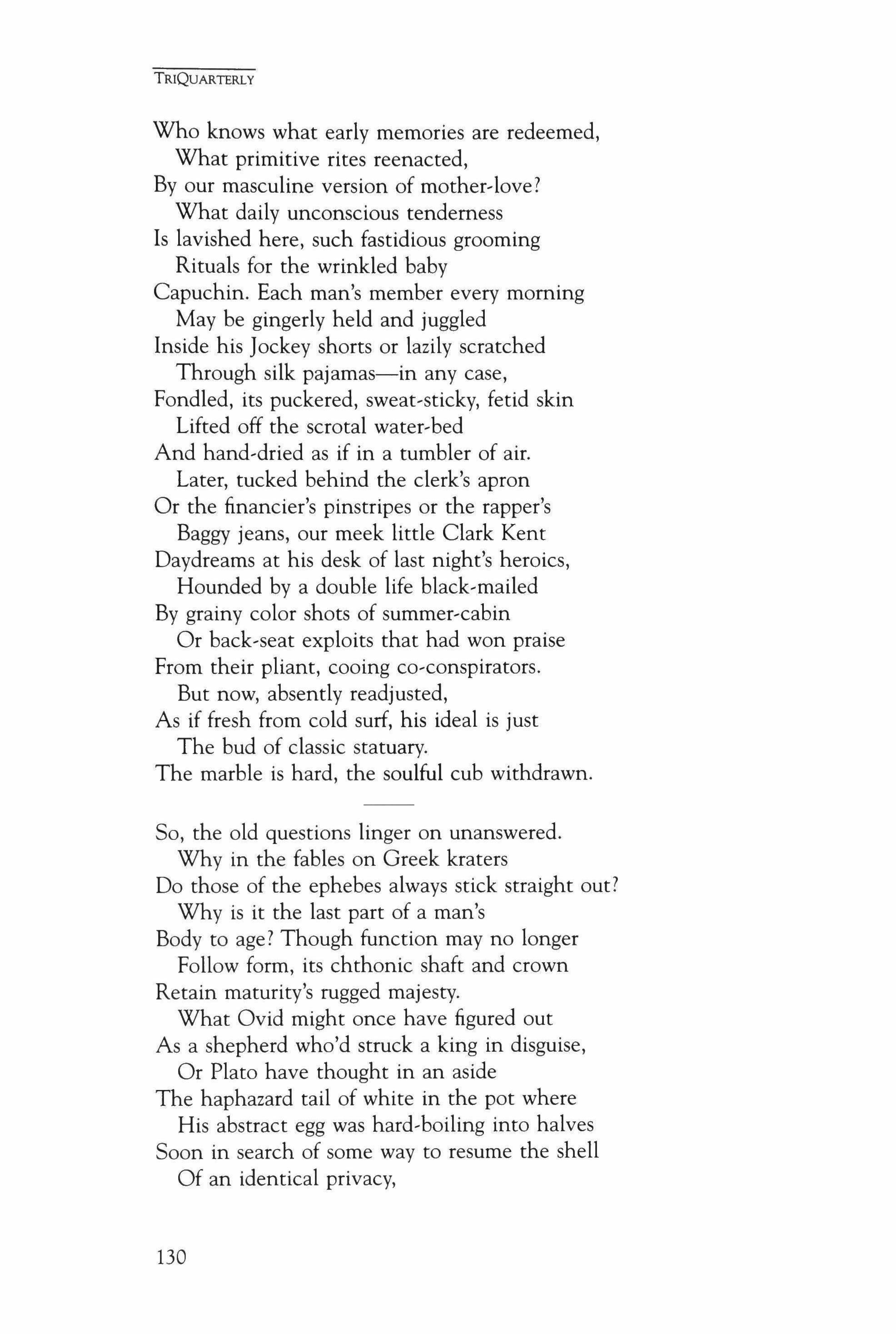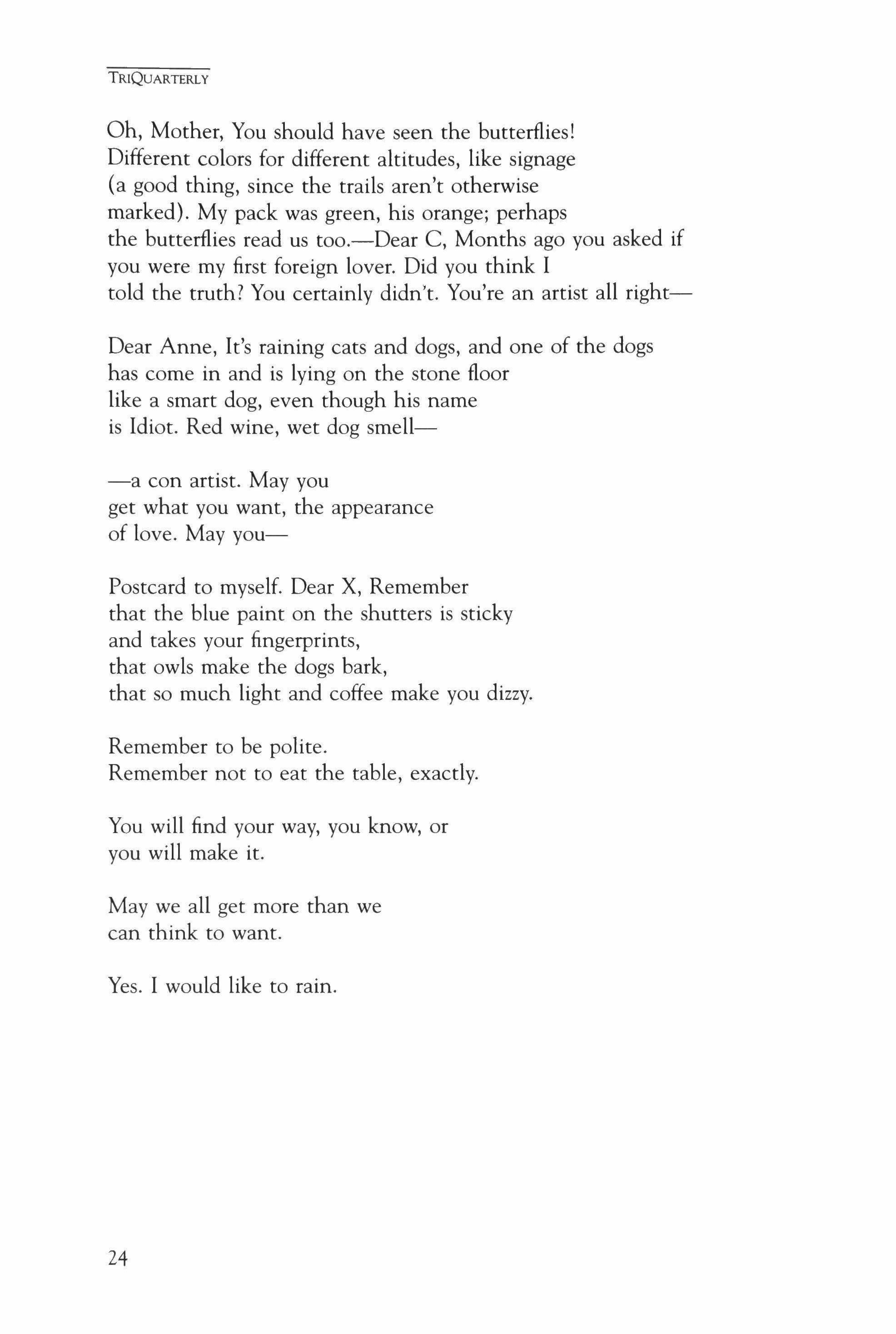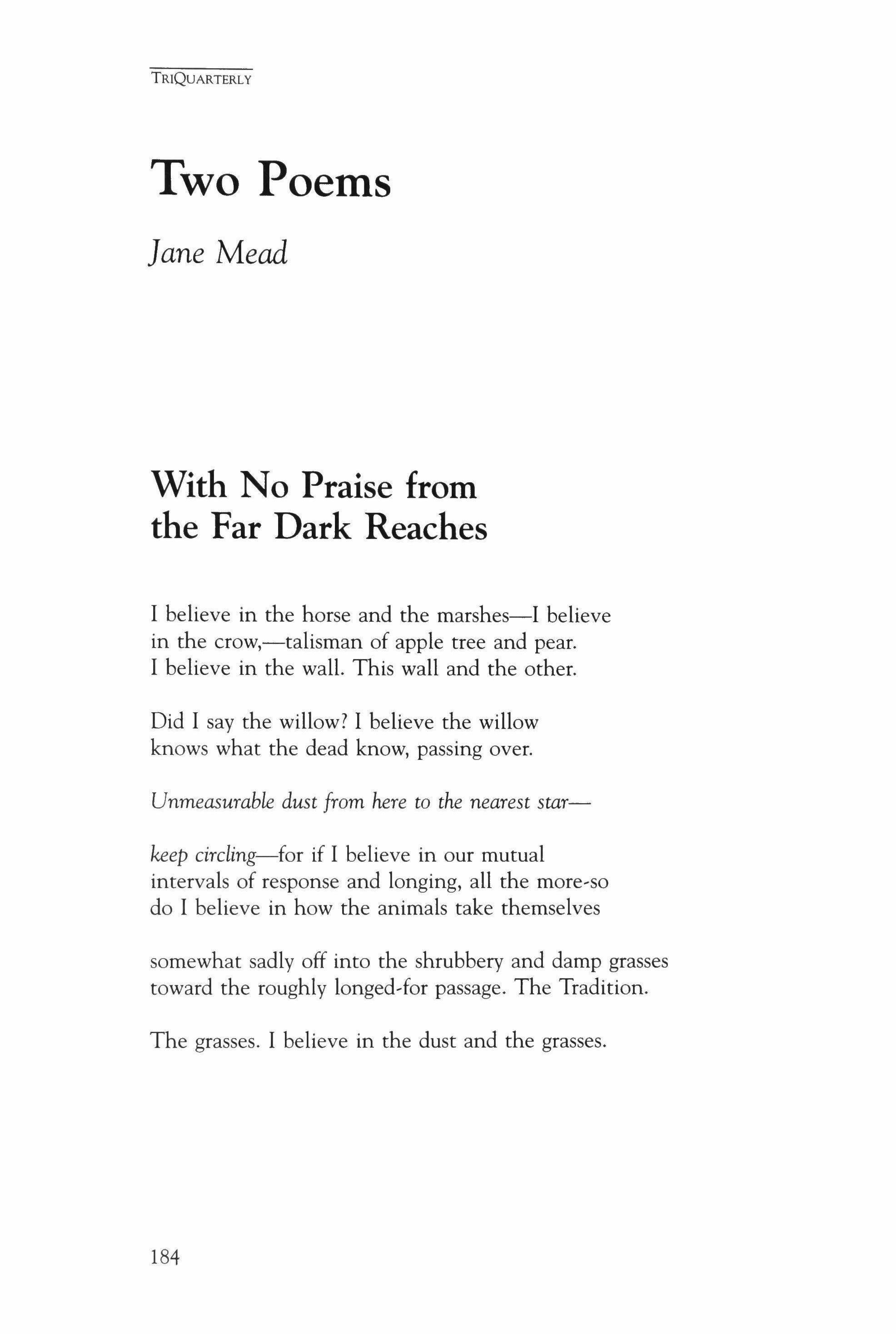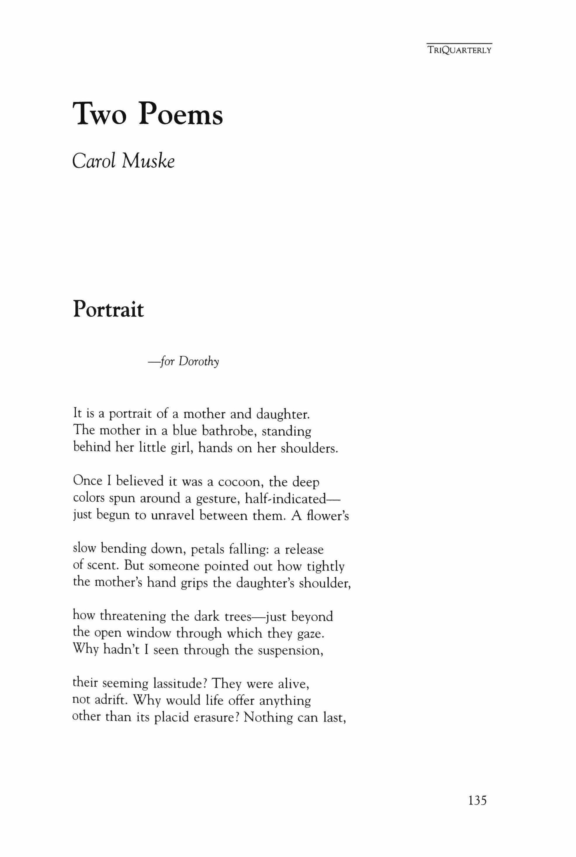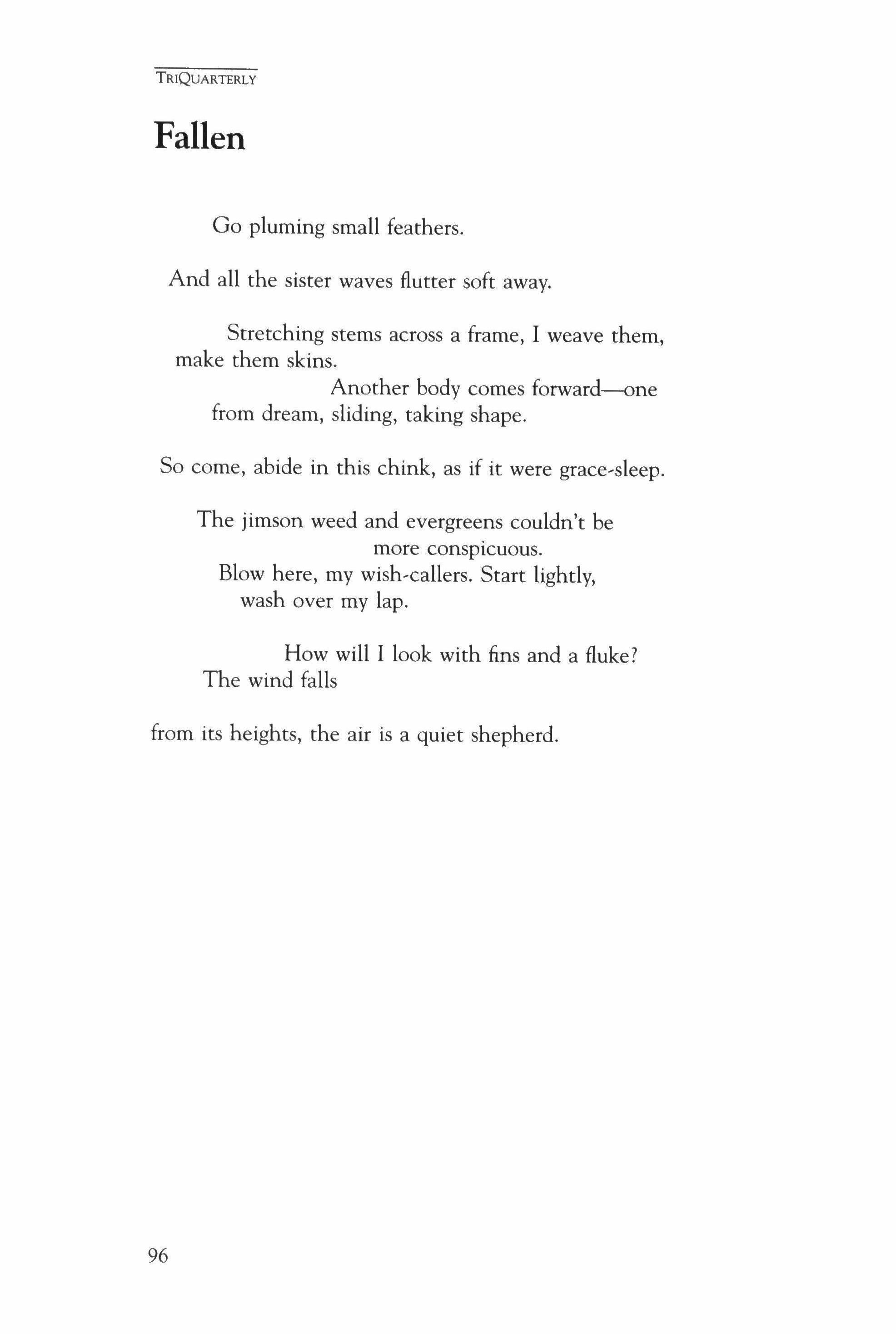 J. D. McClatchy's most recent books are a collection of poems Ten Commandments (Knopf, 1998) and a collection of essays, Twenty Ques, tions (Columbia University Press, 1998). He is editor of the Yale Review. Lynne McMahon's most recent book of poems is The House of Enter, taining Science (David R. Godine, 1999). Jane Mead's The Lord and the General Din of the World was published by Sarabande Books in 1996. The recipient of a Whiting Writer's Award and a Completion Grant from the Lannan Foundation, she is Poet-in-Residence at Wake Forest University. Carol Muske-Dukes has published six books of poems, most recently An Octave Above Thunder (Penguin, 1997), and two novels. Her third novel, After Life, will be published by Random House in the Spring of 2001. She is director of the Phd program in Literature and Creative Writing at the University of Southern California. HeidiLynn Nilsson's work has appeared in Agni, Pleiades, and Imperfect Paradise: New Young American Poets. Joe Osterhaus' first collection, "The Domed Road," was published in Take Three: 1 (Graywolf Press, 1996). His poems and reviews have appeared or are forthcoming in Agni, the Antioch Review, the Paris Review, Slate, and elsewhere. Christine Perrin lives in Harrisburg, Pennsylvania, where she teaches poetry at Messiah College. Robert Pinsky's most recent books are Jersey Rain (2000) and The Sounds of Poetry: A Brief Guide (1999), both from Farrar, Straus and Giroux. Kevin Prufer is the author of Strange Wood, winner of the 1997 Wintrop Poetry Series. He is also editor of The New Young American Poets (Southern Illinois University Press, 2000) and Pleiades. His newest poems appear in the Antioch Review, Boulevard, the Southern Review, and elsewhere. Claudia Rankine's third collection, Plot, will be pub, lished by Grove/Atlantic, Spring 2001. She is the author most recently