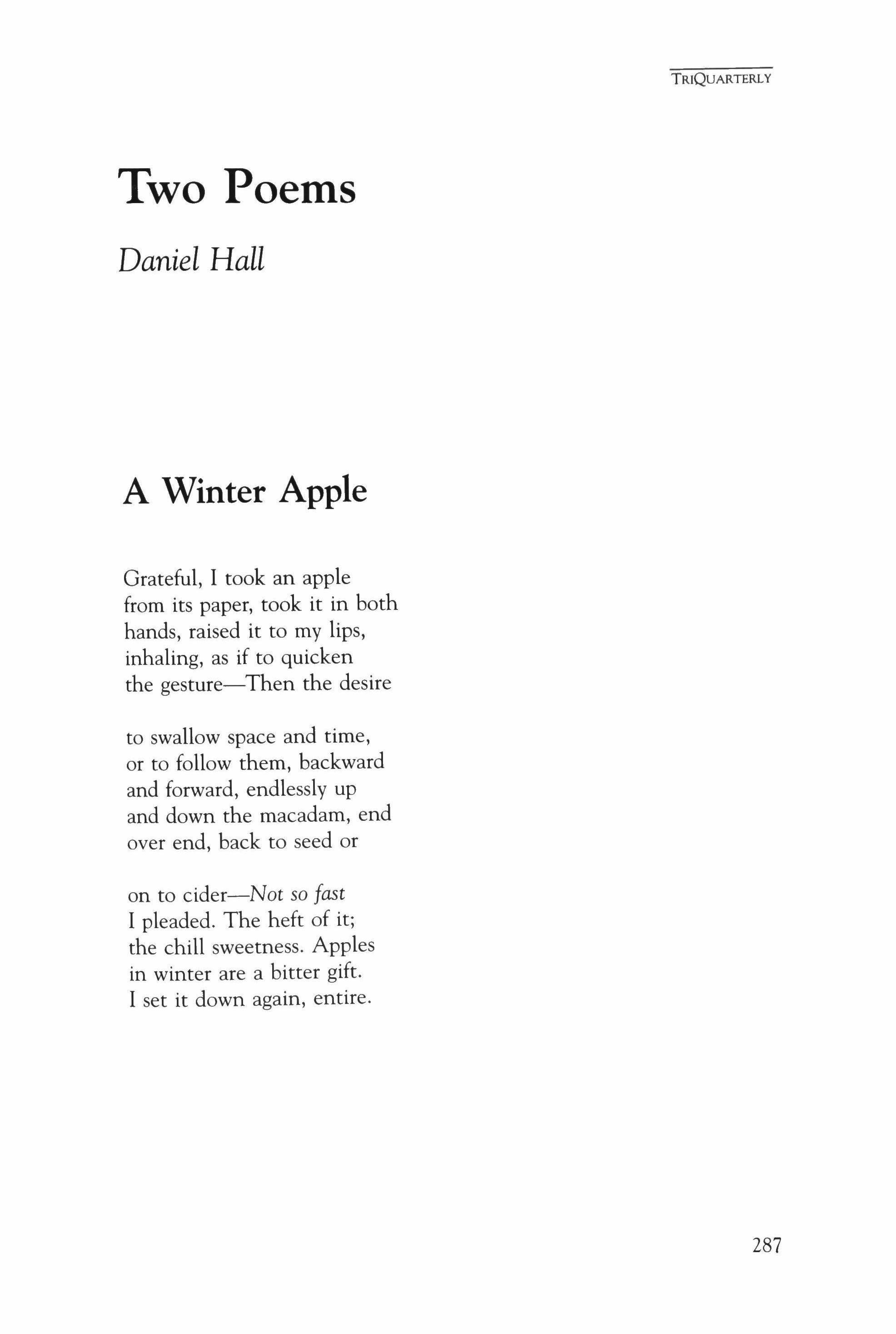 on to cider-Not so fast I pleaded. The heft of it; the chill sweetness. Apples in winter are a bitter gift. I set it down again, entire.