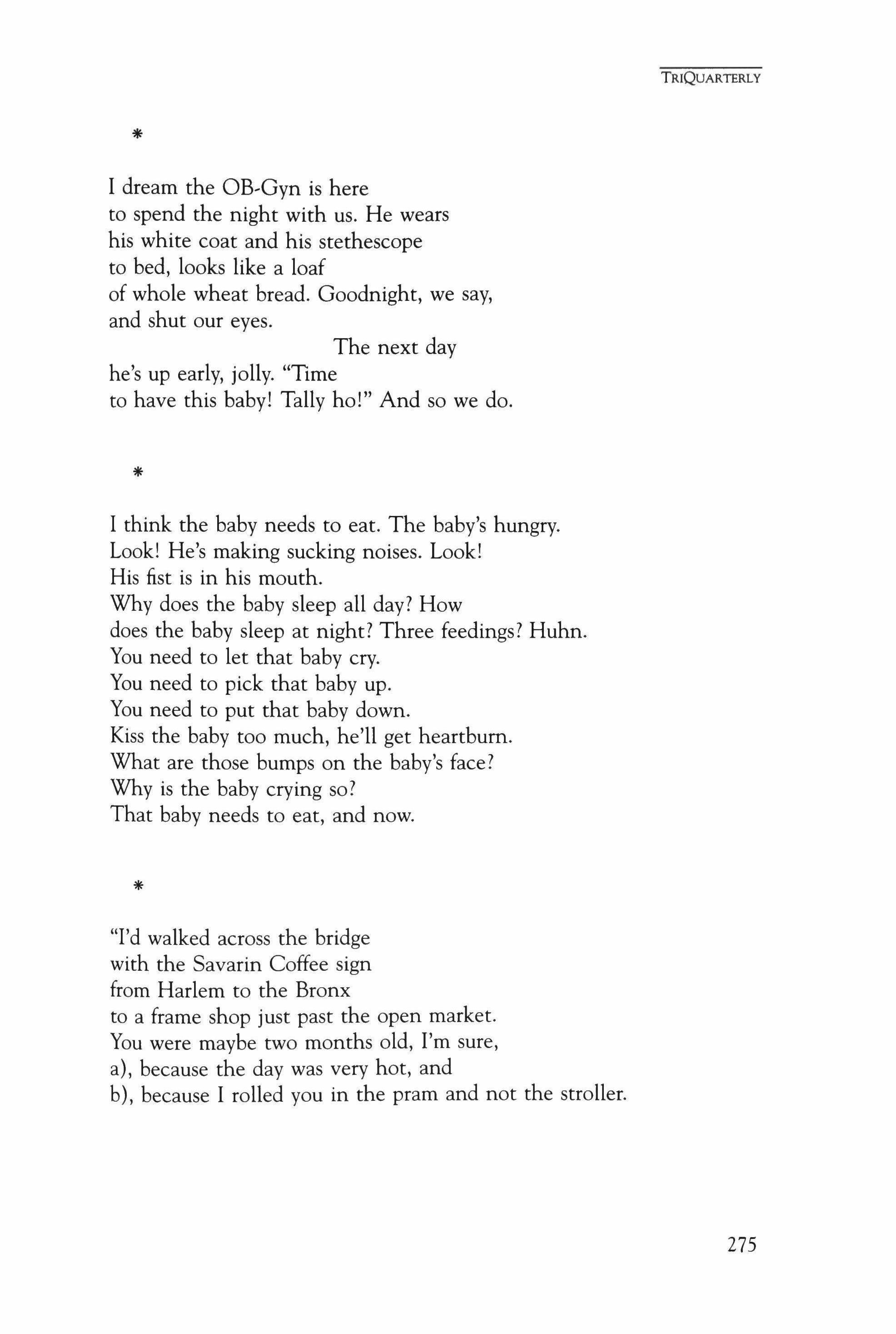 I dream the OB�Gyn is here to spend the night with us. He wears his white coat and his stethescope to bed, looks like a loaf of whole wheat bread. Goodnight, we say, and shut our eyes.