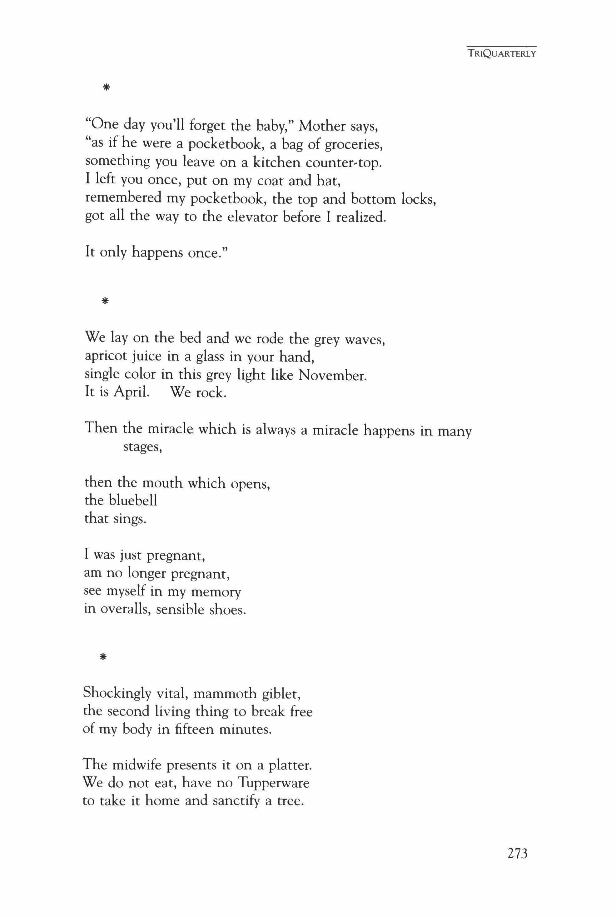 to the mouse squeak of your suckling, behold your avid jaws, your black eyes: otter, oscelot, my whelp, my cub, my seapup. In the days before you smile at me or call me Mama or love me, love is all tit, all wheat-smelling milk, humid crook of the arm