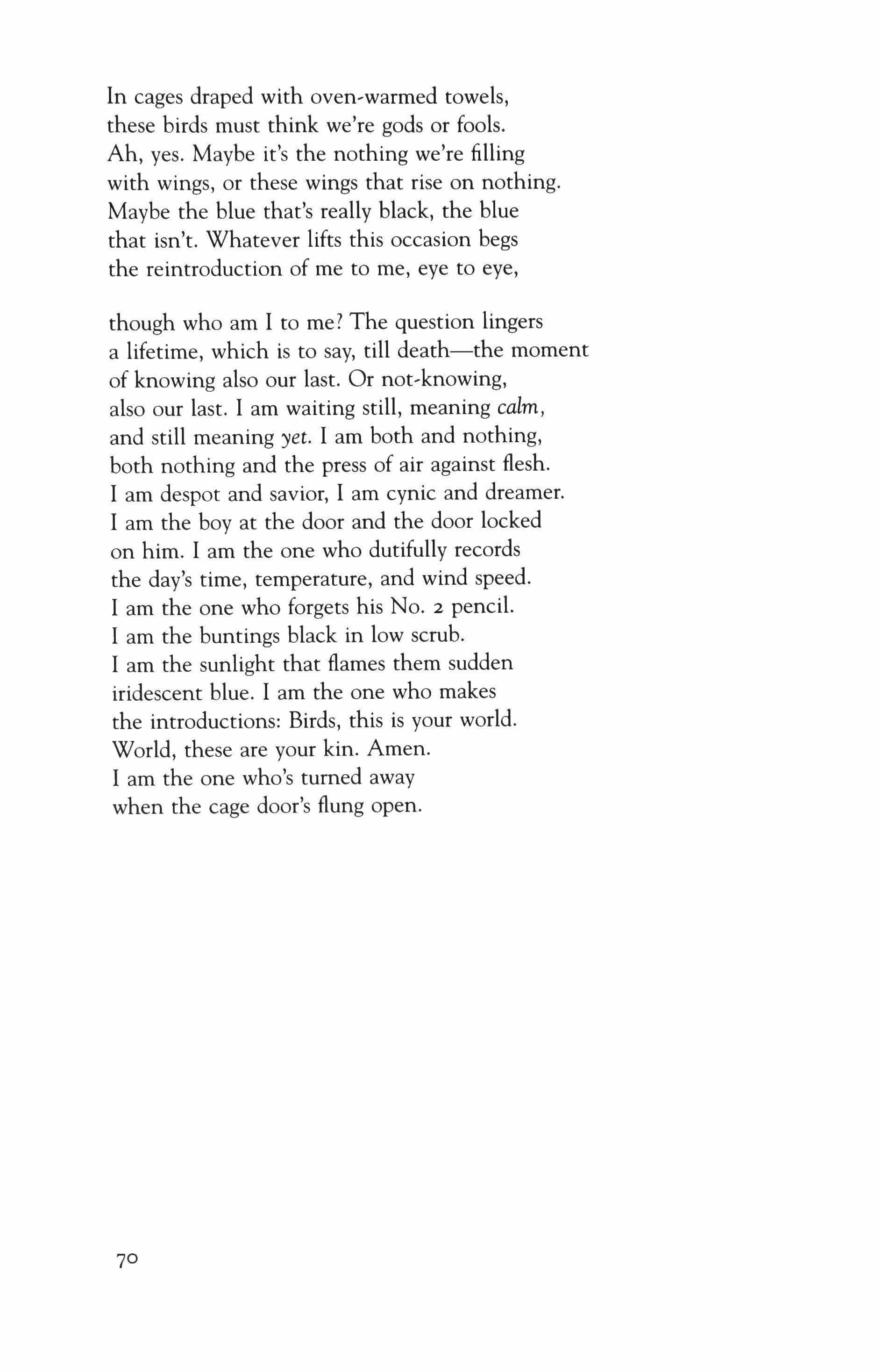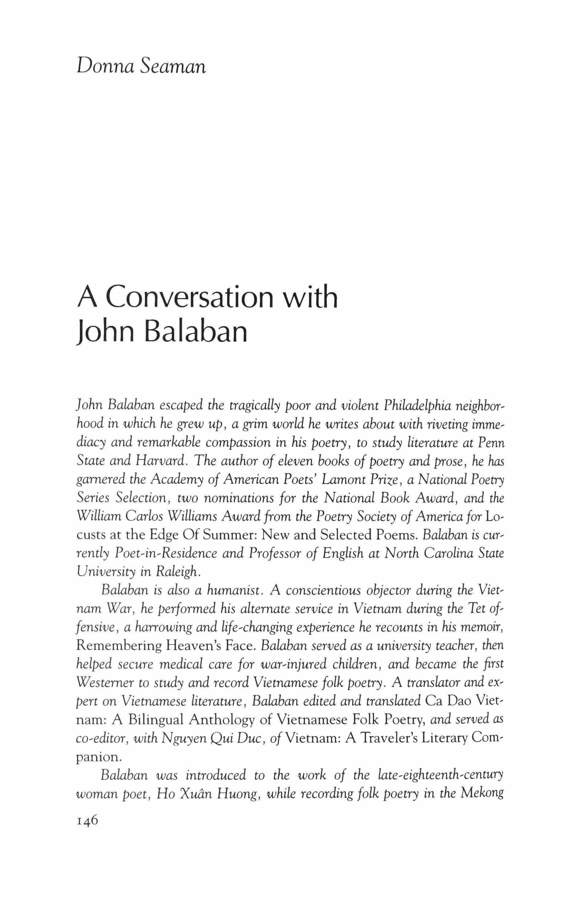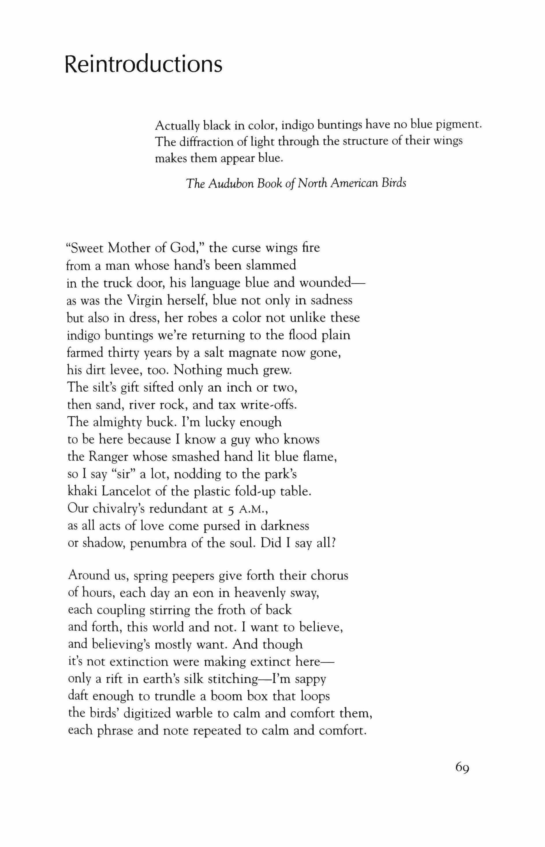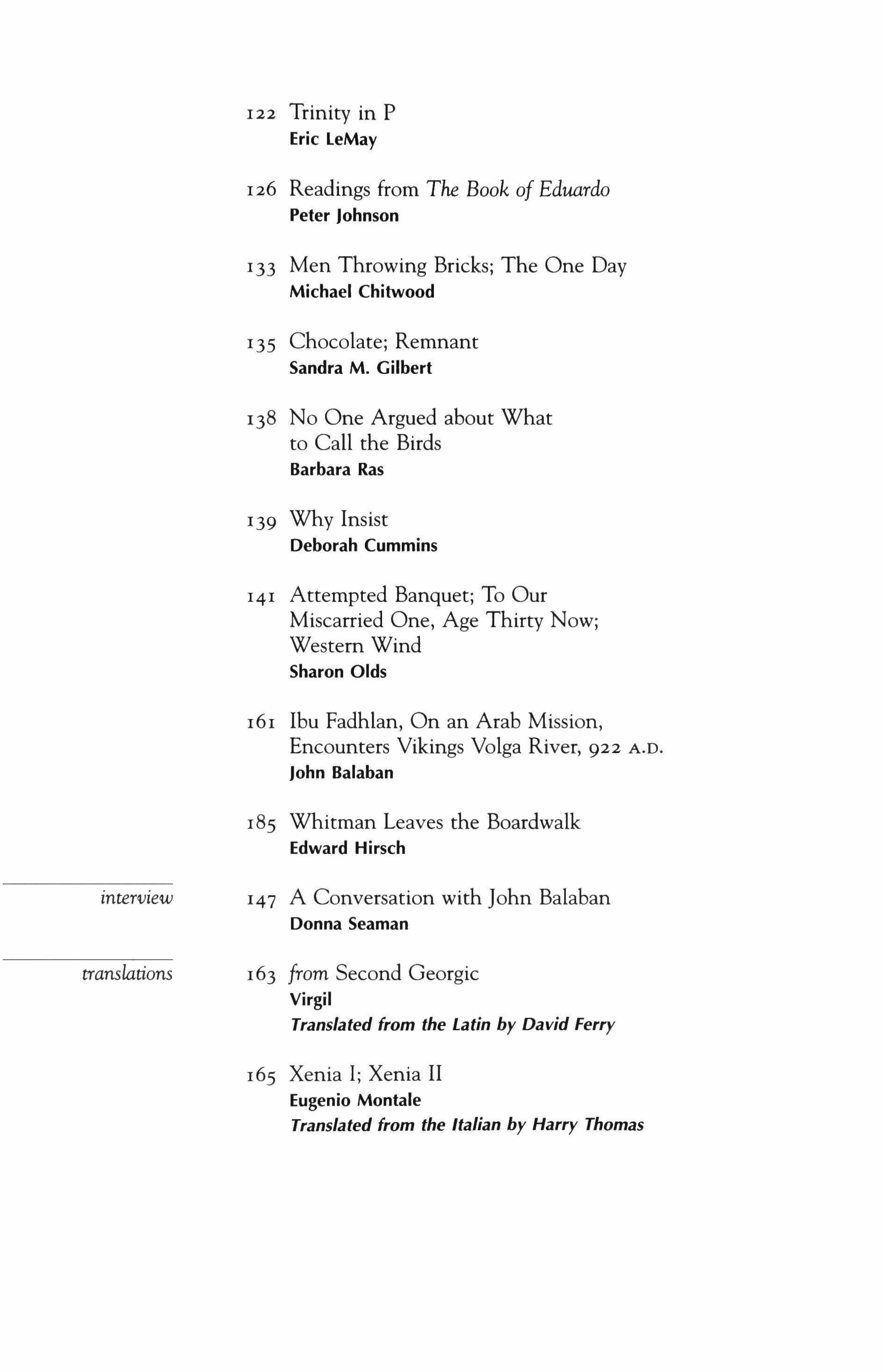 John Balaban is the author of eleven books of poetry and prose. He has won the Academy of American Poets' Lamont Prize, a National Poetry Series Selection, and two nominations for the National Book Award. His collection, Locusts at the Edge of Summer: New and Selected Poems, won the 1998 William Carlos Williams Award from the Poetry Society of America. Aliki Barnstone's most recent book is Wild With It (Sheep Meadow Press, 2002). She is editor of two anthologies, A Book of Women Poets from Antiquity to Now (Schoken/Random House, 1992) and Voices ofLight: Spiritual Poems by Women around the World from Sumeria to Now (Shambhala, 1999)' Rick Barot's poems have appeared in Ploughshares, the New Republic, New England Review, Yale Review, and the Threepenny Review. He is an NEA fellowship recipient and is Jones Lecturer in Poetry at Stanford. Peter Campion is a Wallace Stegner Fellow in poetry at Stanford. His poems and prose have appeared or are forthcoming in Agni, Raritan, Southwest Review, and other journals. Michael Chitwood has work that has recently appeared or is forthcoming in Poetry, Virginia Quarterly Review, the Southern Review, Field, and the Threepenny Review. Deborah Cummins is the author of Beyond the Reach (BKMK Press, 2002) and