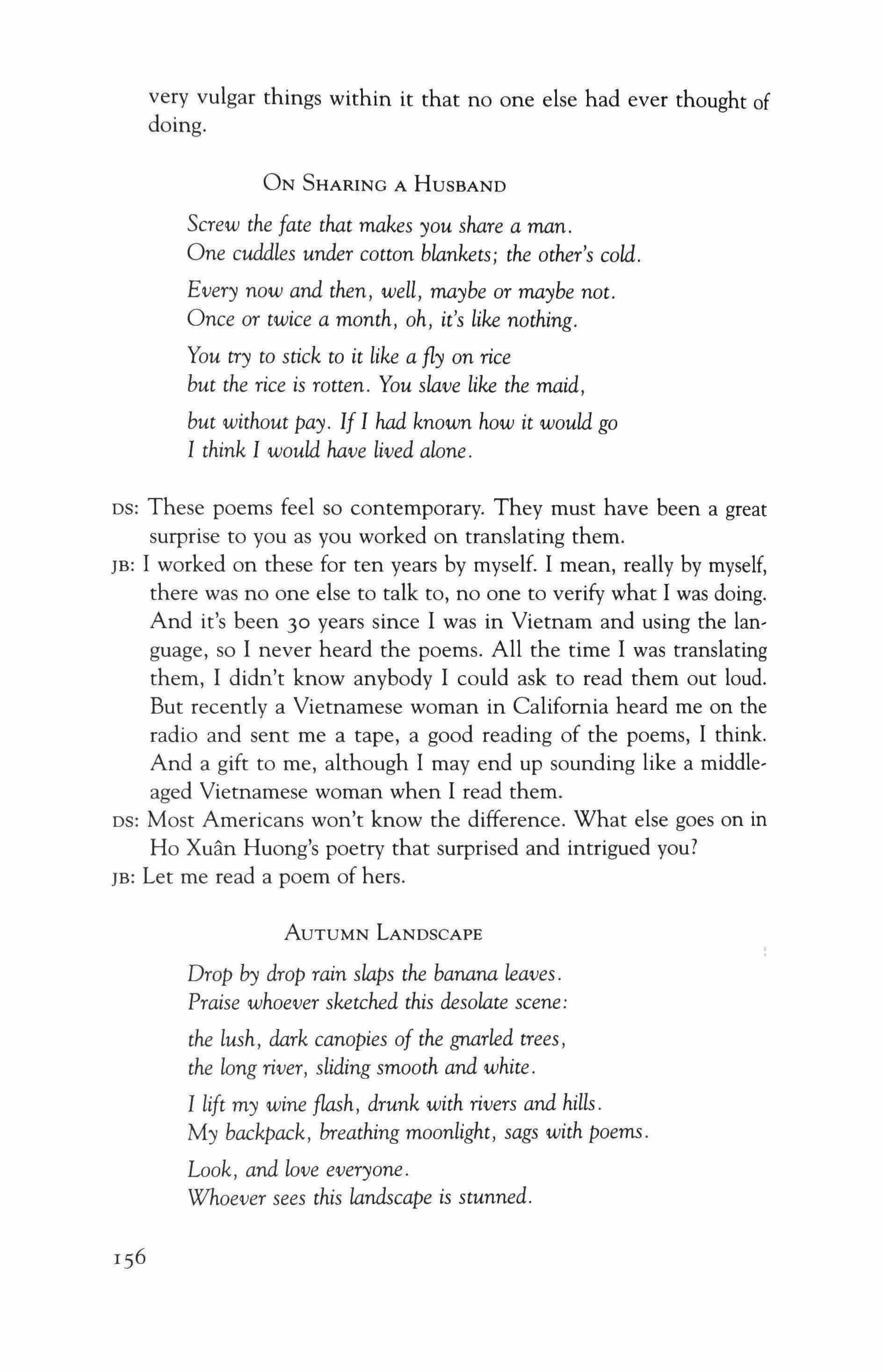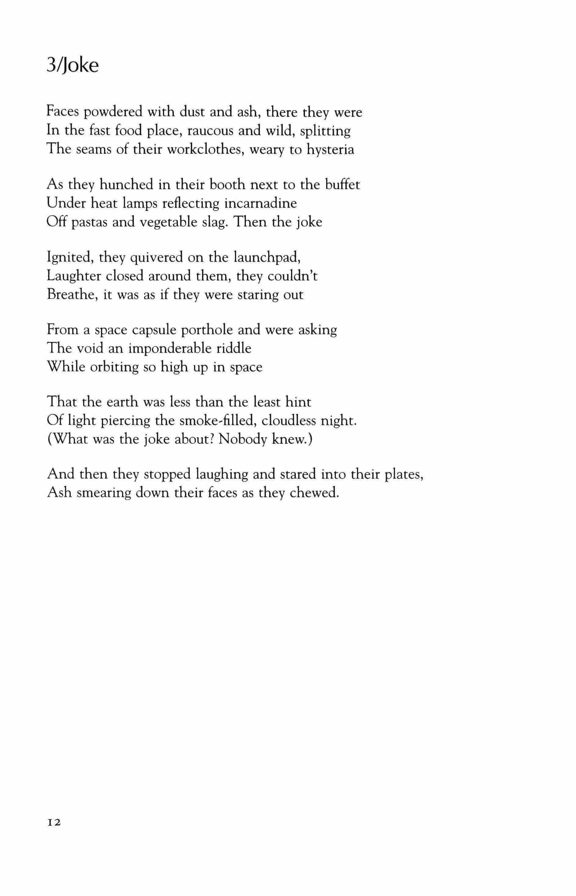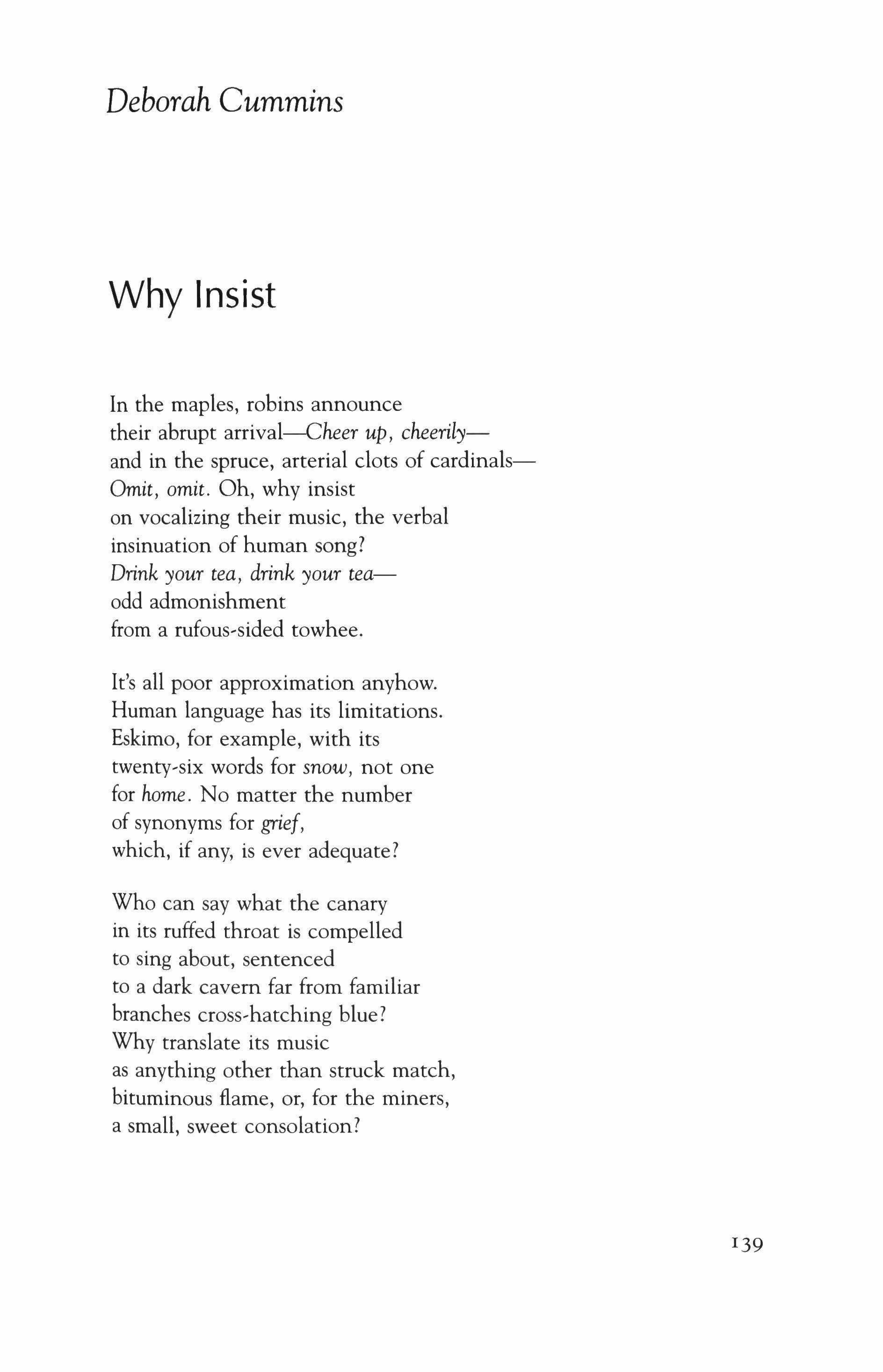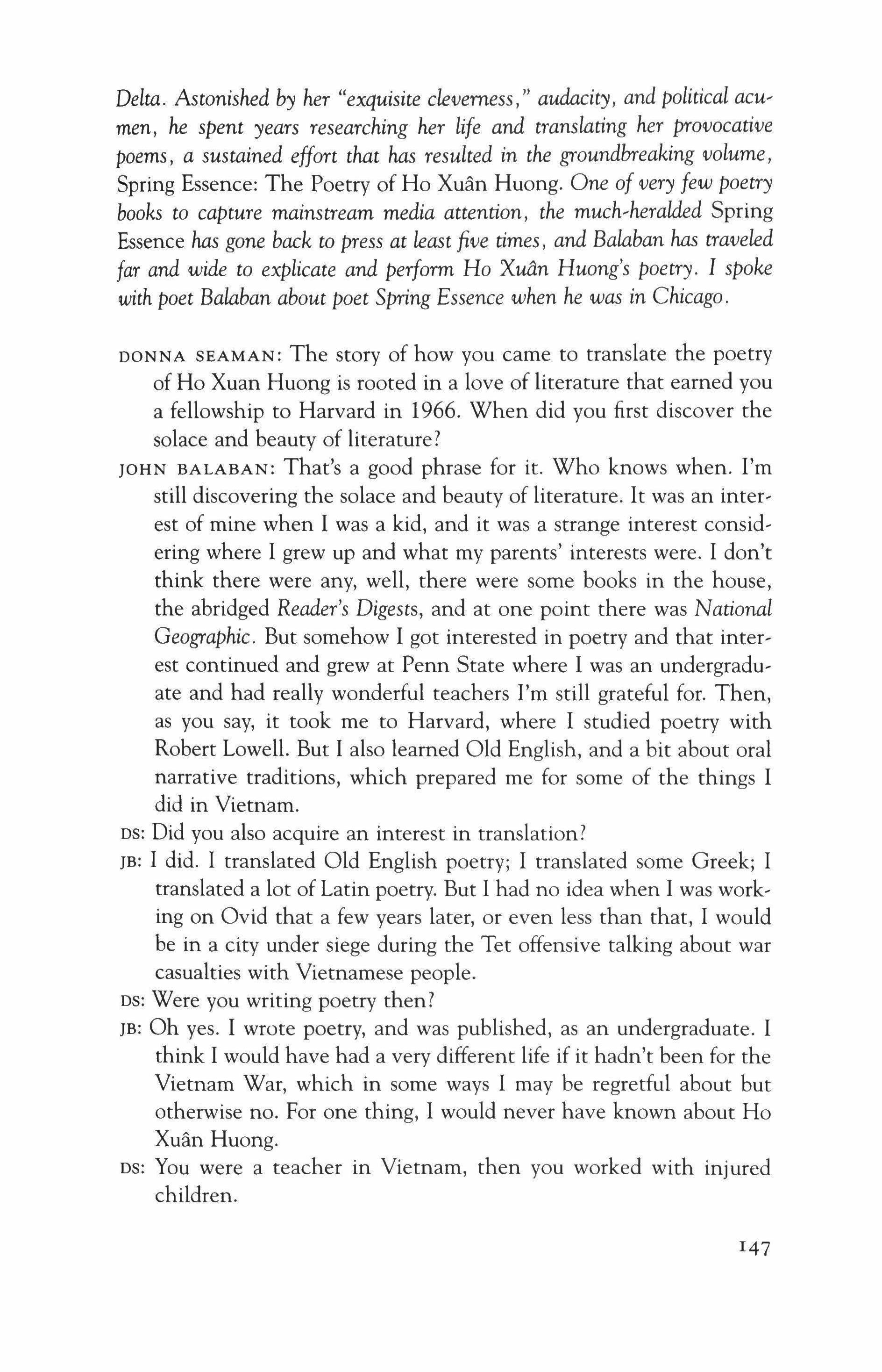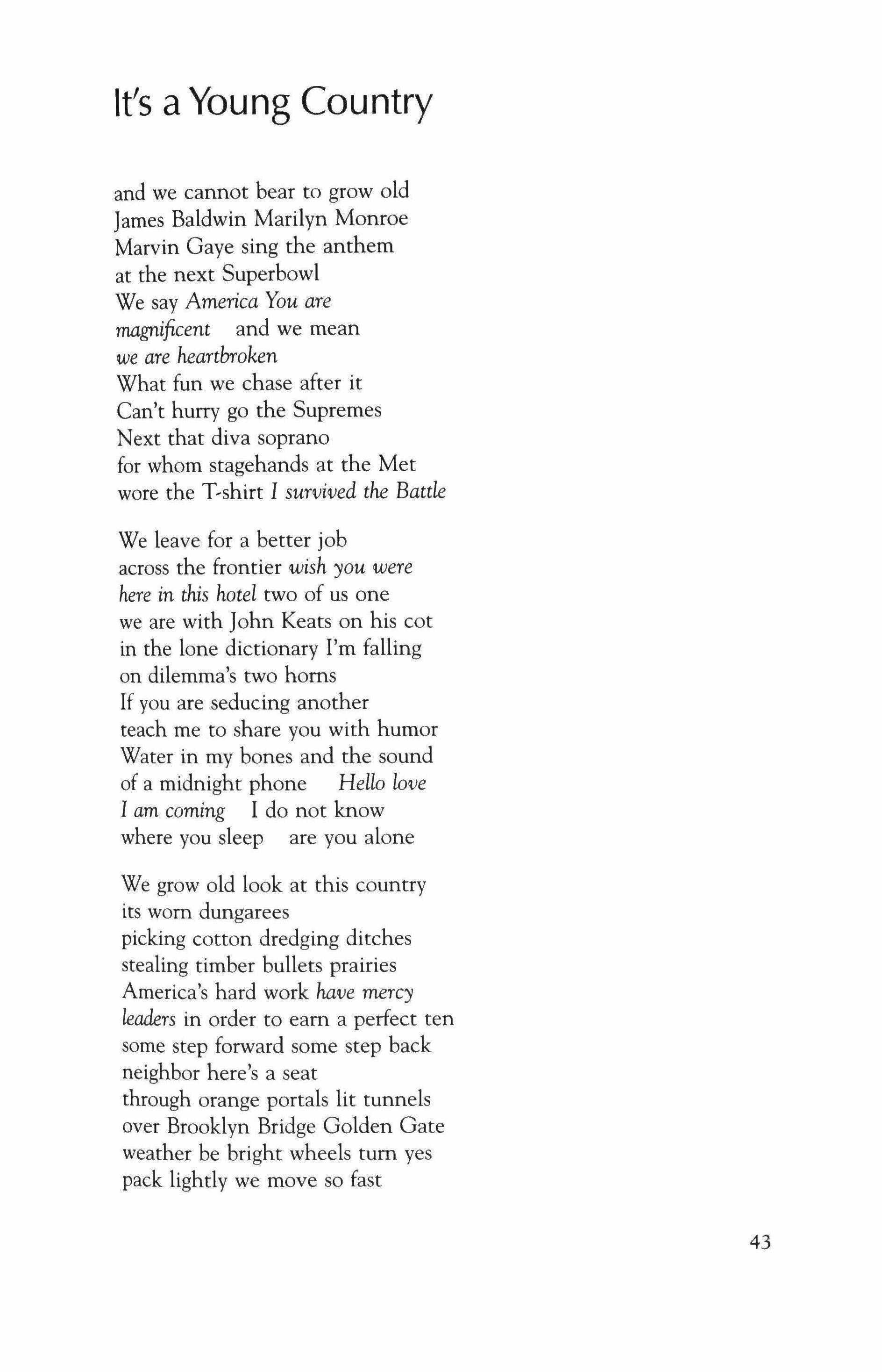 John Balaban is the author of eleven books of poetry and prose. He has won the Academy of American Poets' Lamont Prize, a National Poetry Series Selection, and two nominations for the National Book Award. His collection, Locusts at the Edge of Summer: New and Selected Poems, won the 1998 William Carlos Williams Award from the Poetry Society of America. Aliki Barnstone's most recent book is Wild With It (Sheep Meadow Press, 2002). She is editor of two anthologies, A Book of Women Poets from Antiquity to Now (Schoken/Random House, 1992) and Voices ofLight: Spiritual Poems by Women around the World from Sumeria to Now (Shambhala, 1999)' Rick Barot's poems have appeared in Ploughshares, the New Republic, New England Review, Yale Review, and the Threepenny Review. He is an NEA fellowship recipient and is Jones Lecturer in Poetry at Stanford. Peter Campion is a Wallace Stegner Fellow in poetry at Stanford. His poems and prose have appeared or are forthcoming in Agni, Raritan, Southwest Review, and other journals. Michael Chitwood has work that has recently appeared or is forthcoming in Poetry, Virginia Quarterly Review, the Southern Review, Field, and the Threepenny Review. Deborah Cummins is the author of Beyond the Reach (BKMK Press, 2002) and