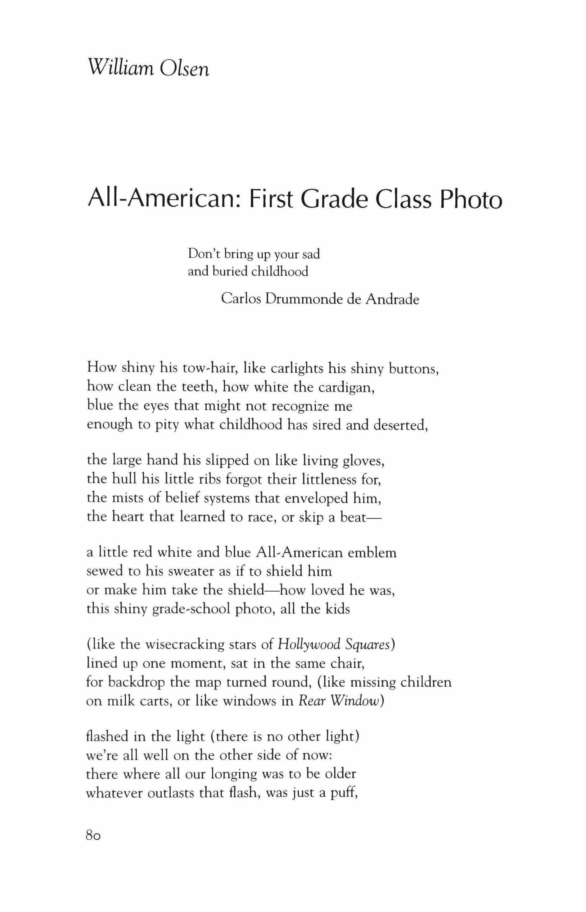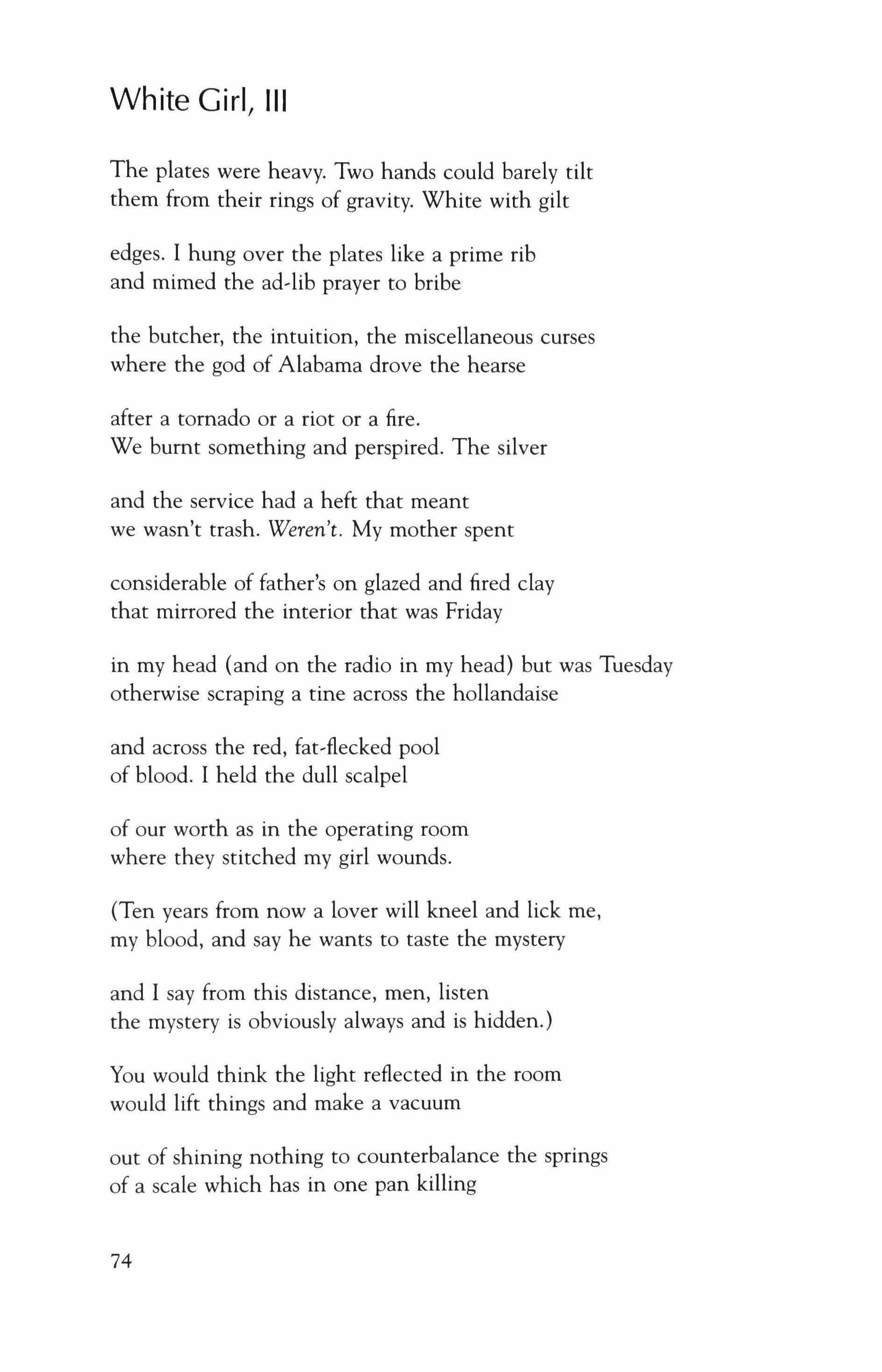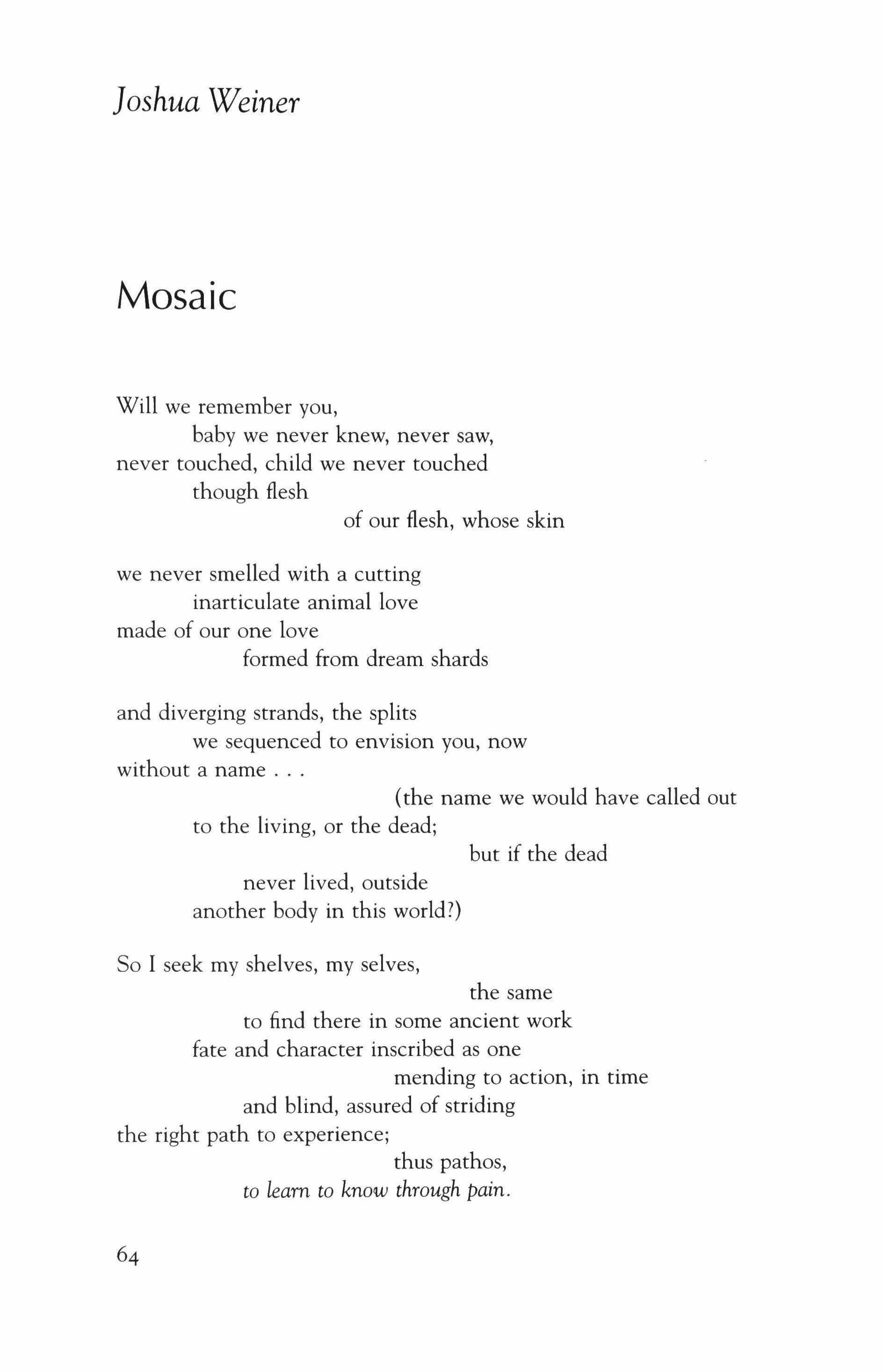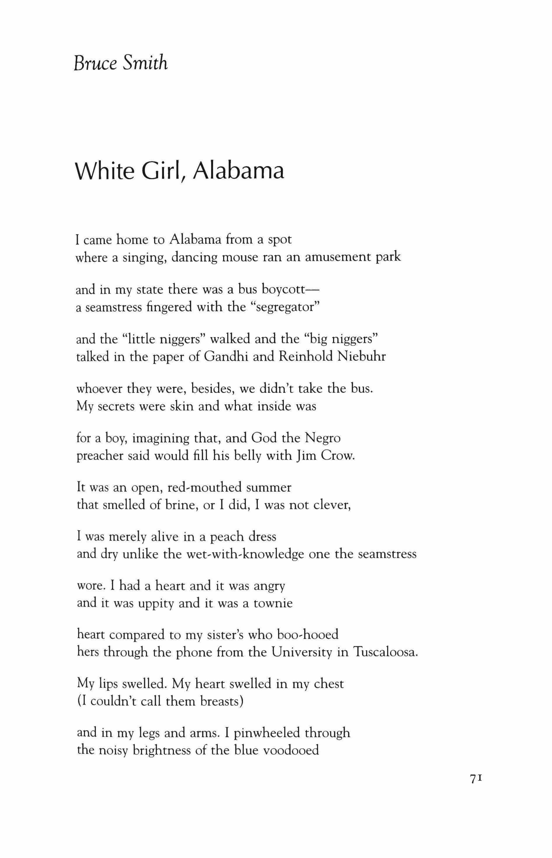 64 Mosaic Joshua Weiner 67 To the Reader Awakened by a Noisy Furnace; Reintroductions Kevin Stein 7 I White Girl, Alabama Bruce Smith 80 All American: First Grade Class Photo; Neither Paradise Nor Below, Nor Up Nor Down; Rag for the Cornish