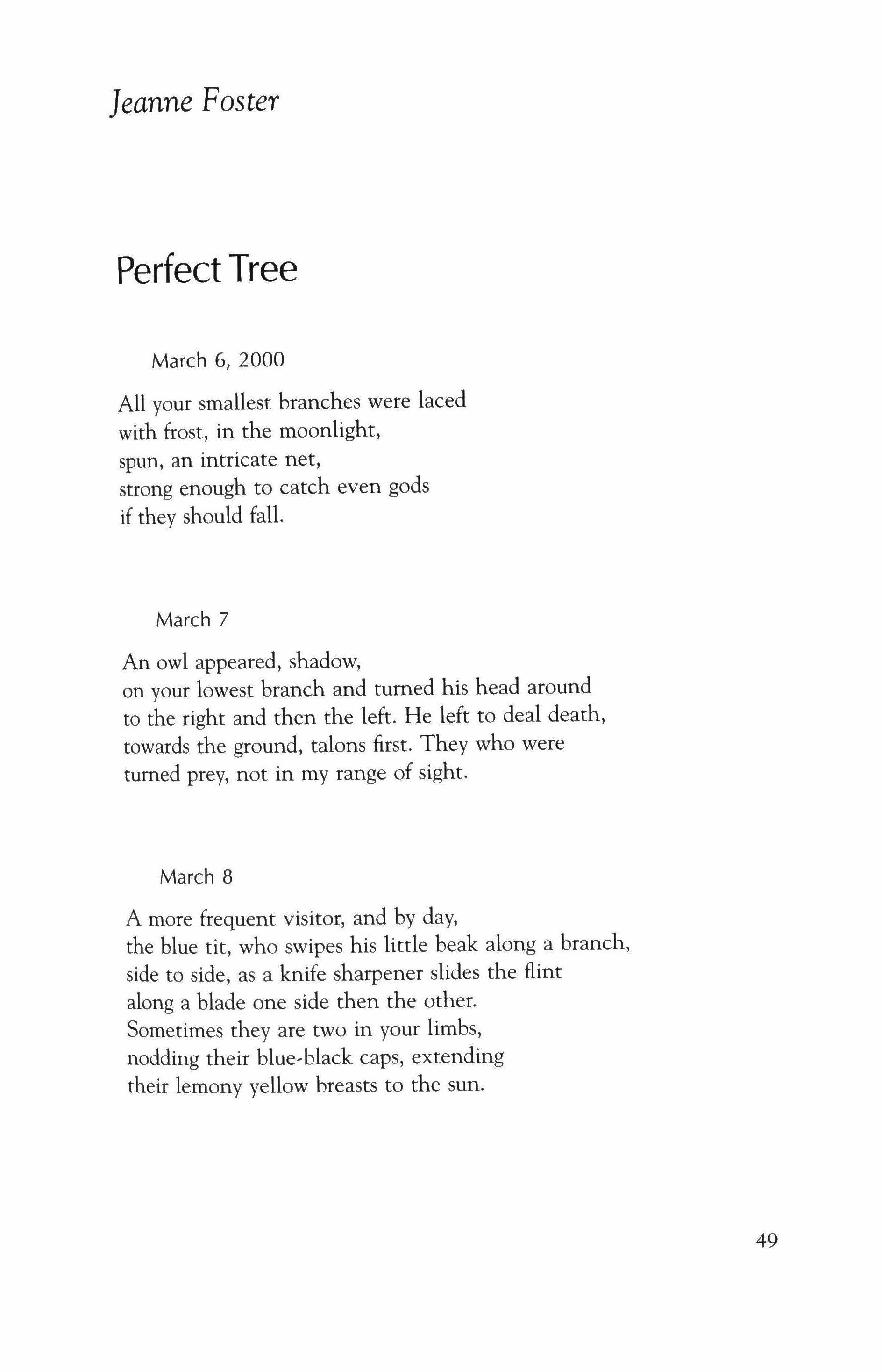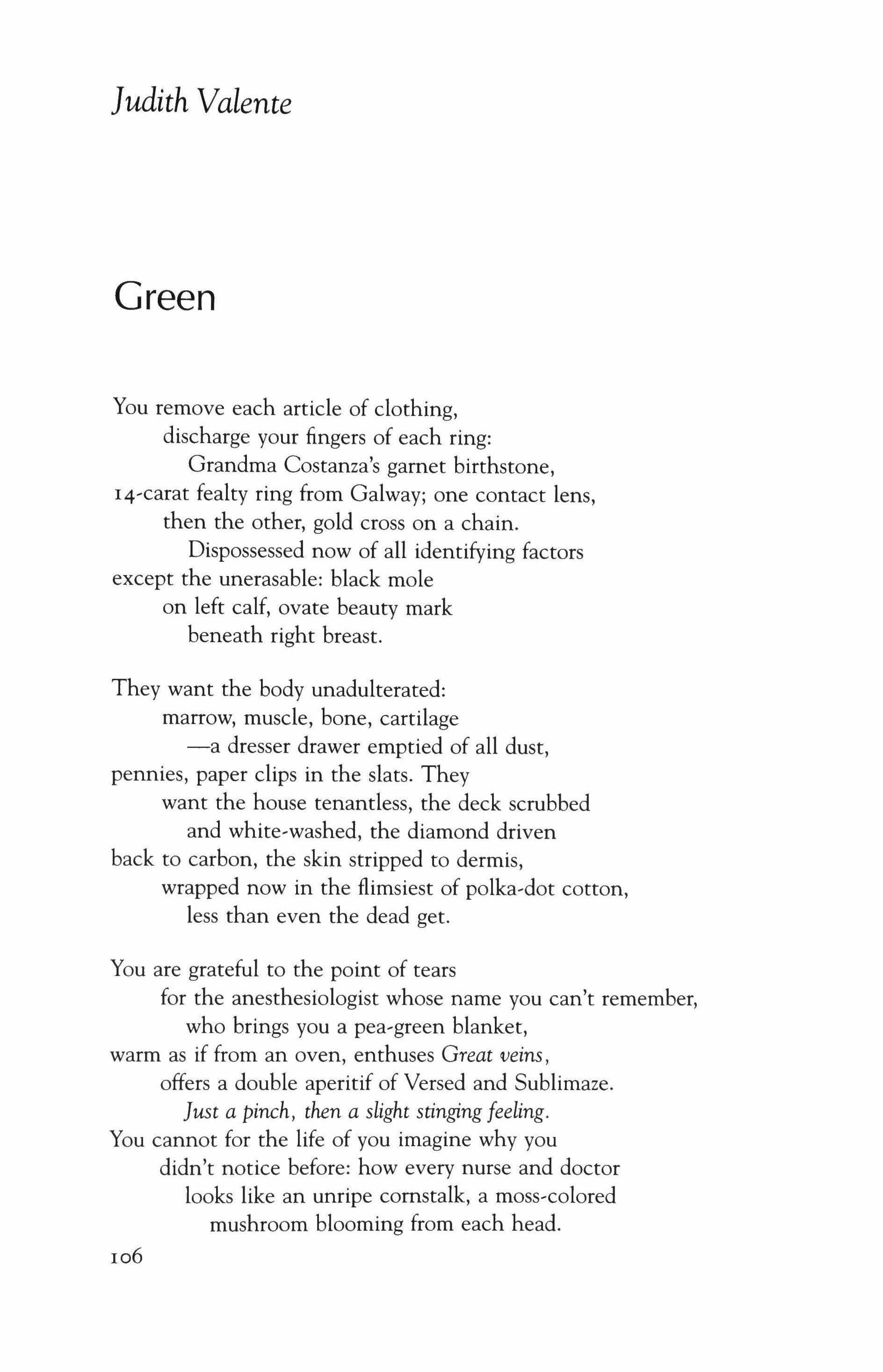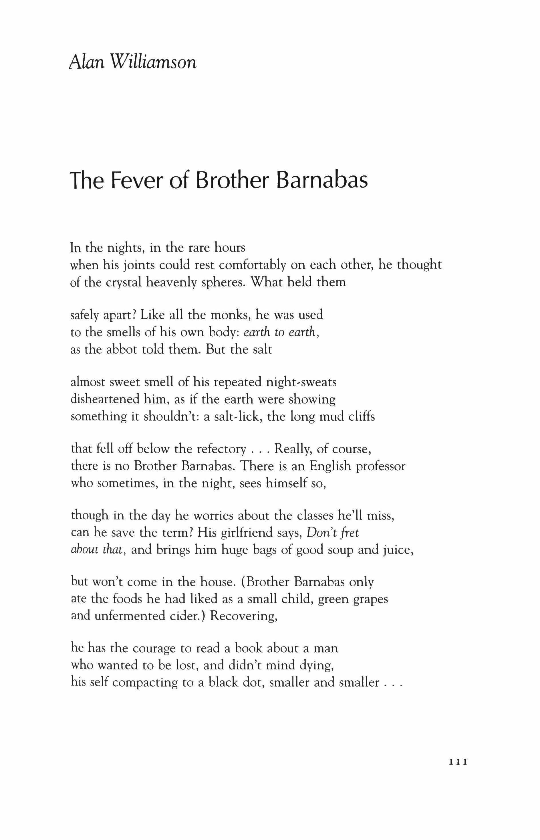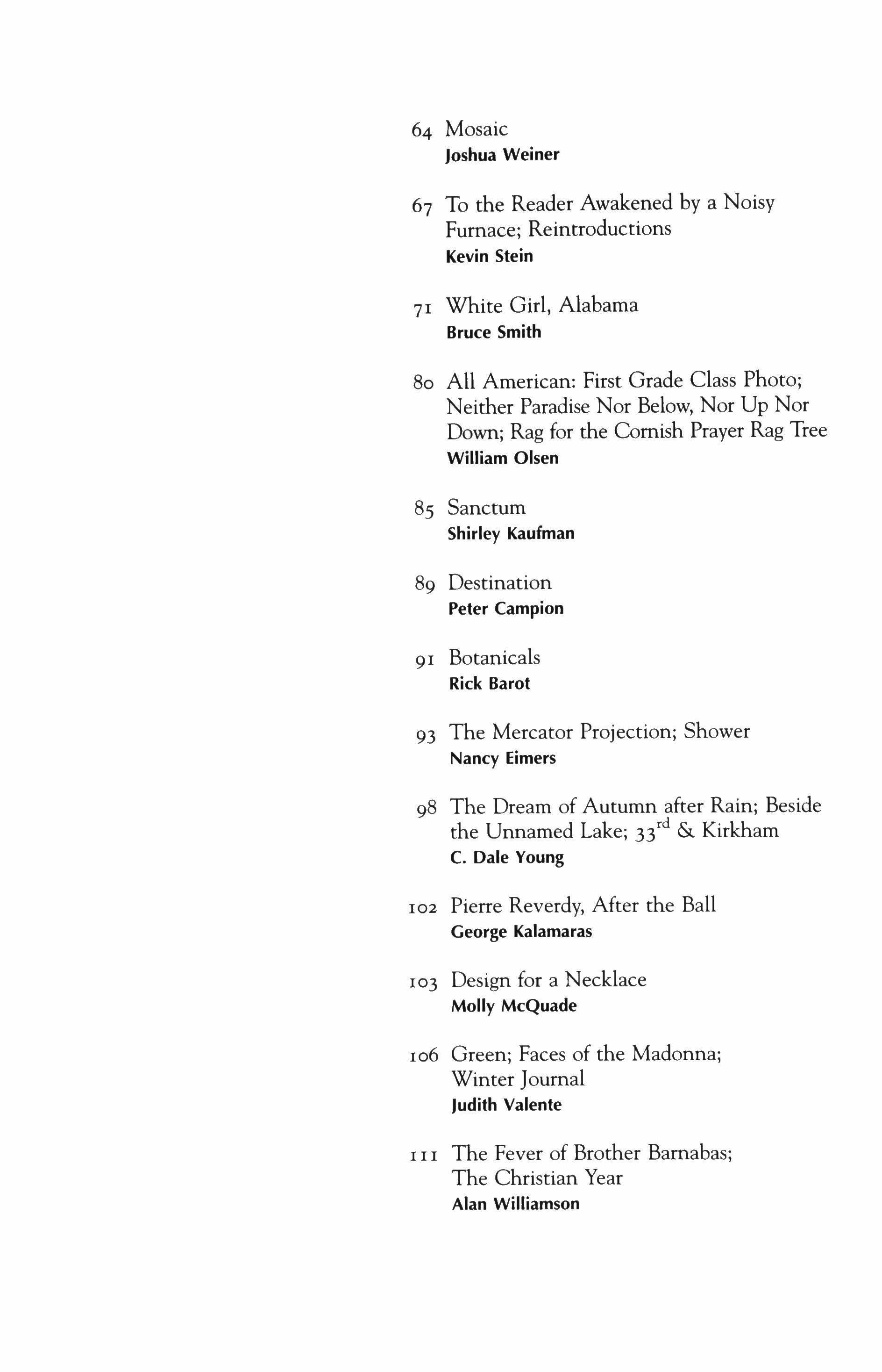 Tree William Olsen 85 Sanctum Shirley Kaufman 89 Destination Peter Campion 91 Botanicals Rick Barot 93 The Mercator Projection; Shower Nancy Eimers 98 The Dream of Autumn after Rain; Beside the Unnamed Lake; 33rd & Kirkham C. Dale Young 102 Pierre Reverdy, After the Ball George Kalamaras 103 Design for a Necklace Molly McQuade 106 Green; Faces of the Madonna; Winter Journal Judith Valente I I I The Fever of Brother Barnabas; The Christian Year Alan Williamson