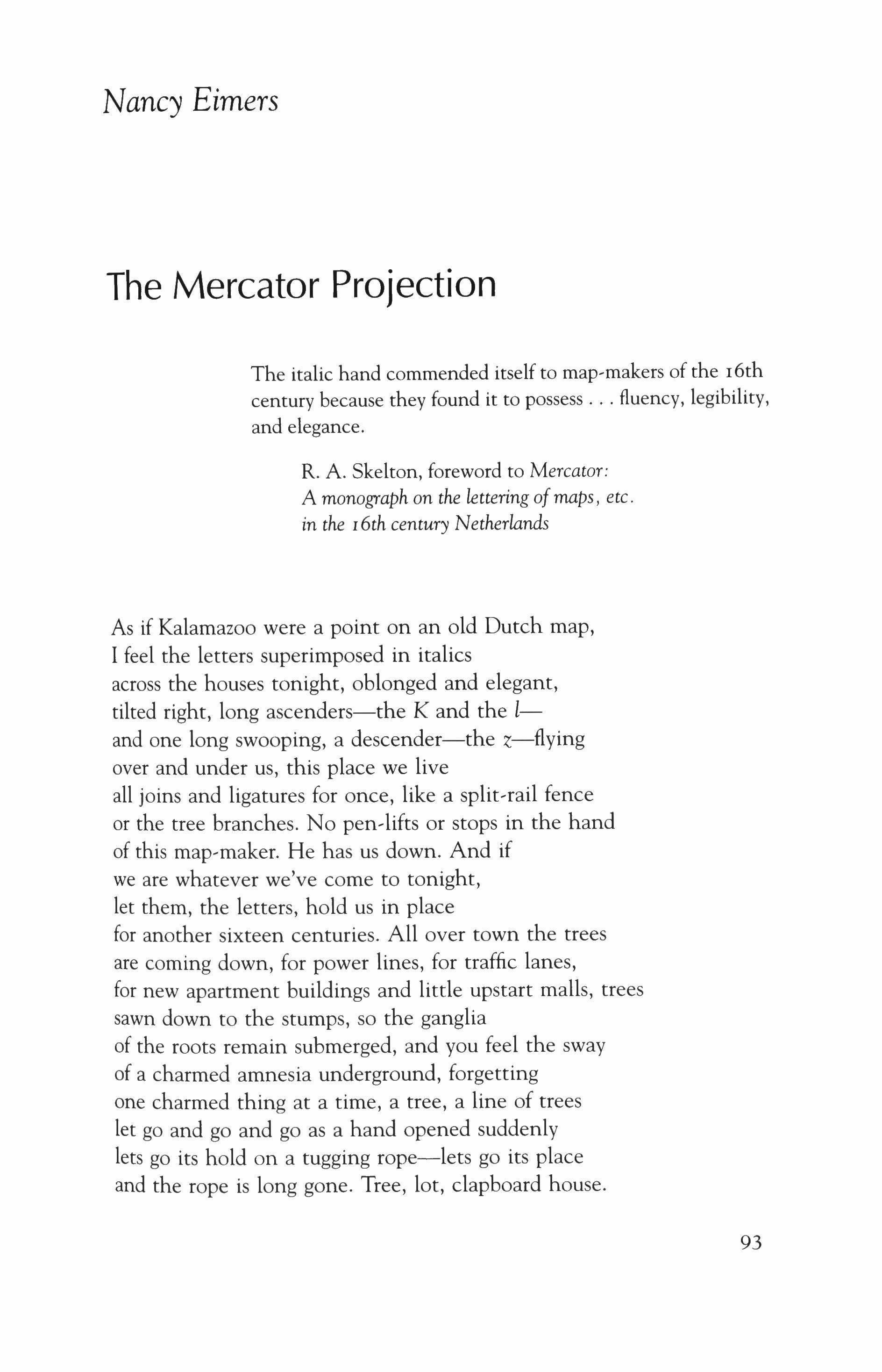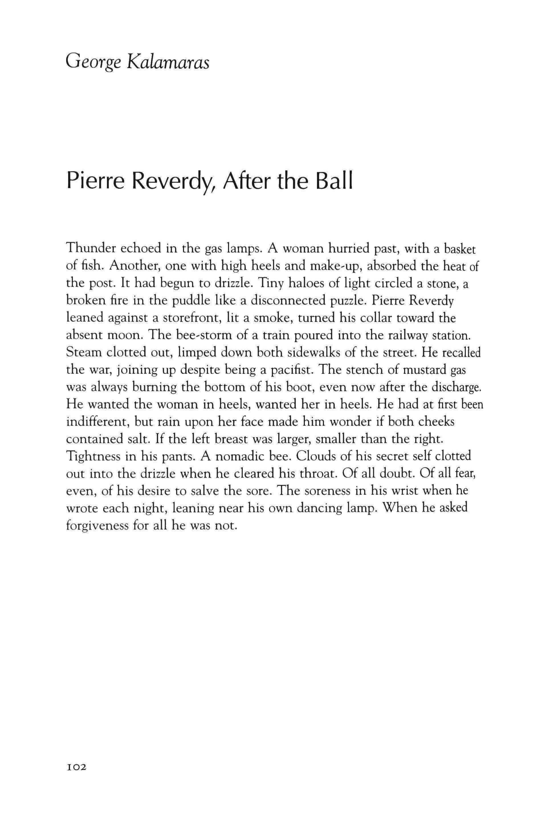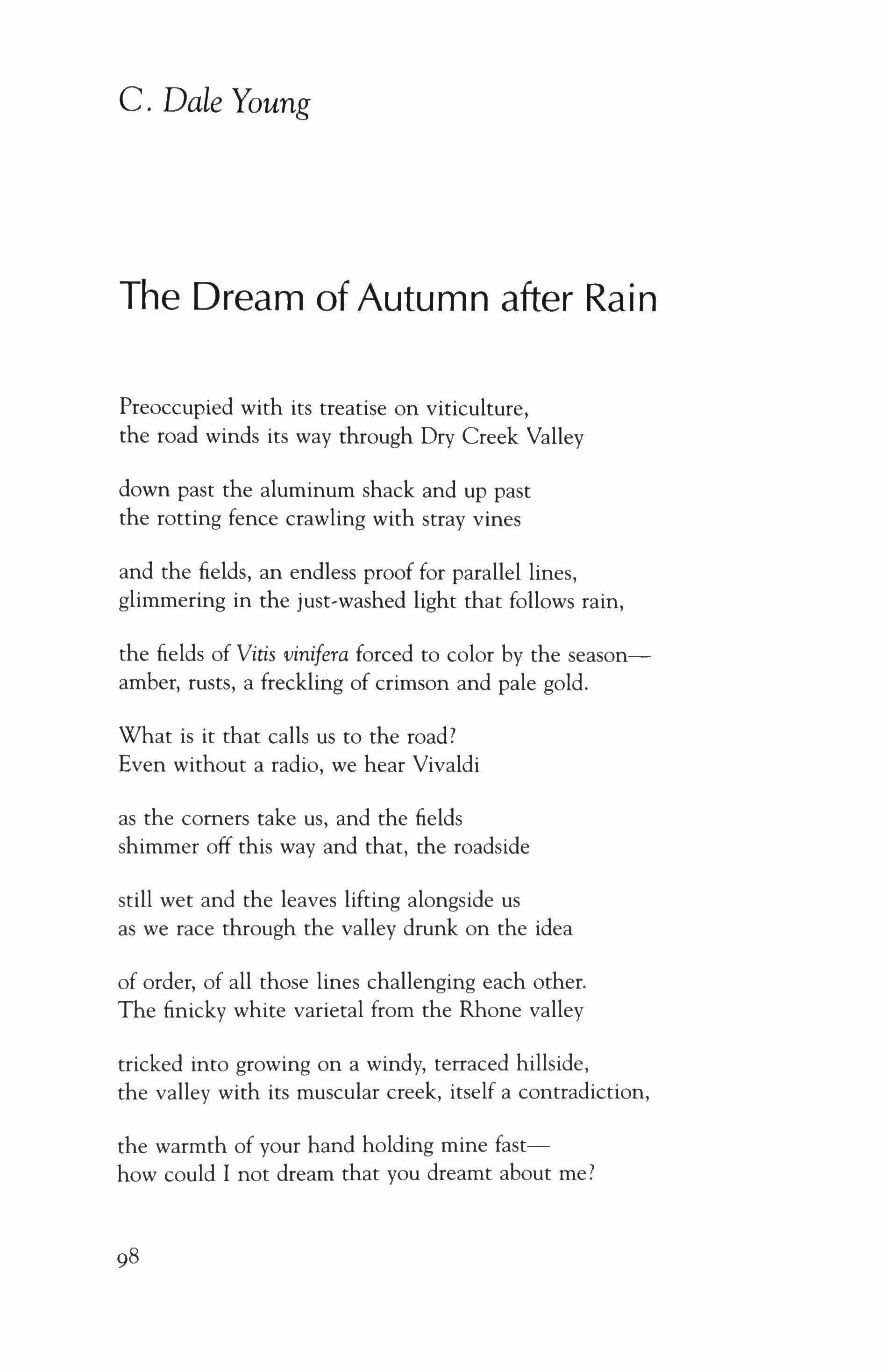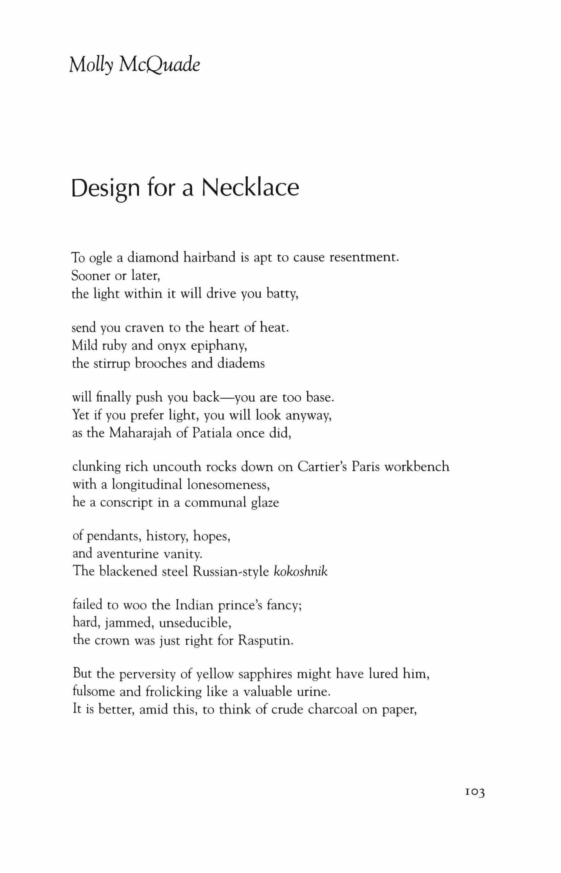 Tree William Olsen 85 Sanctum Shirley Kaufman 89 Destination Peter Campion 91 Botanicals Rick Barot 93 The Mercator Projection; Shower Nancy Eimers 98 The Dream of Autumn after Rain; Beside the Unnamed Lake; 33rd & Kirkham C. Dale Young 102 Pierre Reverdy, After the Ball George Kalamaras 103 Design for a Necklace Molly McQuade 106 Green; Faces of the Madonna; Winter Journal Judith Valente I I I The Fever of Brother Barnabas; The Christian Year Alan Williamson
