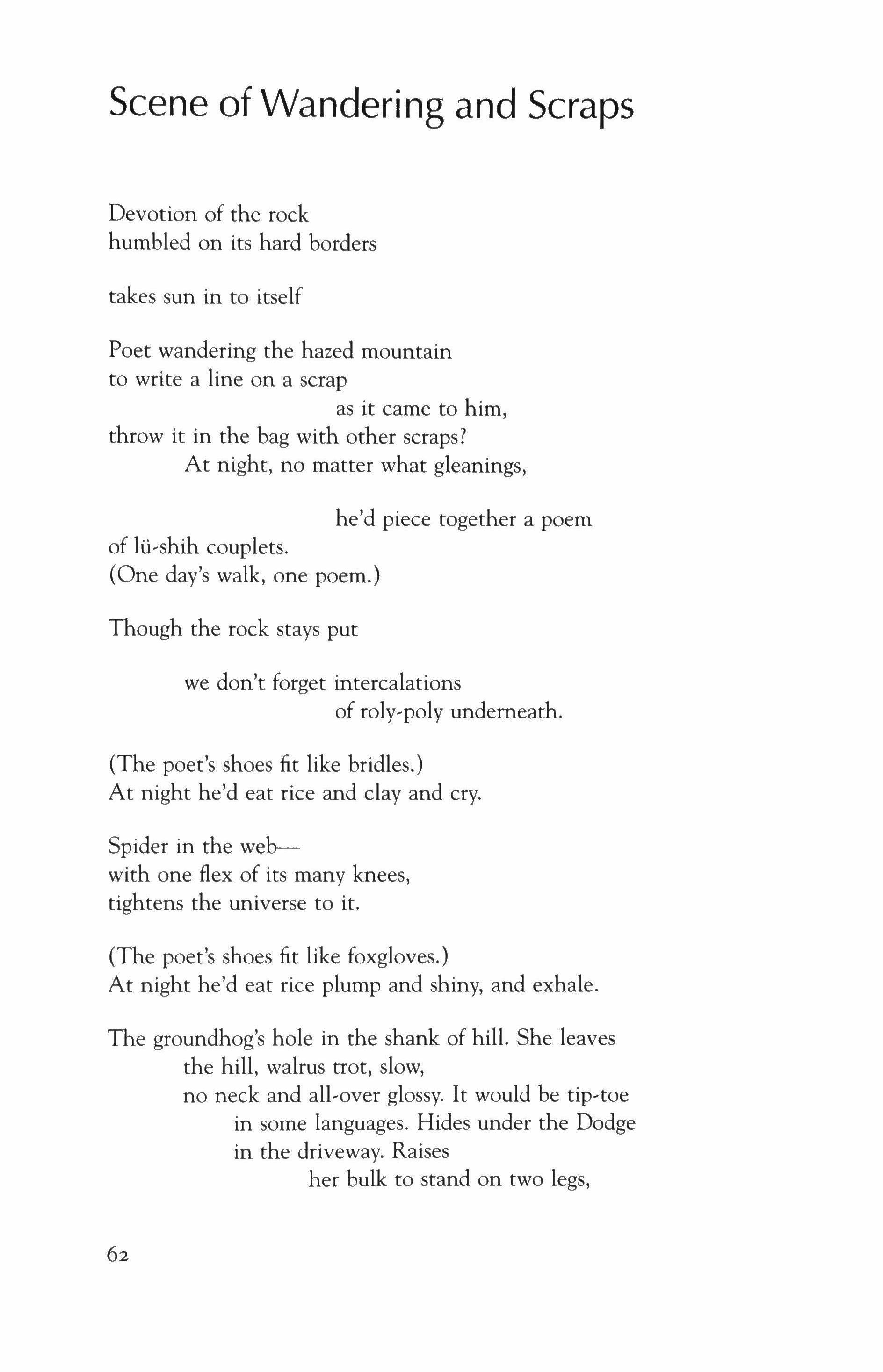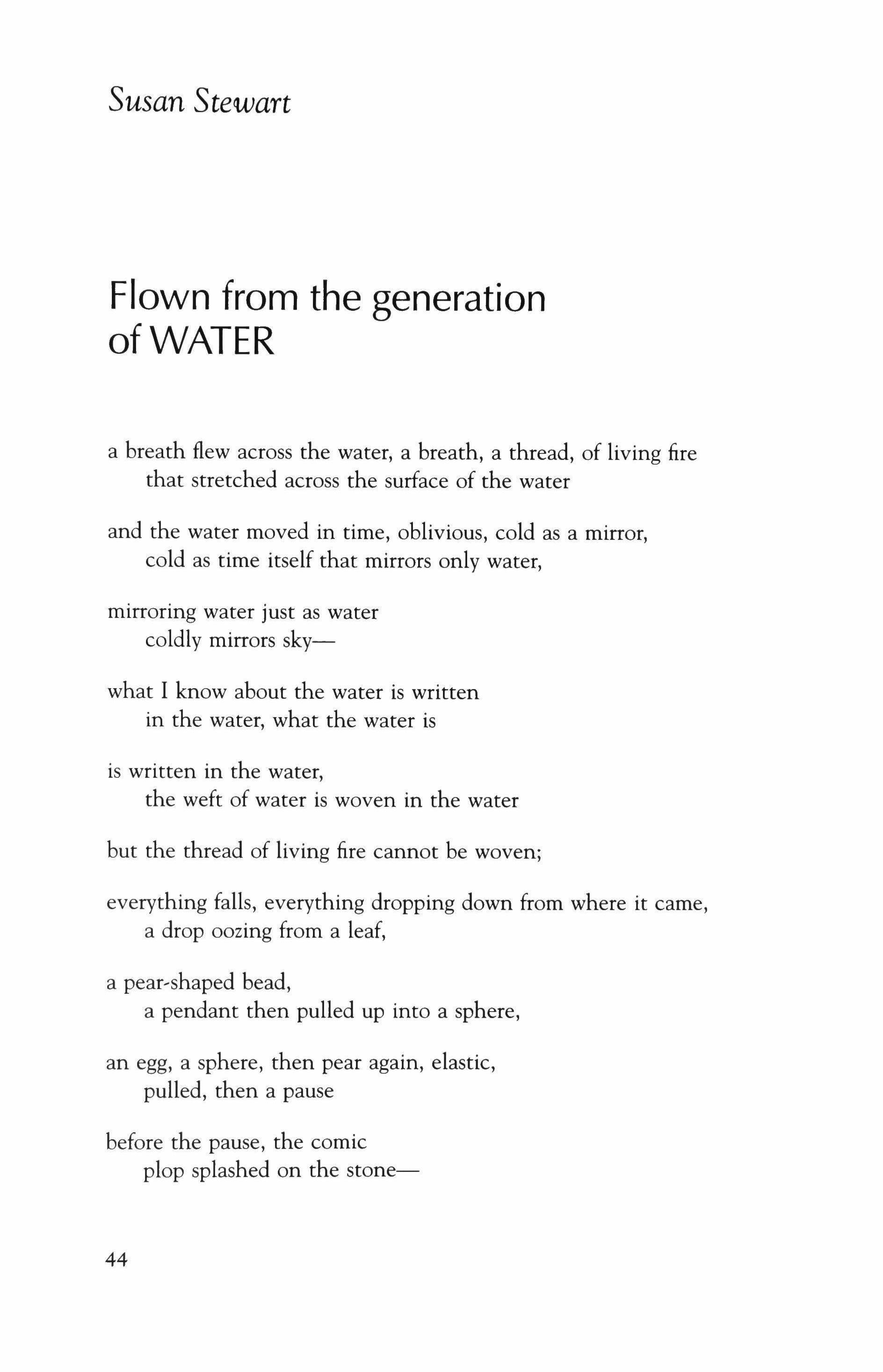 from Farrar Straus & Giroux. Barbara Ras won the Walt Whitman Award for her collection, Bite Every Sorrow (Louisiana State University Press, 1998). Her work has appeared in the Georgia Review, Orion, and the Massachusetts Review. She directs Trinity University Press in San Antonio. Donna Seaman is the editor of In Our Nature: Stories of Wildness, an editor at Booklist, and host of the radio program, Open Books, in Chicago. Bruce Smith's most recent collection is The Other Lover (University of Chicago Press, 2000), a finalist for the National Book Award and the Pulitzer Prize. He teaches in the MFA program at Syracuse University. Kevin Stein's most recent books include the collection Chance Ransom (2000) and the anthology Illinois Voices (2001), co-edited with G. E. Murphy, both from the University of Illinois Press. He is the winner of the 1998 Indiana Review poetry prize and is Caterpillar Professor of English at Bradley University. Susan Stewart is the author of three books of poems, most recently The Forest (University of Chicago Press, 1995). Her prose study, Poetry and the Fate of the Senses, also from the University of Chicago Press, is just out in paperback.