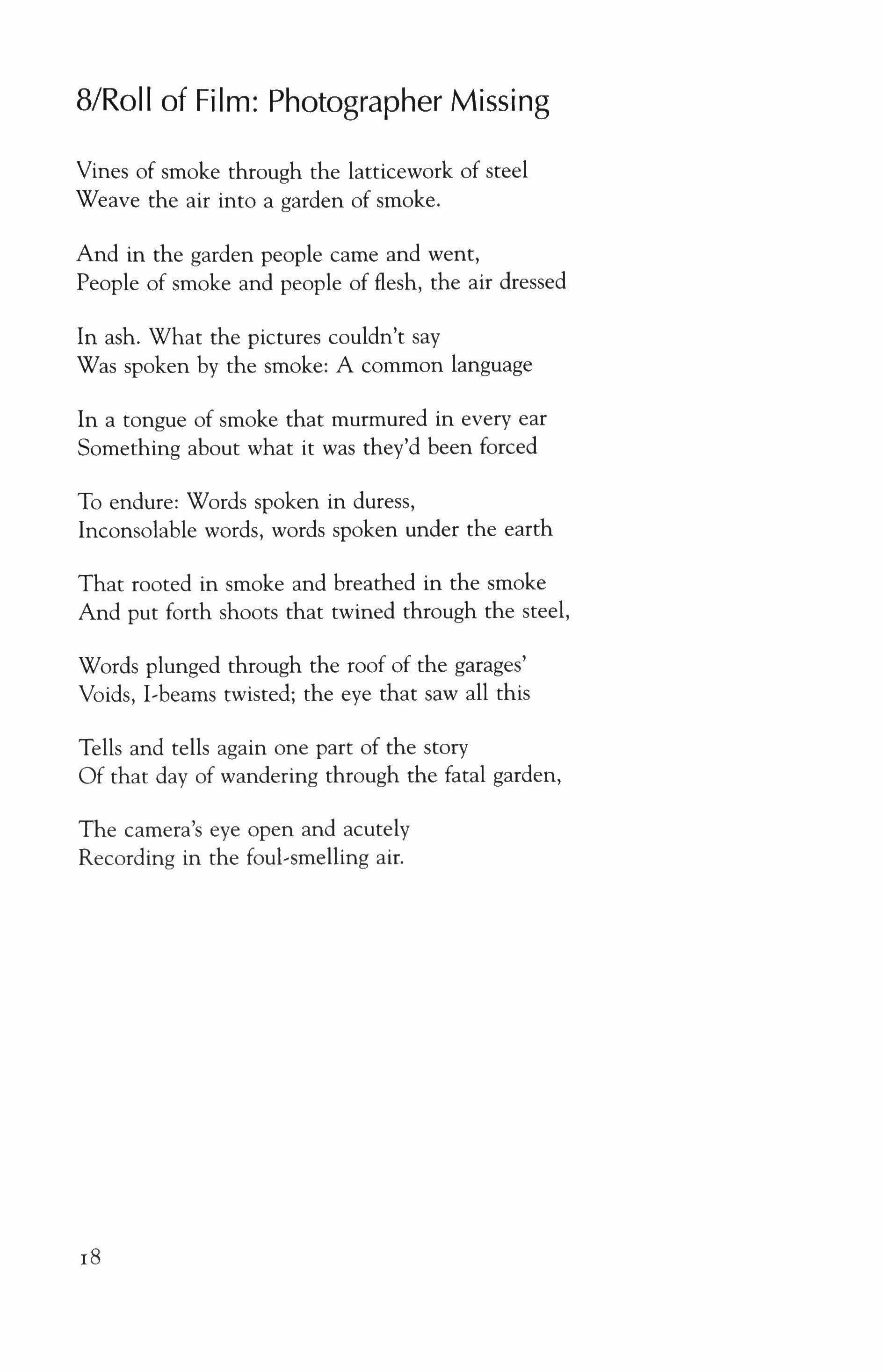 Filled up with smoke and the smoke kept pouring Itself out into the air like a voice saying something It can't stop saying, some murky omen