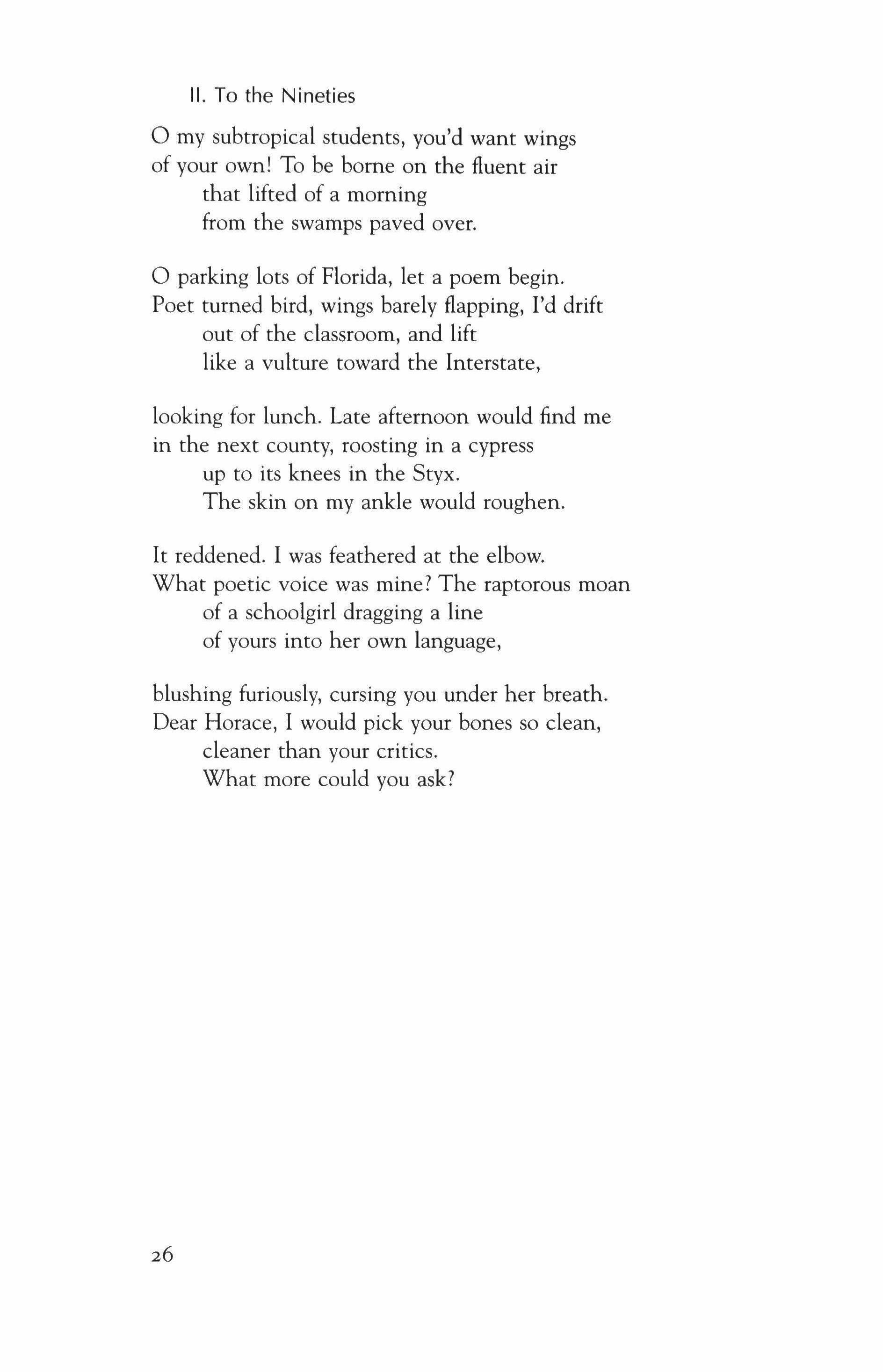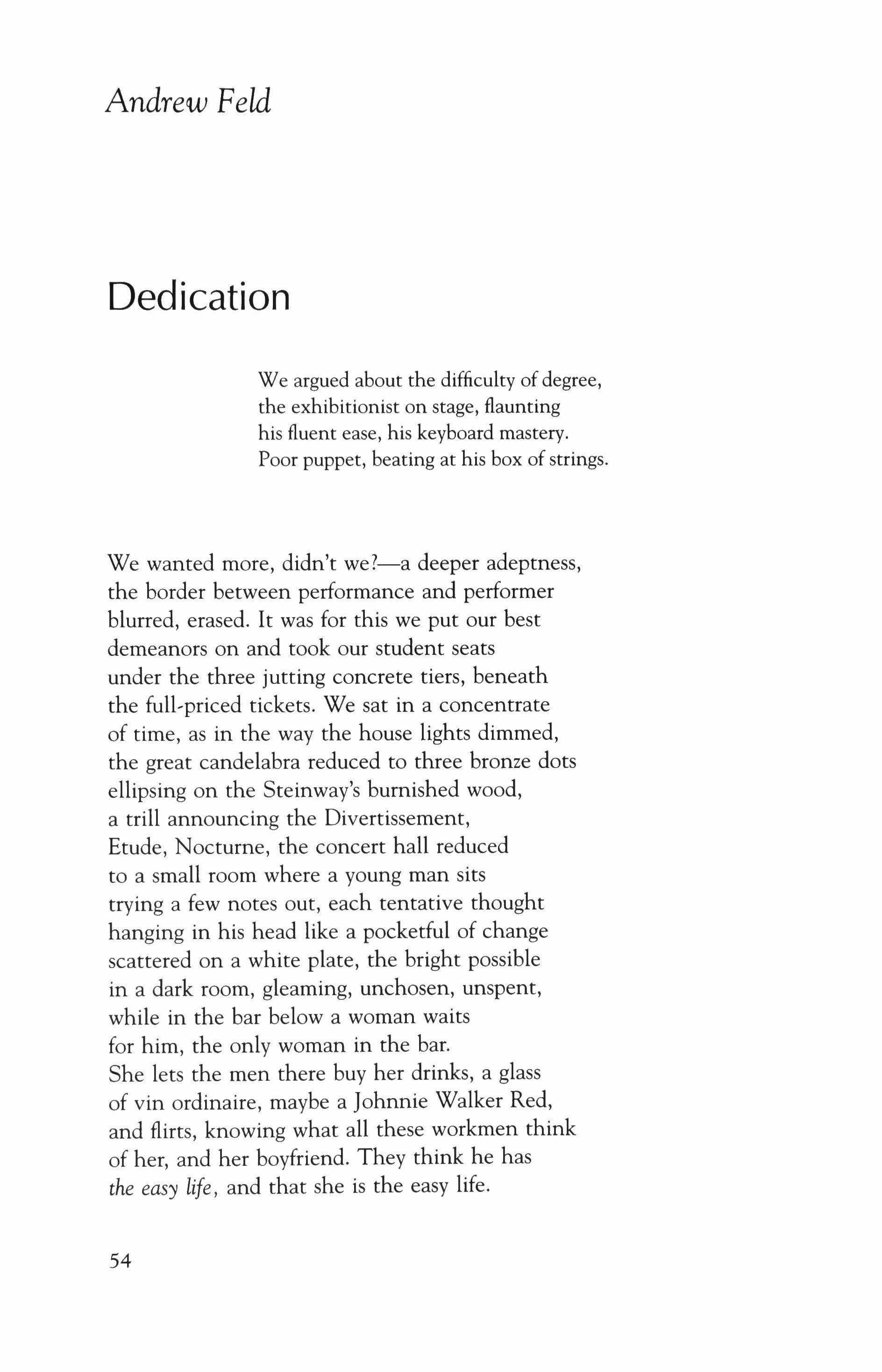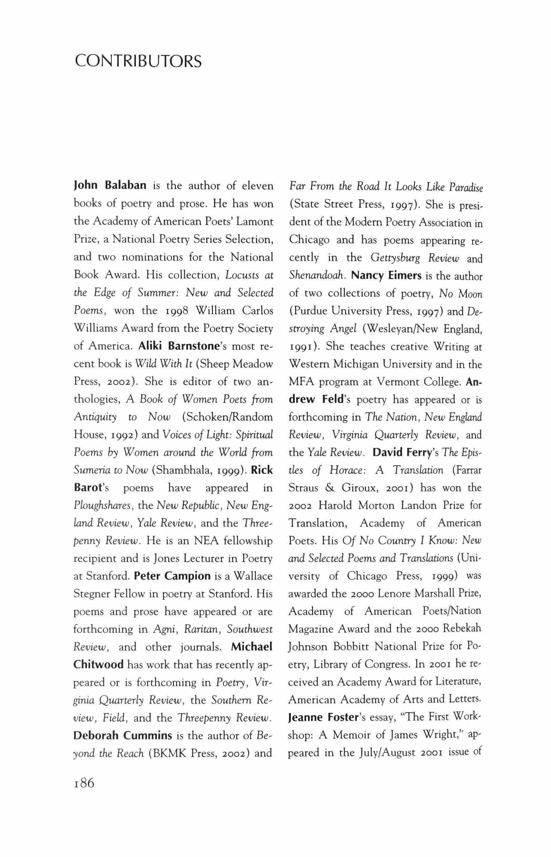 Far From the Road It Looks Like Paradise (State Street Press, 1997)' She is president of the Modern Poetry Association in Chicago and has poems appearing recently in the Gettysburg Review and Shenandoah. Nancy Eimers is the author of two collections of poetry, No Moon (Purdue University Press, 1997) and Destroying Angel (Wesleyan/New England, 1991). She teaches creative Writing at Western Michigan University and in the MFA program at Vermont College. Andrew Feld's poetry has appeared or is forthcoming in The Nation, New England Review, Virginia Quarterly Review, and the Yale Review. David Ferry's The Epistles of Horace: A Translation (Farrar Straus & Giroux, 2001) has won the 2002 Harold Morton Landon Prize for Translation, Academy of American Poets. His Of No Country I Know: New and Selected Poems and Translations (University of Chicago Press, 1999) was awarded the 2000 Lenore Marshall Prize, Academy of American Poets/Nation Magazine Award and the 2000 Rebekah Johnson Bobbitt National Prize for Poetry, Library of Congress. In 2001 he received an Academy Award for Literature, American Academy of Arts and Letters. Jeanne Foster's essay, "The First Workshop: A Memoir of James Wright," appeared in the July/August 2001 issue of