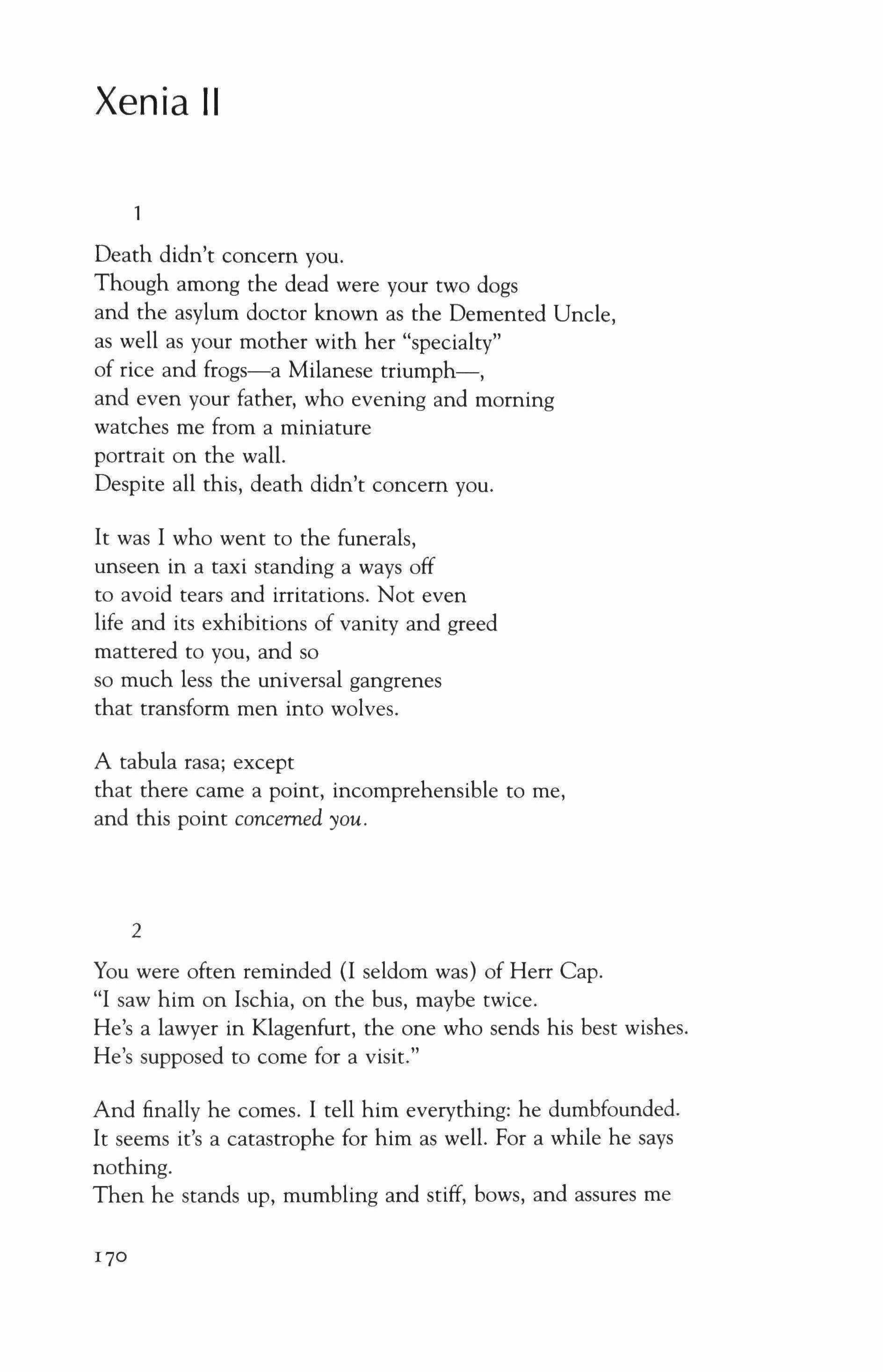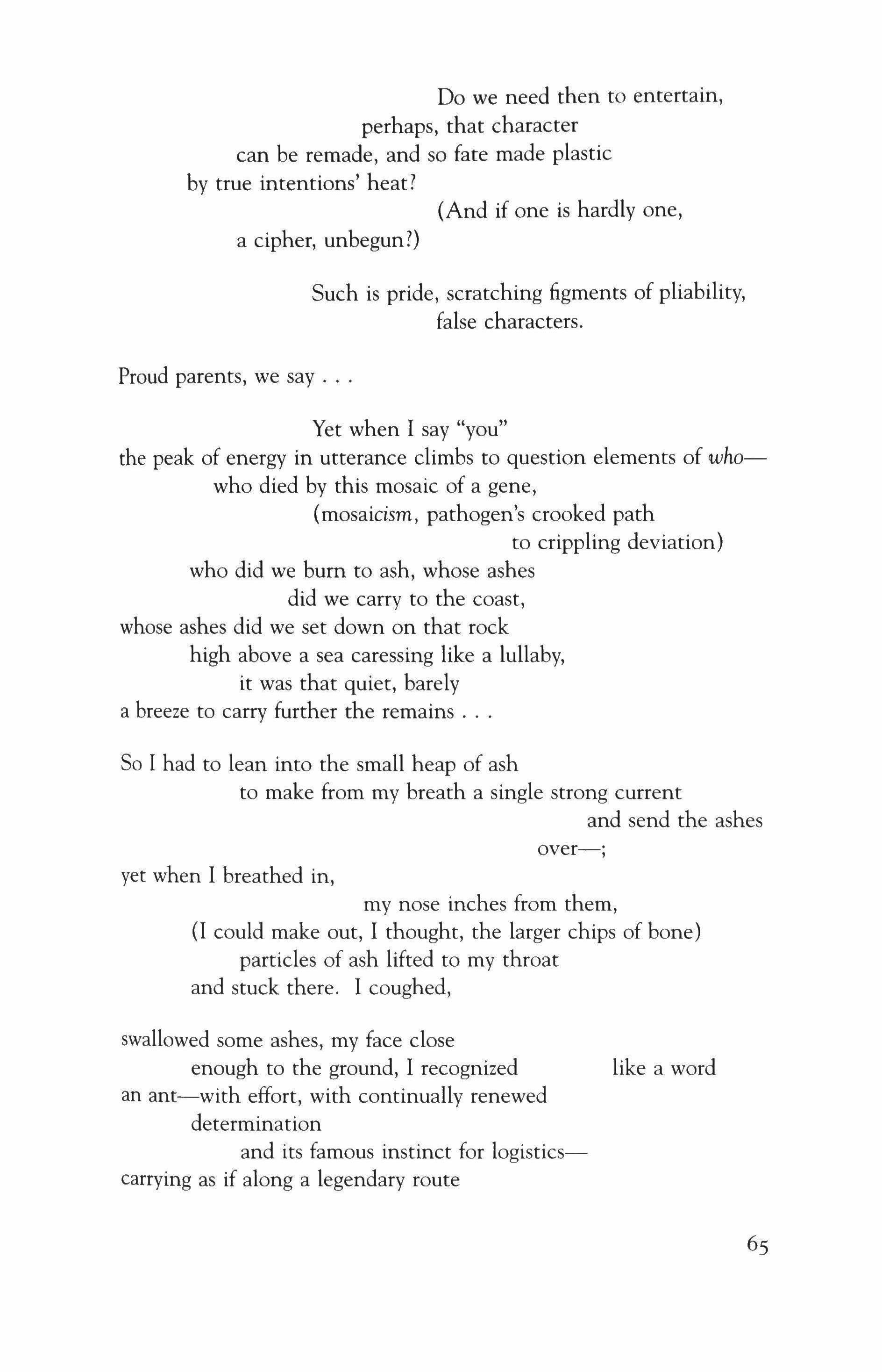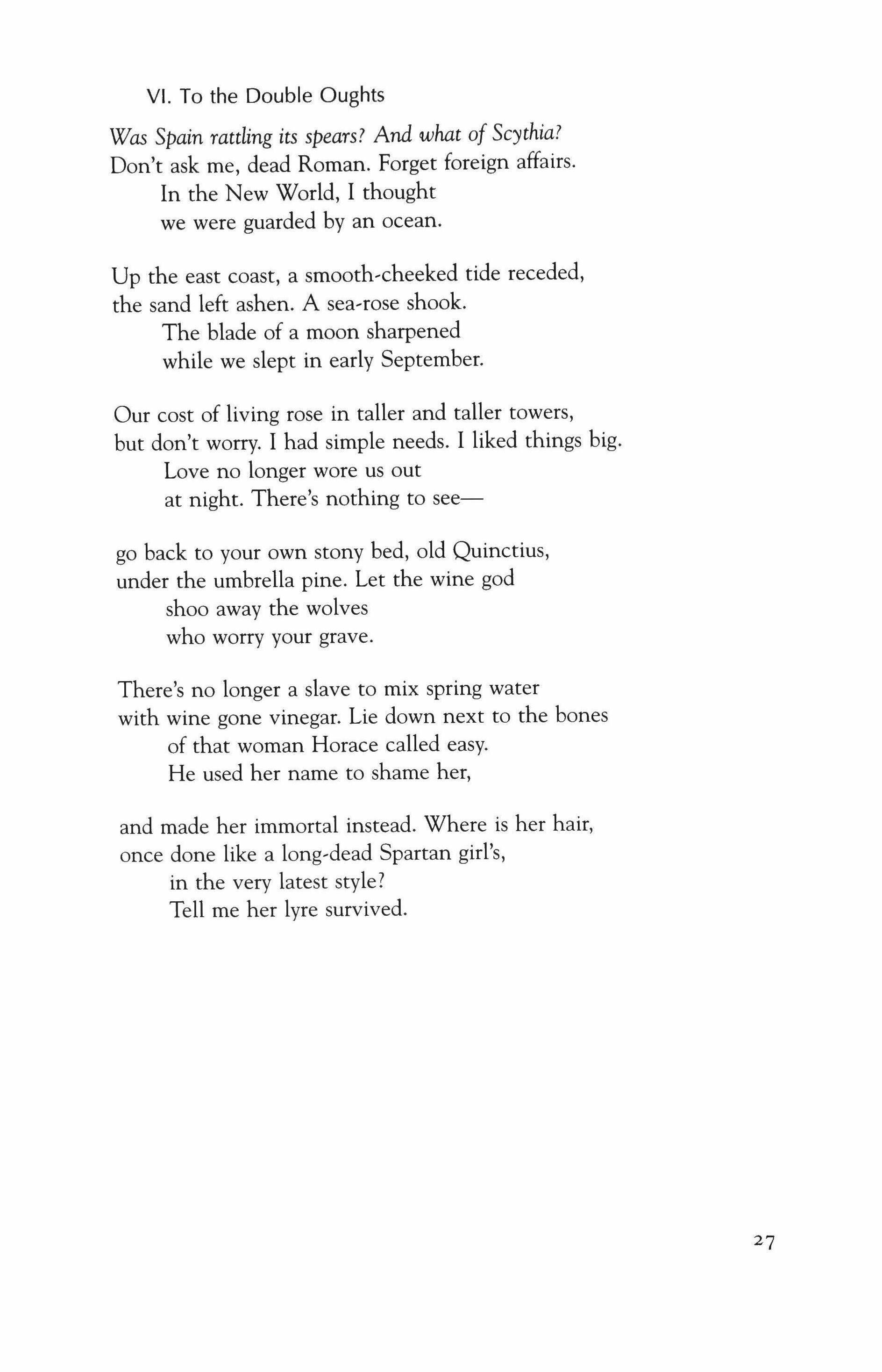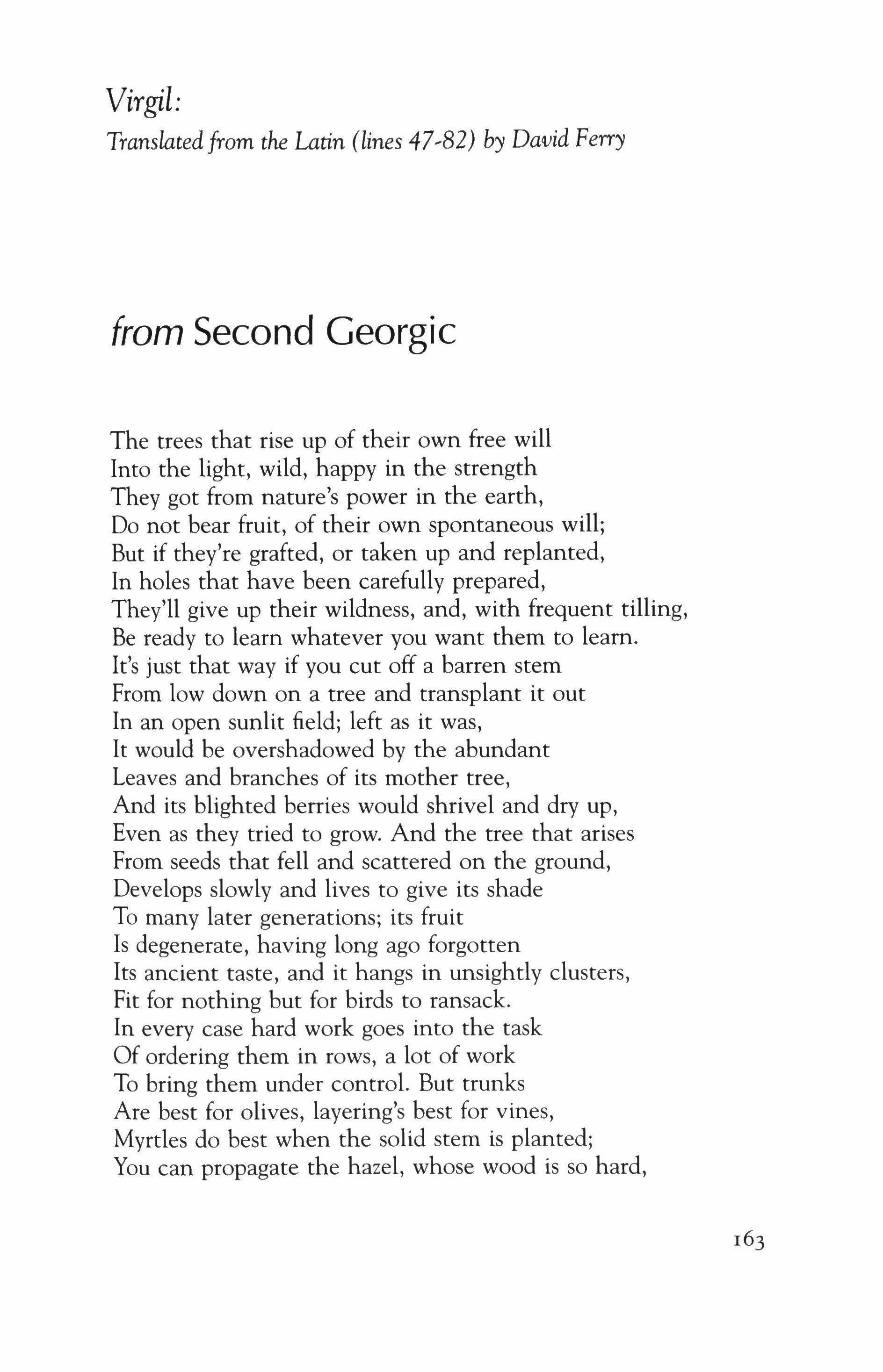 Far From the Road It Looks Like Paradise (State Street Press, 1997)' She is president of the Modern Poetry Association in Chicago and has poems appearing recently in the Gettysburg Review and Shenandoah. Nancy Eimers is the author of two collections of poetry, No Moon (Purdue University Press, 1997) and Destroying Angel (Wesleyan/New England, 1991). She teaches creative Writing at Western Michigan University and in the MFA program at Vermont College. Andrew Feld's poetry has appeared or is forthcoming in The Nation, New England Review, Virginia Quarterly Review, and the Yale Review. David Ferry's The Epistles of Horace: A Translation (Farrar Straus & Giroux, 2001) has won the 2002 Harold Morton Landon Prize for Translation, Academy of American Poets. His Of No Country I Know: New and Selected Poems and Translations (University of Chicago Press, 1999) was awarded the 2000 Lenore Marshall Prize, Academy of American Poets/Nation Magazine Award and the 2000 Rebekah Johnson Bobbitt National Prize for Poetry, Library of Congress. In 2001 he received an Academy Award for Literature, American Academy of Arts and Letters. Jeanne Foster's essay, "The First Workshop: A Memoir of James Wright," appeared in the July/August 2001 issue of