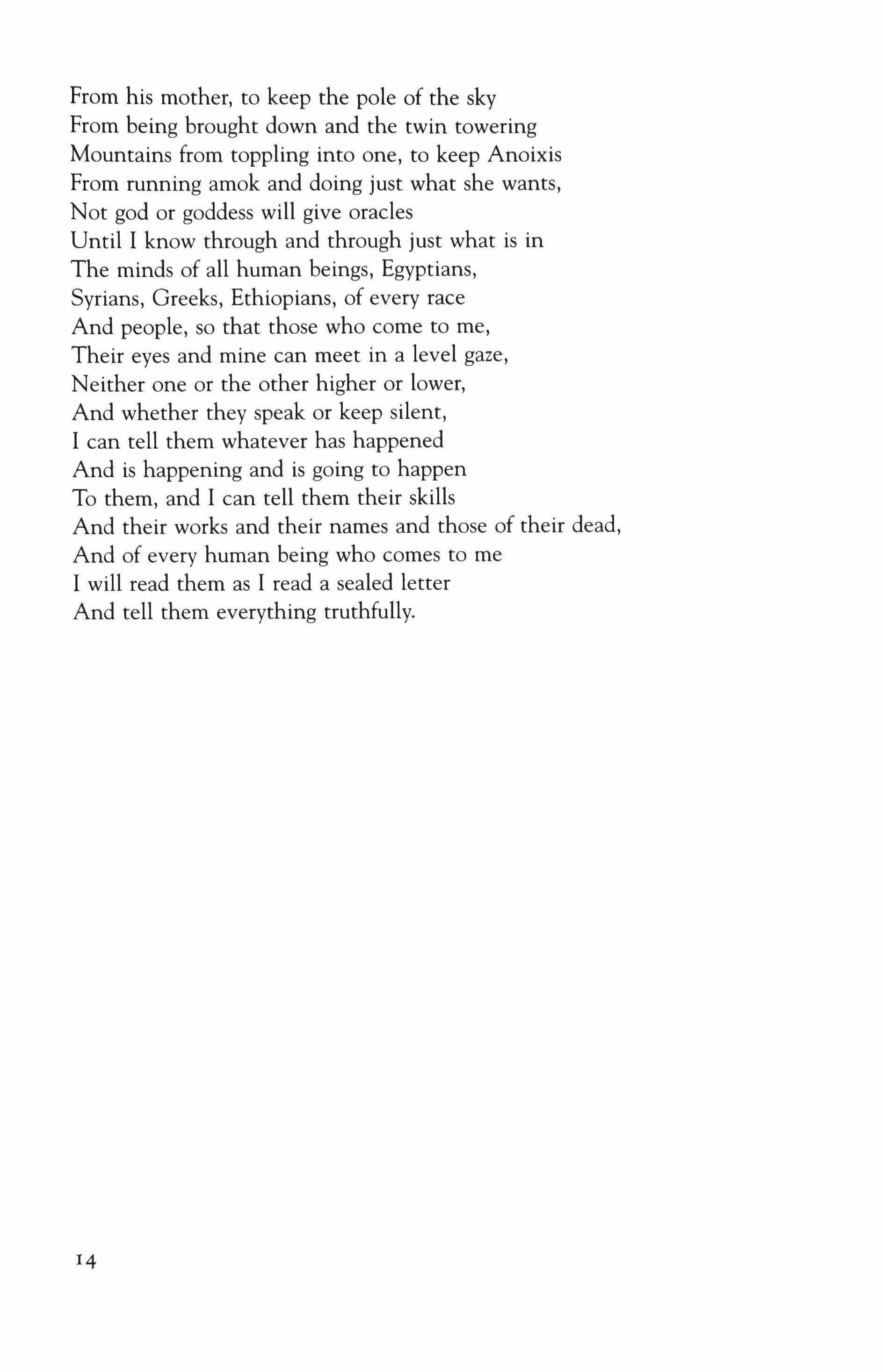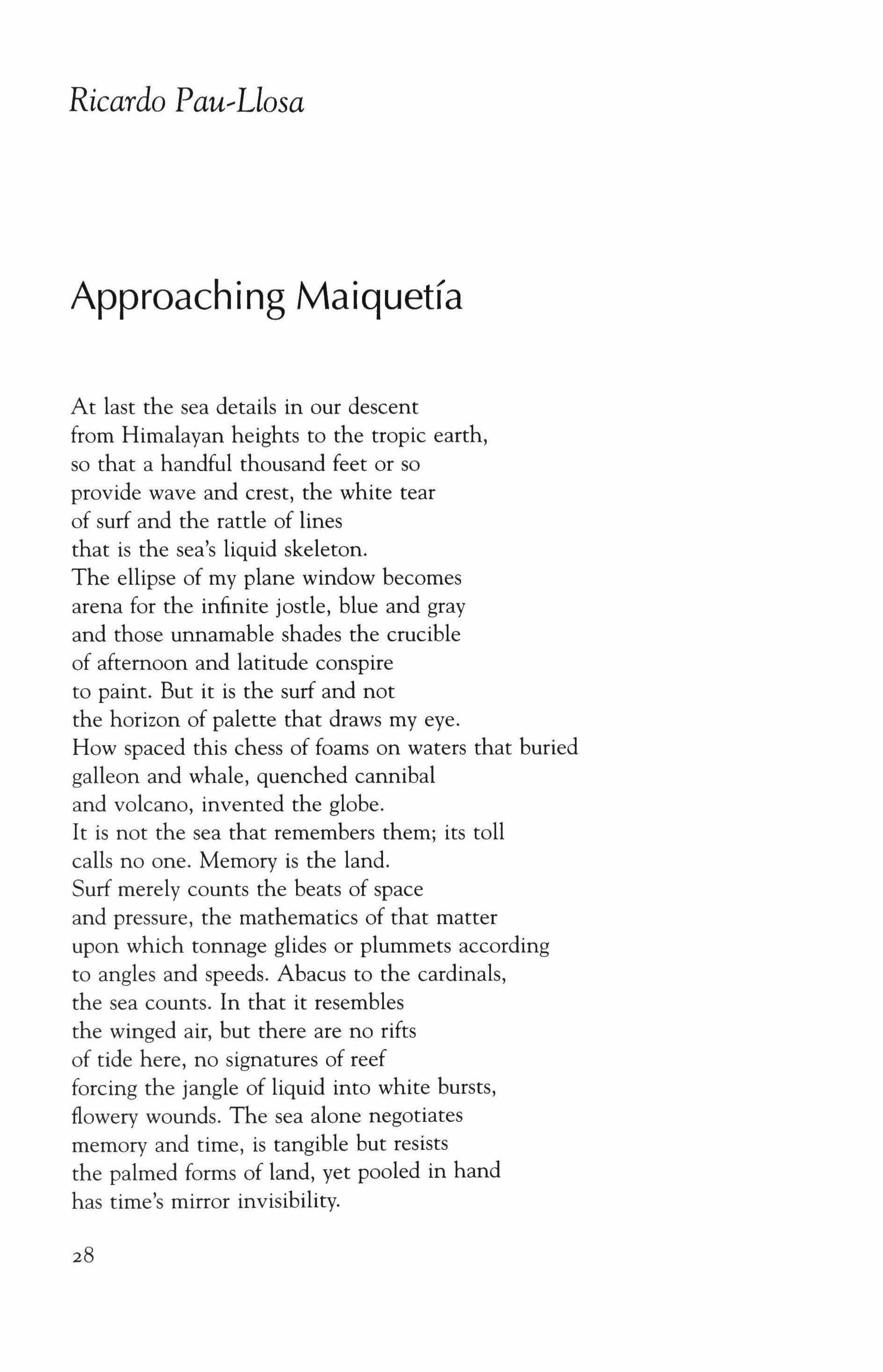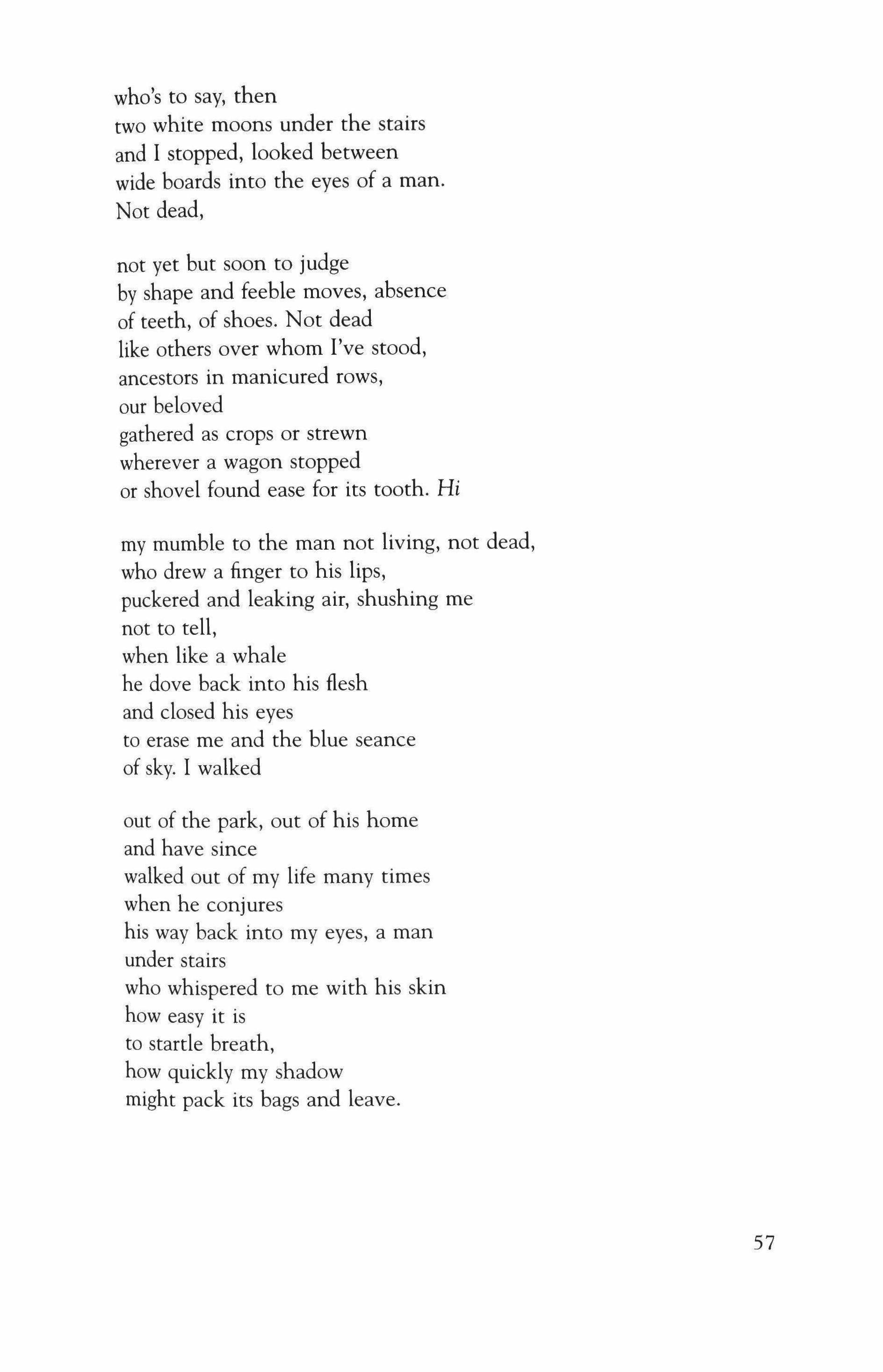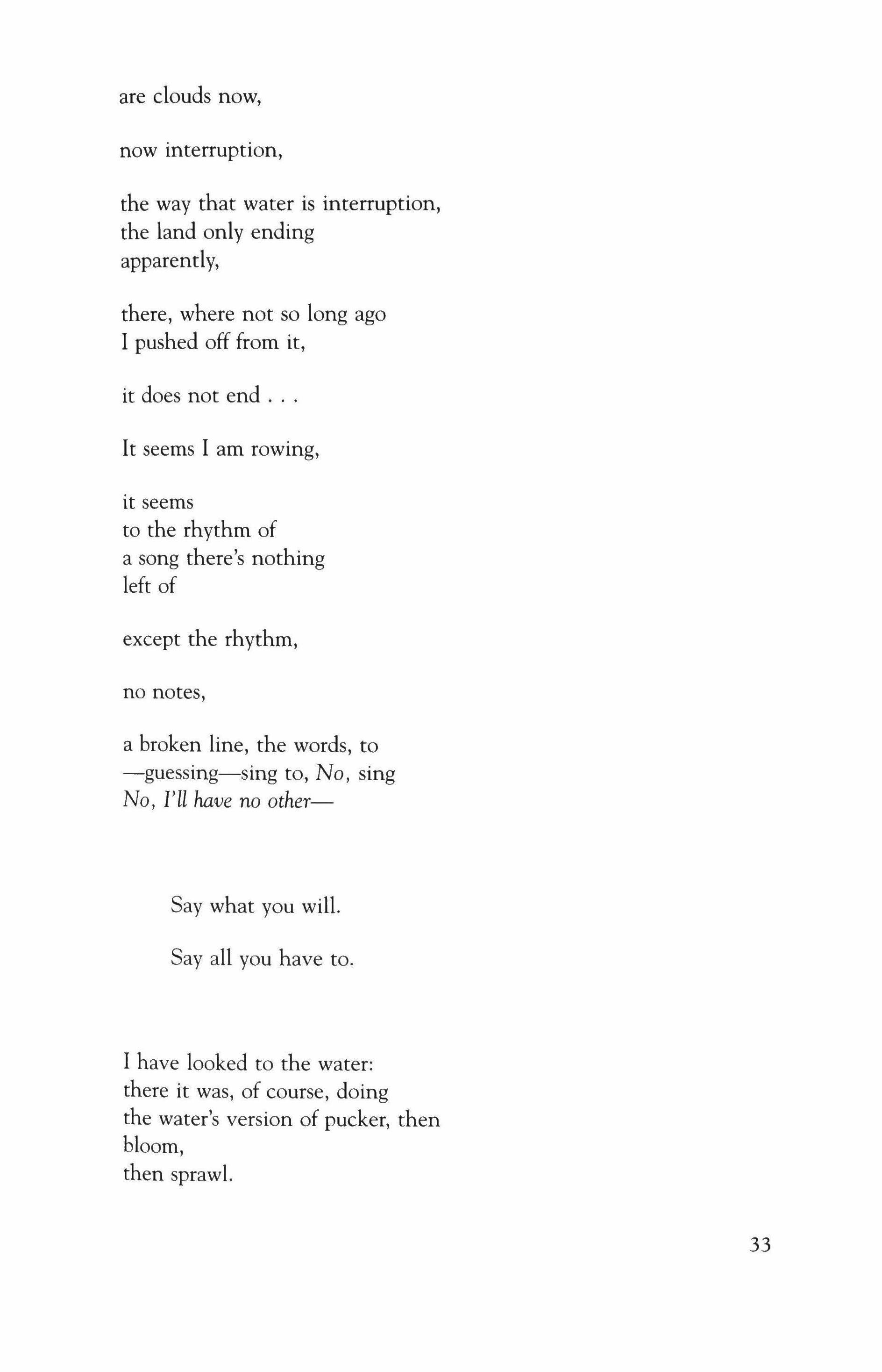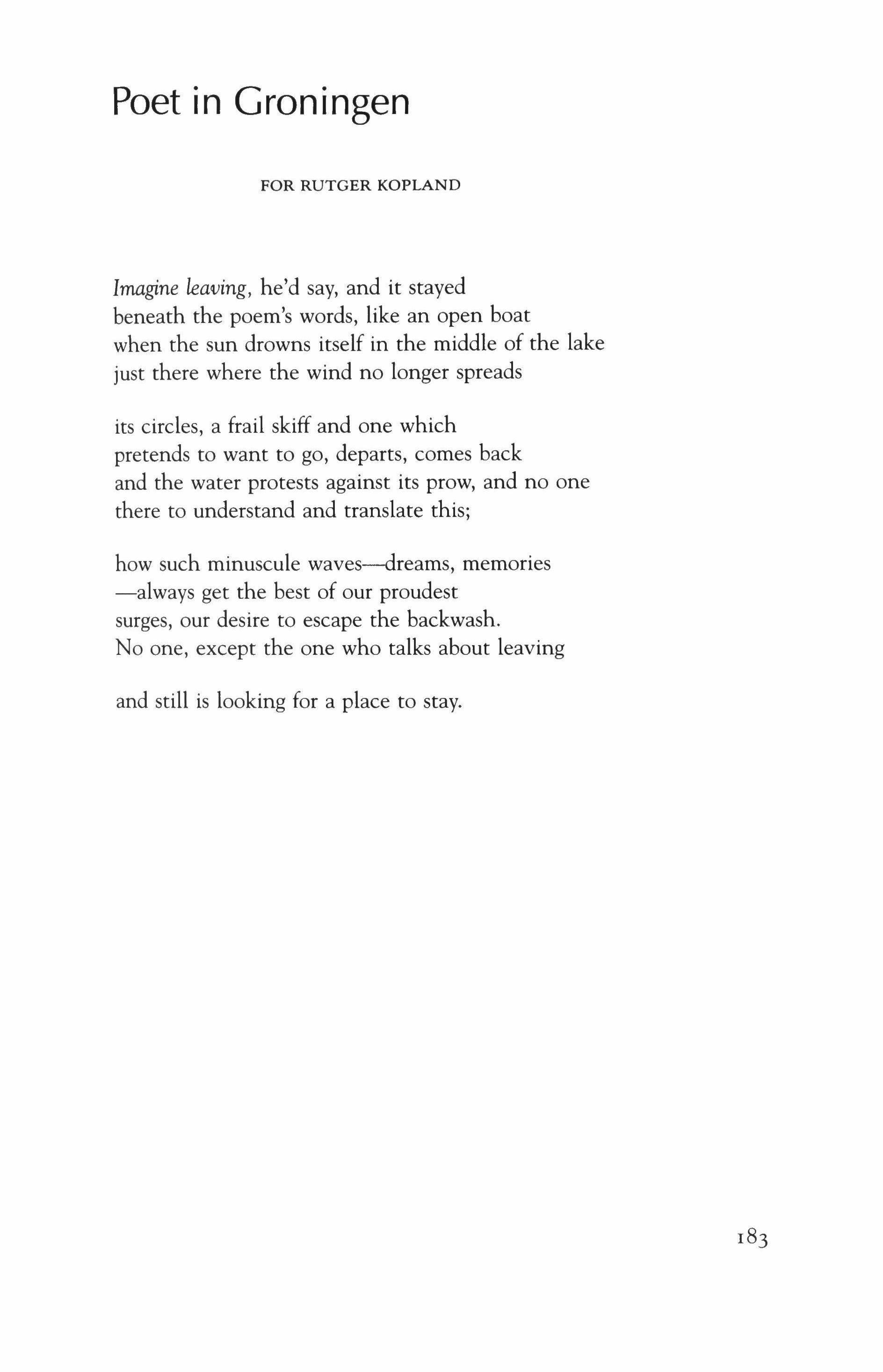 Imagine leaving, he'd say, and it stayed beneath the poem's words, like an open boat when the sun drowns itself in the middle of the lake just there where the wind no longer spreads its circles, a frail skiff and one which pretends to want to go, departs, comes back and the water protests against its prow, and no one there to understand and translate this; how such minuscule waves--dreams, memories -always get the best of our proudest surges, our desire to escape the backwash. No one, except the one who talks about leaving and still is looking for a place to stay.