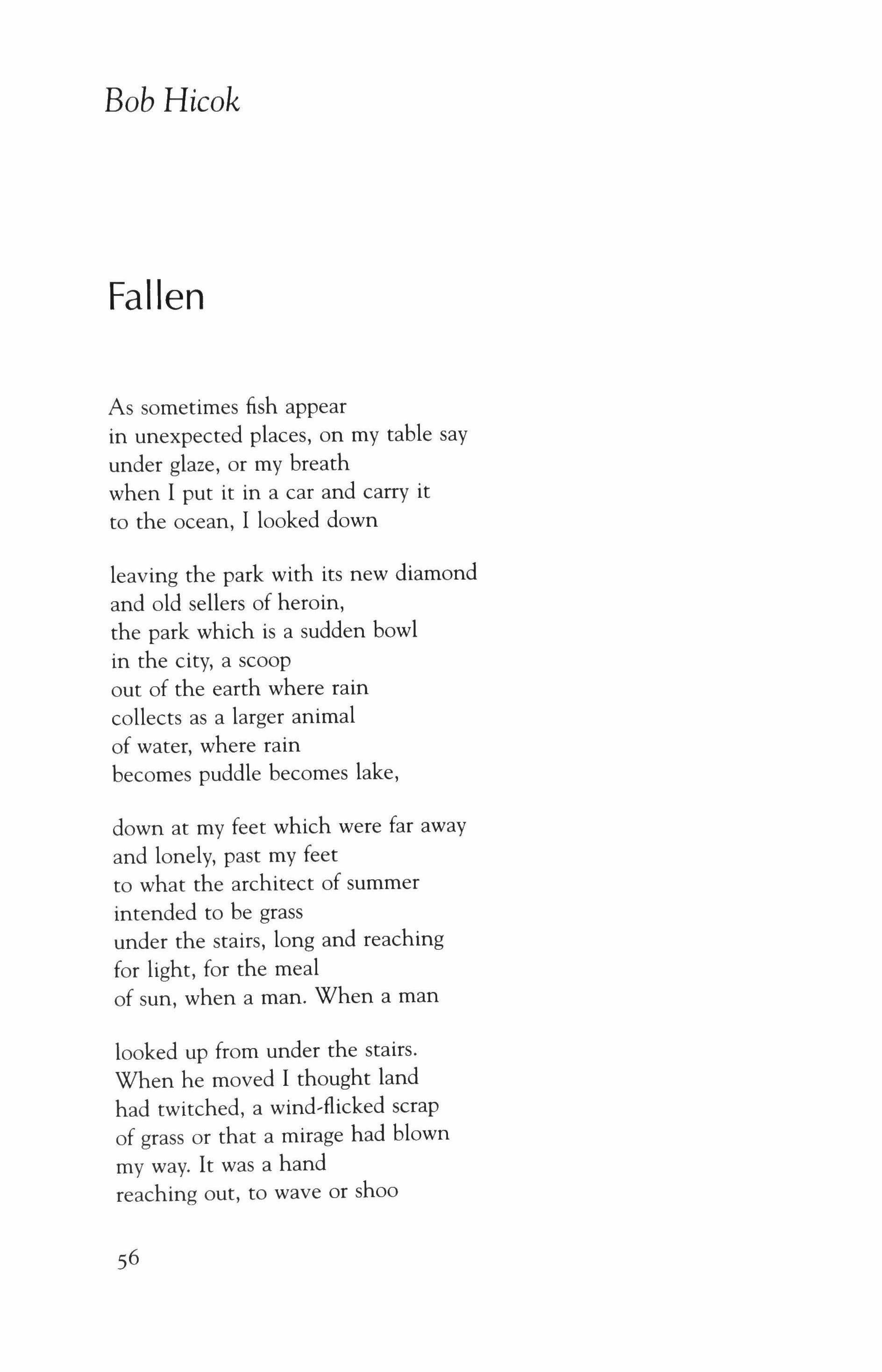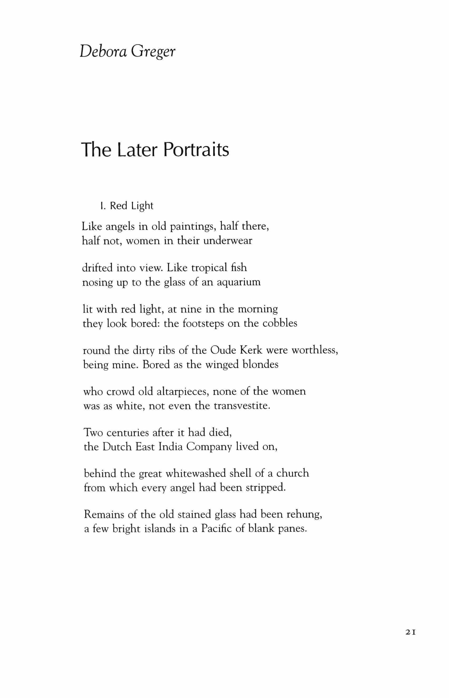 Debora Greger's sixth book of poems is God (Penguin, 2001). Marilyn Hacker is the author of nine books, including Winter Numbers (W.W. Norton, 1994), which received a Lambda Literary Award and the Lenore Marshall Award from The Nation and the Academy of American Poets in 1995. Her most recent book is Squares and Courtyards (W.W. Norton, 2000). Bob Hicok's most recent book, Animal Soul (Invisible Cities Press, 2001), was a finalist for the National Book Critics Circle Award. His previous books are Plus Shipping (BOA, 1998) and The Legend of Light (University of Wisconsin Press, 1995). Edward Hirsch's most recent book of poems, Lay Back the Darkness, will be published by Knopf in 2003. His prose book, The Demon and the Angel, appeared from Harcourt, spring 2002. Peter Johnson's book, Miracles and Modifications (White Pine Press) was awarded the 2001 James Laughlin Award from the Academy of American Poets.
