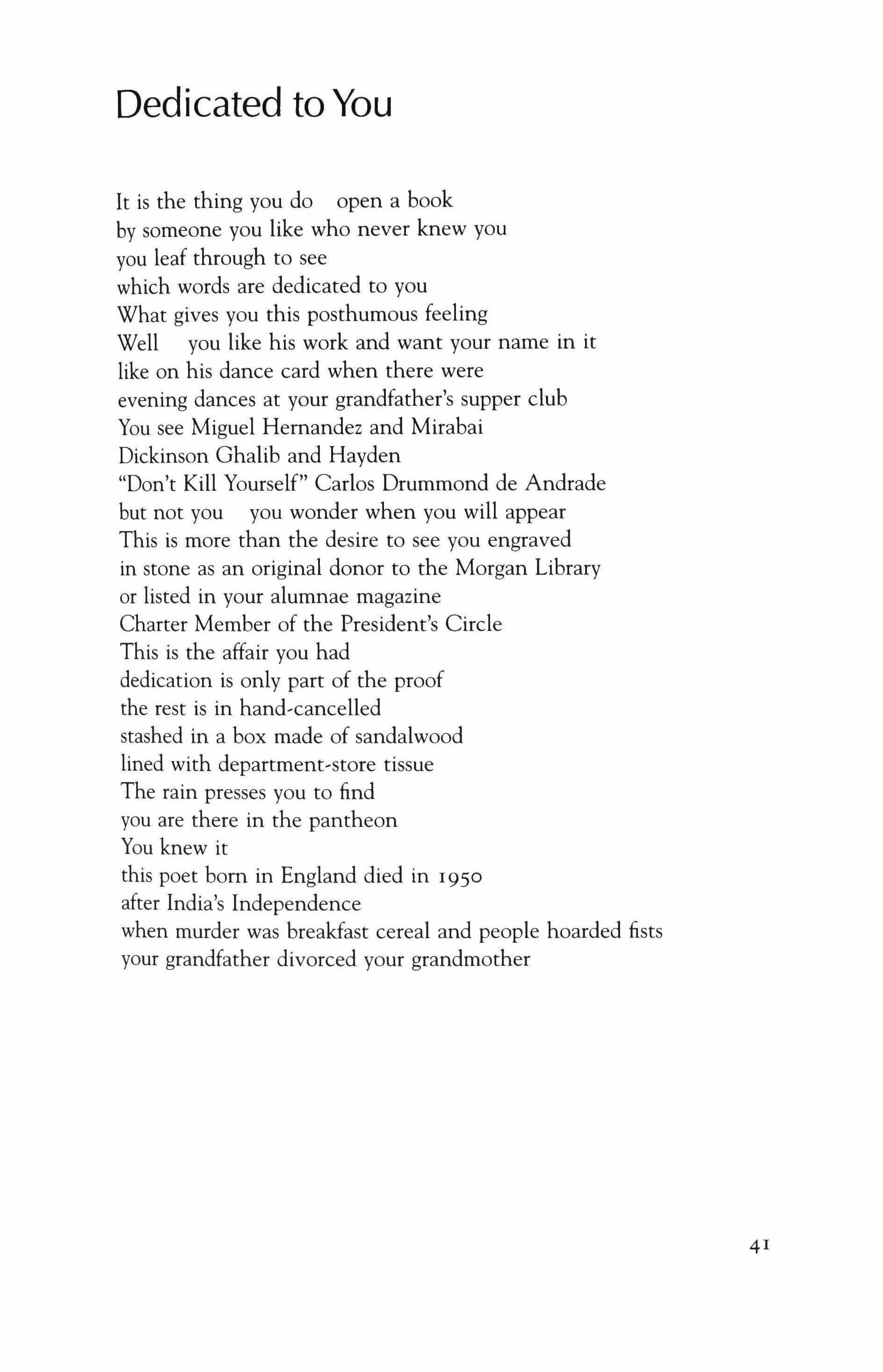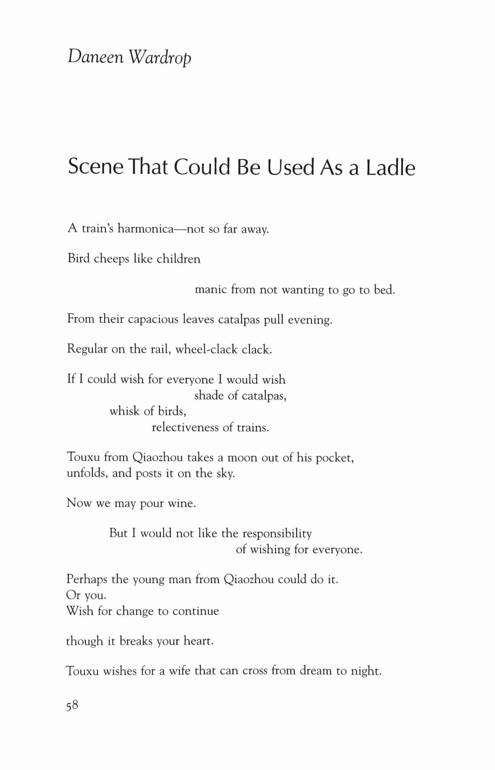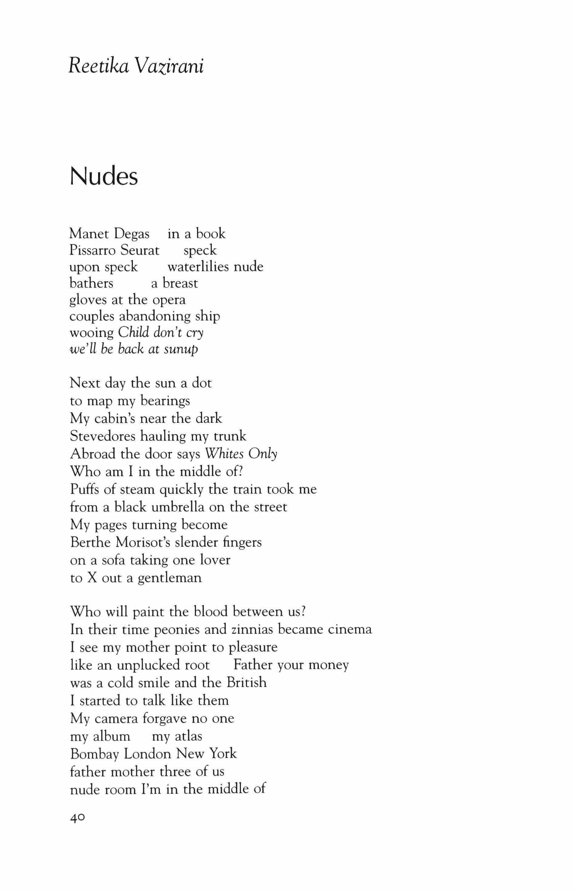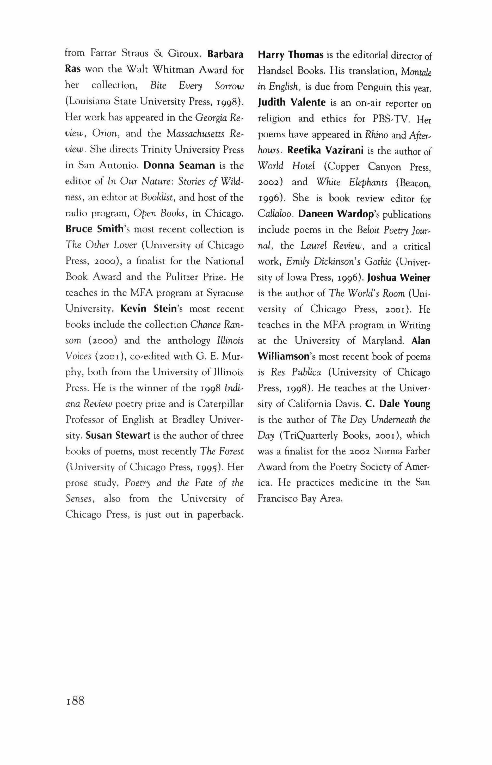 Harry Thomas is the editorial director of Handsel Books. His translation, Montale in English, is due from Penguin this year. Judith Valente is an on-air reporter on religion and ethics for PBS-TV. Her poems have appeared in Rhino and Afterhours. Reetika Vazirani is the author of World Hotel (Copper Canyon Press, 2002) and White Elephants (Beacon, 1996). She is book review editor for Callaloo. Daneen Wardop's publications include poems in the Beloit Poetry Journal, the Laurel Review, and a critical work, Emily Dickinson's Gothic (University of Iowa Press, 1996). Joshua Weiner is the author of The WorUl's Room (University of Chicago Press, 2001). He teaches in the MFA program in Writing at the University of Maryland. Alan Williamson's most recent book of poems is Res Publica (University of Chicago Press, 1998). He teaches at the University of California Davis. C. Dale Young is the author of The Day Underneath the Day (TriQuarterly Books, 2001), which was a finalist for the 2002 Norma Farber Award from the Poetry Society of America. He practices medicine in the San Francisco Bay Area.