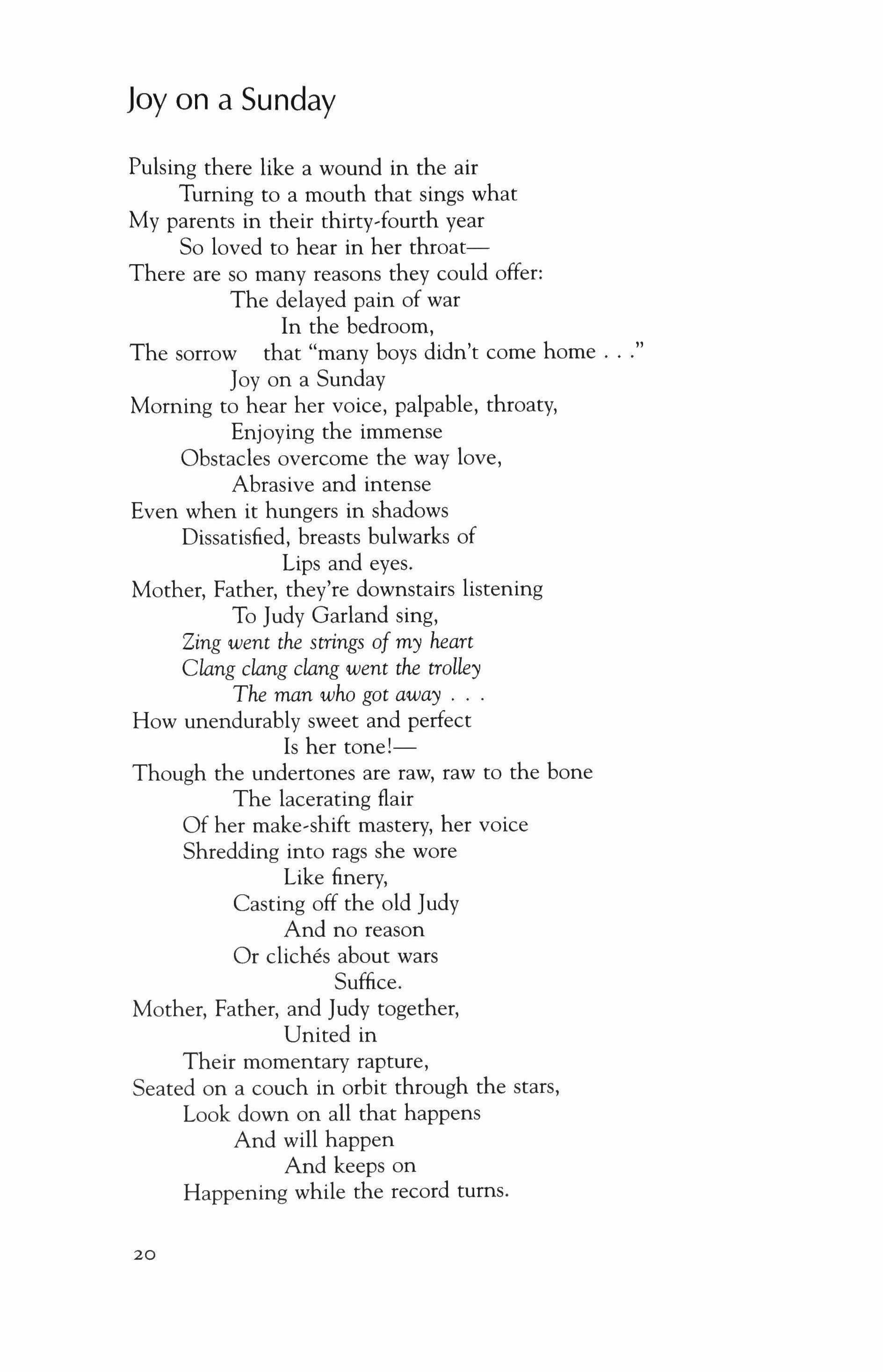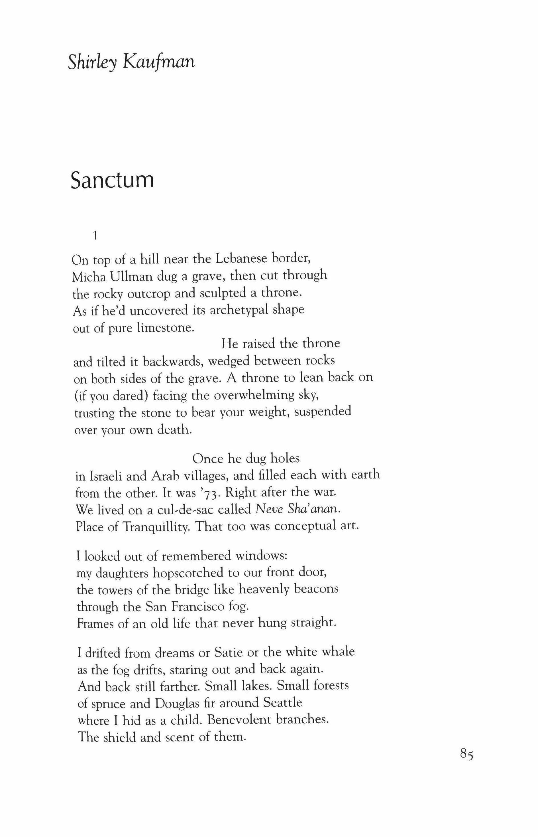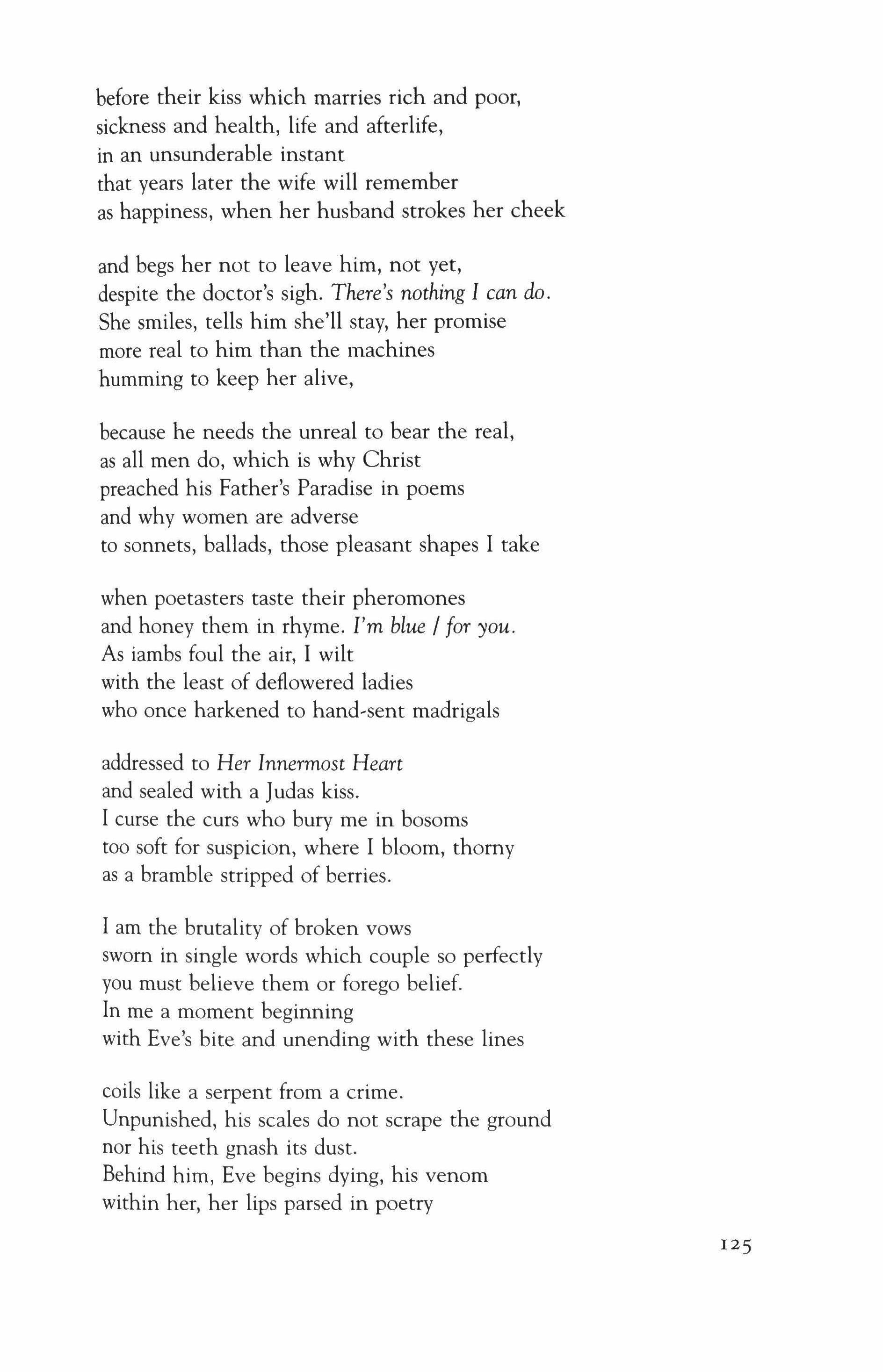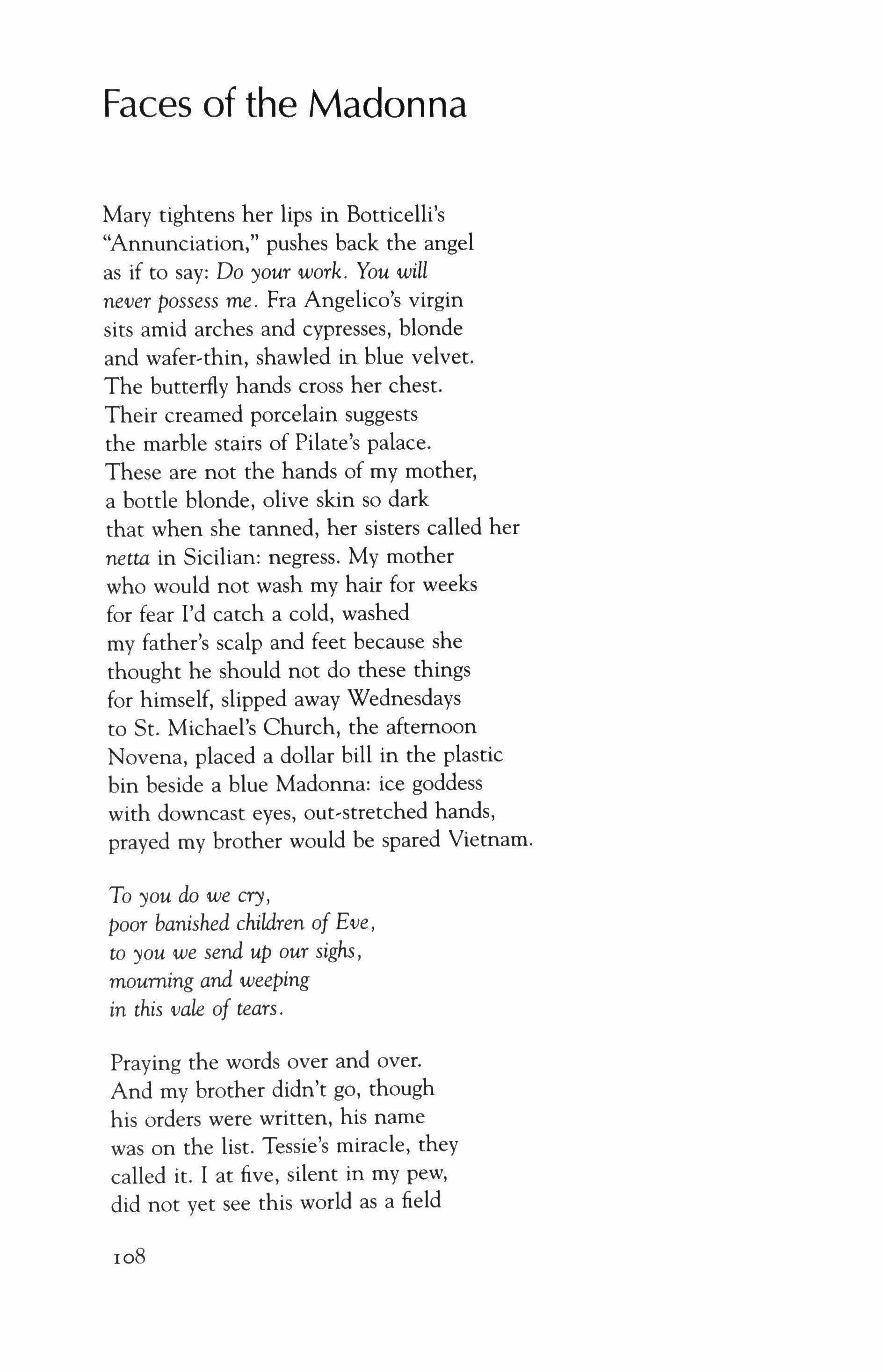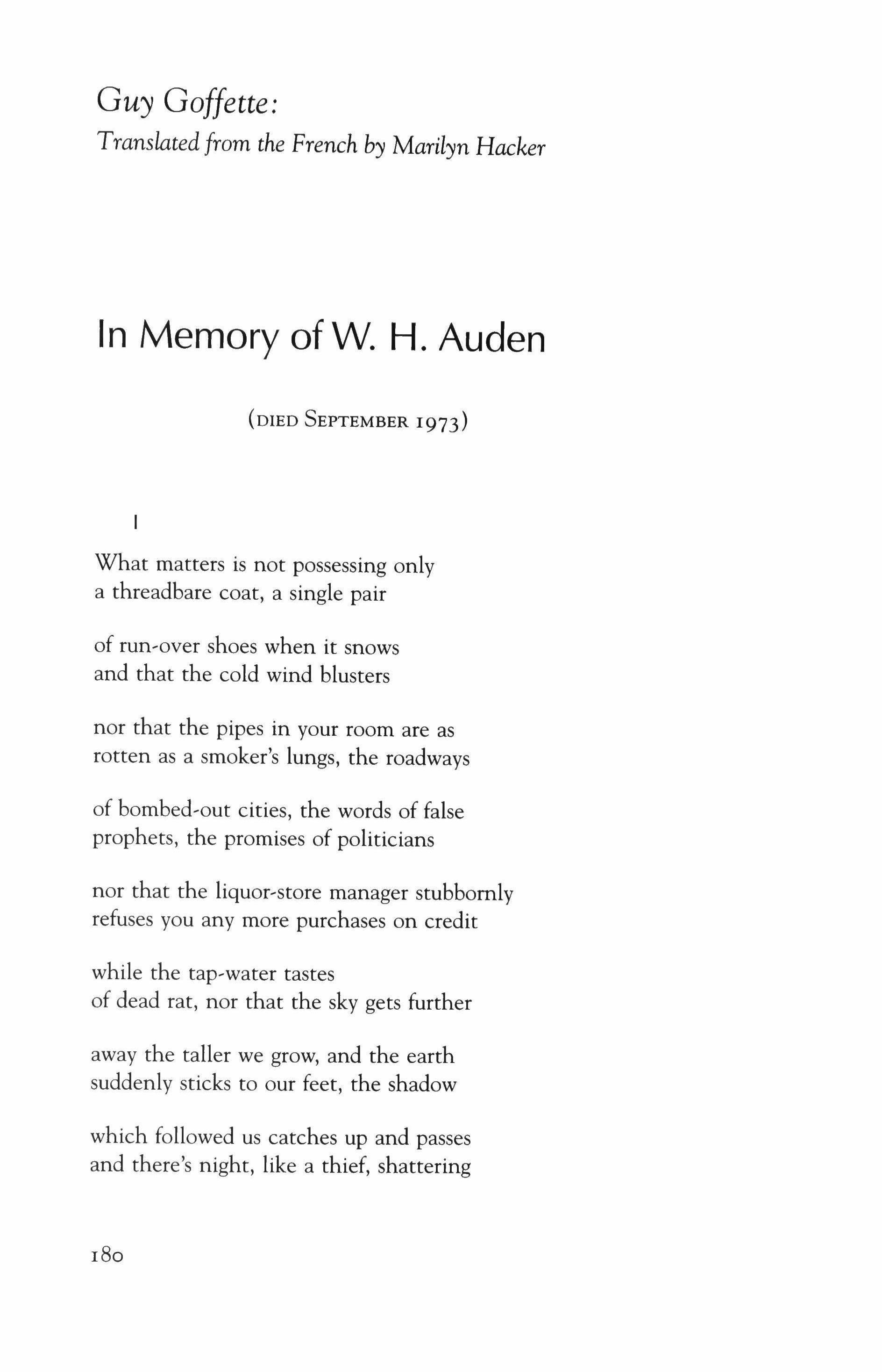 American Poetry Review. She teaches at St. Mary's College of California. Sandra M. Gilbert's latest collection of poems, Kissing the Bread: New and Selected Poems 1969- 1 999 won the 2001 American Book Award. She is at work on a book of personal essays entitled Deatb's Door: Mourning, Modernity, & the Poetics of Memory. Guy GoffeUe is the author of six books of poems, most recently Un manteau de fortune (Gallimard, 2001).