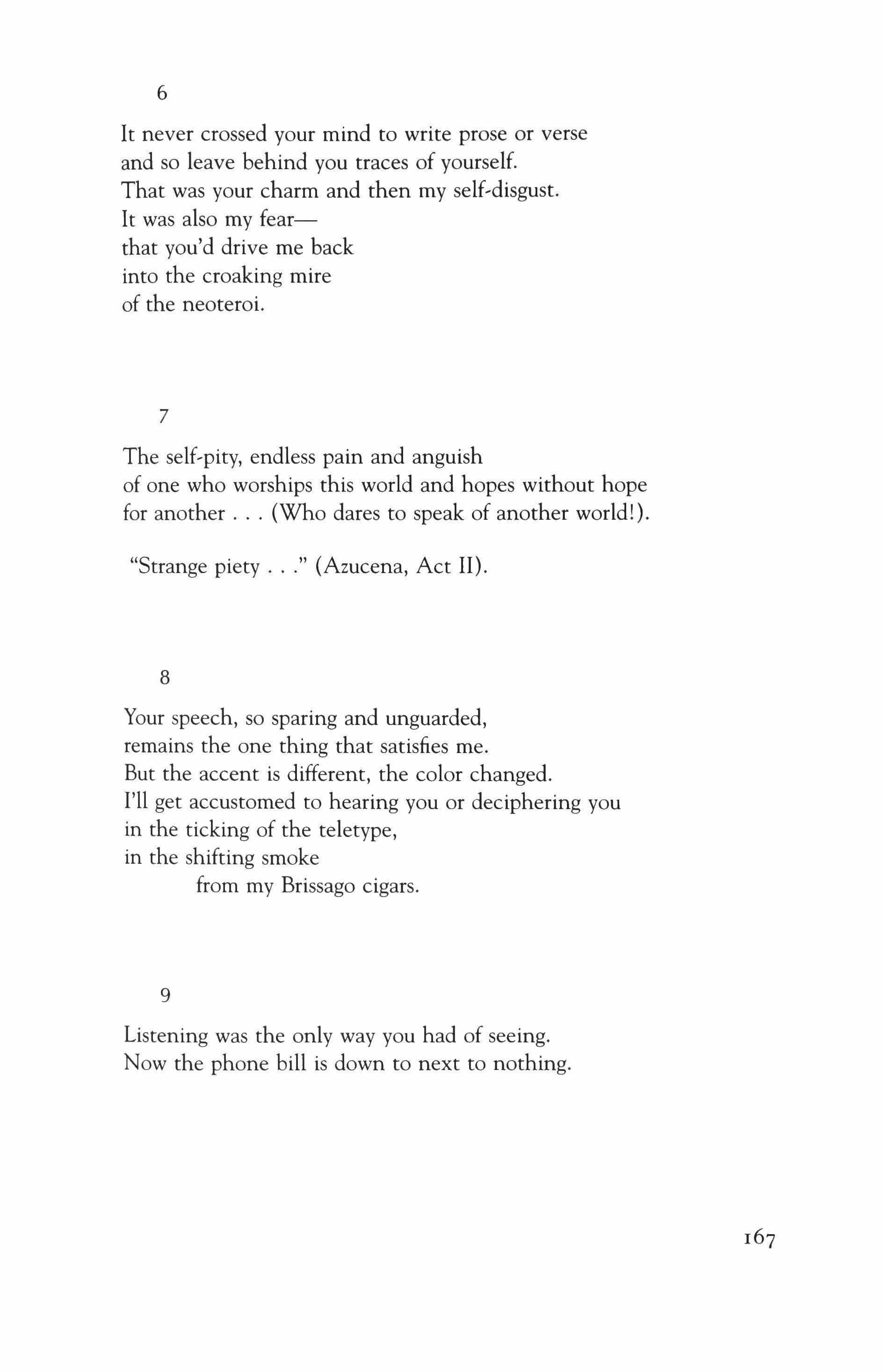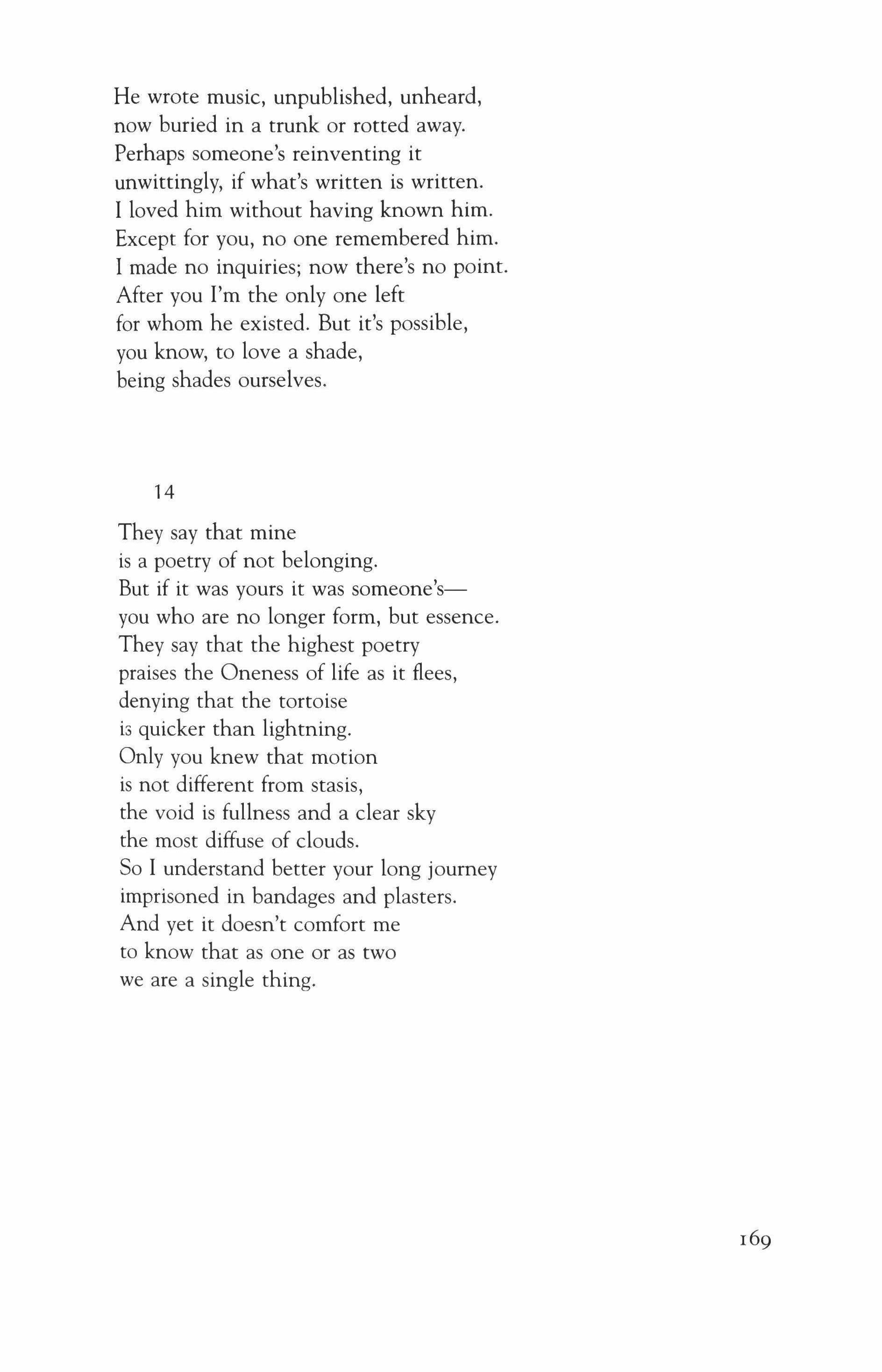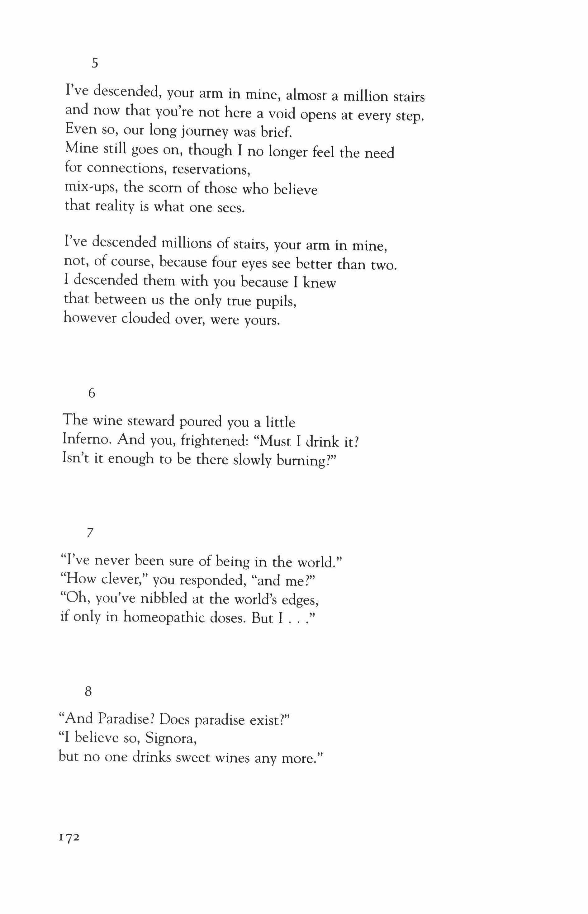 continued their nonchalant waltz among the dead leaves and discarded bus-tickets. Alone with his feet, as he put it, the poet packed off without shutting his suitcase, since everything, even the loveliest line, remains unfinished here below, waiting for another mouth, another harmony according to which it's written that to be One there must be Two, that love alone connects and the rest is rout.