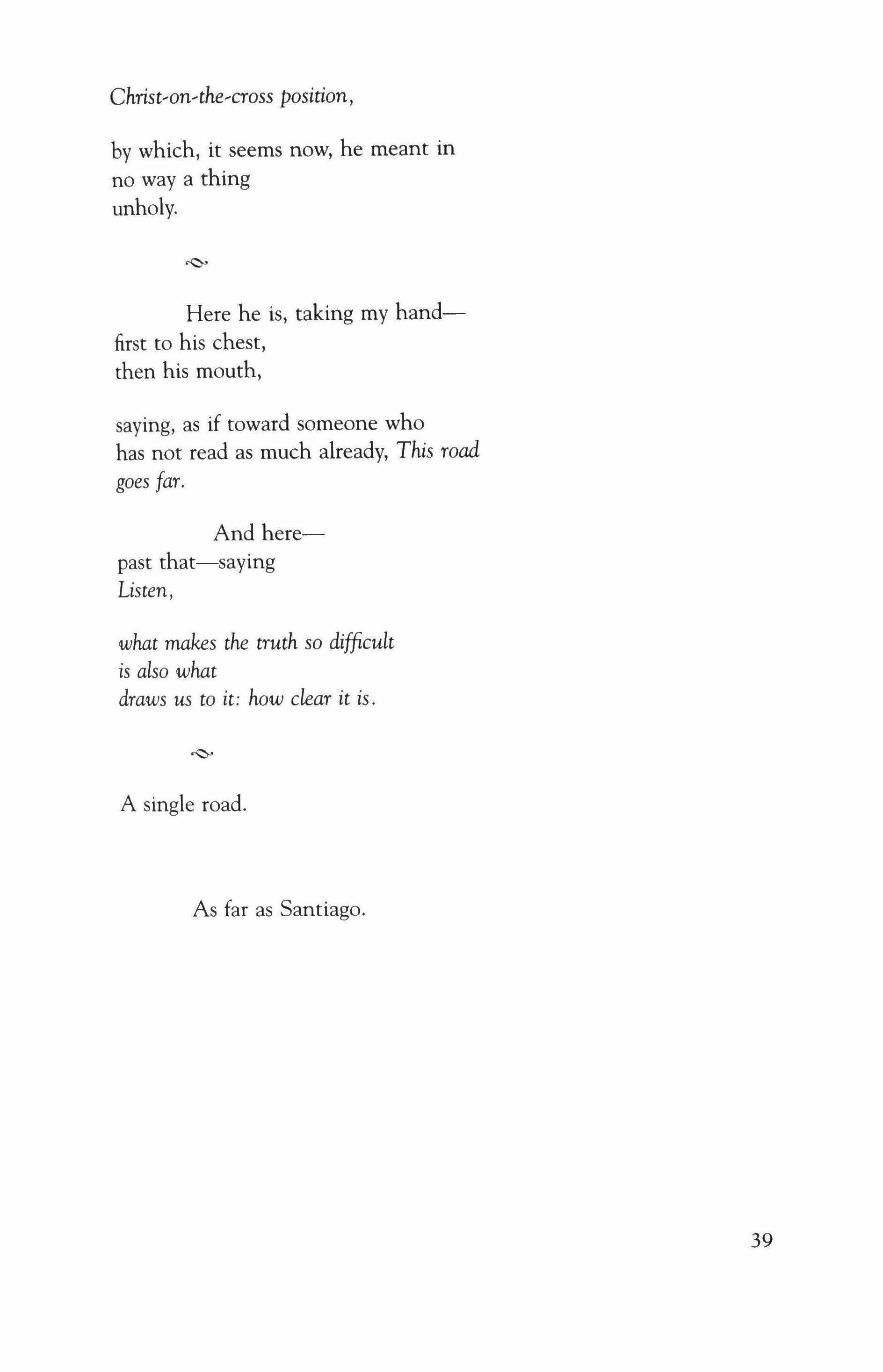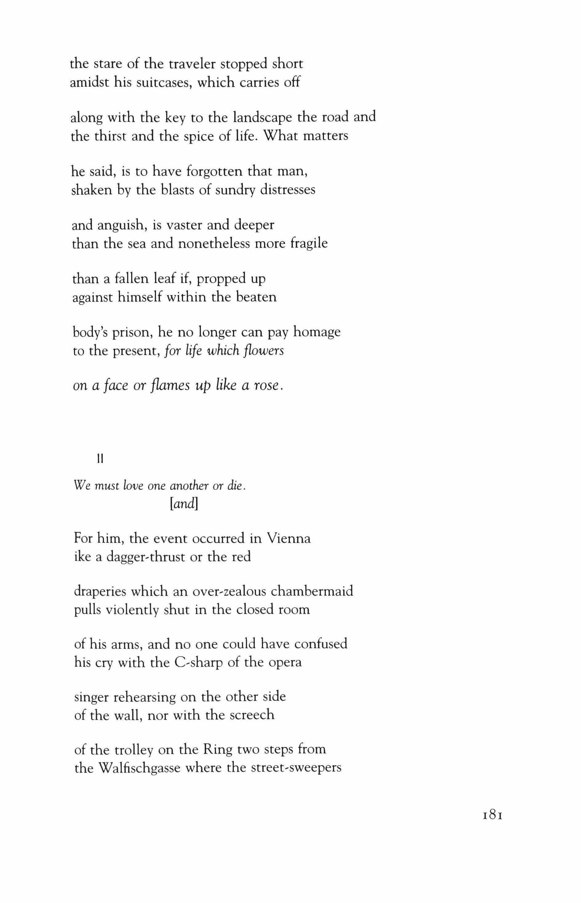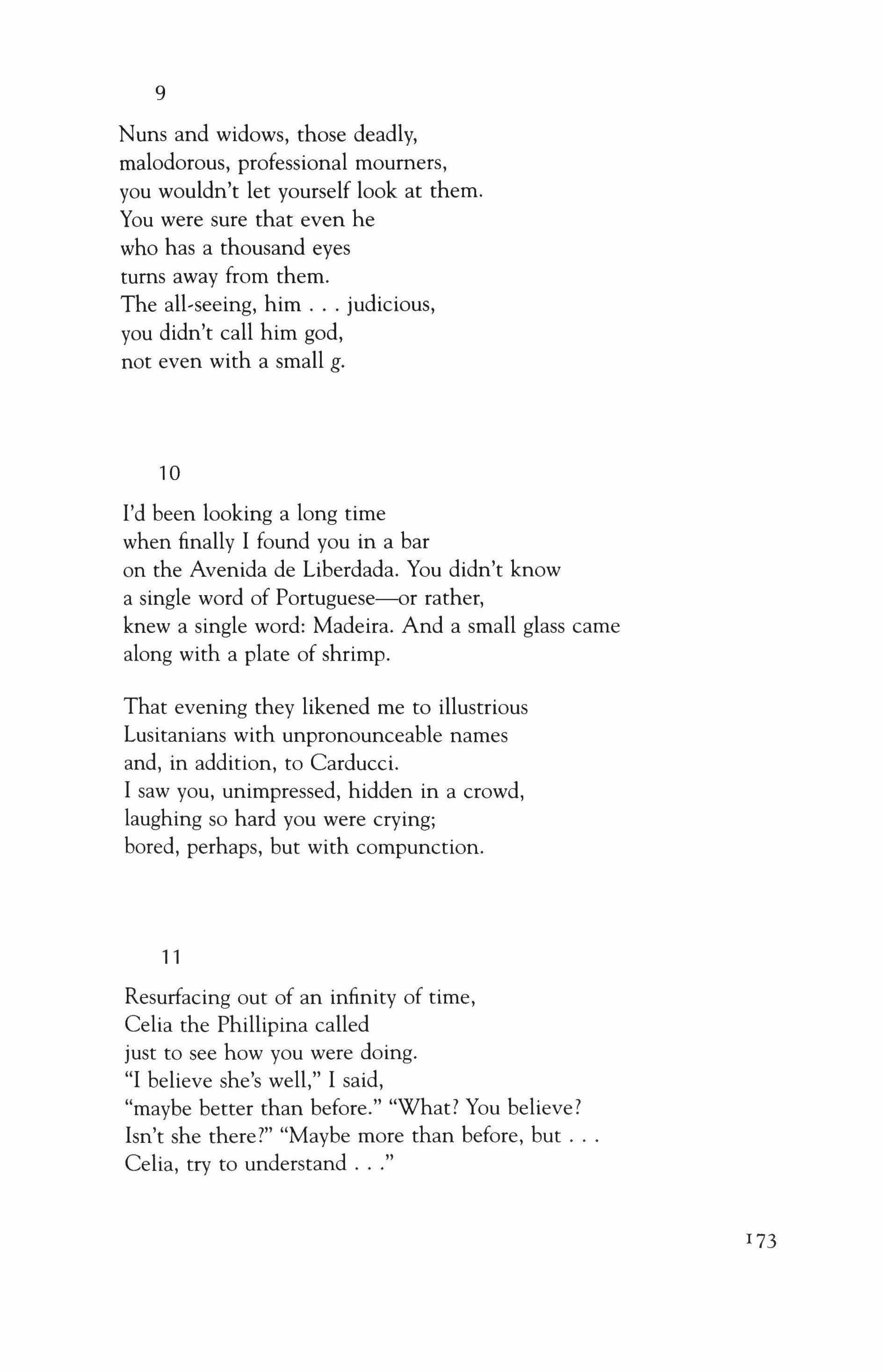 continued their nonchalant waltz among the dead leaves and discarded bus-tickets. Alone with his feet, as he put it, the poet packed off without shutting his suitcase, since everything, even the loveliest line, remains unfinished here below, waiting for another mouth, another harmony according to which it's written that to be One there must be Two, that love alone connects and the rest is rout.