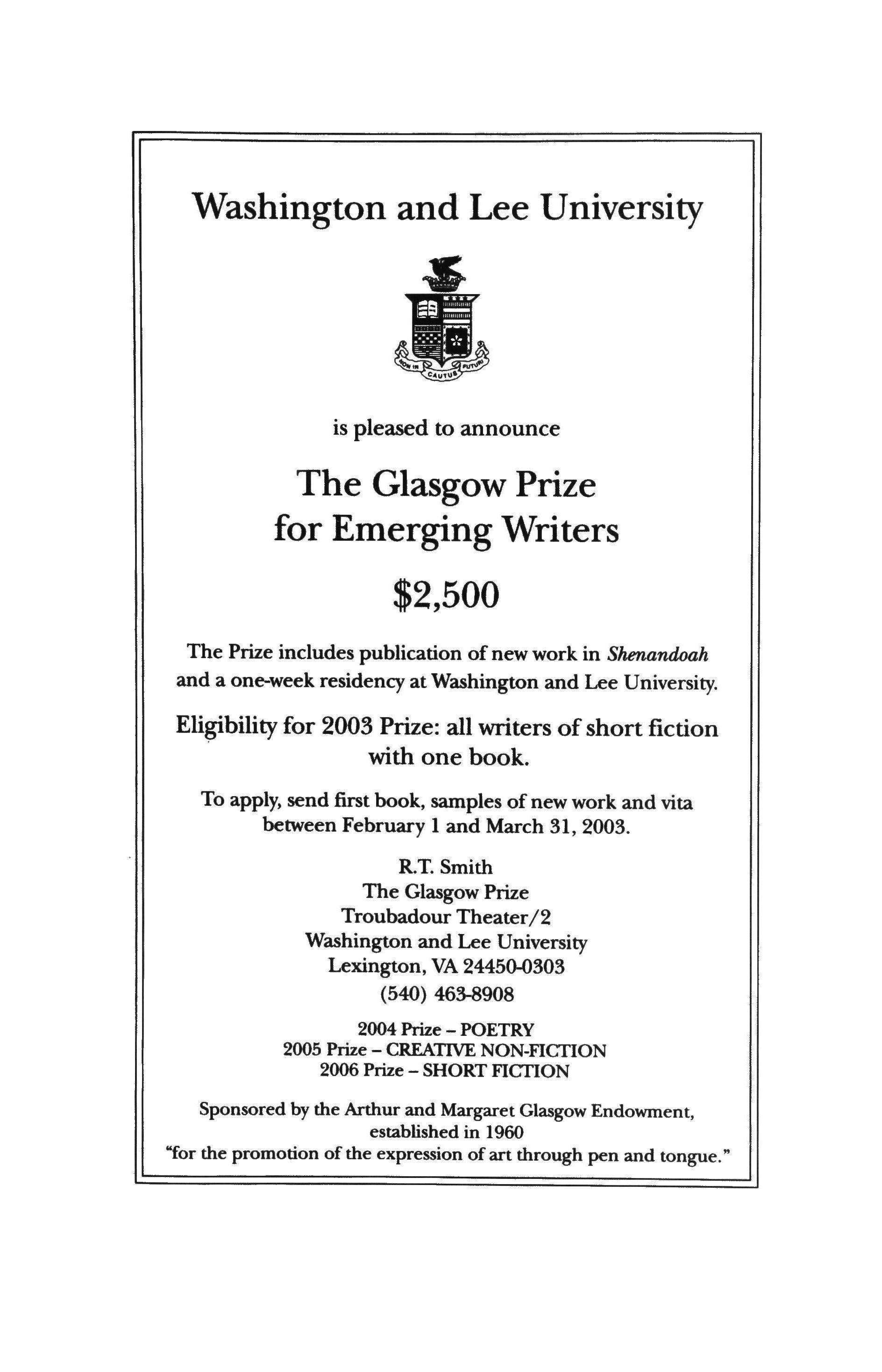 The Glasgow Prize Troubadour Theater/2 Washington and Lee University Lexington, VA 24450-0303 (540) 463-8908