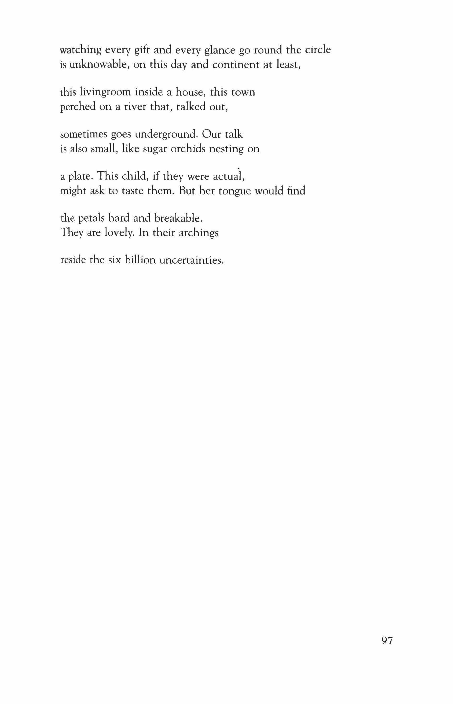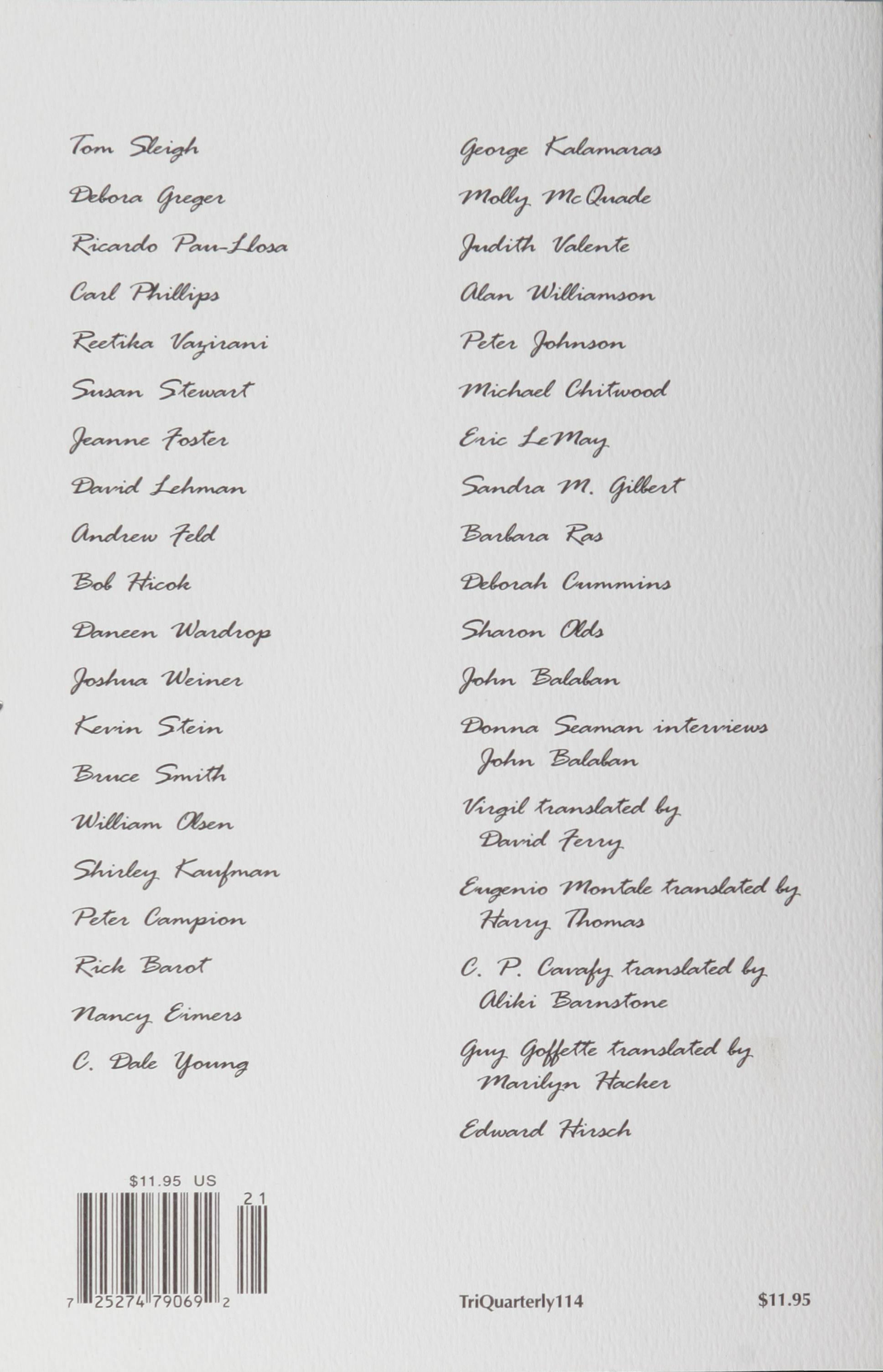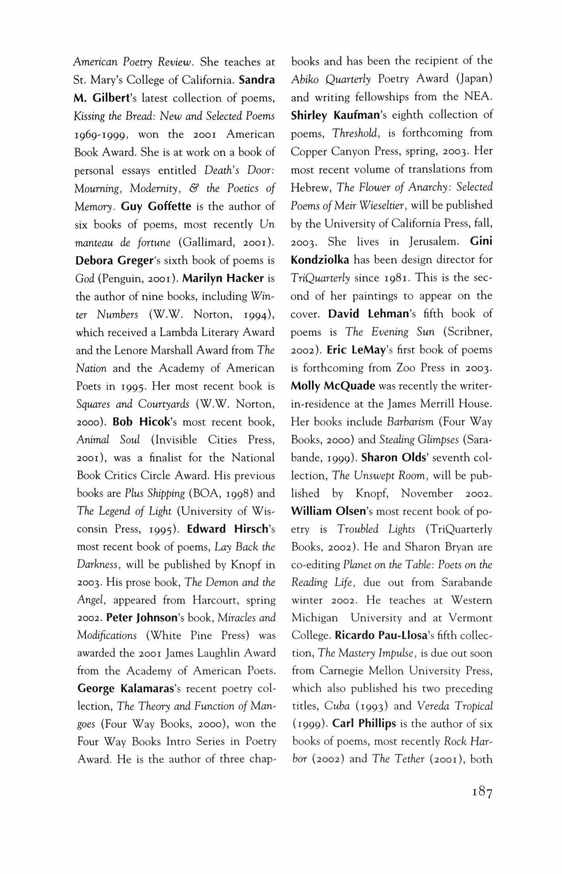 Shirley Kaufman's eighth collection of poems, Threshold, is forthcoming from Copper Canyon Press, spring, 2003. Her most recent volume of translations from Hebrew, The Flower of Anarchy: Selected Poems of Meir Wieseltier, will be published by the University of California Press, fall, 2003. She lives in Jerusalem. Gini Kondziolka has been design director for TriQuarterly since 1981. This is the second of her paintings to appear on the cover. David Lehman's fifth book of poems is The Evening Sun (Scribner, 2002). Eric LeMay's first book of poems is forthcoming from Zoo Press in 2003. Molly McQuade was recently the writerin-residence at the James Merrill House. Her books include Barbarism (Four Way Books, 2000) and Stealing Glimpses (Sarabande, 1999). Sharon Olds' seventh collection, The Unswept Room, will be published by Knopf, November 2002. William Olsen's most recent book of poetry is Troubled Lights (TriQuarterly Books, 2002). He and Sharon Bryan are co-editing Planet on the Table: Poets on the Reading Life, due out from Sarabande winter 2002. He teaches at Western Michigan University and at Vermont College. Ricardo Pau-L1osa's fifth collection, The Mastery Impulse, is due out soon from Carnegie Mellon University Press, which also published his two preceding titles, Cuba (1993) and Vereda Tropical (1999). Carl Phillips is the author of six books of poems, most recently Rock Harbor (2002) and The Tether (2001), both