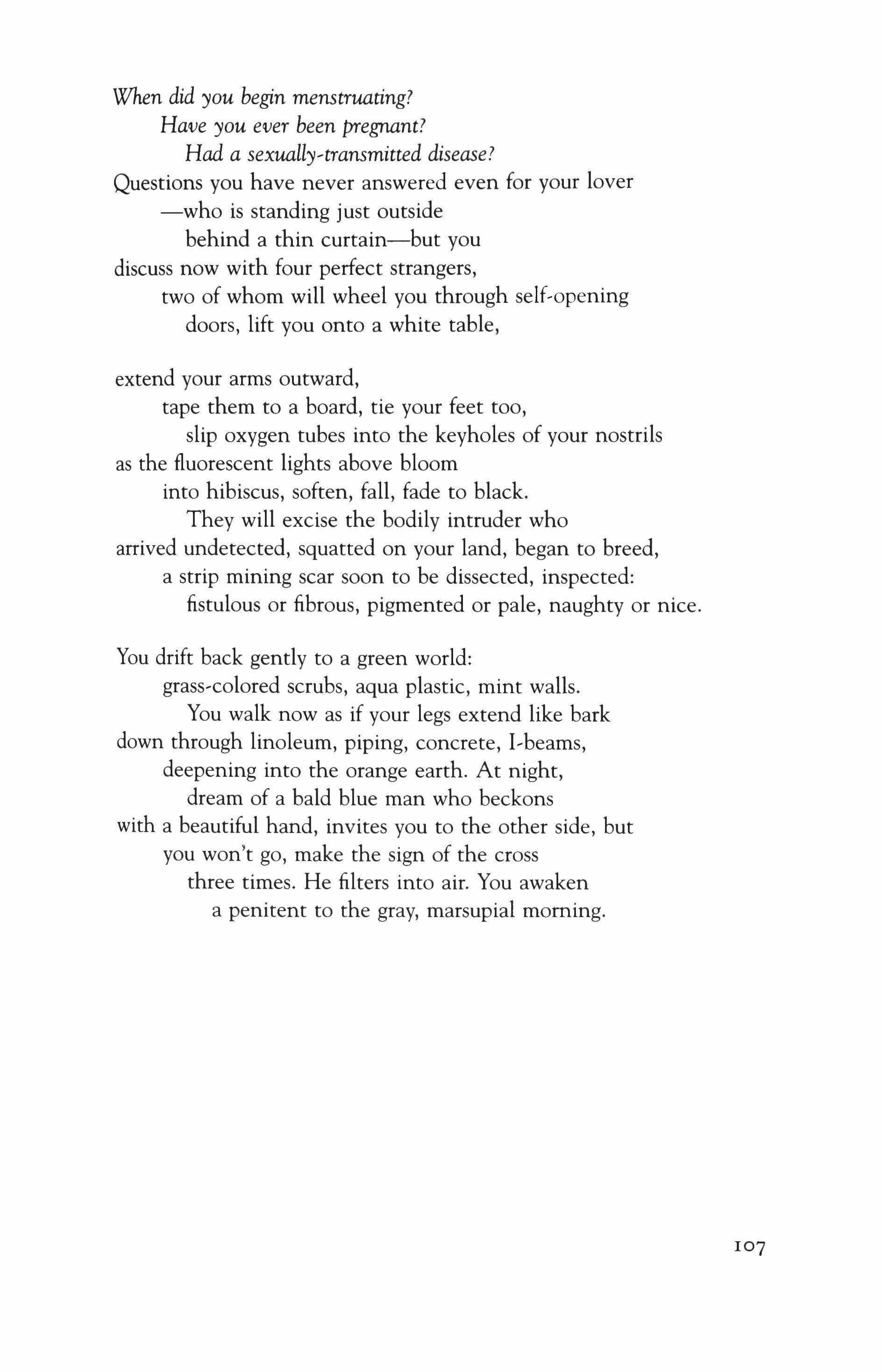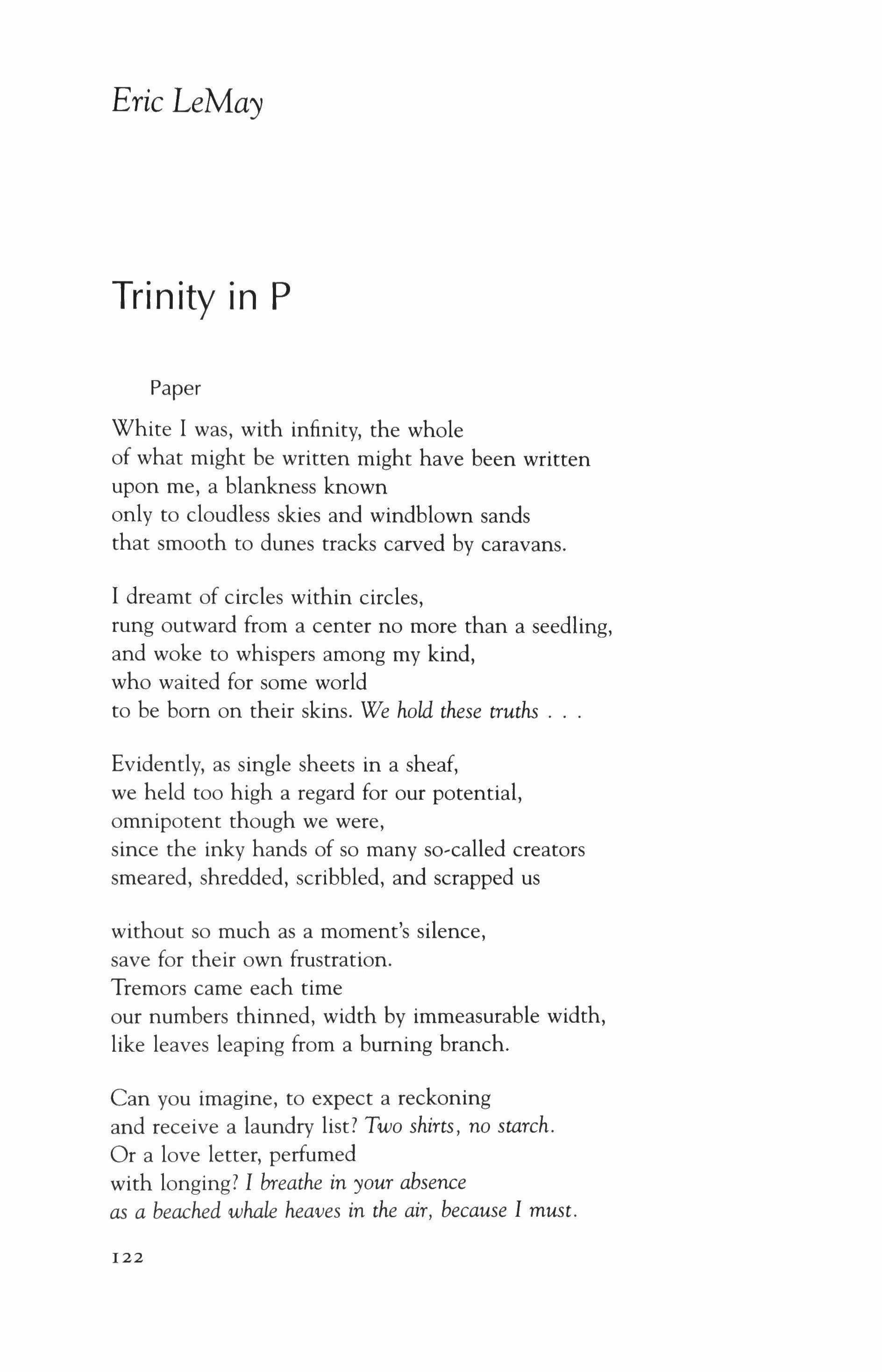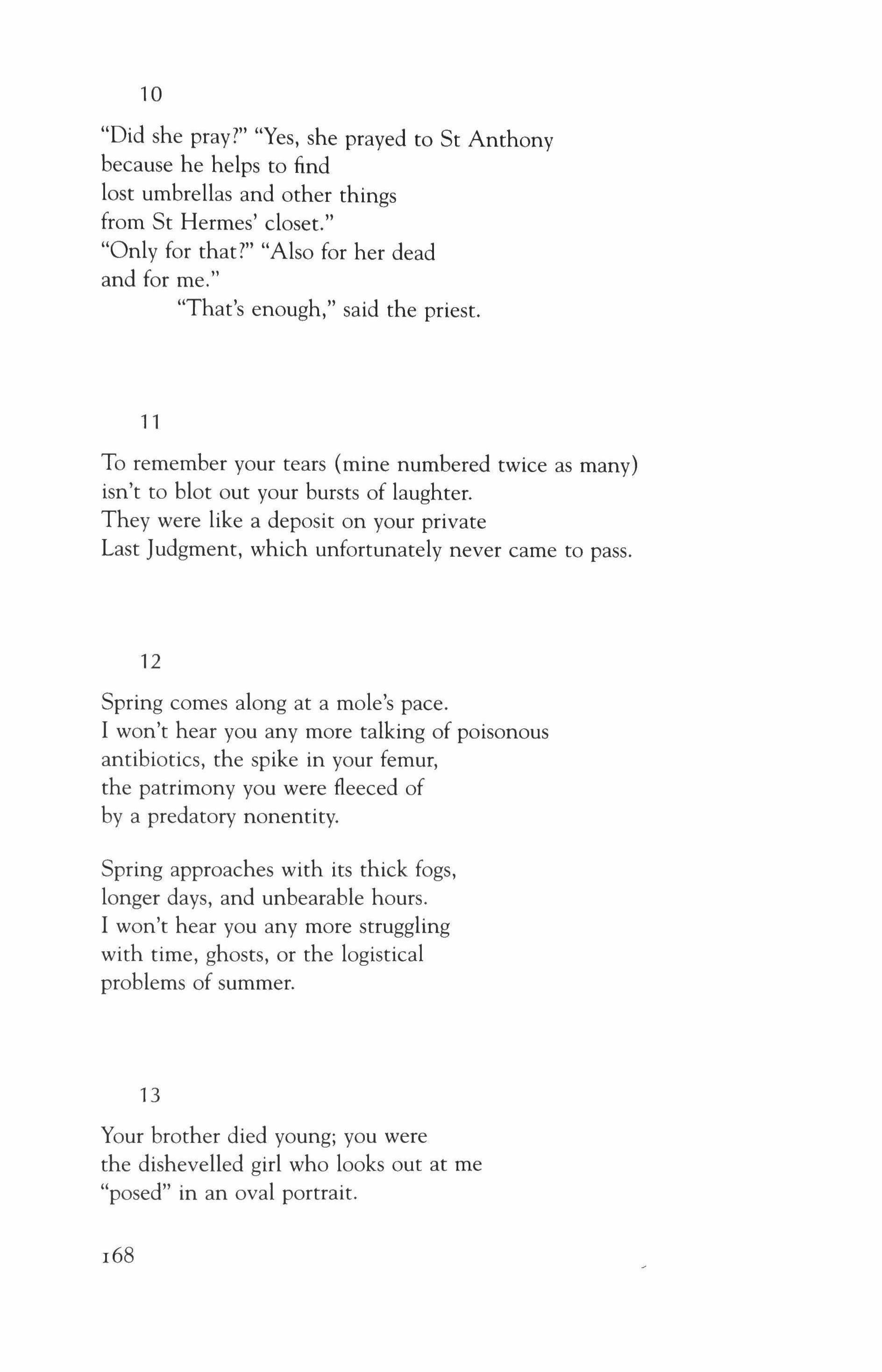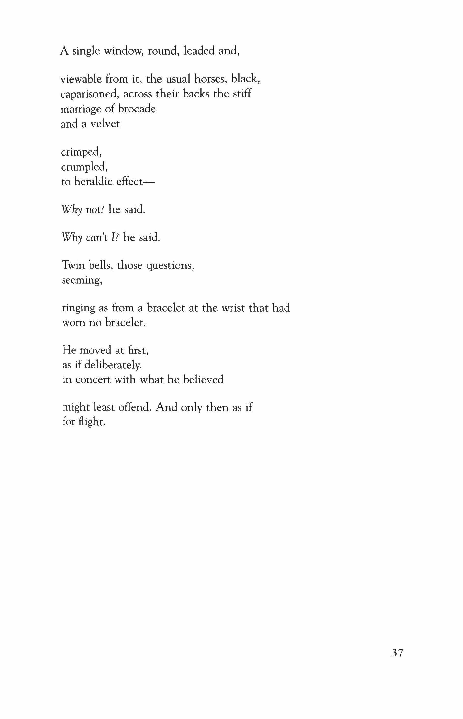Shirley Kaufman's eighth collection of poems, Threshold, is forthcoming from Copper Canyon Press, spring, 2003. Her most recent volume of translations from Hebrew, The Flower of Anarchy: Selected Poems of Meir Wieseltier, will be published by the University of California Press, fall, 2003. She lives in Jerusalem. Gini Kondziolka has been design director for TriQuarterly since 1981. This is the second of her paintings to appear on the cover. David Lehman's fifth book of poems is The Evening Sun (Scribner, 2002). Eric LeMay's first book of poems is forthcoming from Zoo Press in 2003. Molly McQuade was recently the writerin-residence at the James Merrill House. Her books include Barbarism (Four Way Books, 2000) and Stealing Glimpses (Sarabande, 1999). Sharon Olds' seventh collection, The Unswept Room, will be published by Knopf, November 2002. William Olsen's most recent book of poetry is Troubled Lights (TriQuarterly Books, 2002). He and Sharon Bryan are co-editing Planet on the Table: Poets on the Reading Life, due out from Sarabande winter 2002. He teaches at Western Michigan University and at Vermont College. Ricardo Pau-L1osa's fifth collection, The Mastery Impulse, is due out soon from Carnegie Mellon University Press, which also published his two preceding titles, Cuba (1993) and Vereda Tropical (1999). Carl Phillips is the author of six books of poems, most recently Rock Harbor (2002) and The Tether (2001), both