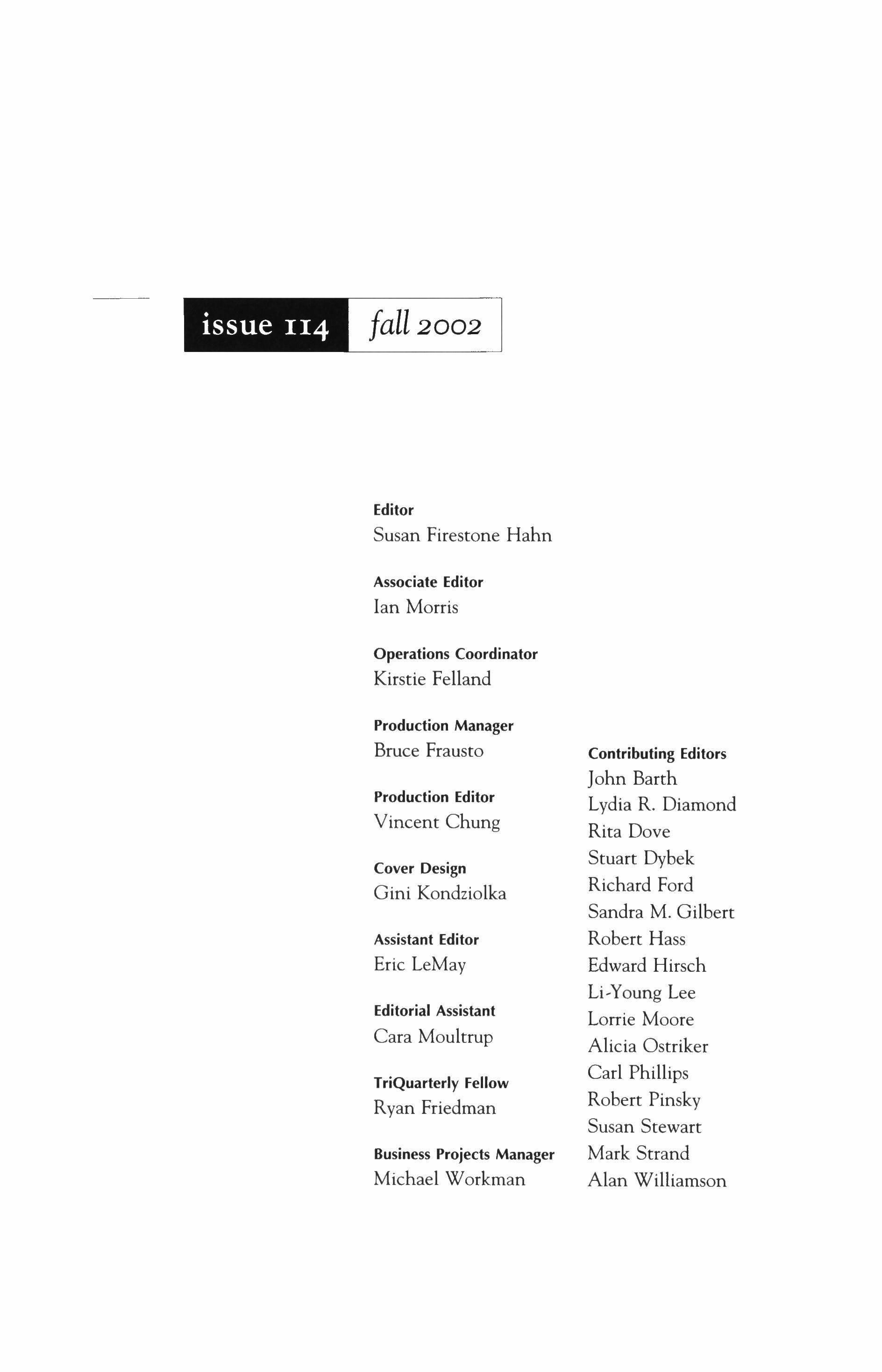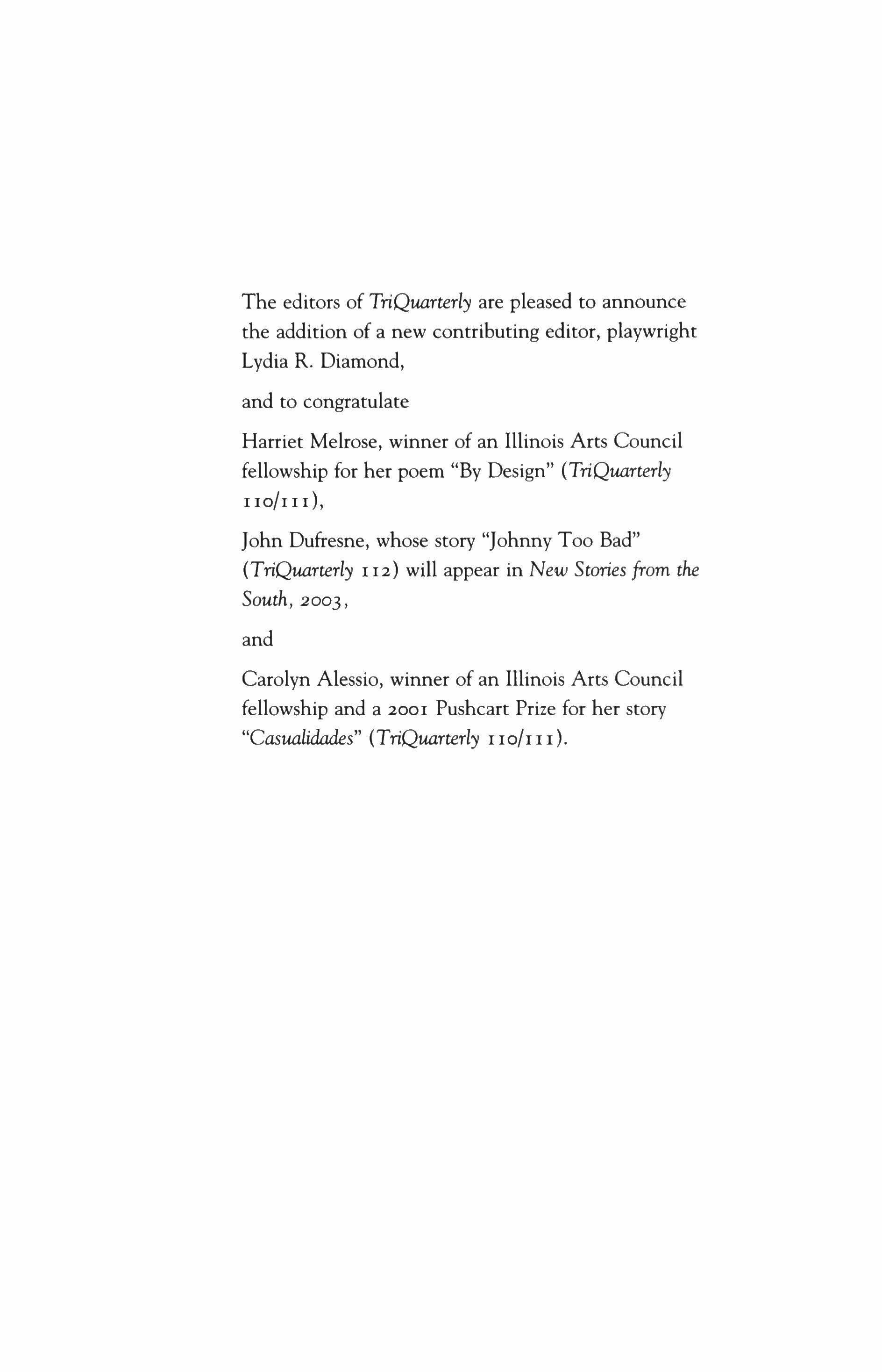 The editors of TriQuarterly are pleased to announce the addition of a new contributing editor, playwright Lydia R. Diamond, and to congratulate Harriet Melrose, winner of an Illinois Arts Council fellowship for her poem "By Design" (TriQuarterly IIO/II 1), John Dufresne, whose story "Johnny Too Bad" (TriQuarterly II2) will appear in New Stories from the South,2003, and Carolyn Alessio, winner of an Illinois Arts Council fellowship and a 2001 Pushcart Prize for her story "Casualidades" (TriQuarterly 1 to]: 1 1).