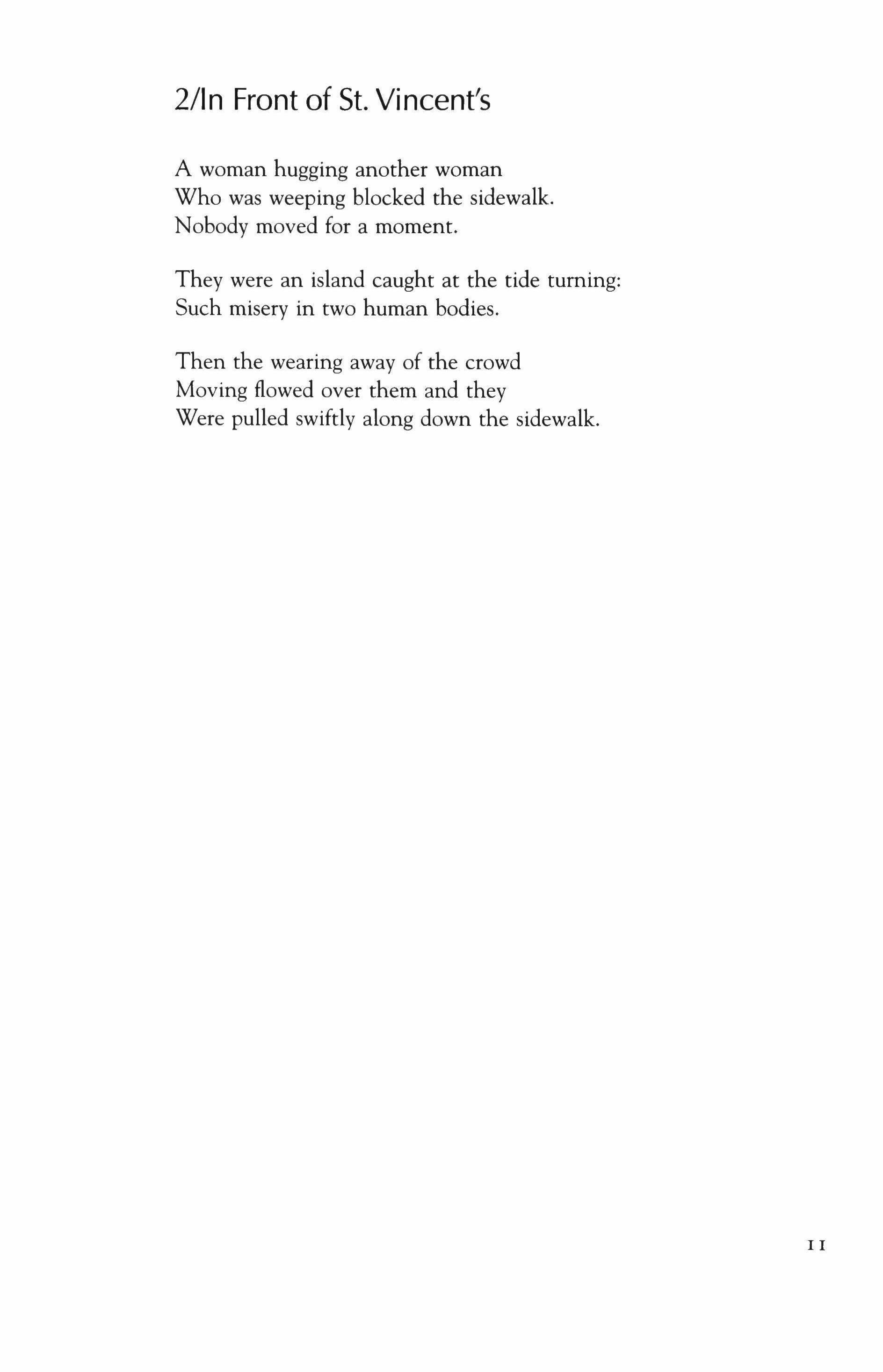 A woman hugging another woman Who was weeping blocked the sidewalk. Nobody moved for a moment.