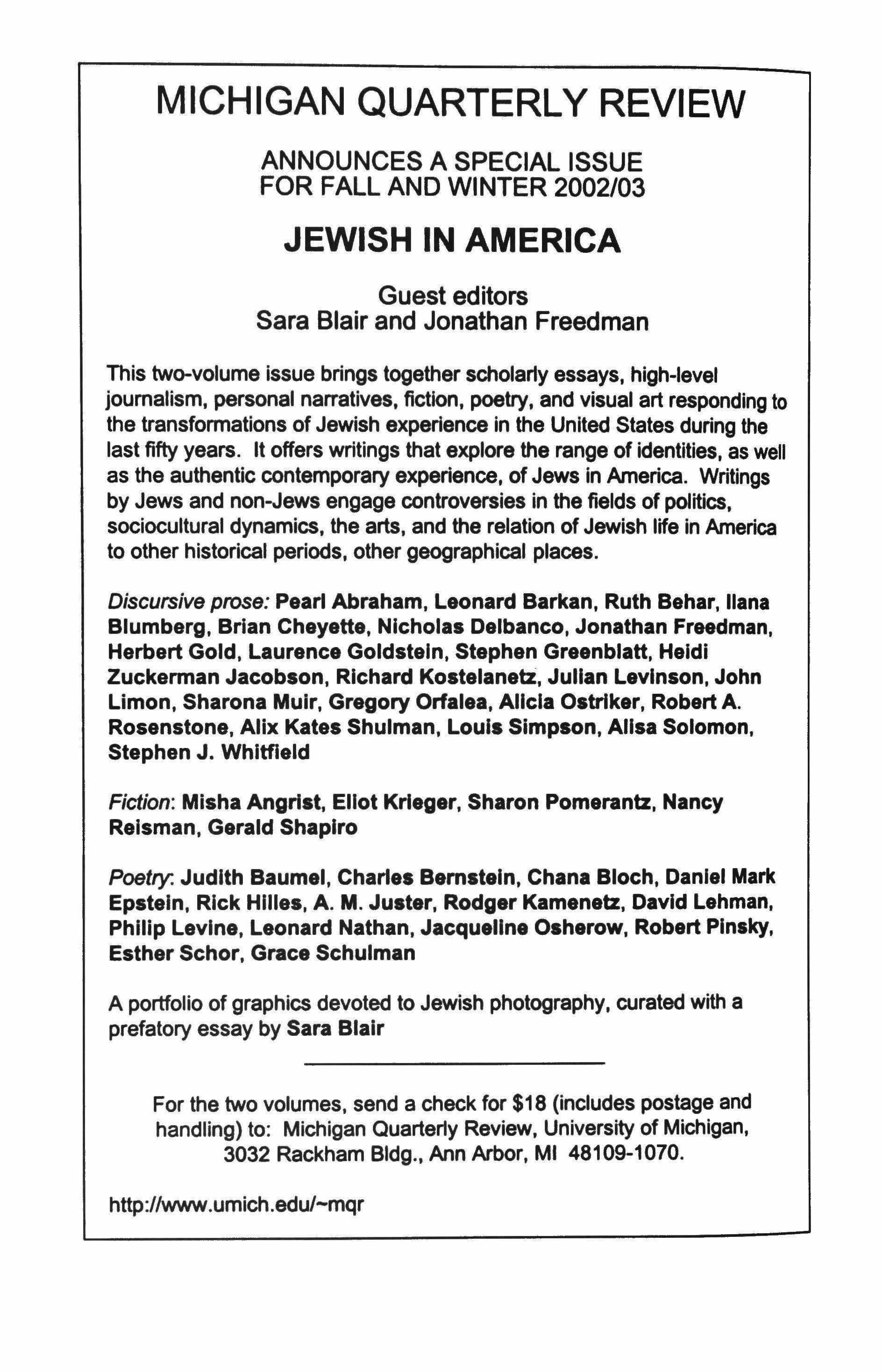 For the two volumes, send a check for $18 (includes postage and handling) to: Michigan Quarterly Review, University of Michigan, 3032 Rackham Bldg., Ann Arbor, MI 48109-1070.