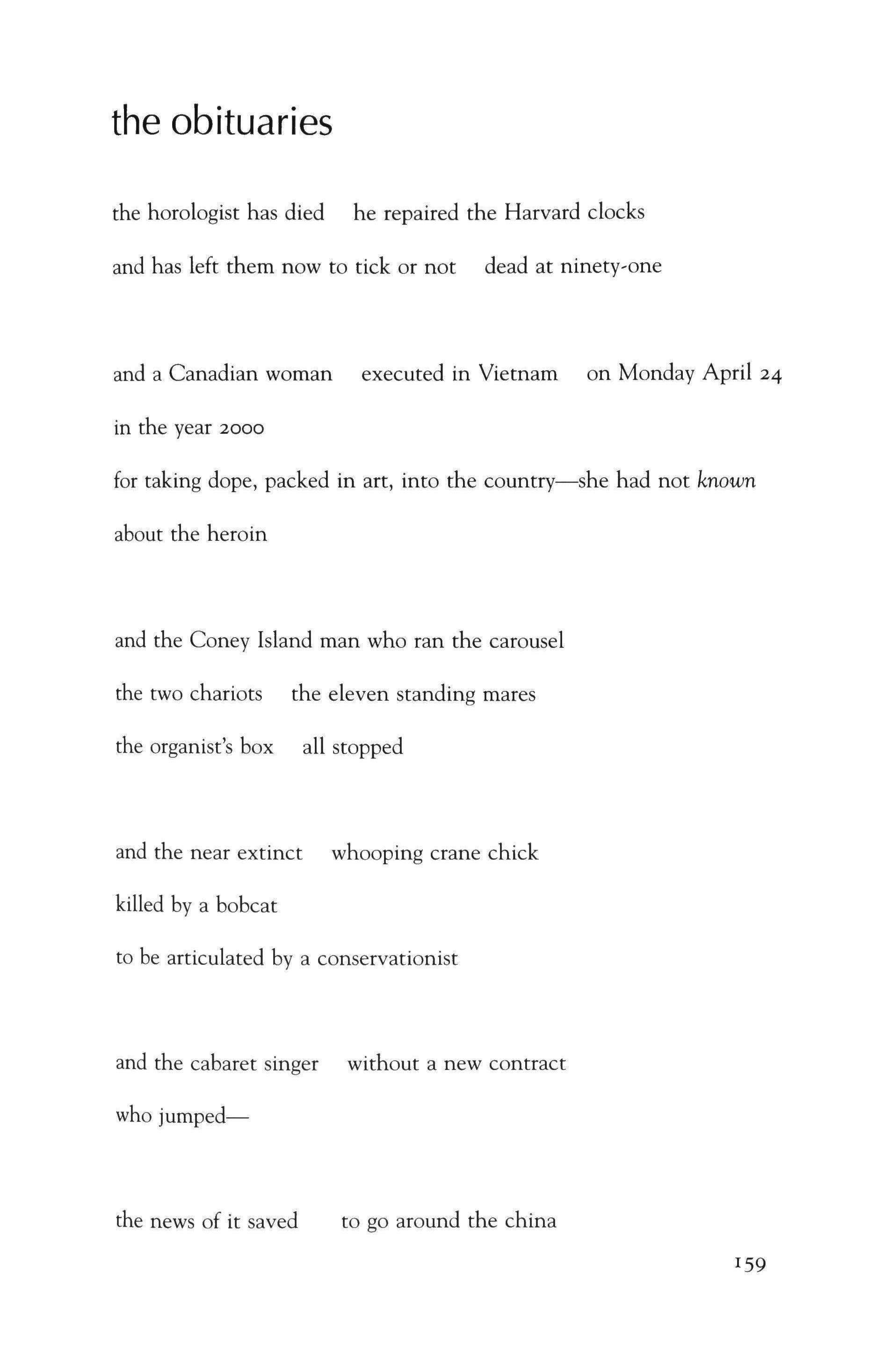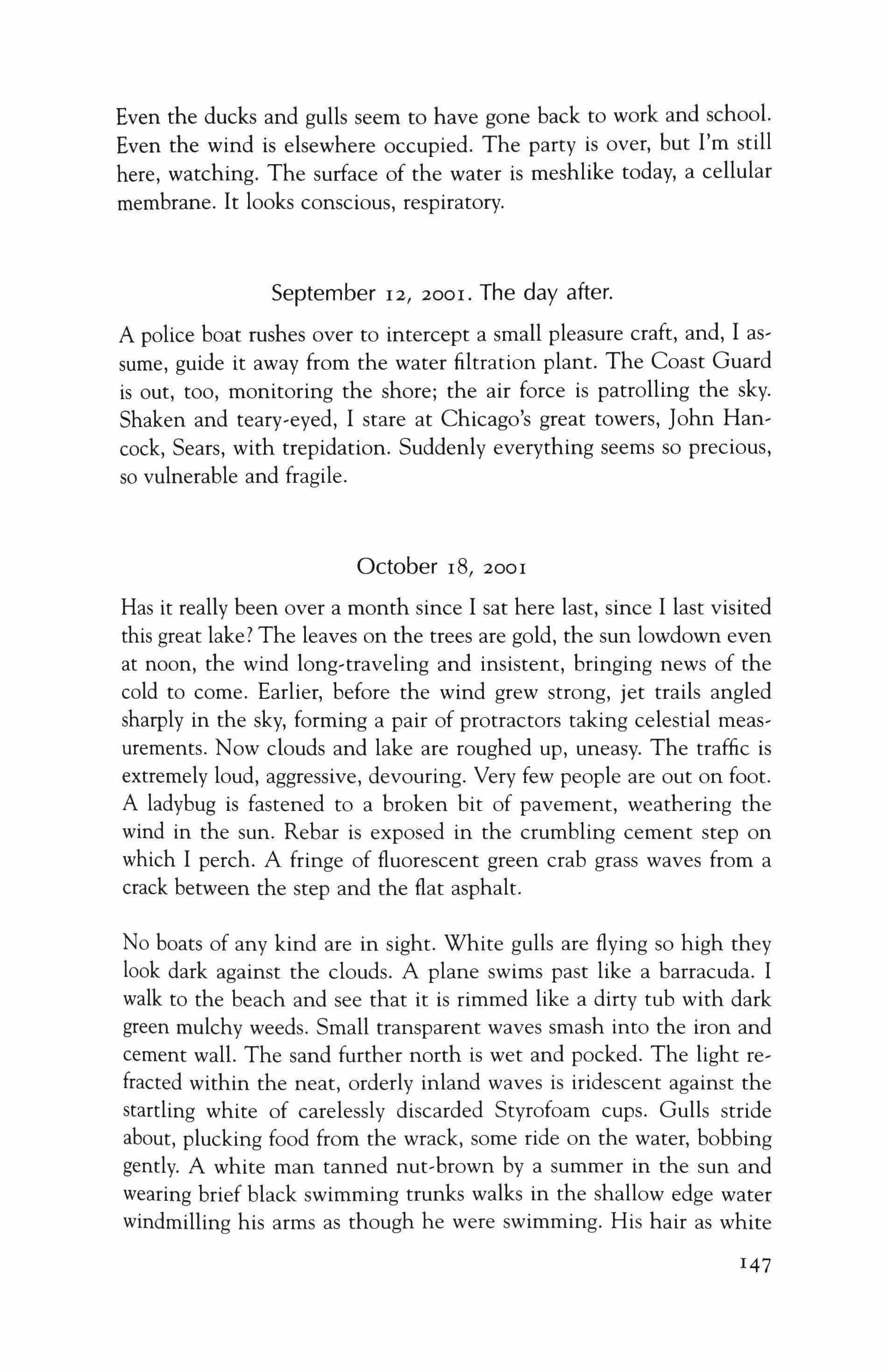 Essays: Richard Howard, "The Fatality of Reading"; Anne Stevenson, "A Memoir of the University of Michigan in the 1950s; Reginald Shepherd, "Against Identity Poetry"; Lorna Dee Cervantes, "An Interview about Poetry, Blues, and Personality"; Gary Adelman, "A Commentary, and a Symposium of 21 Authors, on Samuel Beckett"; Susan E. Alcock, "Power Lunches in the Eastern Roman Empire"; Jeffrey Meyers, "Hemingway's Humor'; Anna Mollow, "On Three Theorists of Disability"; Tennessee Williams, "Amor Perdida"; A Symposium on Medea, featuring Fiona Shaw and Deborah Warner; Stacey Harwood, 'When Poems Are Spoken on Screen"; Jaimy Gordon, "The Strange Career of Bruno Schulz"; Josephine Donovan, "J. M. Coetzee and the Life of Animals"; Mary Gordon, The Hopwood Lecture for 2003
