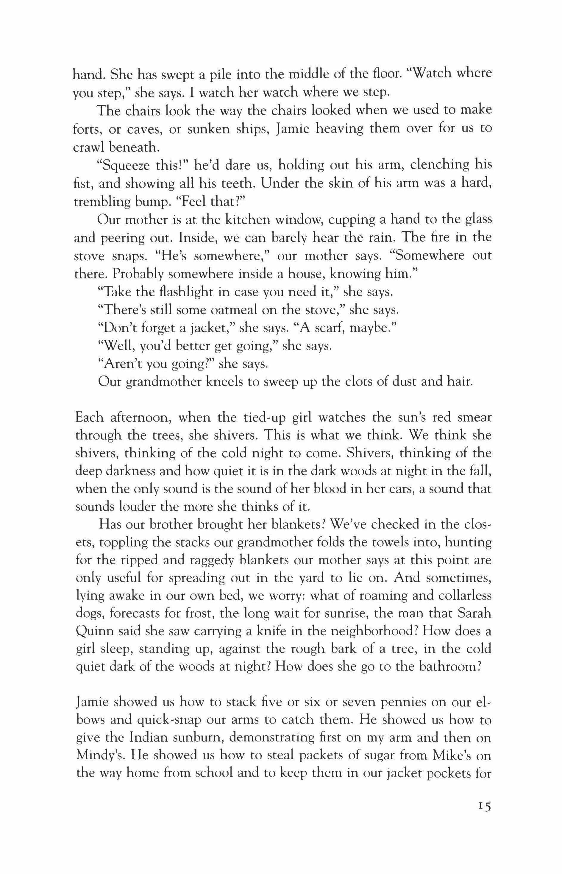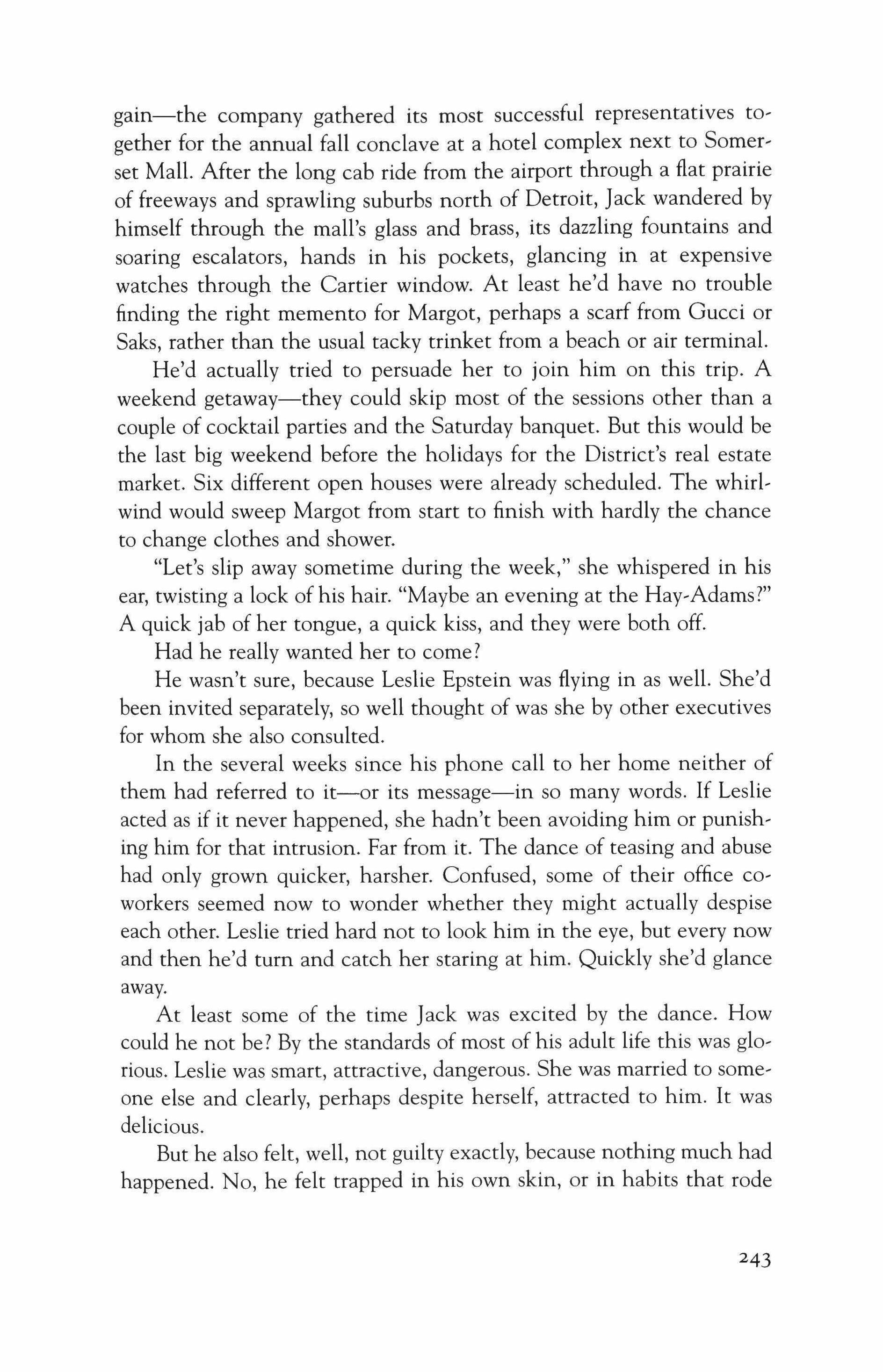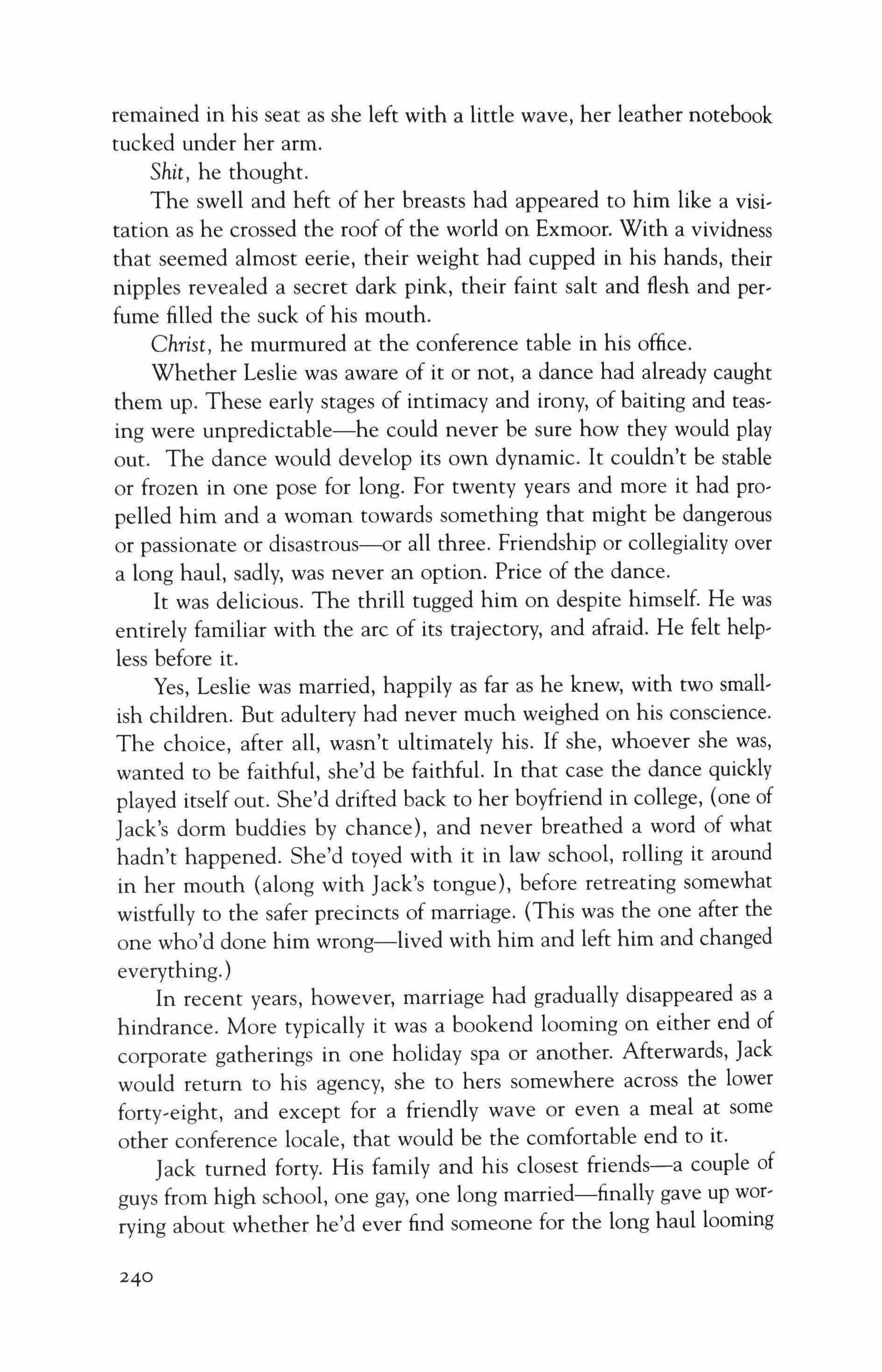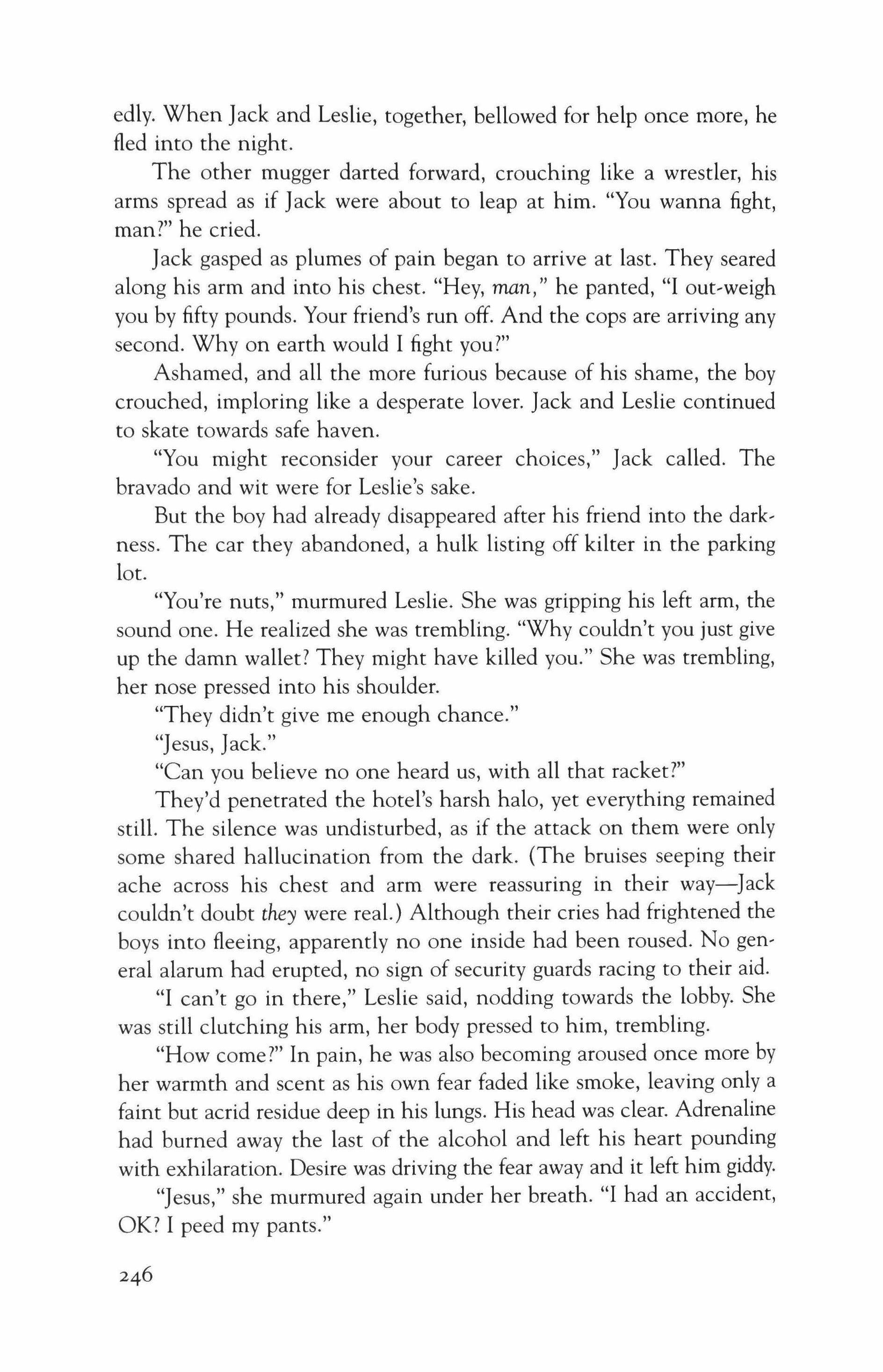 Jack was trying, he was tugging at the wallet. It held nothing he couldn't afford to surrender. But out of habit he'd buttoned the pocket, and his fumbling fingers couldn't push it open. He twisted at it, he struggled. At last the button popped off, pinging faintly on the pavement. But now the wallet itself resisted. It snagged and twisted in the lining. Leslie wasn't helping. Tucked up close, she was bumping against him. And they were both still edging away as the two boys pressed at them. Their breath was foul with beer.