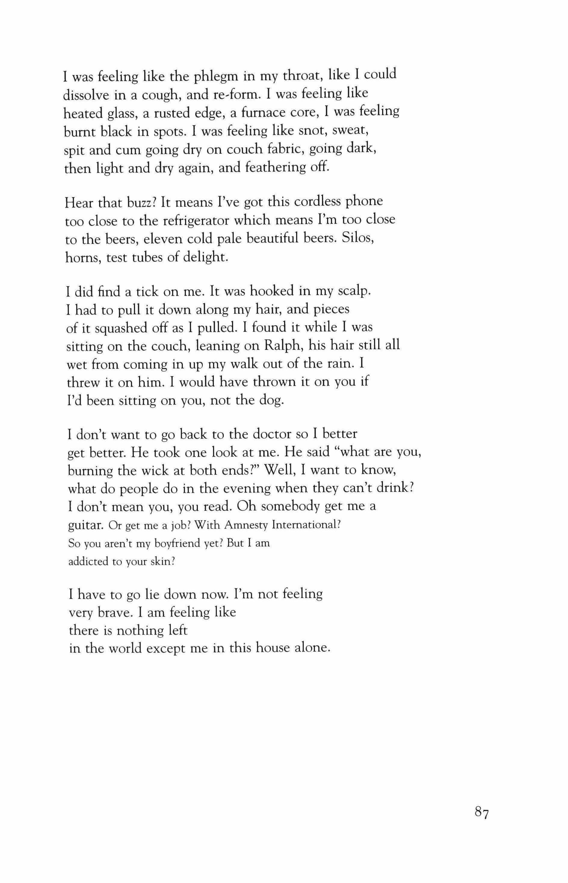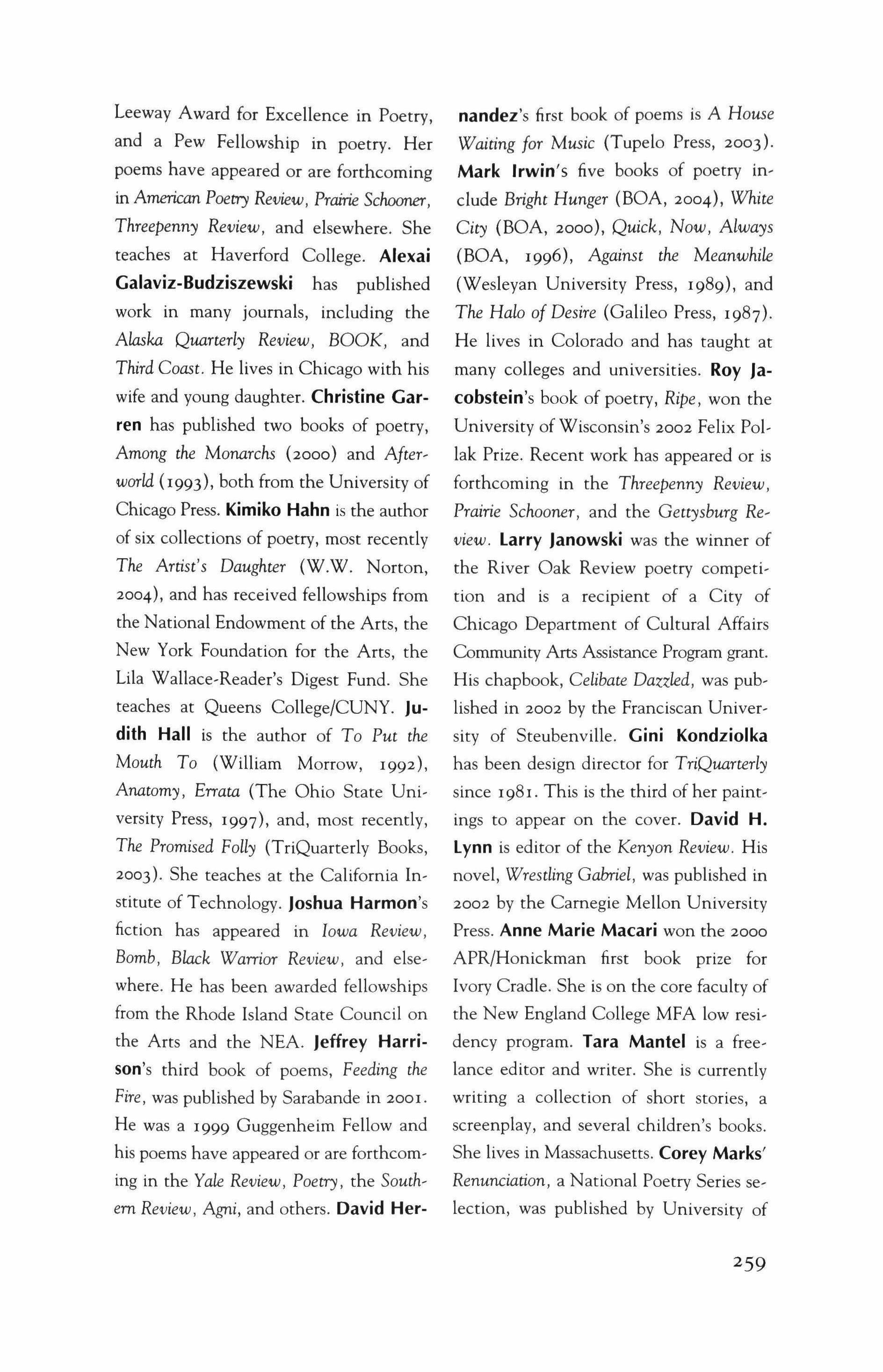 nandez's first book of poems is A House Waiting for Music (Tupelo Press, 2003). Mark Irwin's five books of poetry include Bright Hunger (BOA, 2004), White City (BOA, 2000), Quick, Now, Always (BOA, 1996), Against the Meanwhile (Wesleyan University Press, 1989), and The Halo of Desire (Galileo Press, 1987). He lives in Colorado and has taught at many colleges and universities. Roy [acobstein's book of poetry, Ripe, won the University of Wisconsin's 2002 Felix Pollak Prize. Recent work has appeared or is forthcoming in the Threepenny Review, Prairie Schooner, and the Gettysburg Review. Larry Janowski was the winner of the River Oak Review poetry competition and is a recipient of a City of Chicago Department of Cultural Affairs Community Arts Assistance Program grant. His chapbook, Celibate Dazzled, was published in 2002 by the Franciscan University of Steubenville. Gini Kondziolka has been design director for TriQuarterly since 1981. This is the third of her paintings to appear on the cover. David H. Lynn is editor of the Kenyon Review. His novel, Wrestling Gabriel, was published in 2002 by the Carnegie Mellon University Press. Anne Marie Macari won the 2000 APR/Honickman first book prize for Ivory Cradle. She is on the core faculty of the New England College MFA low residency program. Tara Mantel is a freelance editor and writer. She is currently writing a collection of short stories, a screenplay, and several children's books. She lives in Massachusetts. Corey Marks' Renunciation, a National Poetry Series selection, was published by University of