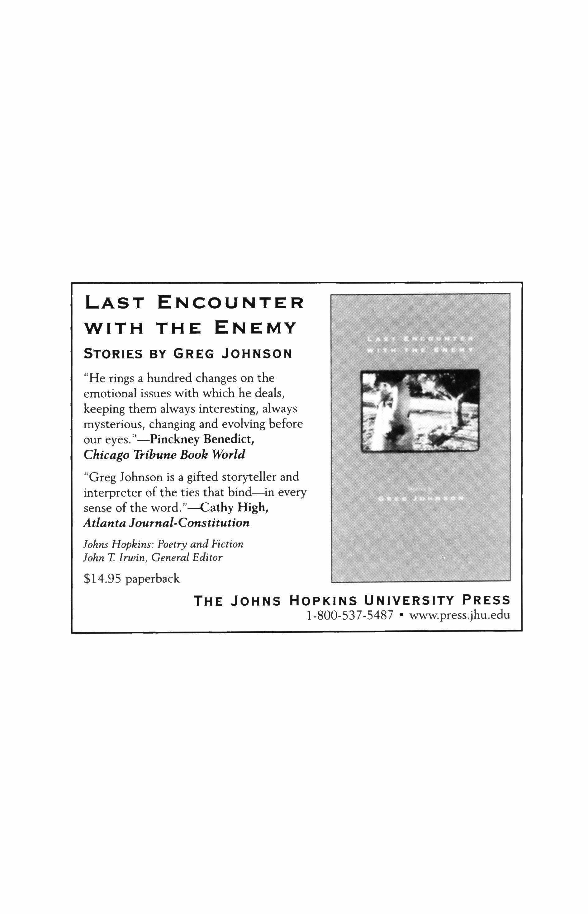 JOHNSON"He rings a hundred changes on the emotional issues with which he deals, keeping them always interesting, always mysterious, changing and evolving before our eyes. "-Pinckney Benedict, Chicago Tribune Book World