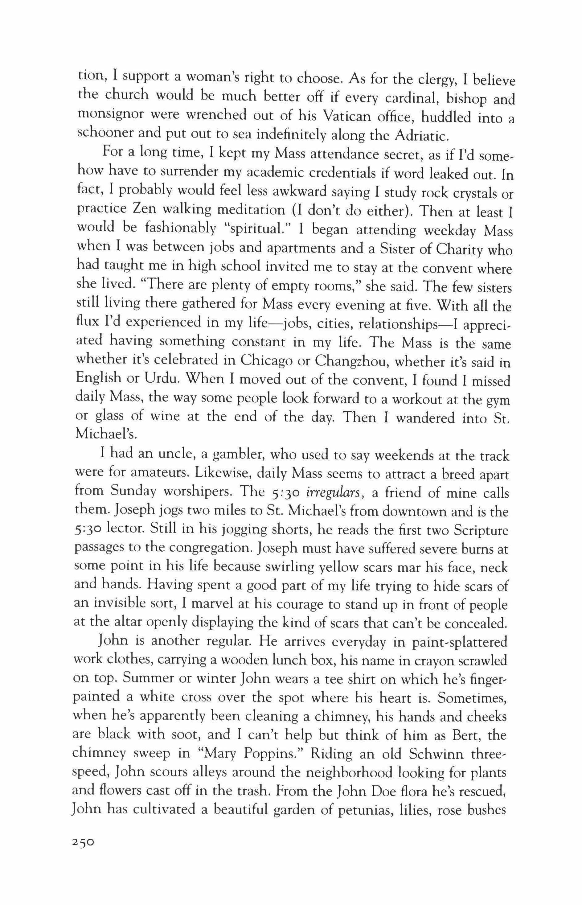 For a long time, I kept my Mass attendance secret, as if I'd somehow have to surrender my academic credentials if word leaked out. In fact, I probably would feel less awkward saying I study rock crystals or practice Zen walking meditation (l don't do either). Then at least I would be fashionably "spiritual." I began attending weekday Mass when I was between jobs and apartments and a Sister of Charity who had taught me in high school invited me to stay at the convent where she lived. "There are plenty of empty rooms," she said. The few sisters still living there gathered for Mass every evening at five. With all the flux I'd experienced in my life-jobs, cities, relationships-I appreciated having something constant in my life. The Mass is the same whether it's celebrated in Chicago or Changzhou, whether it's said in English or Urdu. When I moved out of the convent, I found I missed daily Mass, the way some people look forward to a workout at the gym or glass of wine at the end of the day. Then I wandered into St. Michael's.