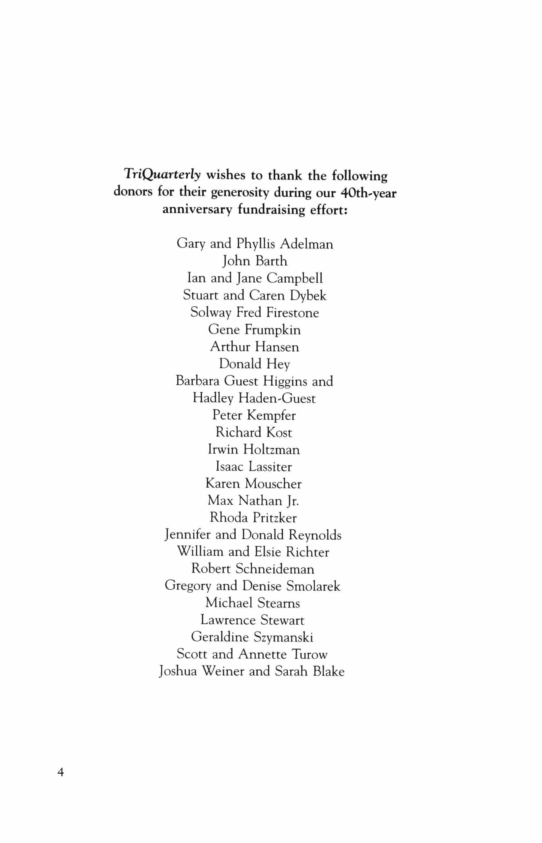 TriQuarterly wishes to thank the following donors for their generosity during our 40th,year anniversary fundraising effort: