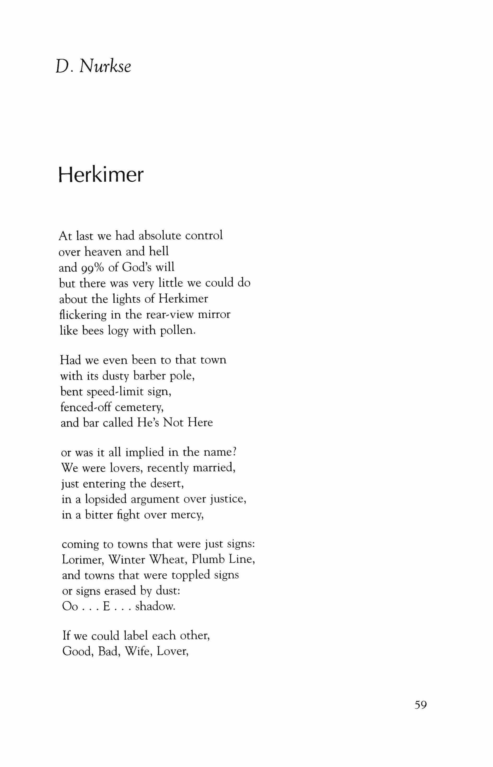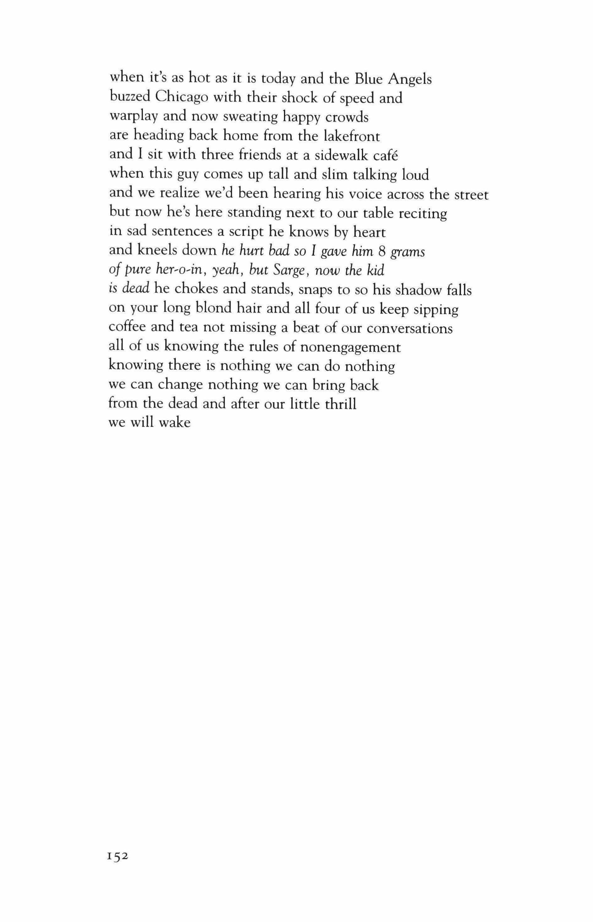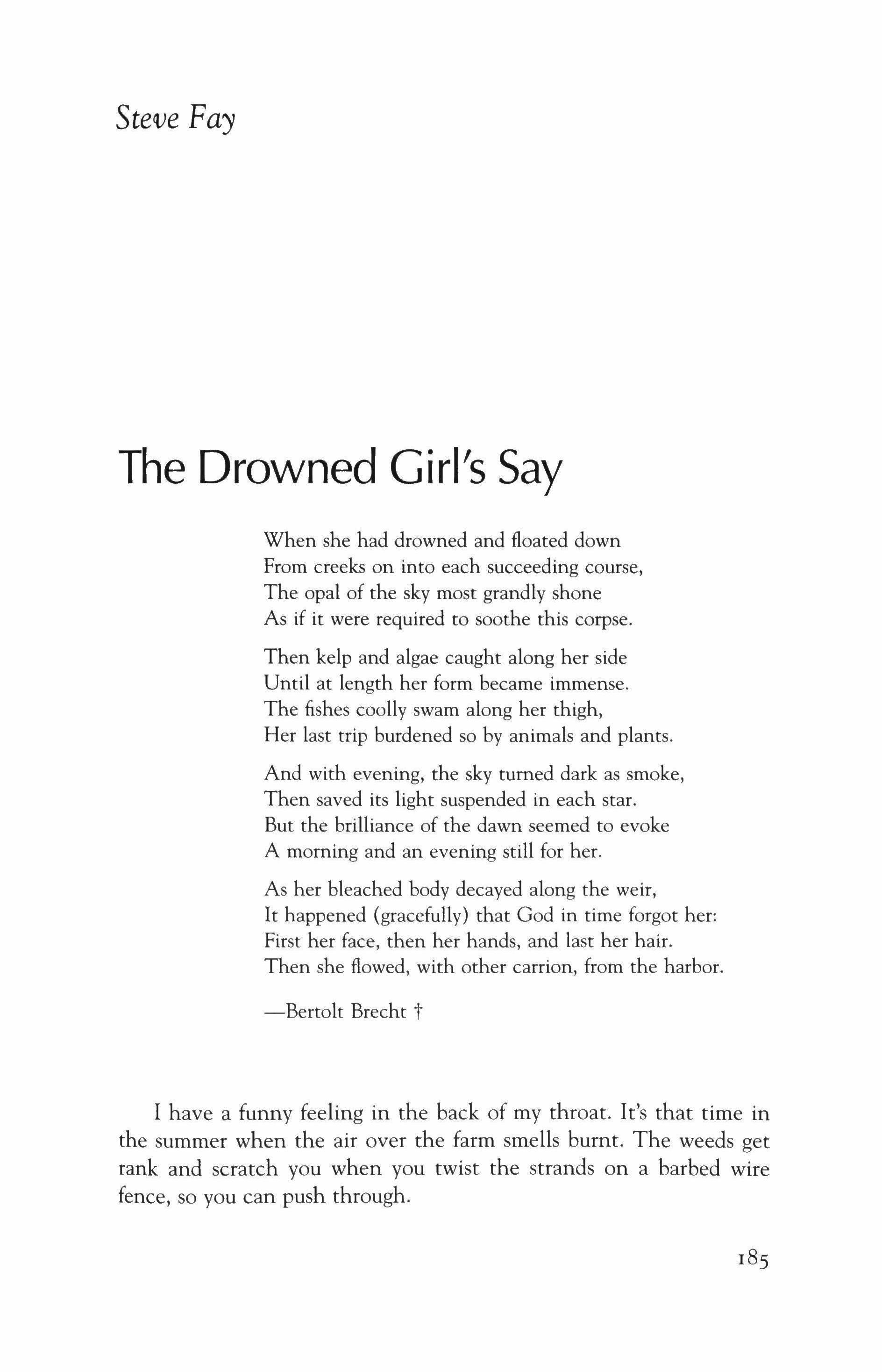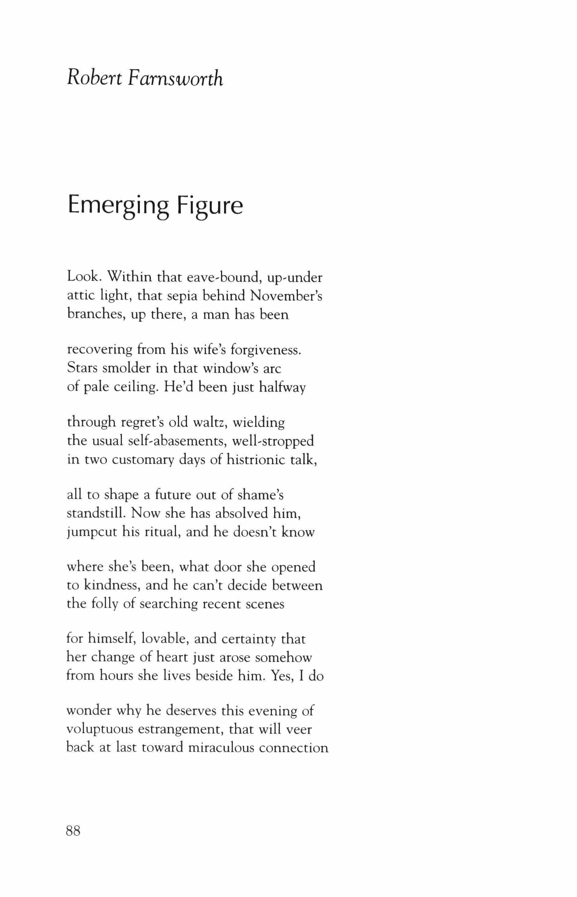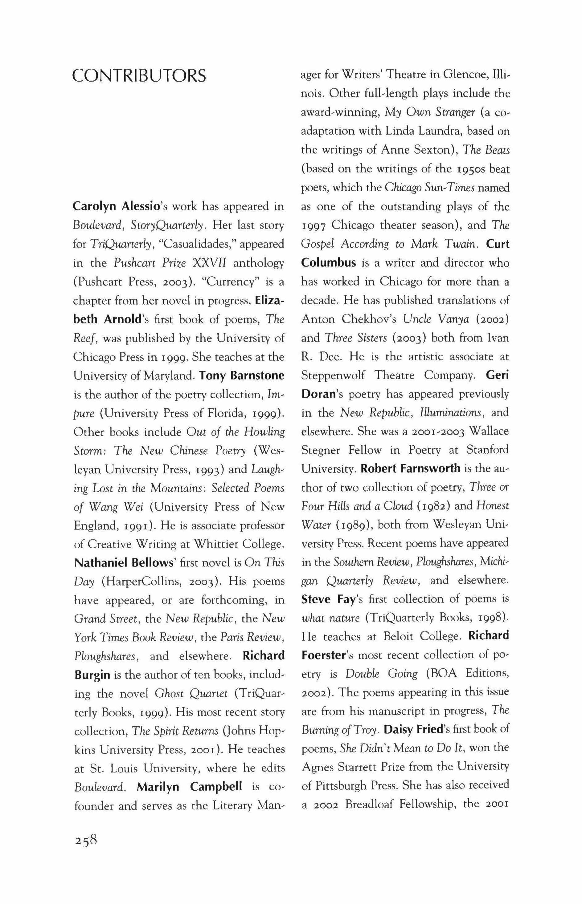 ager for Writers' Theatre in Glencoe, Illinois. Other full-length plays include the award-winning, My Own Stranger (a coadaptation with Linda Laundra, based on the writings of Anne Sexton), The Beats (based on the writings of the 1950S beat poets, which the Chicago Sun-Times named as one of the outstanding plays of the 1997 Chicago theater season), and The Gospel According to Mark Twain. Curt Columbus is a writer and director who has worked in Chicago for more than a decade. He has published translations of Anton Chekhov's Uncle Vanya (2002) and Three Sisters (2003) both from Ivan R. Dee. He is the artistic associate at Steppenwolf Theatre Company. Geri Doran's poetry has appeared previously in the New Republic, Illuminations, and elsewhere. She was a 2001-2003 Wallace Stegner Fellow in Poetry at Stanford University. Robert Farnsworth is the author of two collection of poetry, Three or Four Hills and a Cloud (1982) and Honest Water (1989), both from Wesleyan University Press. Recent poems have appeared in the Southern Review, Ploughshares, Michigan Quarterly Review, and elsewhere. Steve Fay's first collection of poems is what nature (TriQuarterly Books, 1998). He teaches at Beloit College. Richard Foerster's most recent collection of poetry is Double Going (BOA Editions, 2002). The poems appearing in this issue are from his manuscript in progress, The Burning ofTroy. Daisy Fried's first book of poems, She Didn't Mean to Do It, won the Agnes Starrett Prize from the University of Pittsburgh Press. She has also received a 2002 Breadloaf Fellowship, the 2001