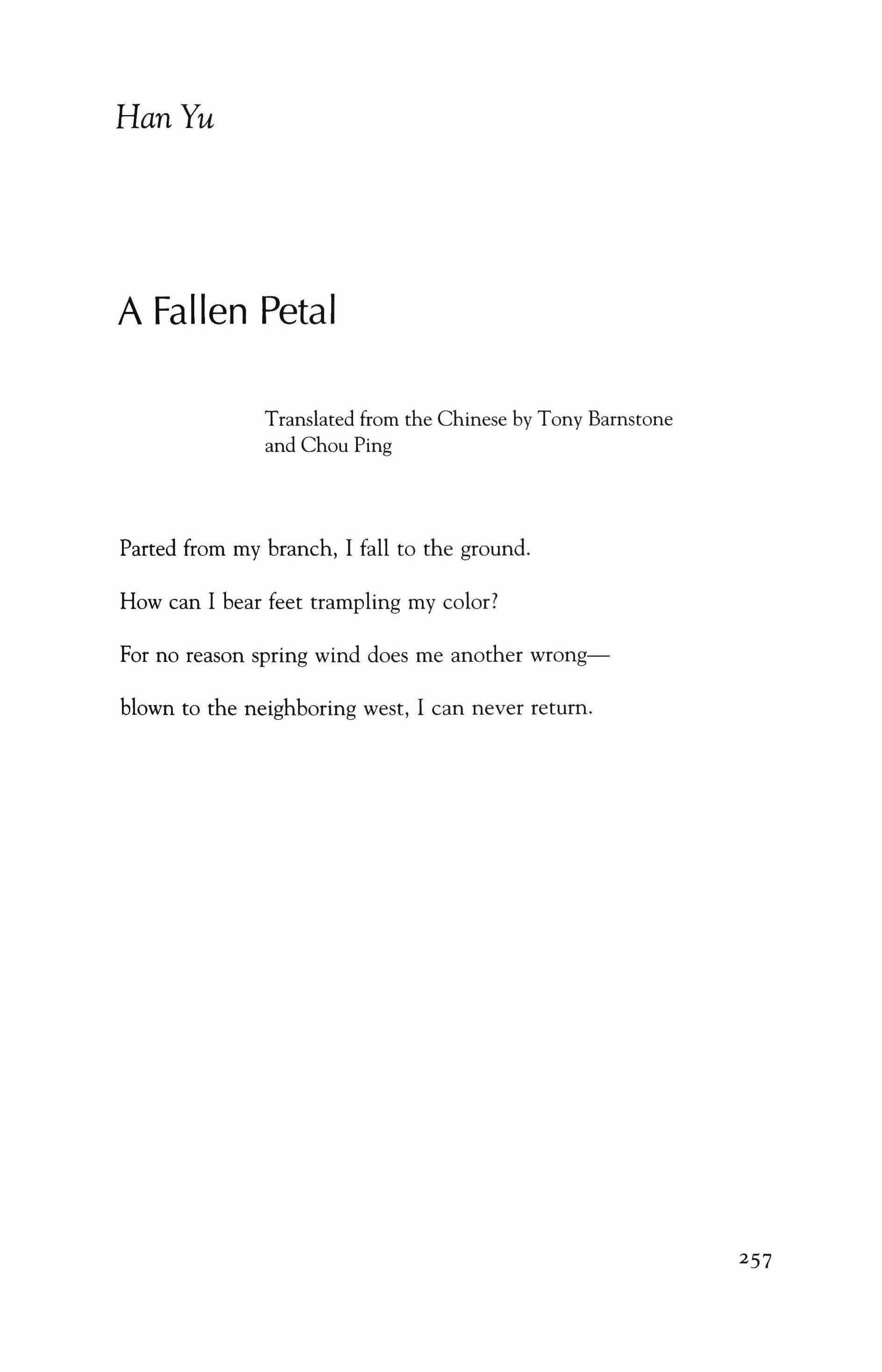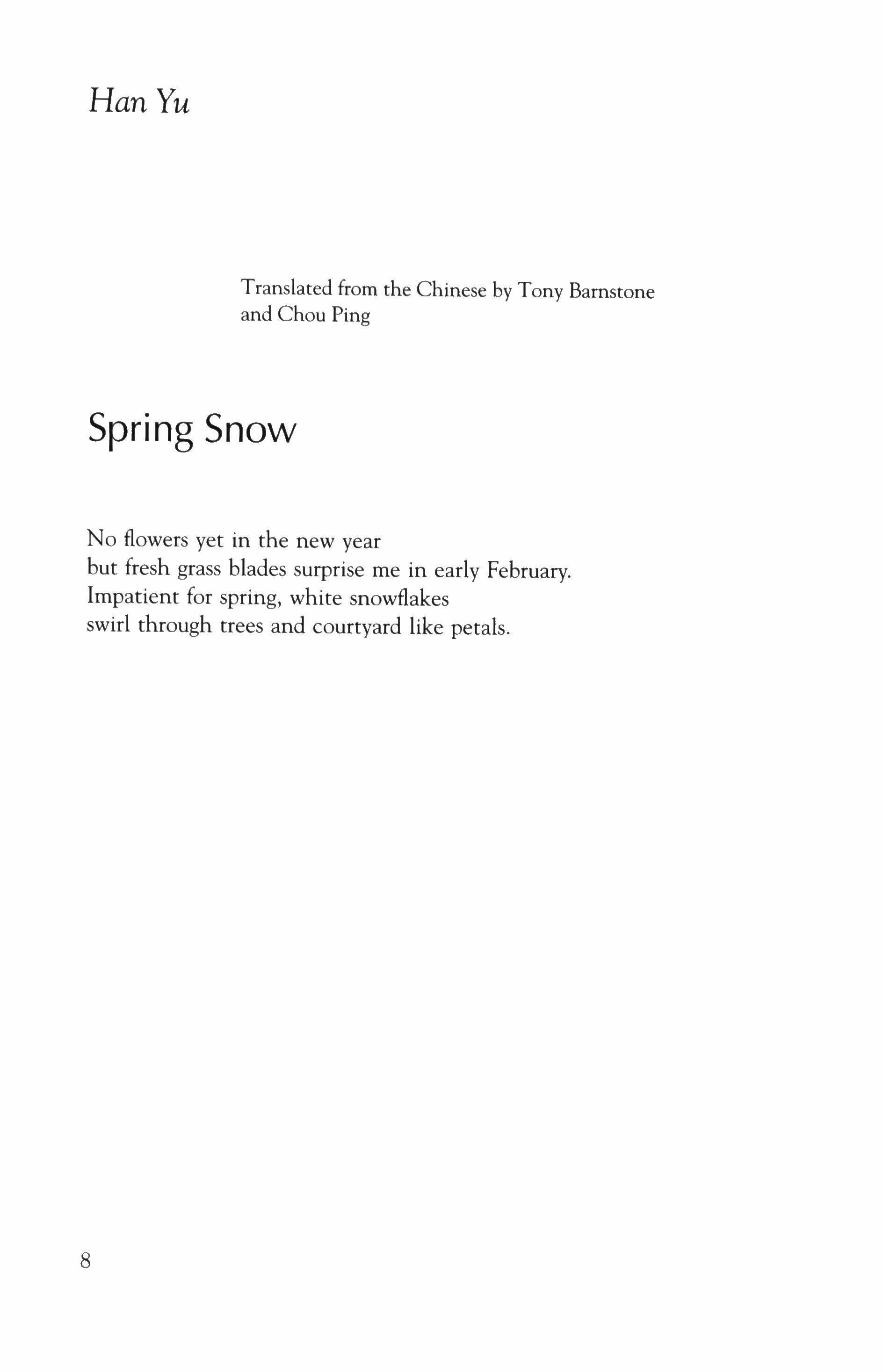 ard has published two books of poetry, Scavenging the Country for a Heartbeat (1992) and I'm Here Because I Lost My Way (1998), both from Mid-List Press. His poems appear in the Paris Review, Ploughshares, New England Review, and elsewhere. He teaches at Johnson State College in Vermont and edits the Green Mountains Review. Corey Thrasher's poems have appeared in the Paris Review, Western Humanities Review, and others. He lives in New York City. Judith Valente is an on-air correspondent for PBSTV. She also reports on religion and the arts for WBEZ-Chicago Public Radio. Her poetry has appeared in Rhino and AiterHours and in the anthology, "Illinois Poets: Where We Live." She received an Illinois Arts Council literary Award for her poem "Green," which appeared in TriQuarterly. In addition to his poetry, Han Yu (768-824) is considered one of China's finest prose writers, second only to Sima Qian. He was the first among the Eight Great Prose Masters of the Tang and Song dynasties.