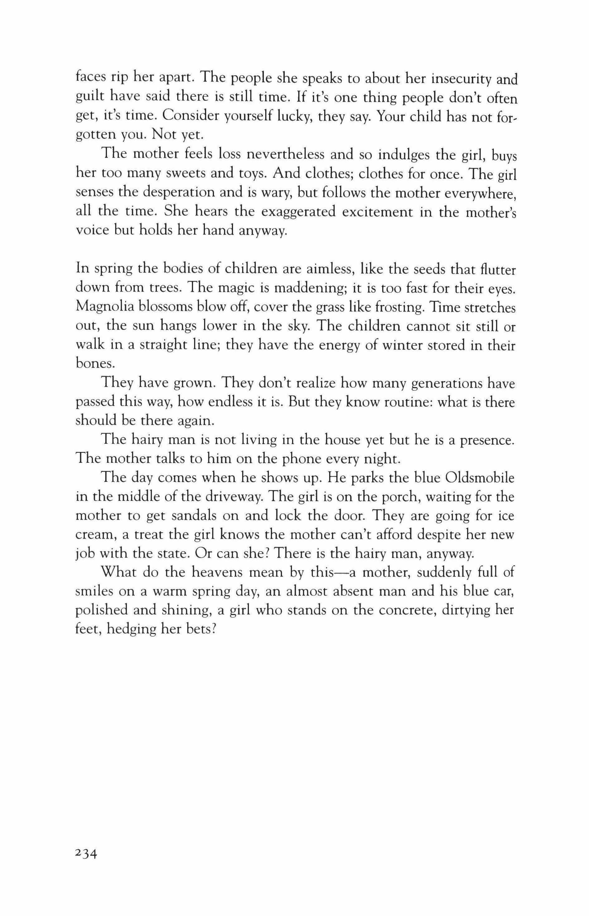 He figured she could sue him. He smelled now the smell of the pee that soaked her skirt. It made him sorry for her again. He didn't seem able to say anything, to understand anything, just to watch himself from very far away.