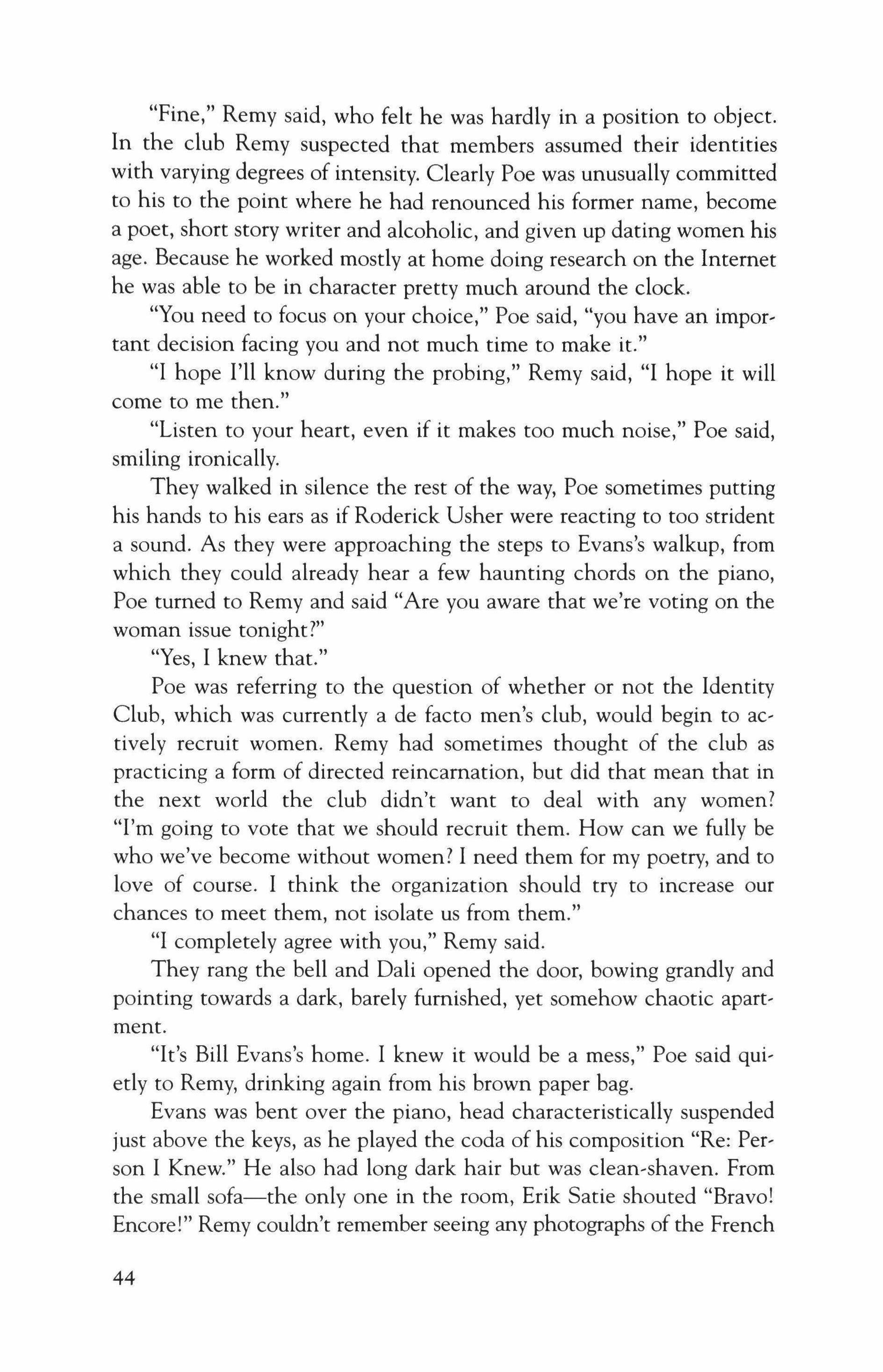 Carolyn Alessio's work has appeared in Boulevard, StoryQuarterly. Her last story for TriQuarterly, "Casualidades," appeared in the Pushcart Prize XXVII anthology (Pushcart Press, 2003). "Currency" is a chapter from her novel in progress. Elizabeth Arnold's first book of poems, The Reef, was published by the University of Chicago Press in 1999. She teaches at the University of Maryland. Tony Barnstone is the author of the poetry collection, Impure (University Press of Florida, 1999). Other books include Out of the Howling Storm: The New Chinese Poetry (Wesleyan University Press, 1993) and Laughing Lost in the Mountains: Selected Poems of Wang Wei (University Press of New England, 1991). He is associate professor of Creative Writing at Whittier College. Nathaniel Bellows' first novel is On This Day (HarperCollins, 2003). His poems have appeared, or are forthcoming, in Grand Street, the New Republic, the New York Times Book Review, the Paris Review, Ploughshares, and elsewhere. Richard Burgin is the author of ten books, including the novel Ghost Quartet (TriQuarterly Books, 1999). His most recent story collection, The SPirit Returns (Johns Hopkins University Press, 2001). He teaches at St. Louis University, where he edits Boulevard. Marilyn Campbell is cofounder and serves as the Literary Man-